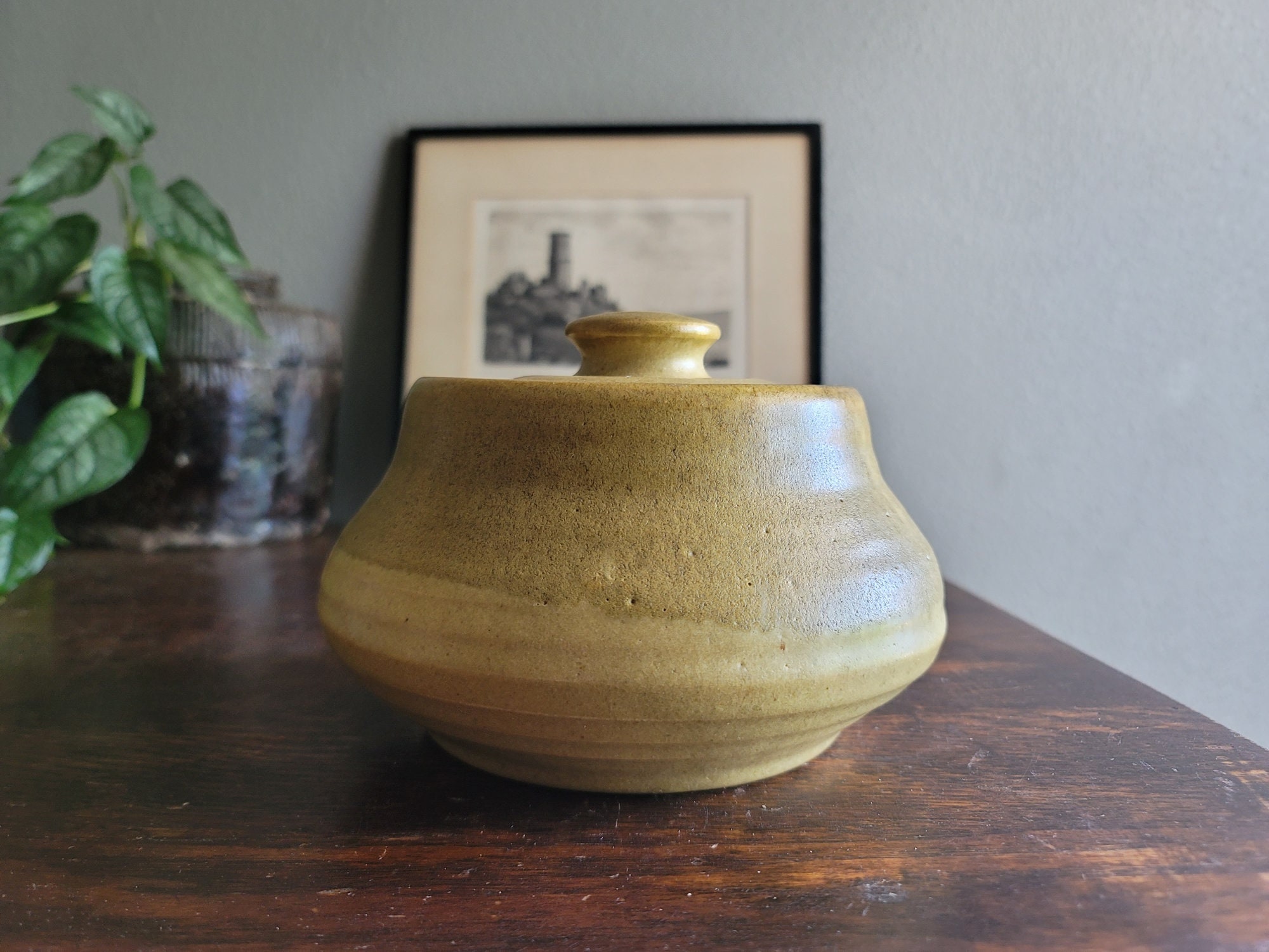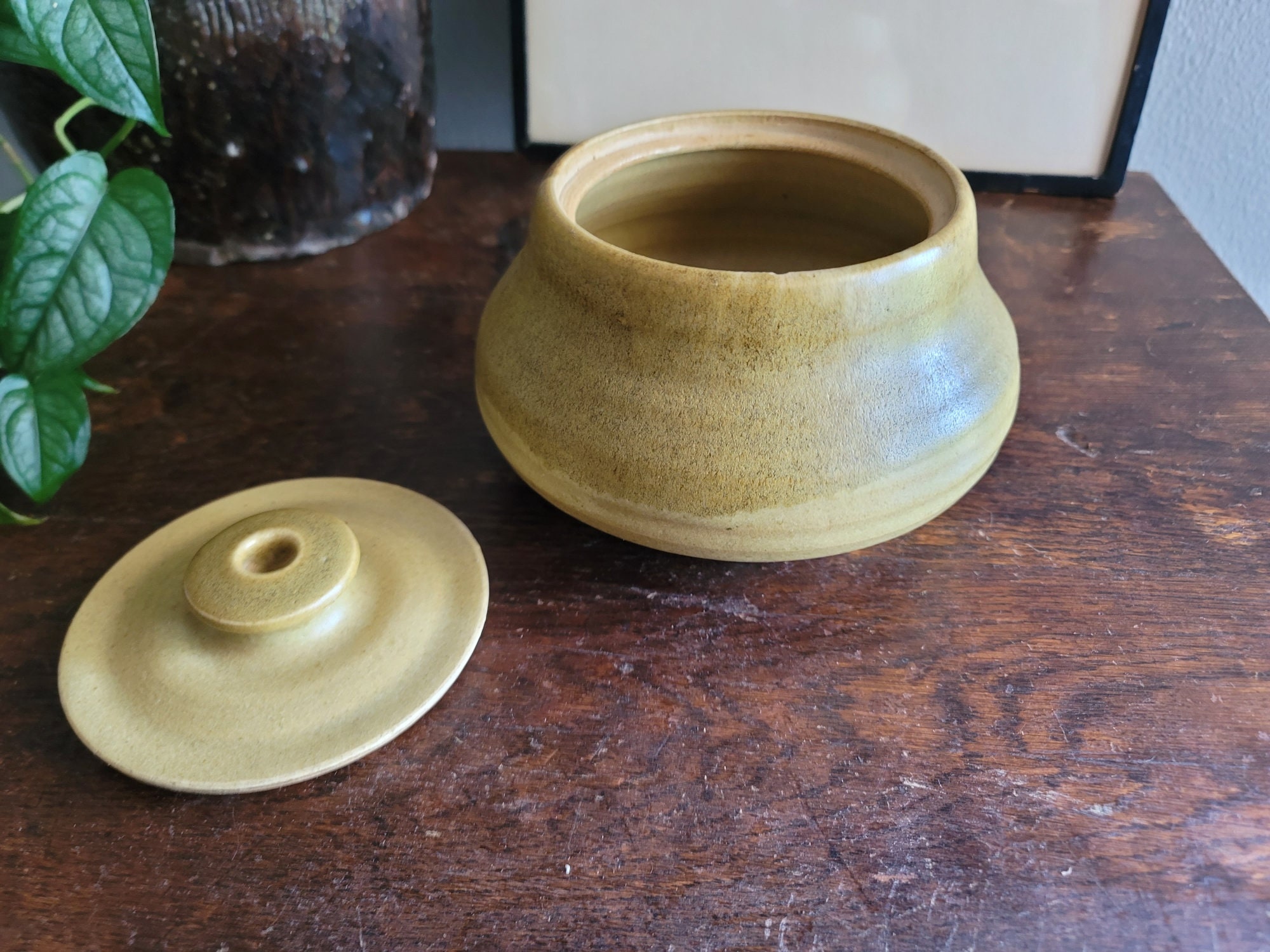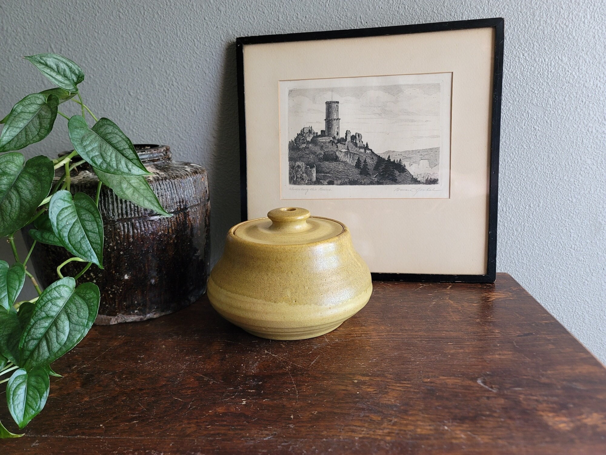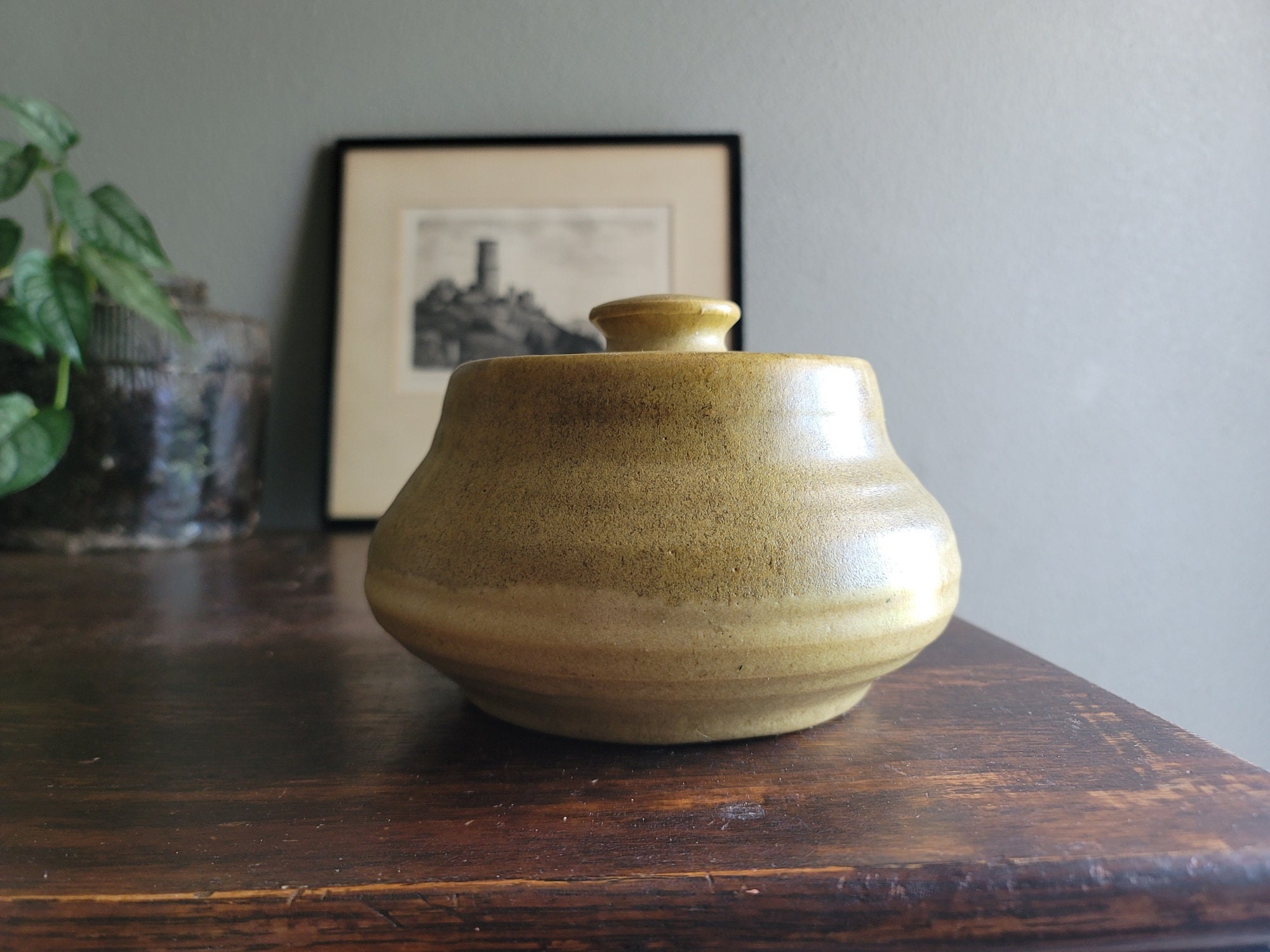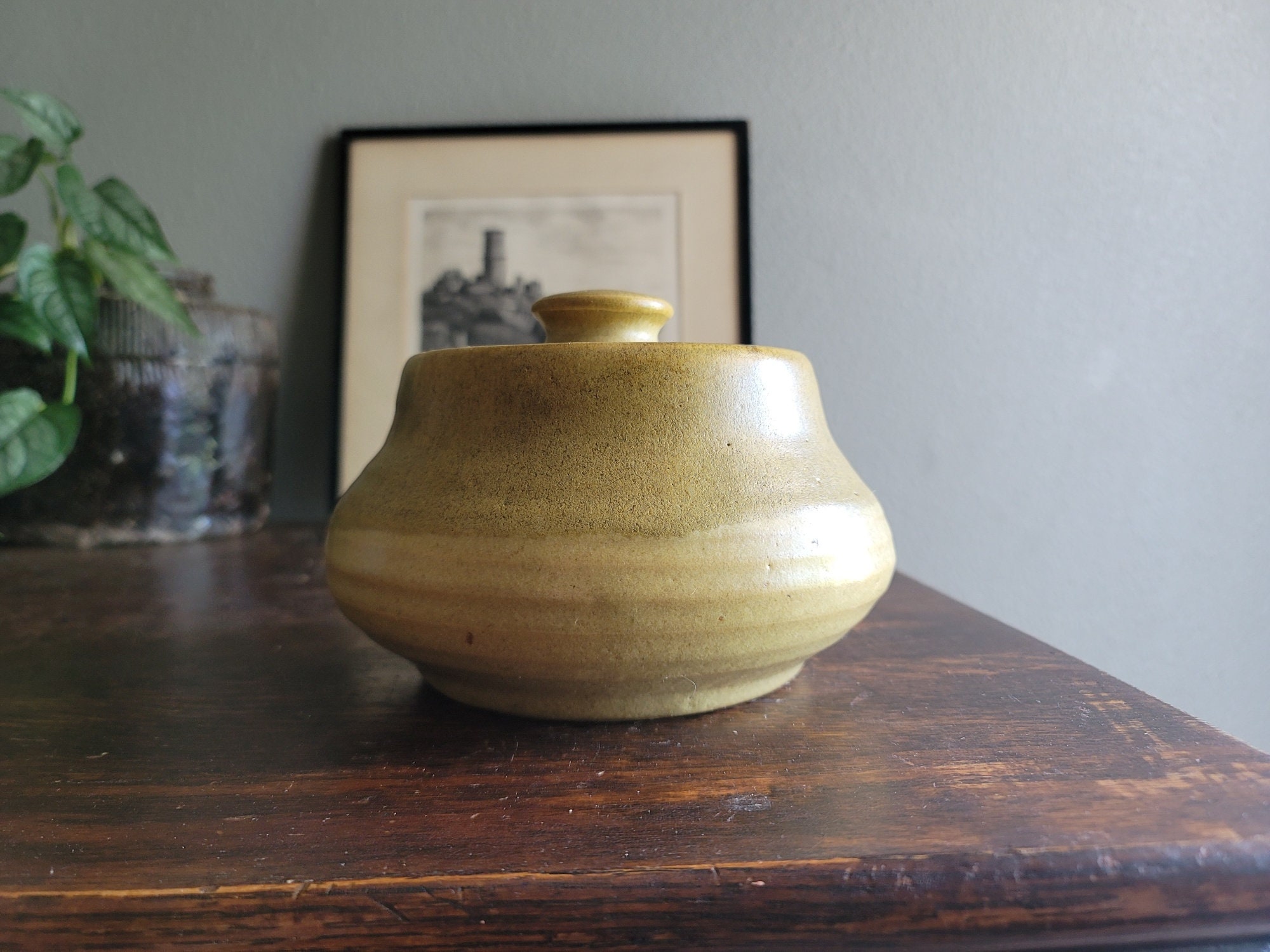 This is a lidded trinket bowl in a really stunning shade of mustard yellow with the faintest touches of green. This piece of pottery is unsigned and has a really beautiful varied finish across the surface. Perfect for all seasons of the year and for any room in the home, studio or office. The best thing about vintage pottery bowls is their endless versatility. They can be repurposed and restyled as your needs and tastes change. Overall, this piece is in great vintage condition but there is one small chip (see listing photos closely) on the top rim of the bowl that is not hidden when the lid is on. It's a really beautiful piece with a really great organic matte finish. Perfect vintage storage solution for all your small keepsakes.