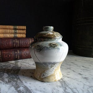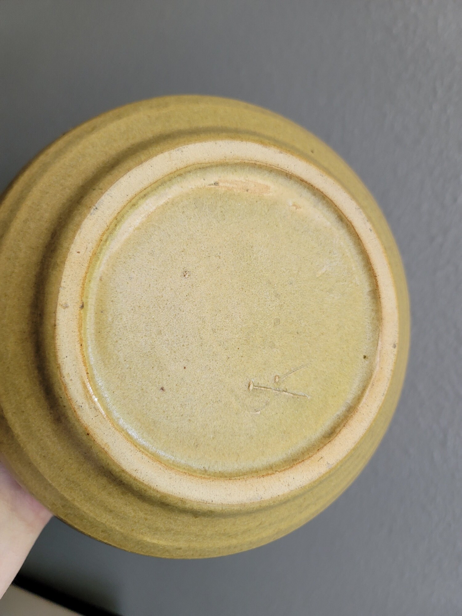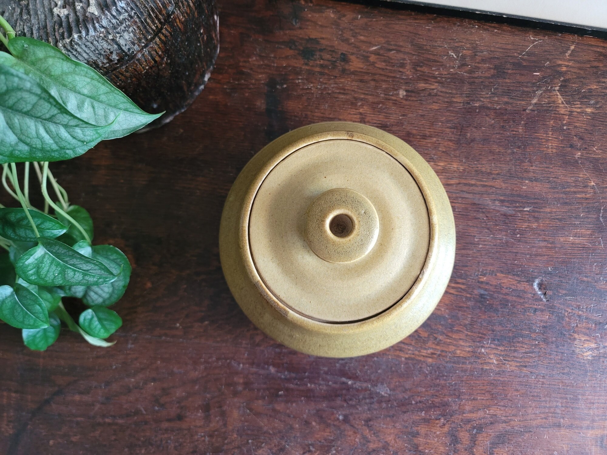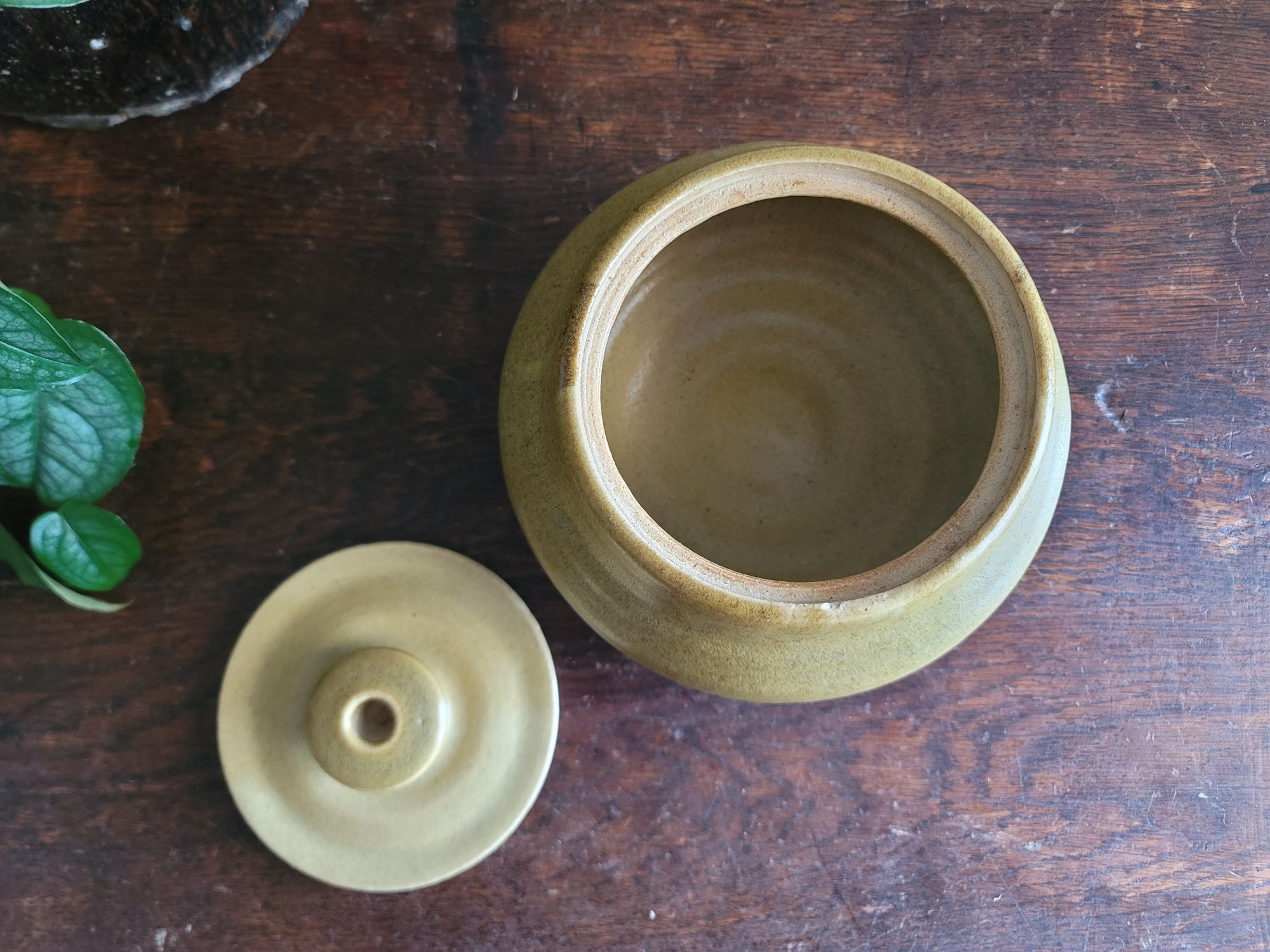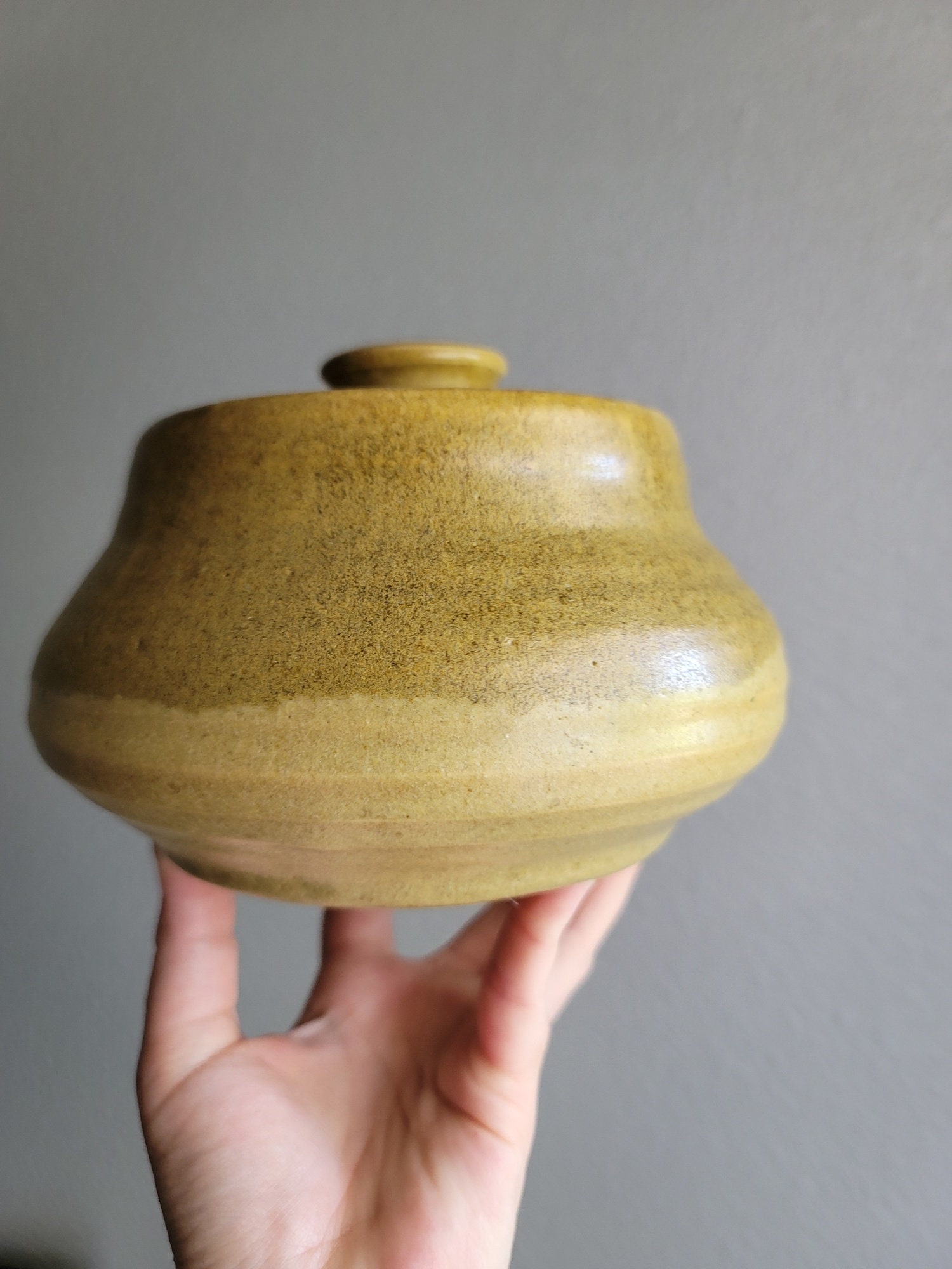 This is a lidded trinket bowl in a really stunning shade of mustard yellow with the faintest touches of green. This piece of pottery is unsigned and has a really beautiful varied finish across the surface. Perfect for all seasons of the year and for any room in the home, studio or office. The best thing about vintage pottery bowls is their endless versatility. They can be repurposed and restyled as your needs and tastes change. Overall, this piece is in great vintage condition but there is one small chip (see listing photos closely) on the top rim of the bowl that is not hidden when the lid is on. It's a really beautiful piece with a really great organic matte finish. Perfect vintage storage solution for all your small keepsakes.