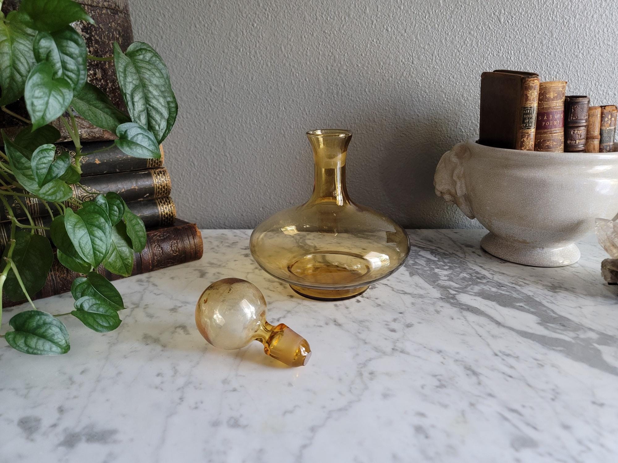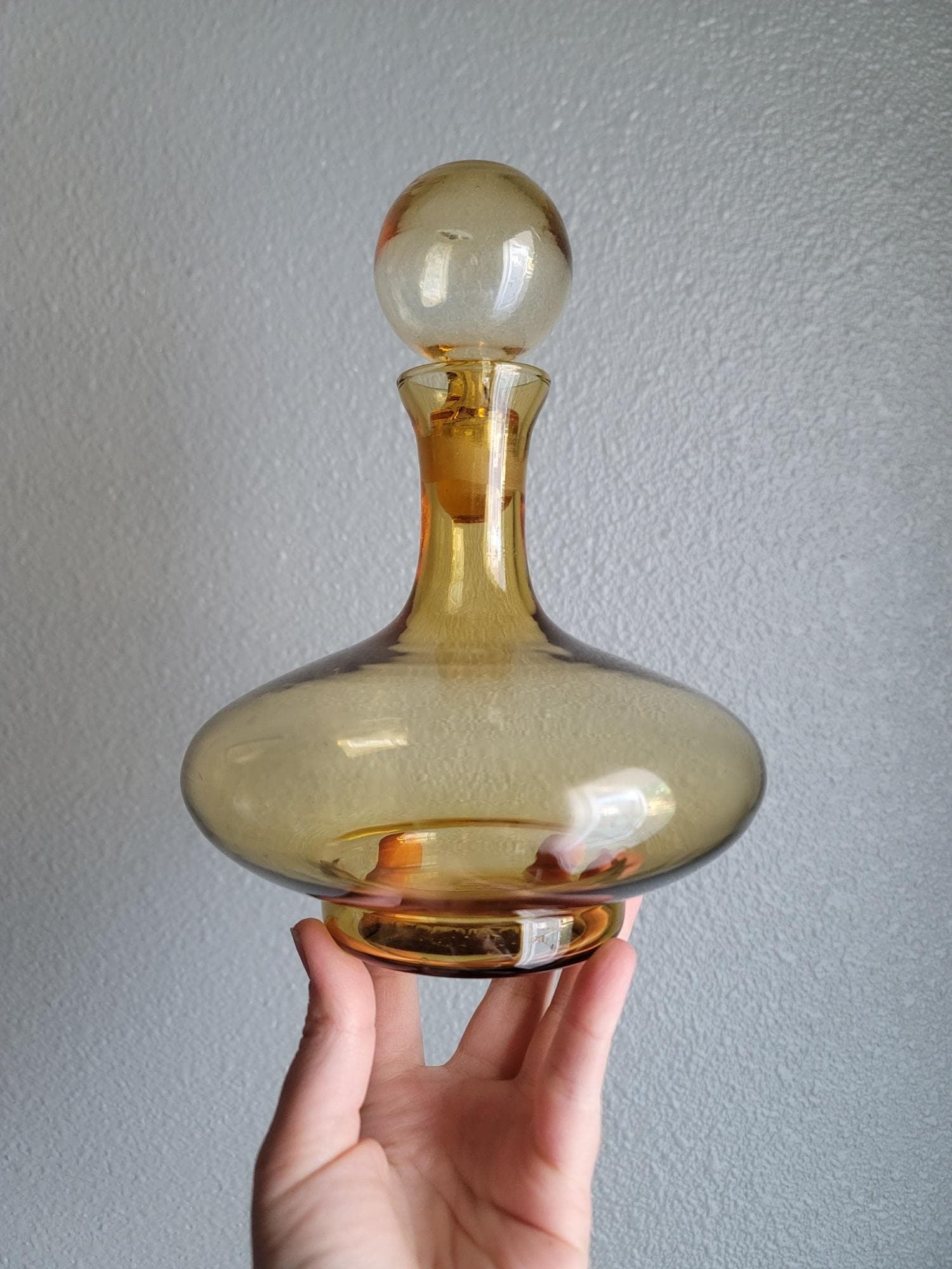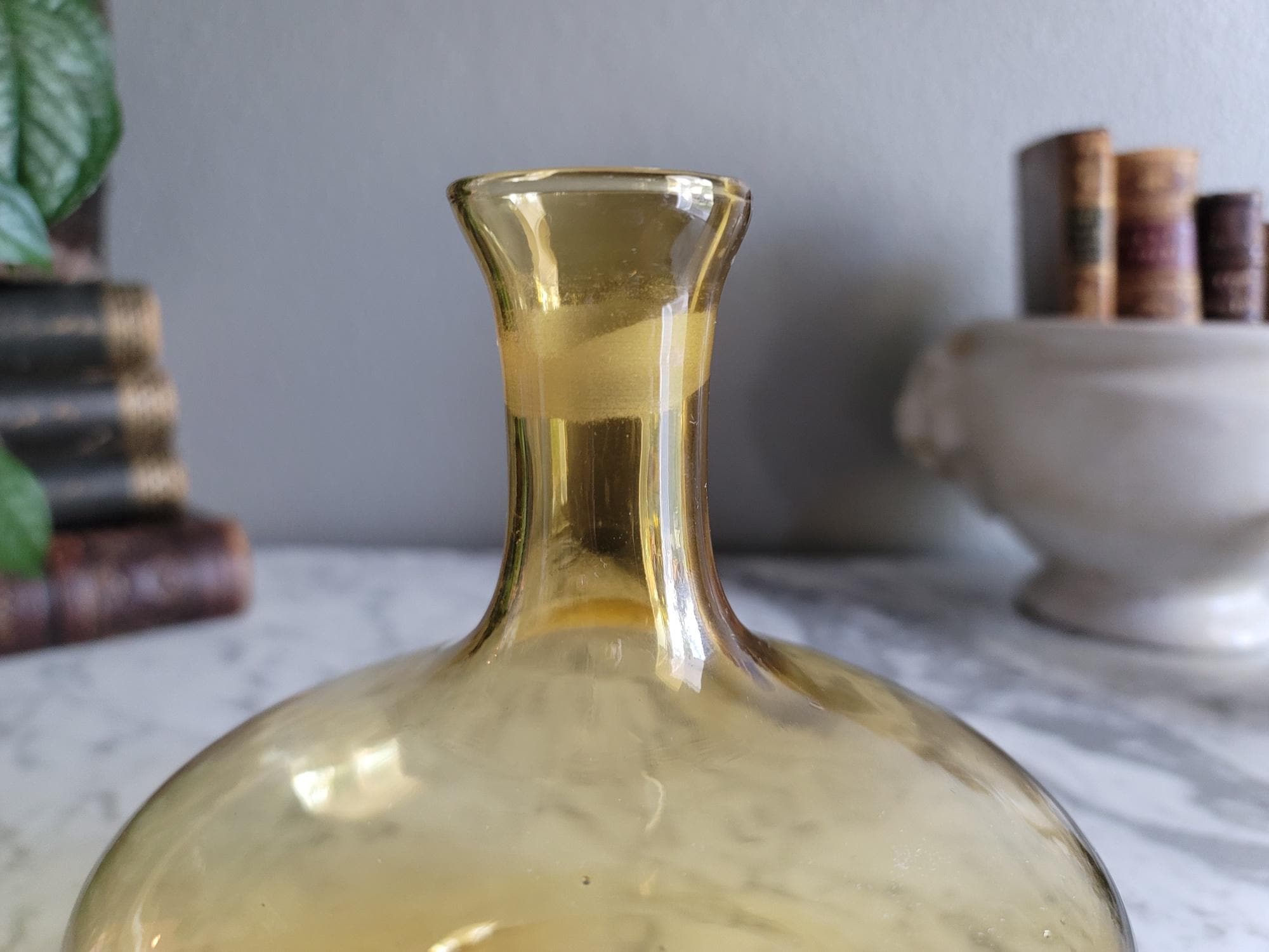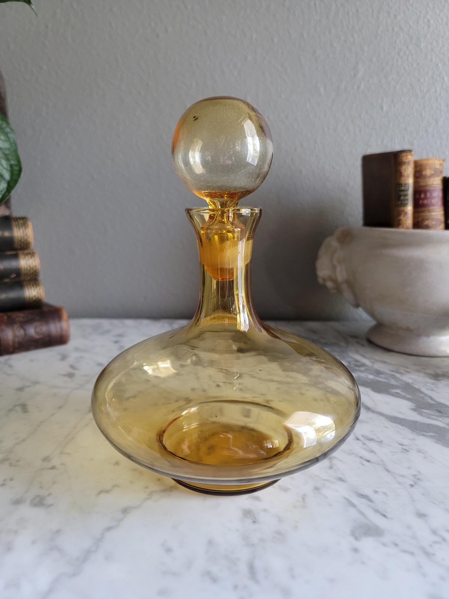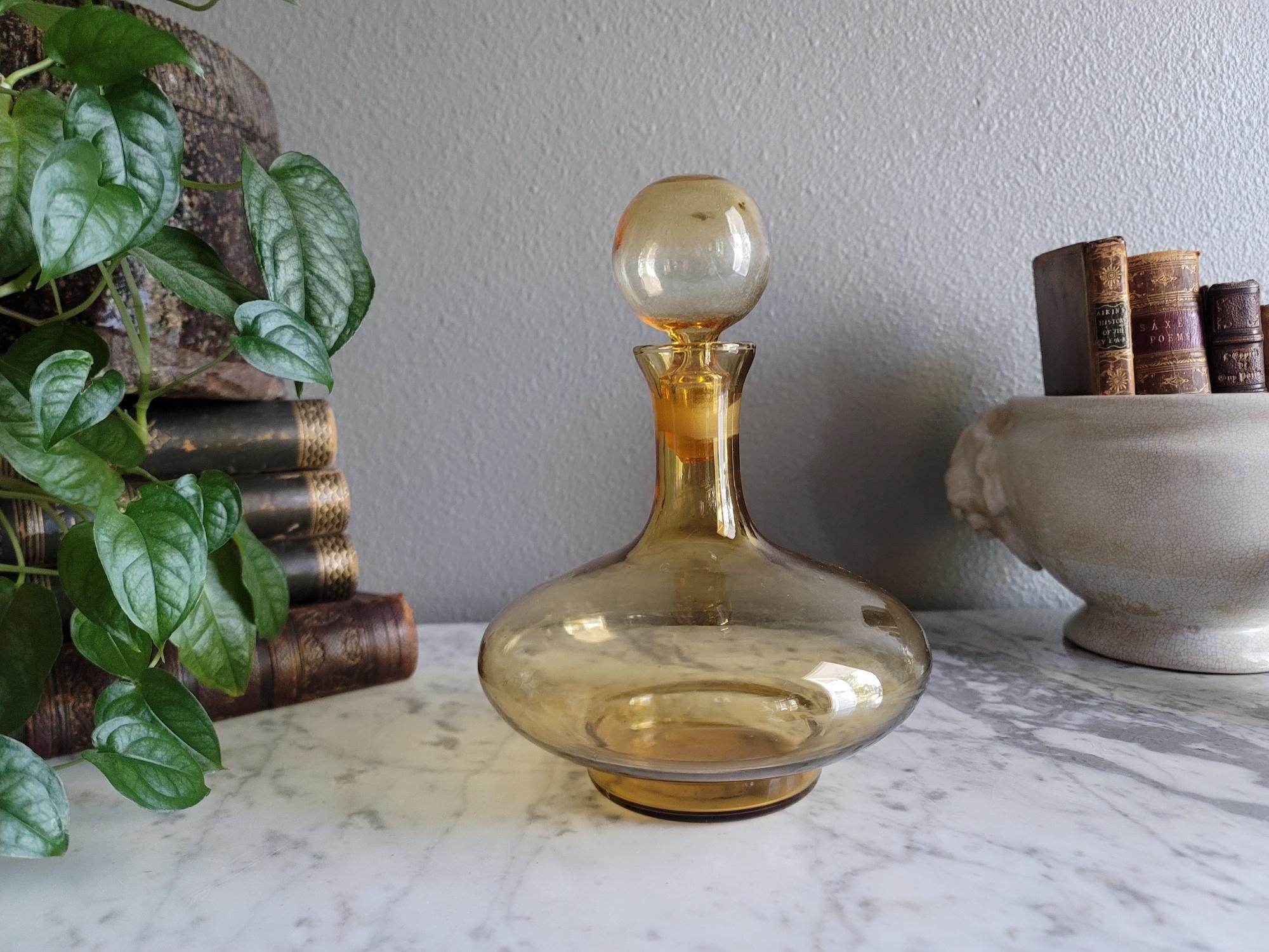 This yellow decanter has a really beautiful ocher hue. It was delicately hand blown and remains in beautiful condition. This decanter has no chips, cracks or breaks and would be the perfect for your home bar cart and a great way to elevate your entertainment game. Due to its handblown nature, there are bubbles in the glass here and there that add excellent character.
