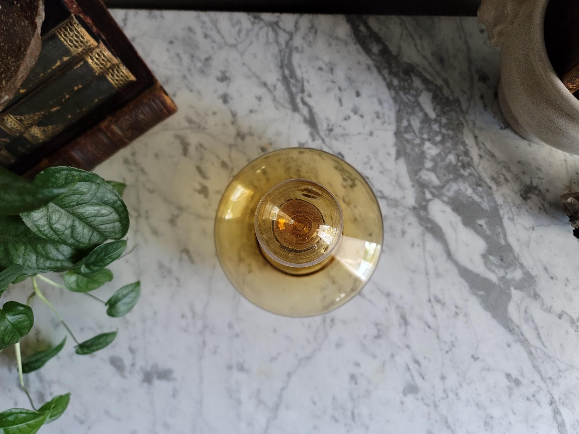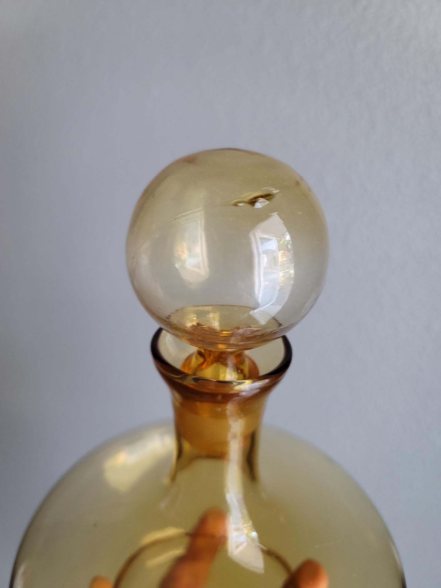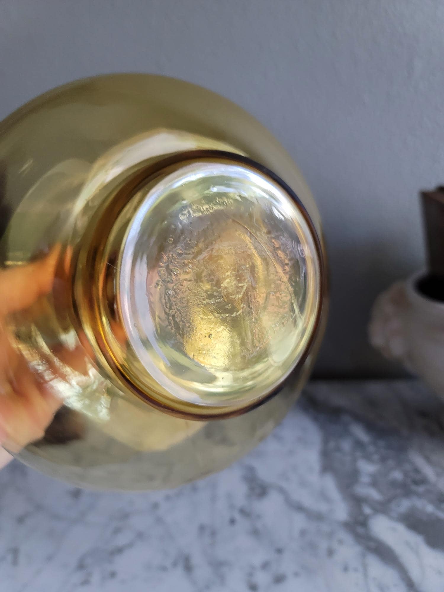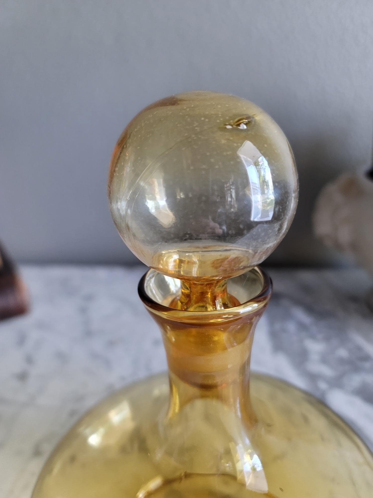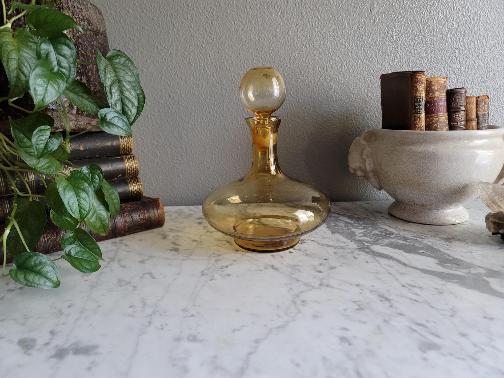 This yellow decanter has a really beautiful ocher hue. It was delicately hand blown and remains in beautiful condition. This decanter has no chips, cracks or breaks and would be the perfect for your home bar cart and a great way to elevate your entertainment game. Due to its handblown nature, there are bubbles in the glass here and there that add excellent character.