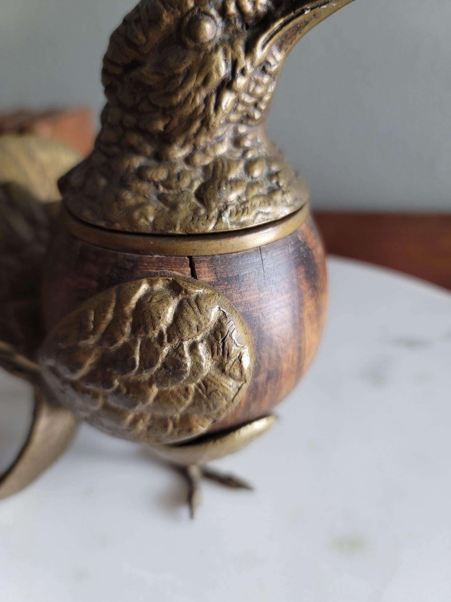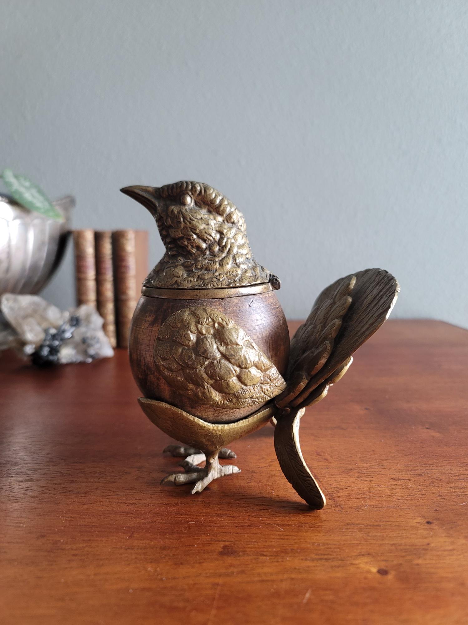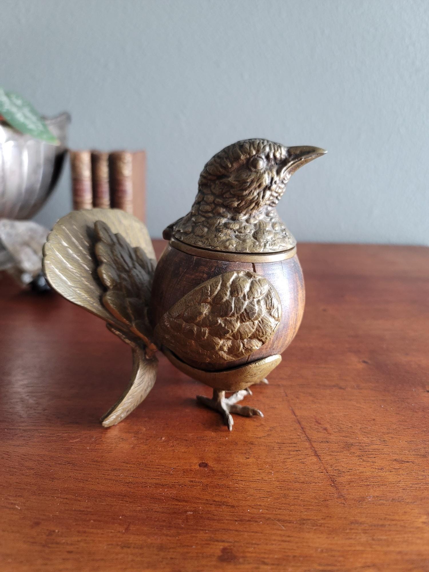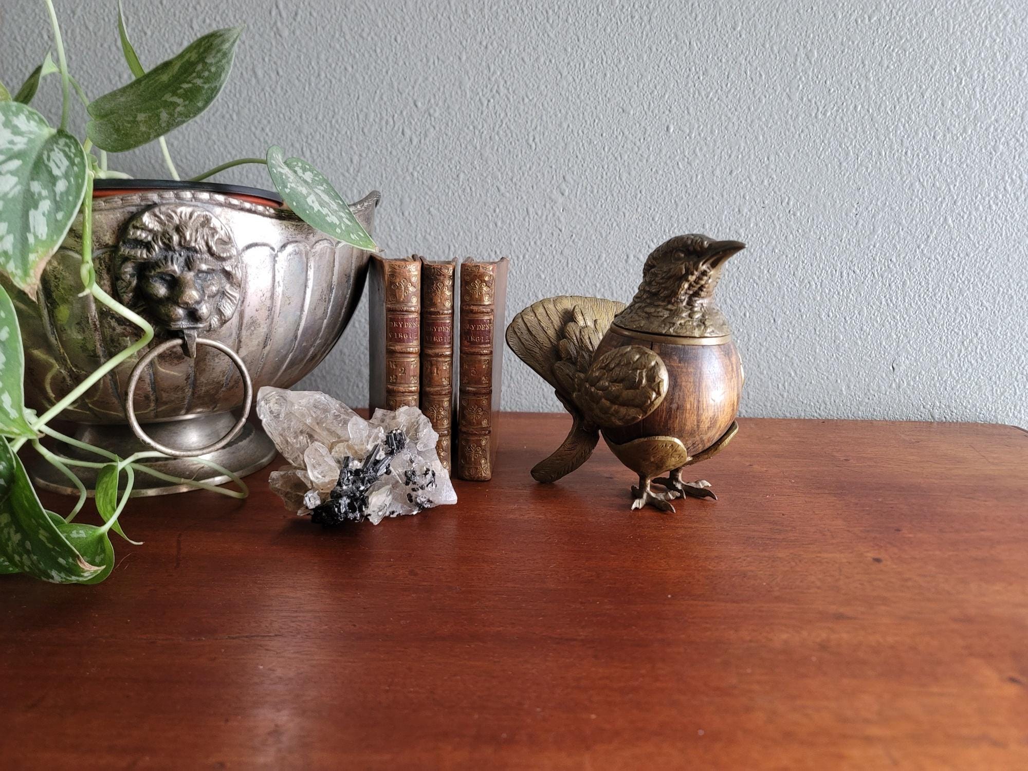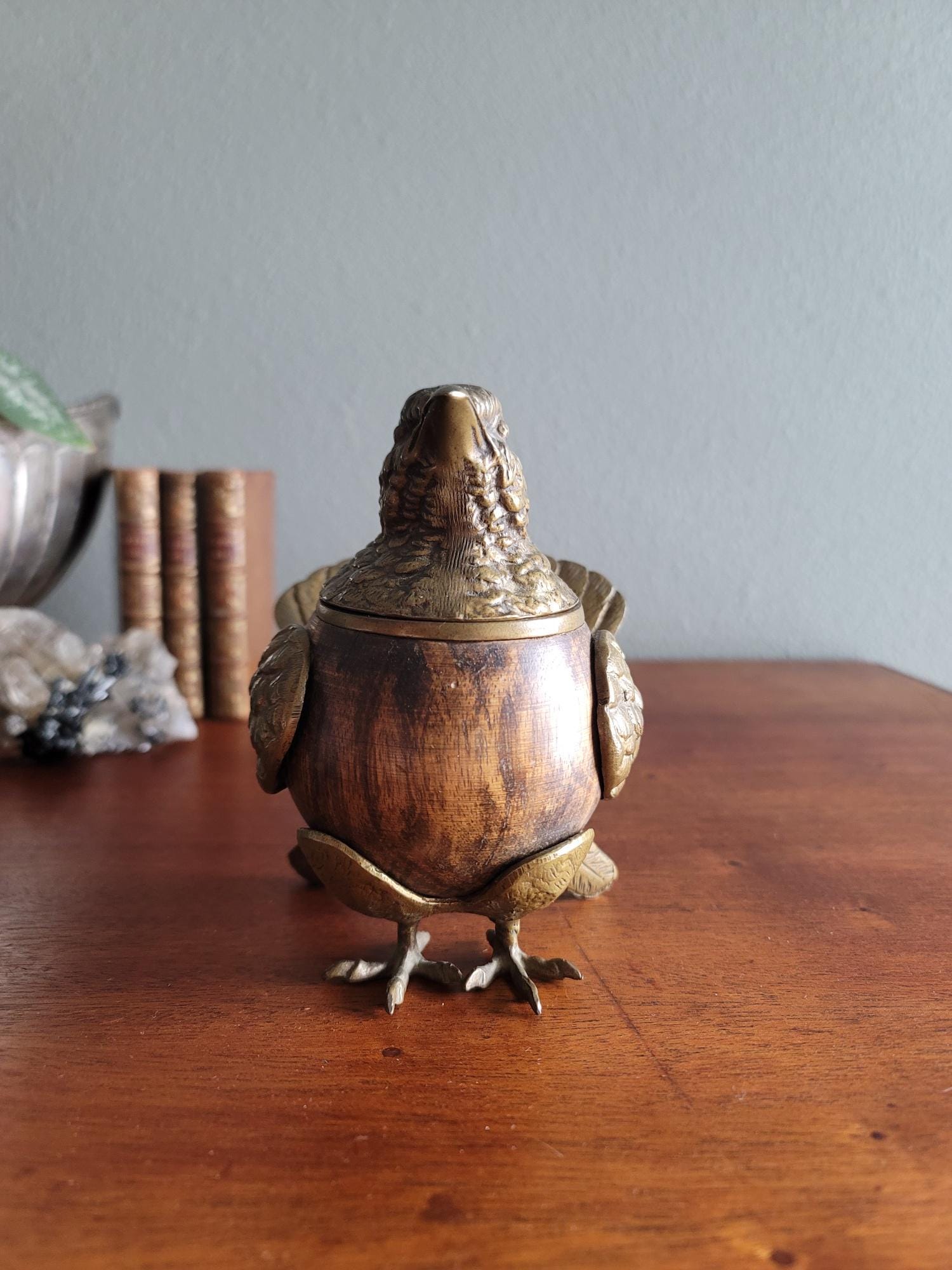 Late Mid-Century Arthur Court bird inkwell. Carved coconut body with bronze metalwork. Arthur court were well known for blending natural elements and intricate metalwork. We love the pheasant vibes the bird has. Very heavy in design and in really great vintage condition. There is one compaction and expansion crack on the coconut housing that can be seen above the right hand ring. Other minor knicks and scratches due to age but no major disclosures to note. This inkwell makes for the perfect stash box, perfect for stashing a little cash or other small keepsakes.