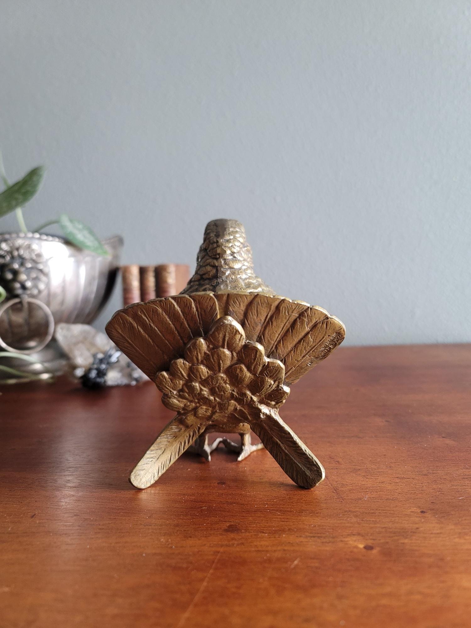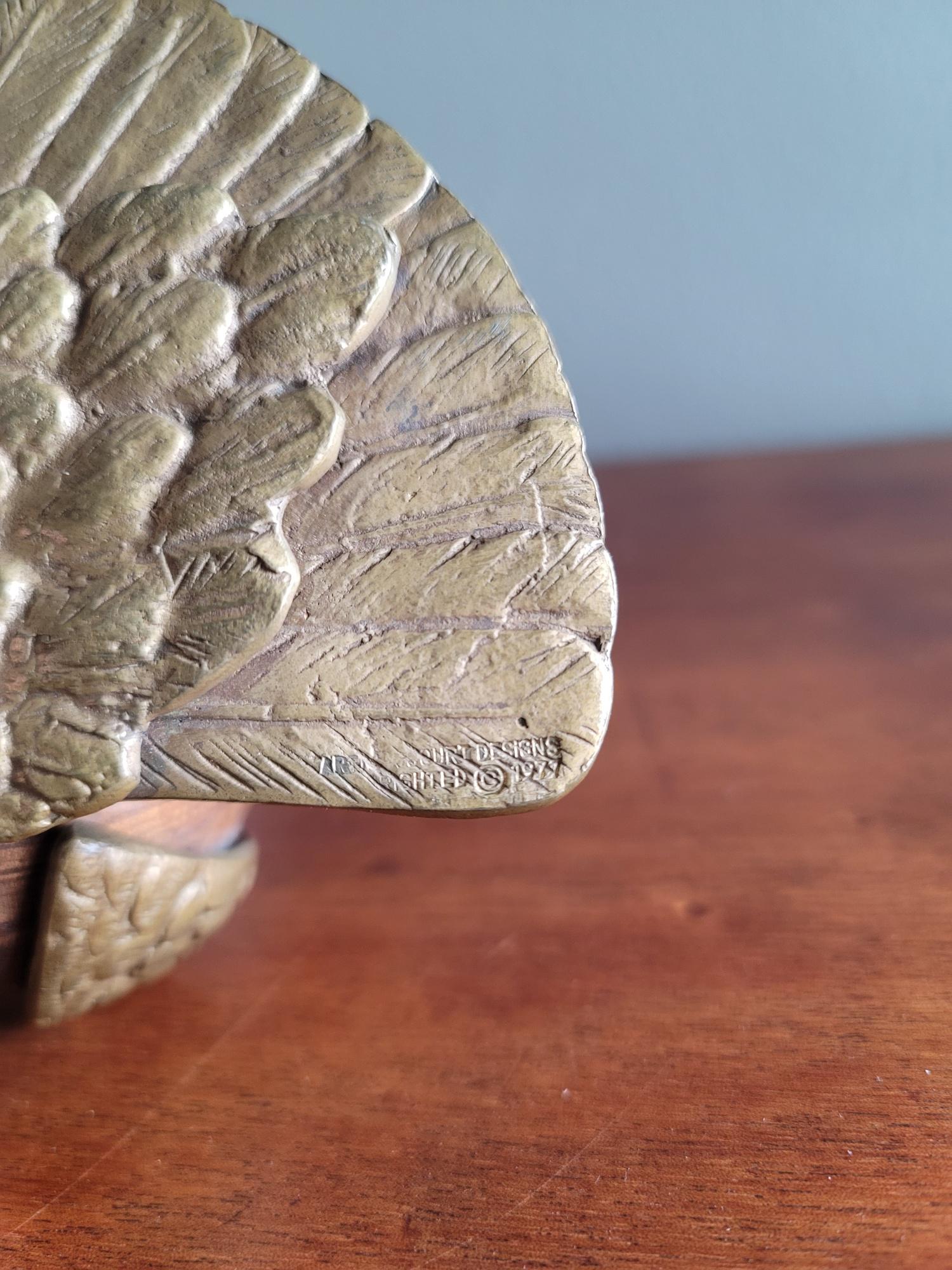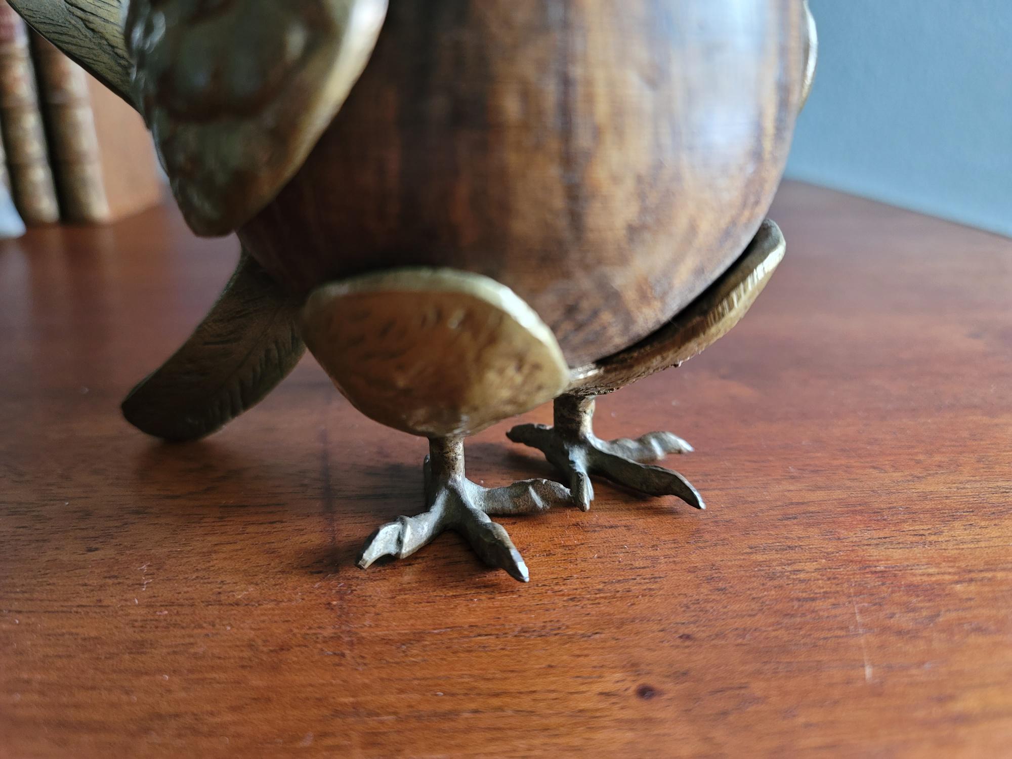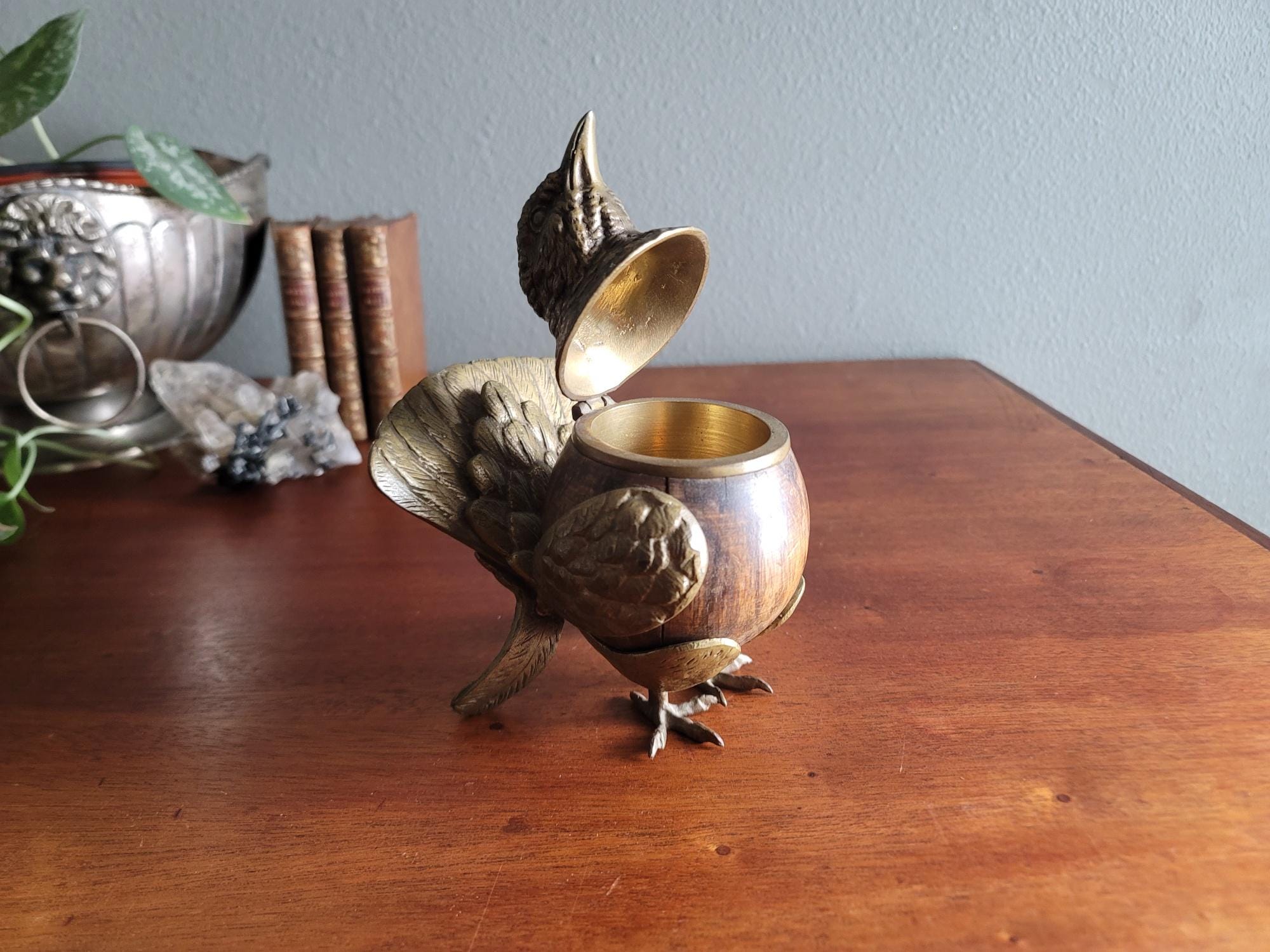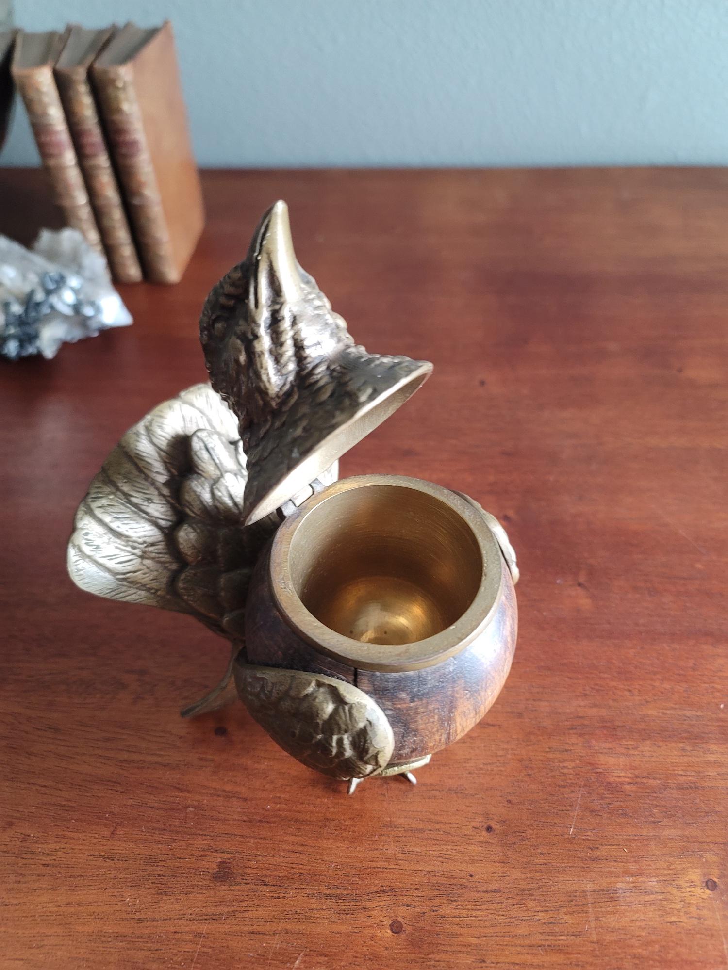 Late Mid-Century Arthur Court bird inkwell. Carved coconut body with bronze metalwork. Arthur court were well known for blending natural elements and intricate metalwork. We love the pheasant vibes the bird has. Very heavy in design and in really great vintage condition. There is one compaction and expansion crack on the coconut housing that can be seen above the right hand ring. Other minor knicks and scratches due to age but no major disclosures to note. This inkwell makes for the perfect stash box, perfect for stashing a little cash or other small keepsakes.