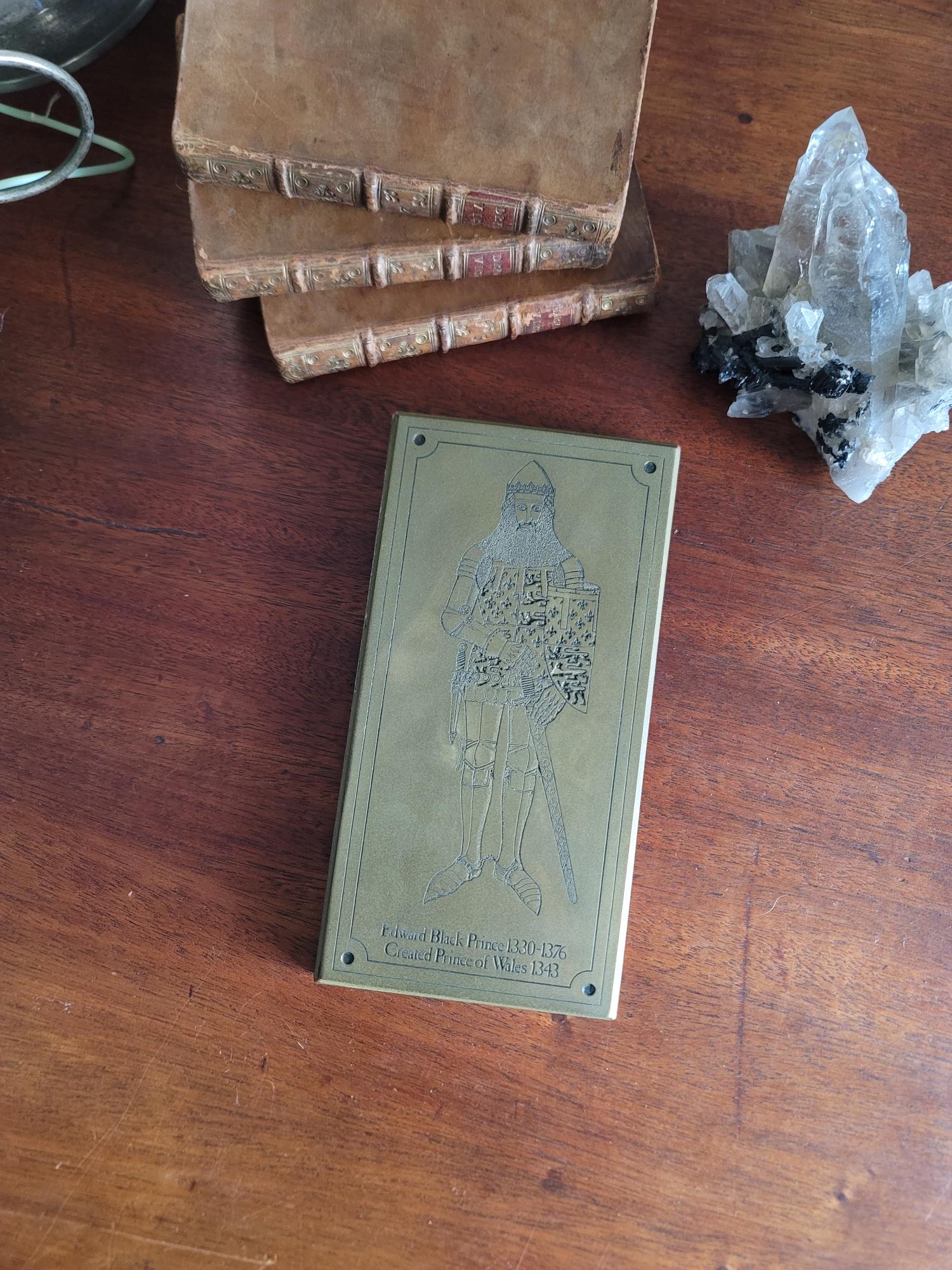 Brass painted resin plaque commemorating Edward The Black Prince. It is unknown how Edward of Woodstock gained the title of the “Black Prince” but it may have been due to the color of his distinctive black armor or possibly his scorched-earth style military strategy. This plaque is vintage in age and handmade in England (likely as a souvenir). There is a hanger installed on the back of this piece and the corners rubbed from age. Perfect to add to a gallery wall.