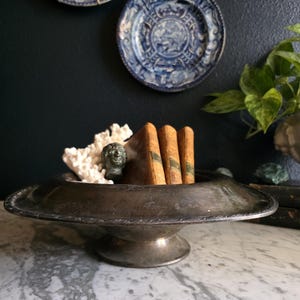 This brass vintage pedestal compote was made in South Korea and has a really stunning cast design around the inside perimeter of the tray featuring a crane filled landscape. The brass this compote has cast with has a really beautiful bronze tone that provides distinct depth and character. There are signs of age and wear in the form of a dulled finish, lots of patina and a small dent in the footing of the compote. Sturdy in construction with a great weight. A perfect accent piece for anywhere in the home, studio or office.