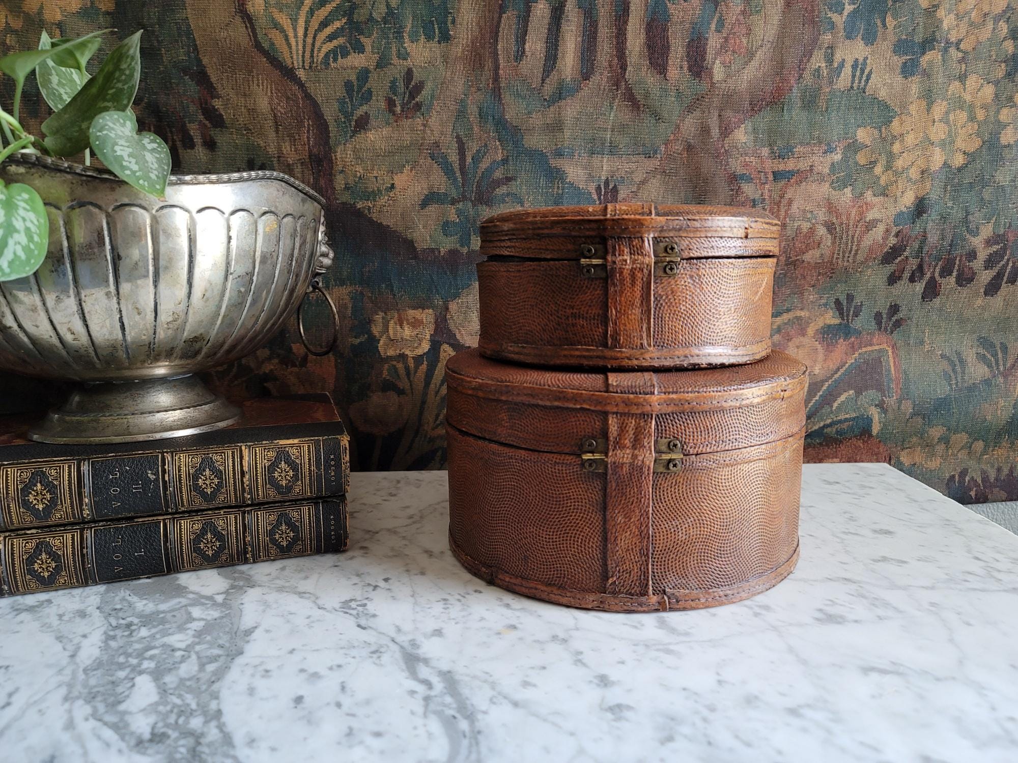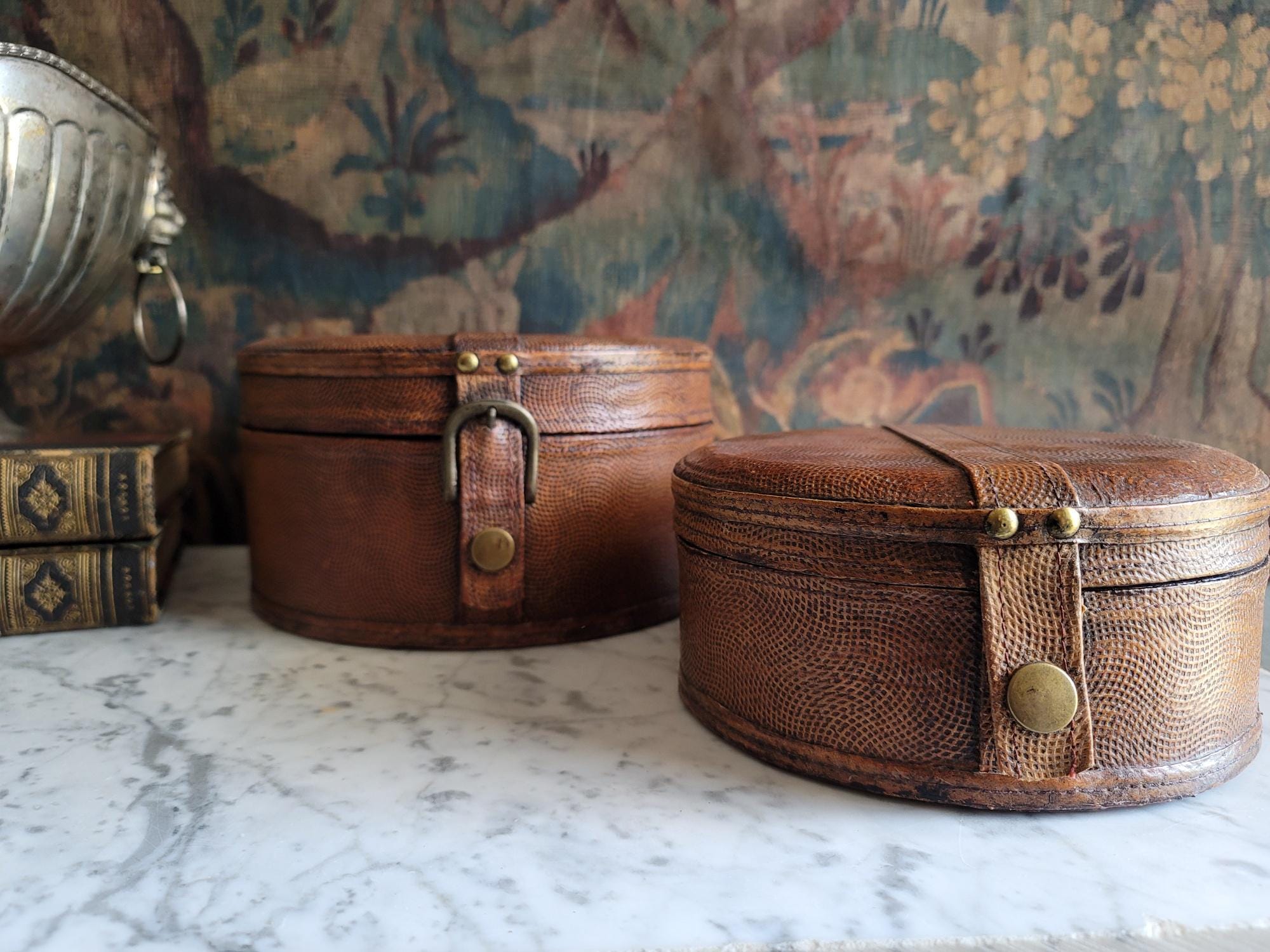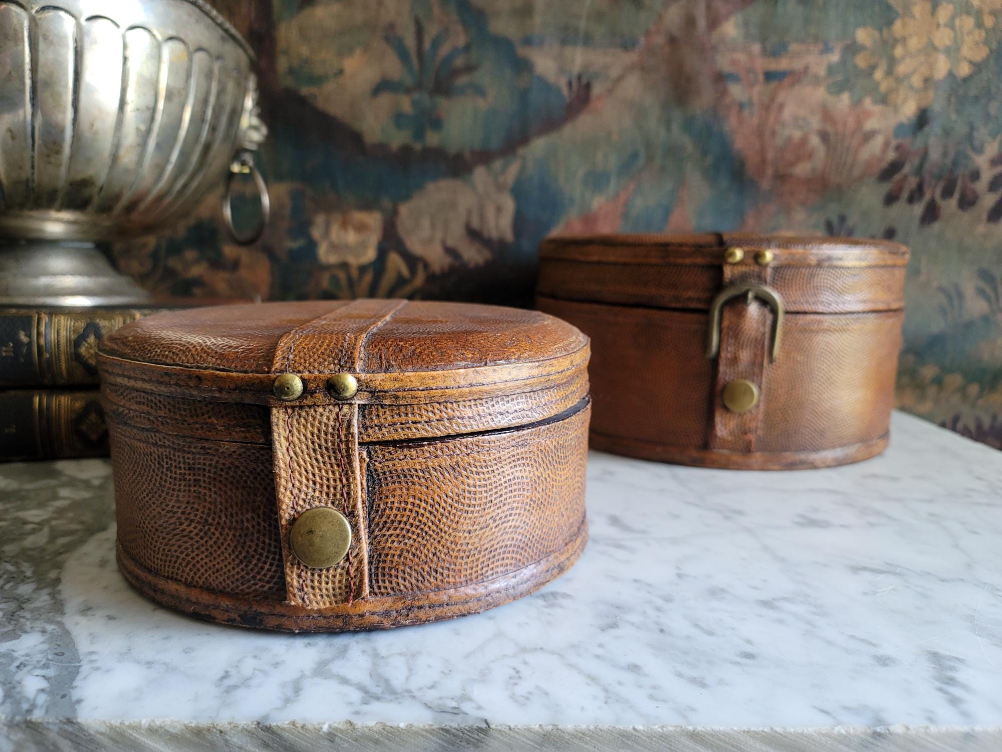 In excellent condition, these two stacking collar boxes have a really beautiful textured chestnut leather exterior with working button closures. These boxes could be antique, but due to us not being certain on their exact age, they are being sold as vintage items. The exterior leather surfaces and interior felt linings show minor wear consistent with age and no major flaws to note. See listing photos for best description of condition. When closed, there is minor gaping around the sides of the lid where the lid meets the base. These boxes make perfect modern storage solutions and can be used anywhere in the home, studio, or office.