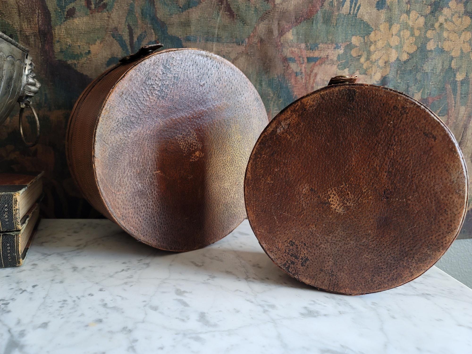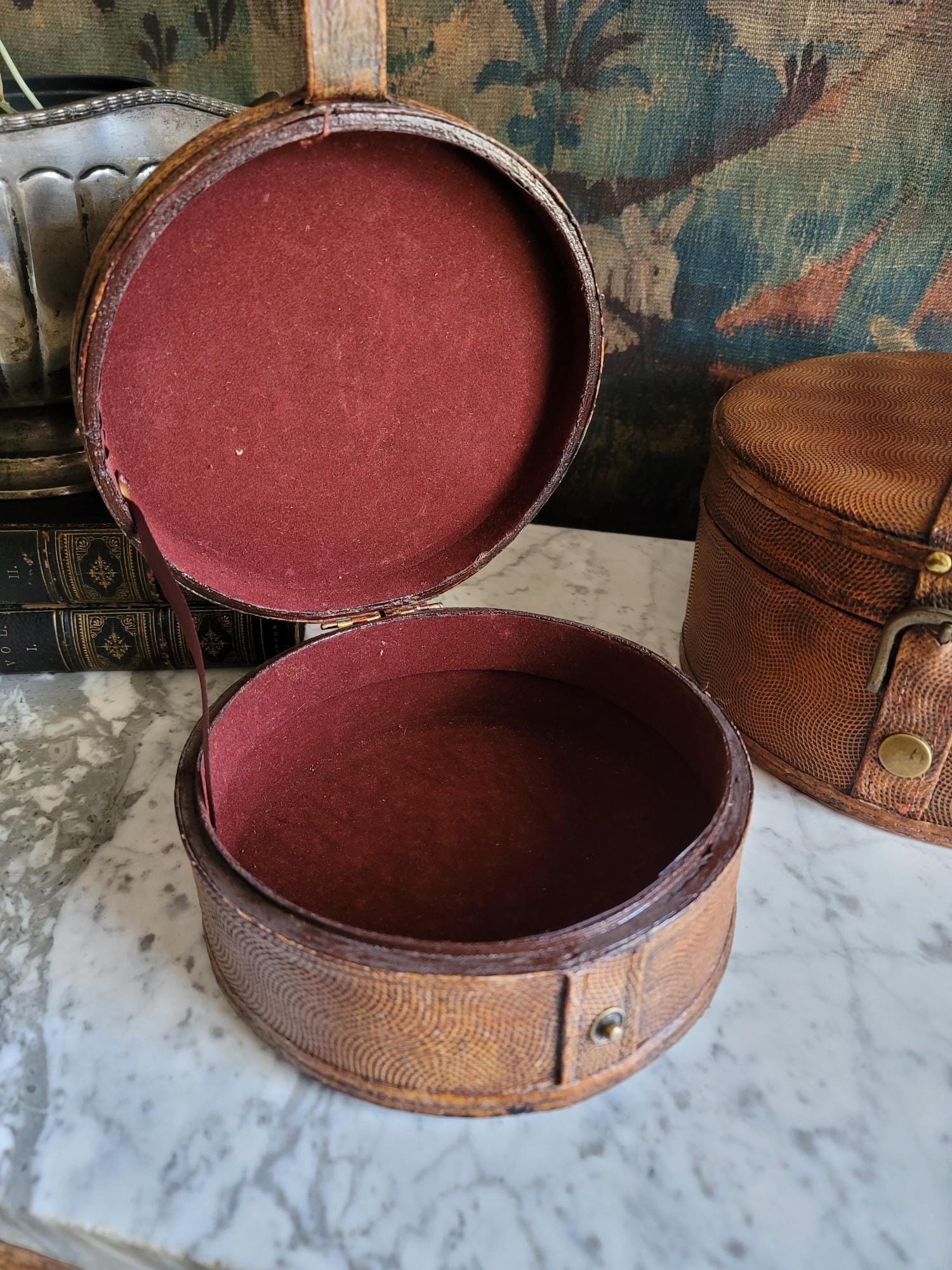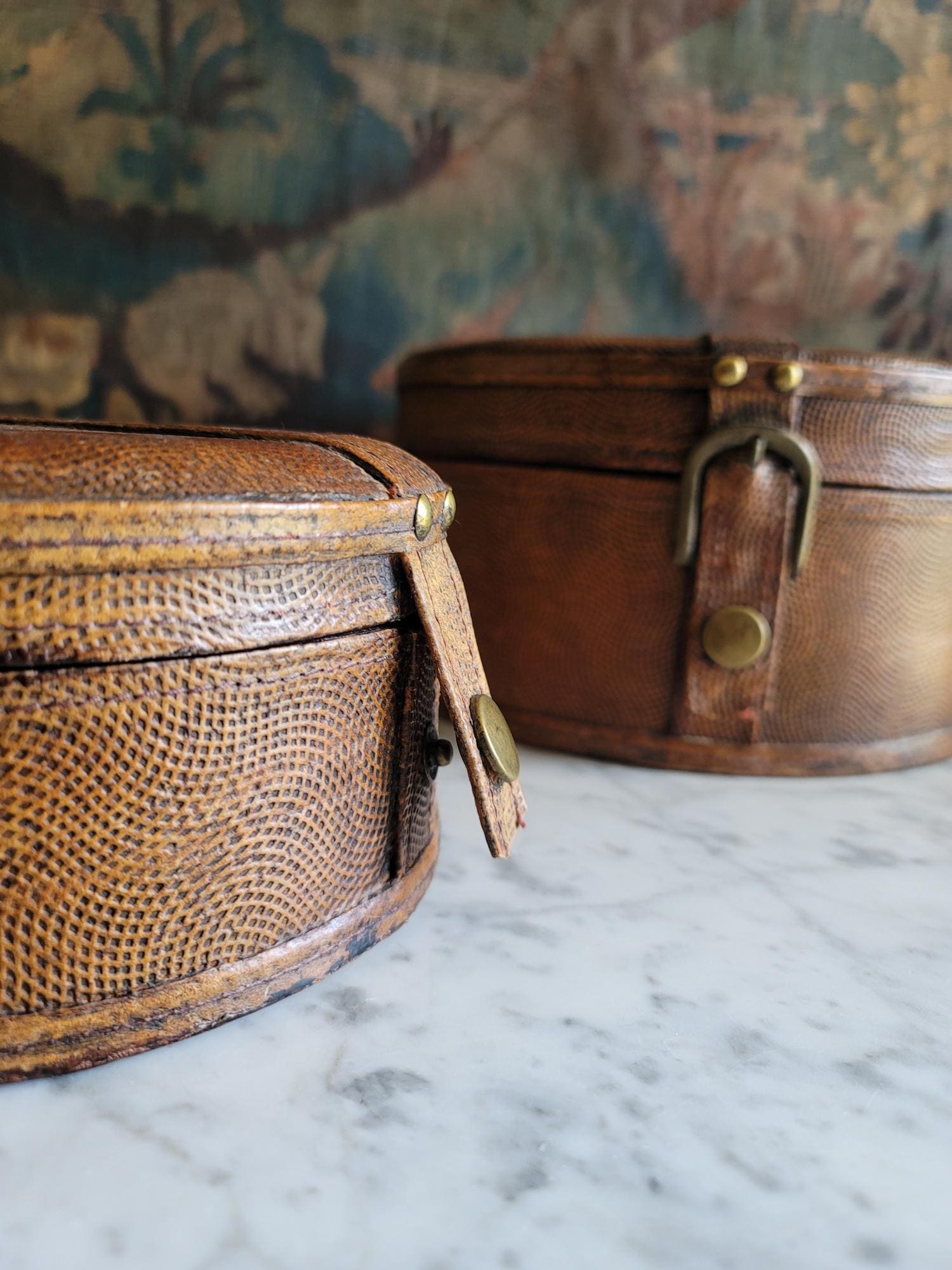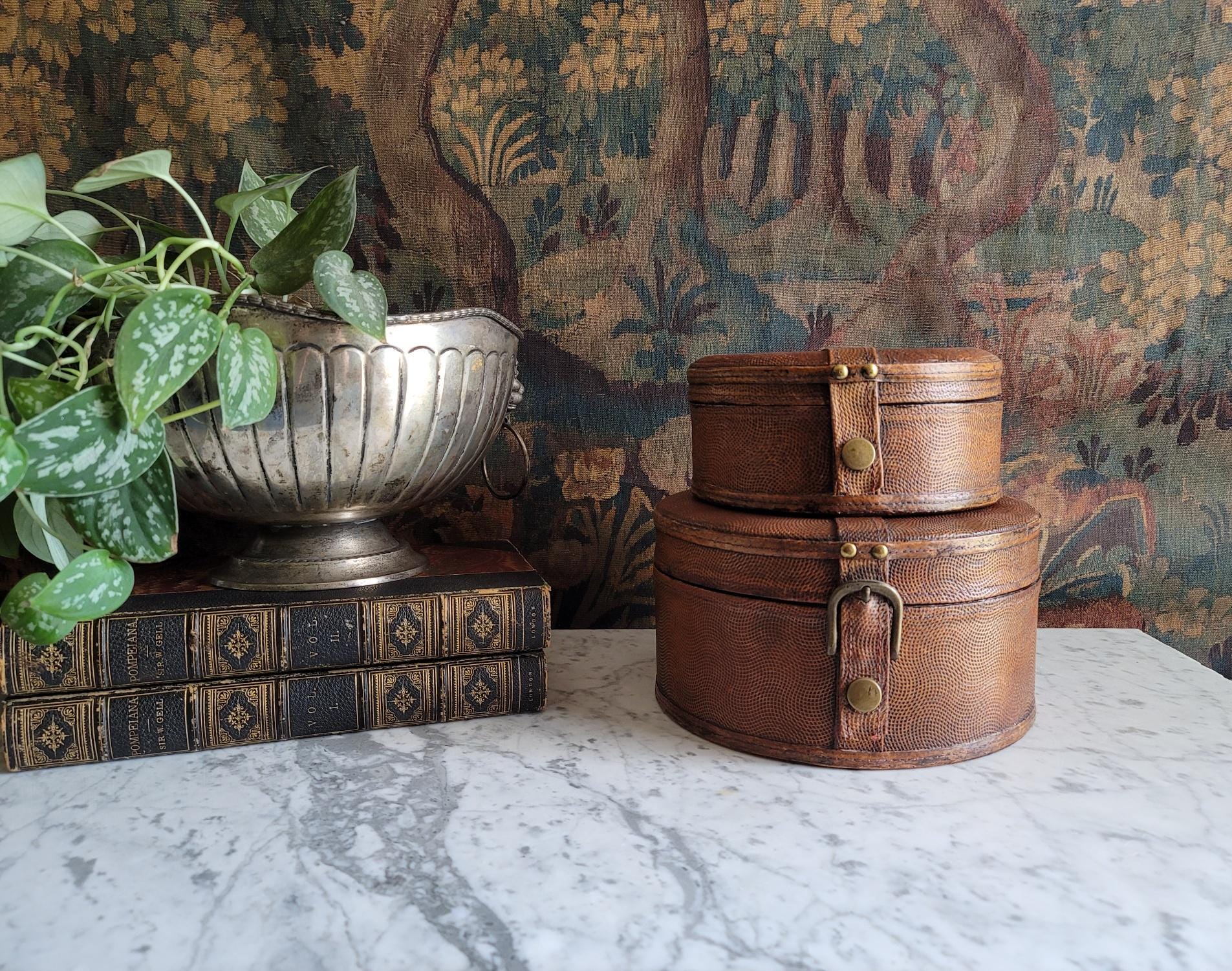 In excellent condition, these two stacking collar boxes have a really beautiful textured chestnut leather exterior with working button closures. These boxes could be antique, but due to us not being certain on their exact age, they are being sold as vintage items. The exterior leather surfaces and interior felt linings show minor wear consistent with age and no major flaws to note. See listing photos for best description of condition. When closed, there is minor gaping around the sides of the lid where the lid meets the base. These boxes make perfect modern storage solutions and can be used anywhere in the home, studio, or office.