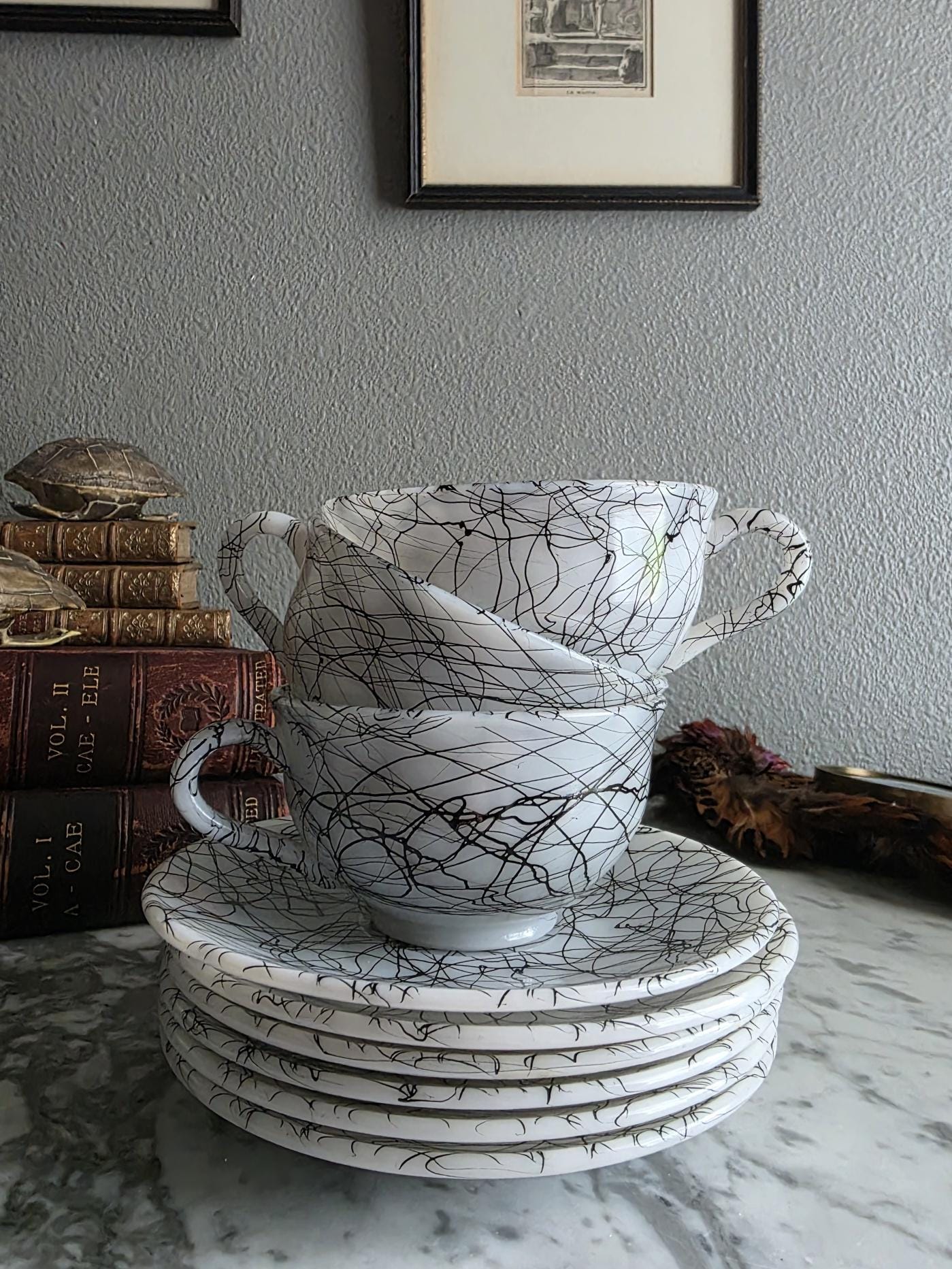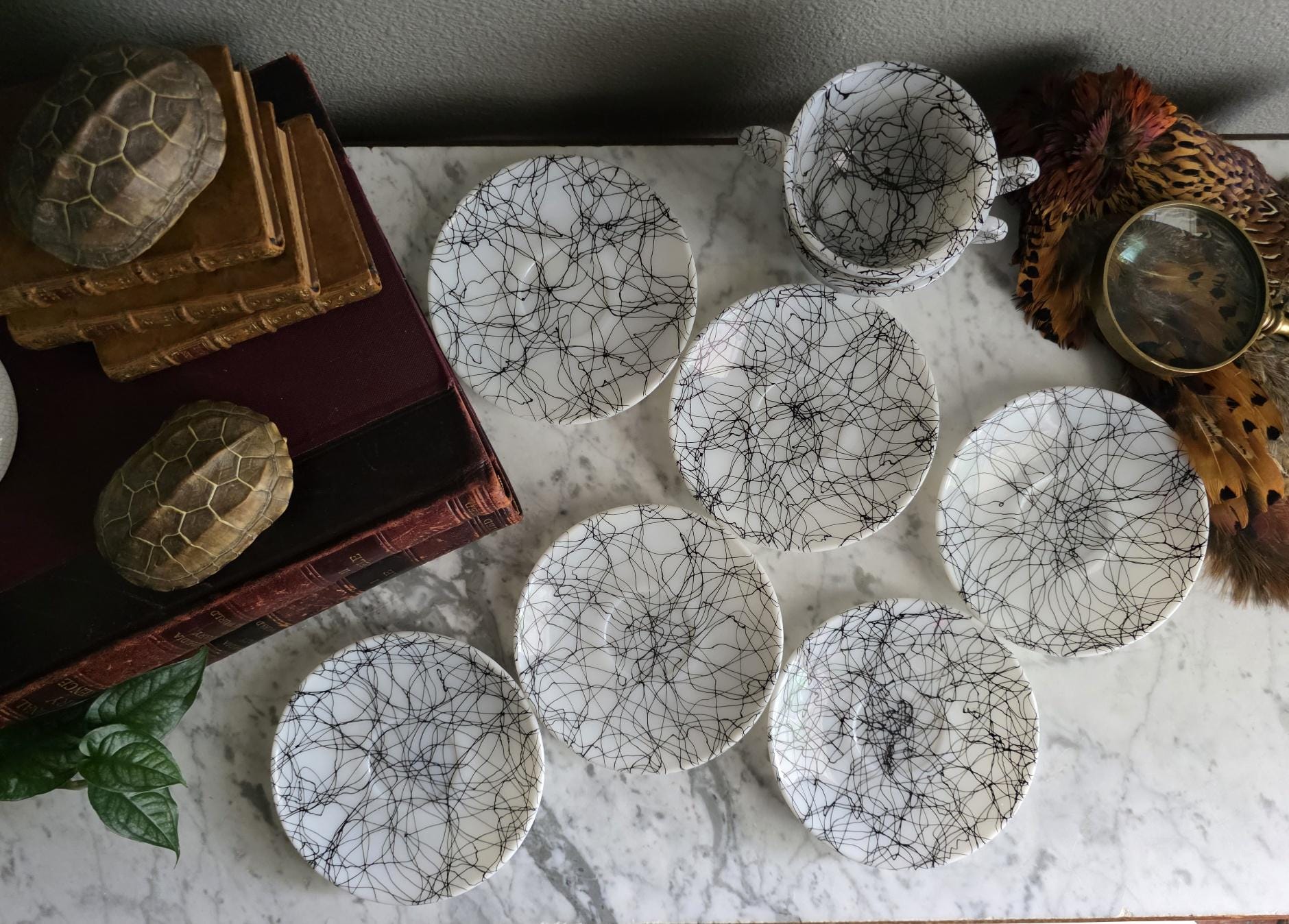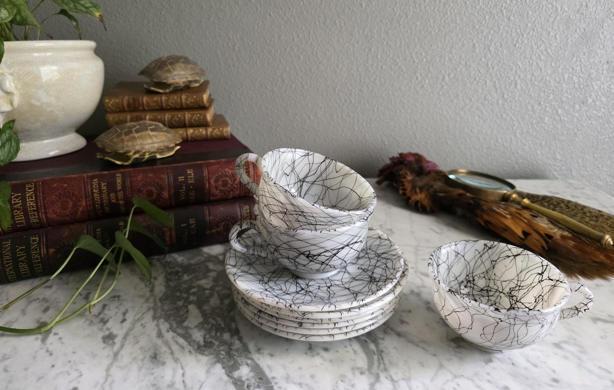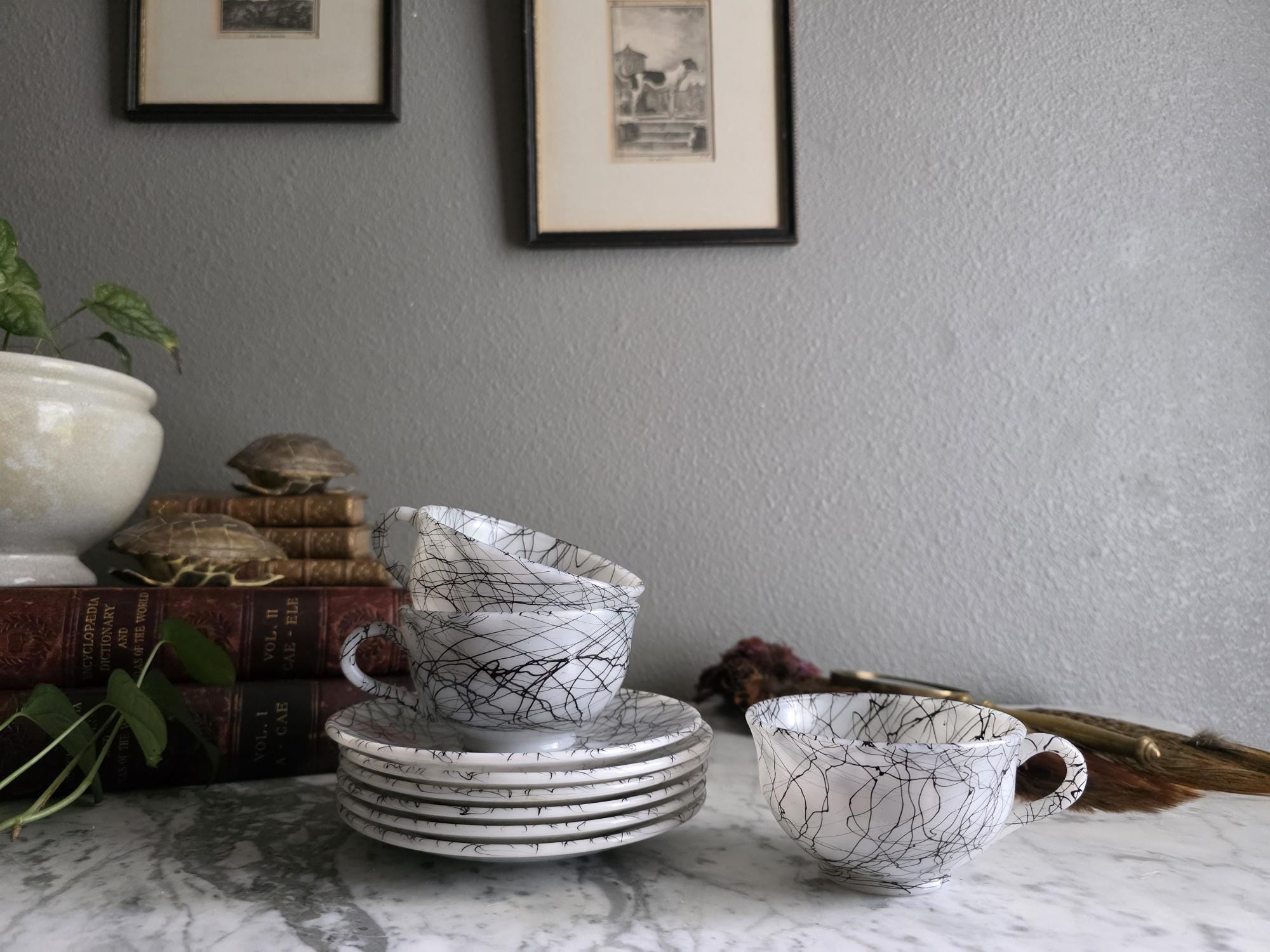 This striking set captures the vibrant, abstract energy of the 1950s and 60s, a must-have for any lover of Atomic Era design. Known to collectors as "Spaghetti Drizzle," "String Drizzle," or "Black Wire," this bold design features a chaotic, abstract web of fine black lines dynamically crisscrossing a crisp white ceramic body. The pattern embodies the post-war fascination with scientific energy and spontaneous art.