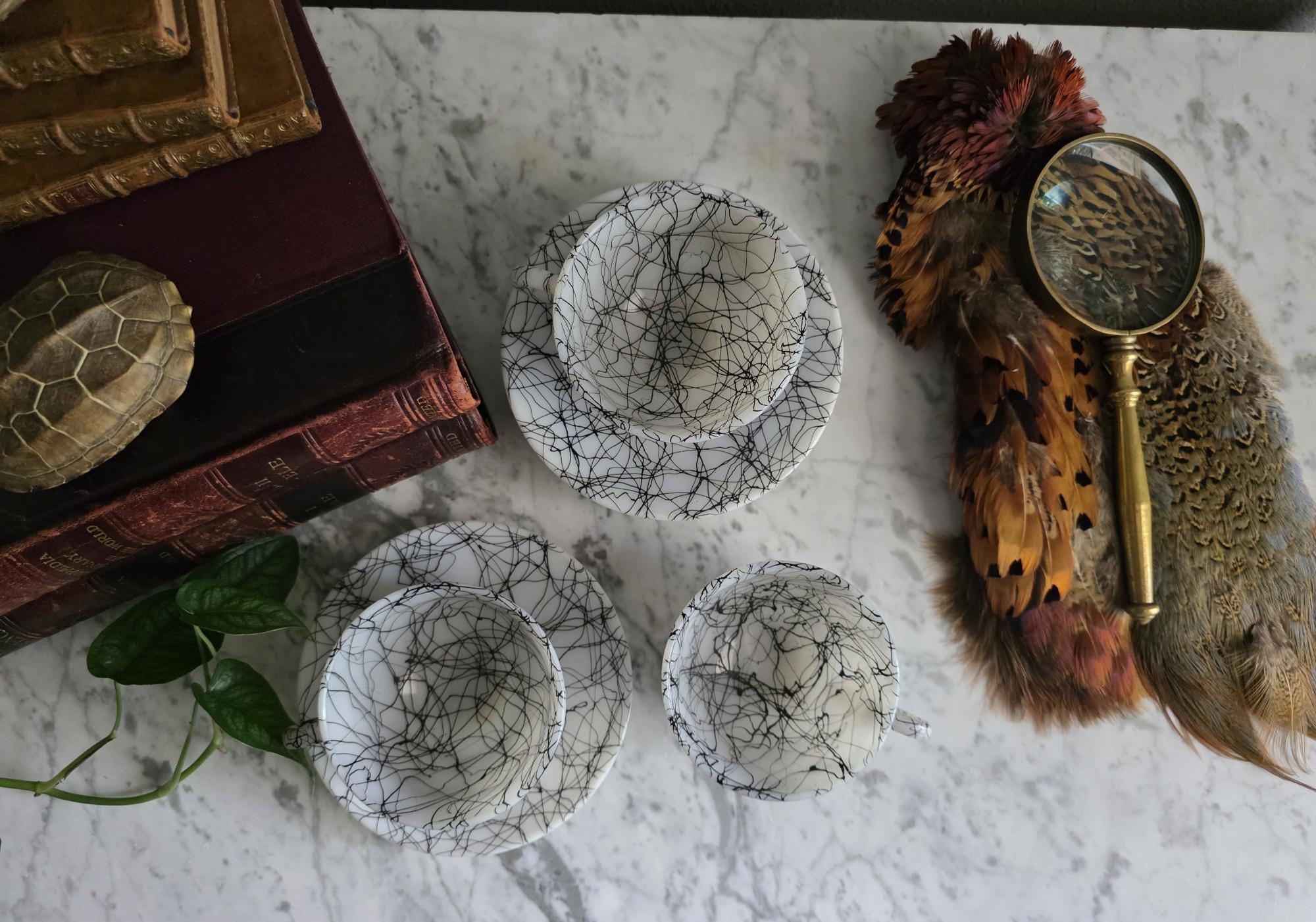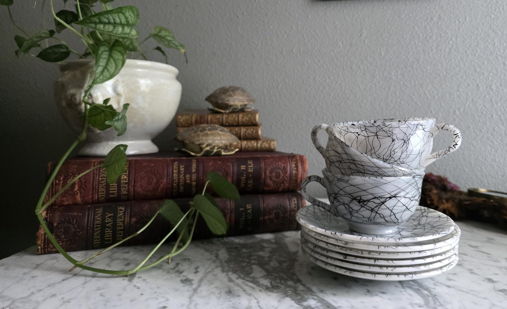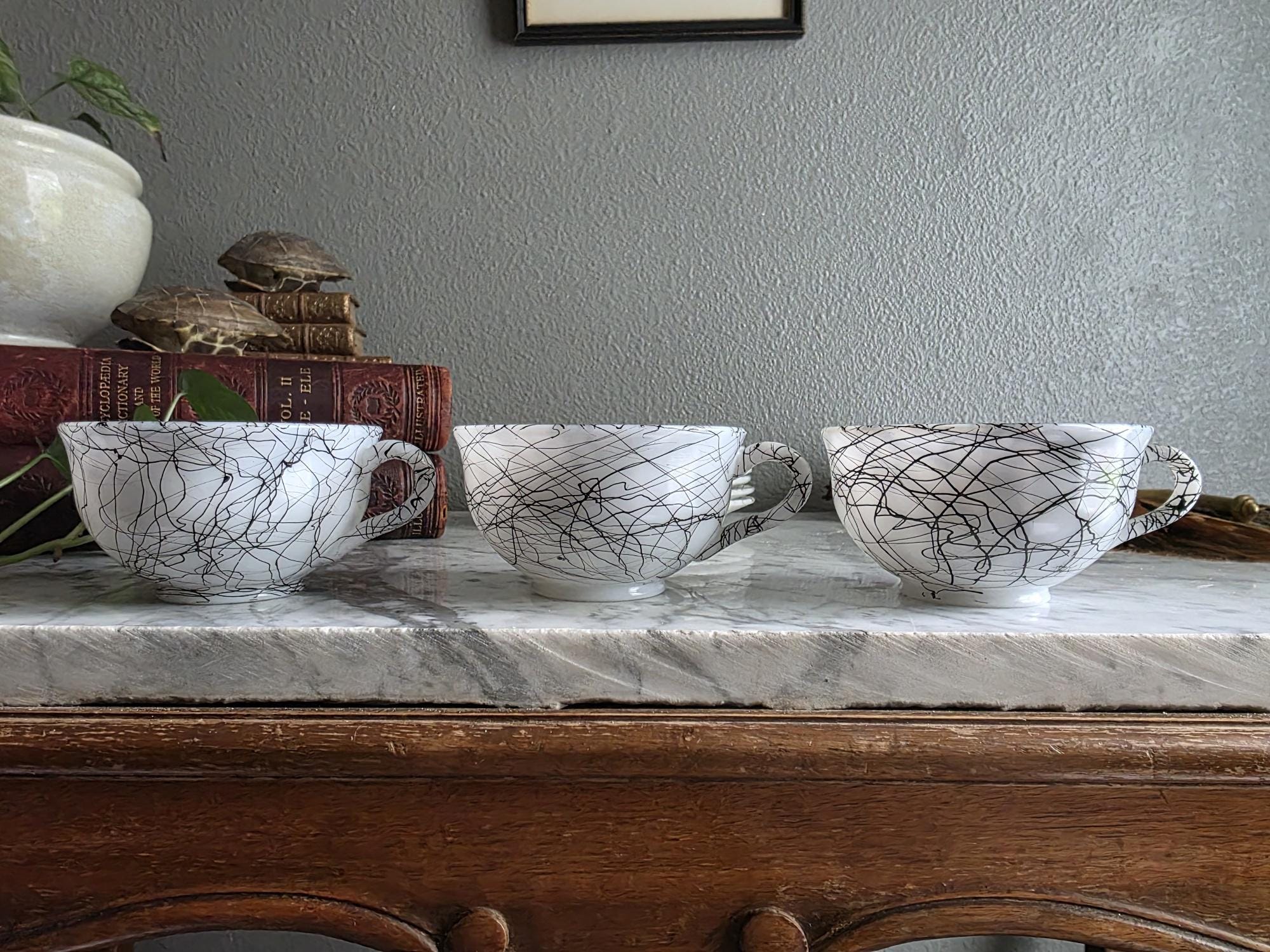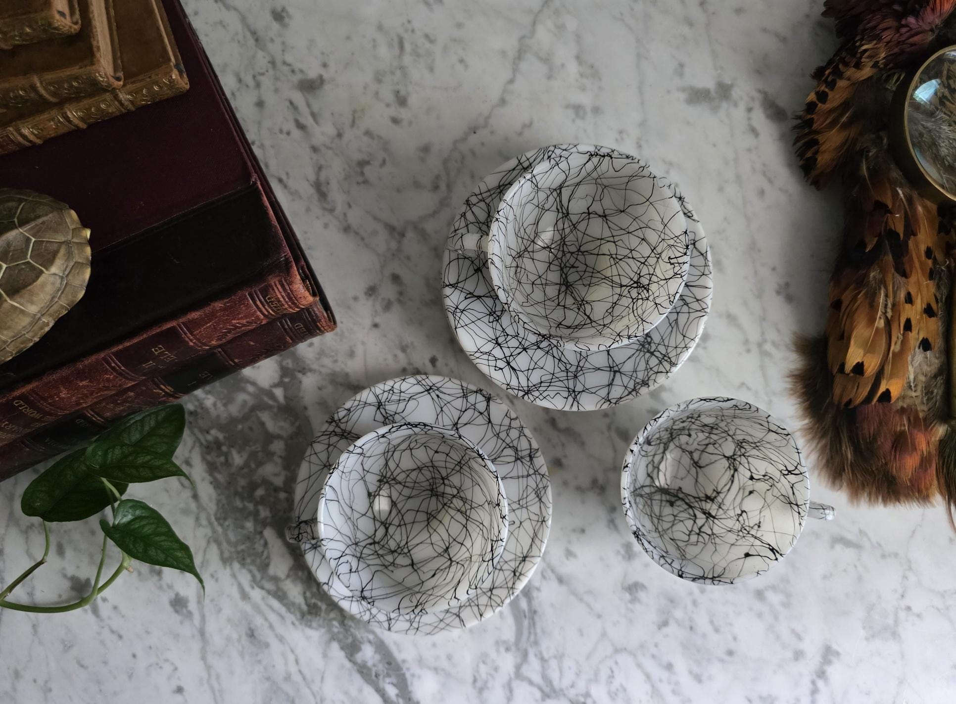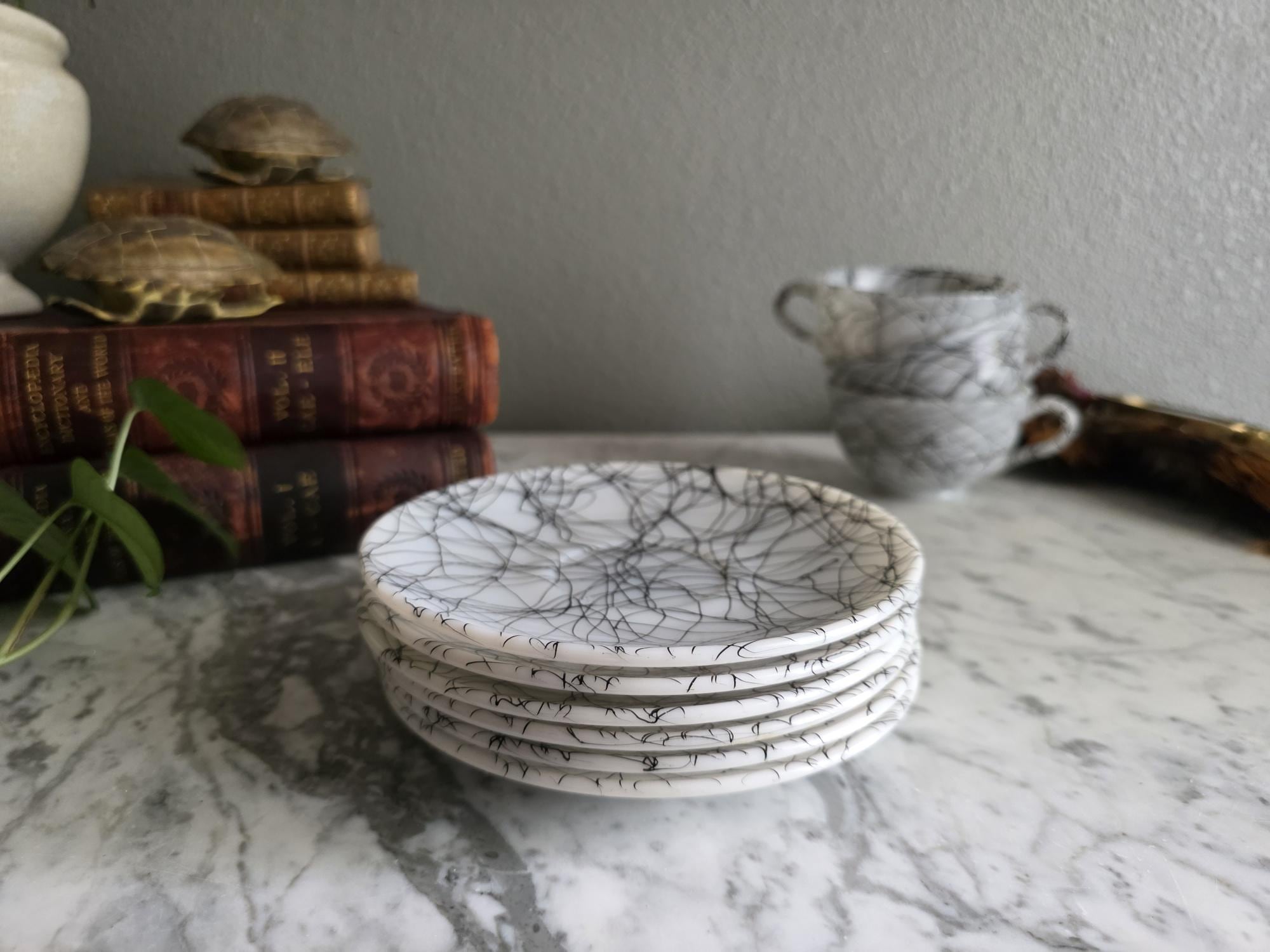 This striking set captures the vibrant, abstract energy of the 1950s and 60s, a must-have for any lover of Atomic Era design. Known to collectors as "Spaghetti Drizzle," "String Drizzle," or "Black Wire," this bold design features a chaotic, abstract web of fine black lines dynamically crisscrossing a crisp white ceramic body. The pattern embodies the post-war fascination with scientific energy and spontaneous art.