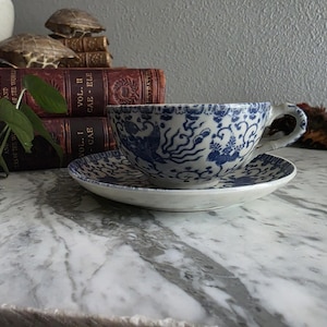 Measurements (approximate): Saucer - 5.75 inches in diameter x 0.5 inches in height Teacup - 4.5 inches wide x 3.75 inches in diameter x 2.25 inches tall