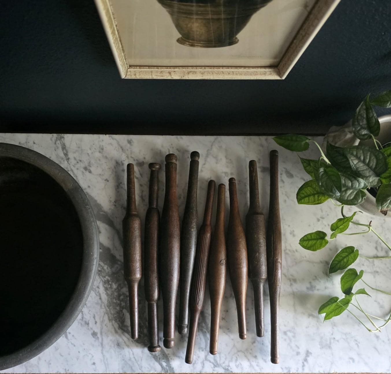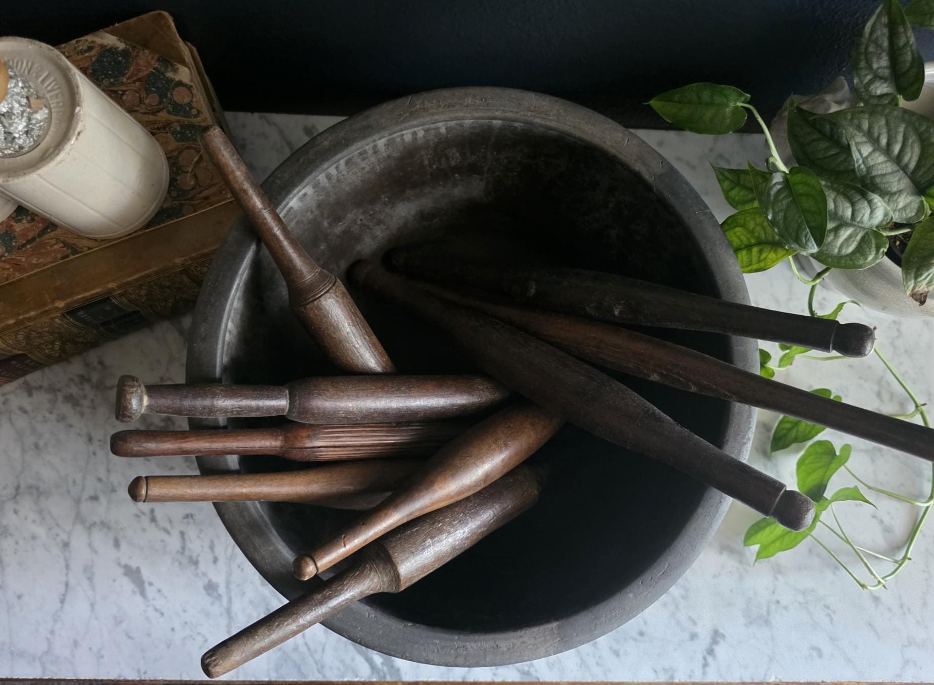 Nine (9) Antique Wooden Chapati Rolling Pins: A collection of nine antique, hand-turned wooden pins, often referred to as chapati pins or French rolling pins. Each one displays a unique grain, wear patterns, and a beautiful dark patina that can only come from age and use. They are wonderful displayed en masse, either standing upright in the bowl or laid out.