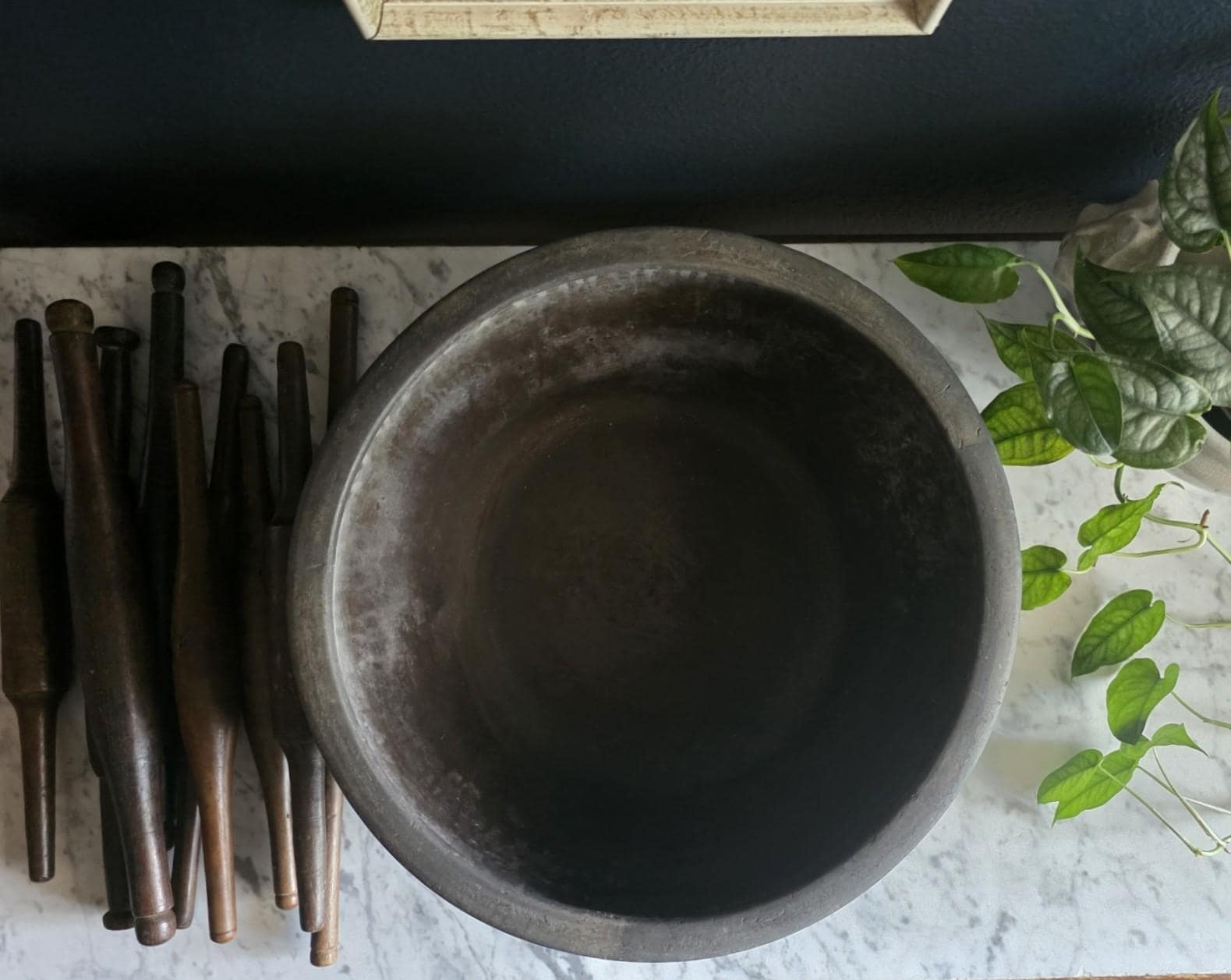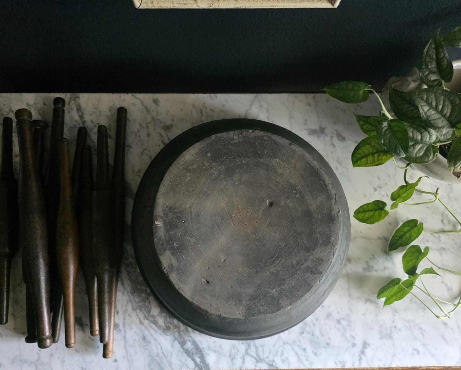 One (1) Large Vintage Earthenware Bowl: Its dark, matte black/gray finish and substantial size make it a striking centerpiece. The interior shows signs of age and use, giving it a powerful rustic character.