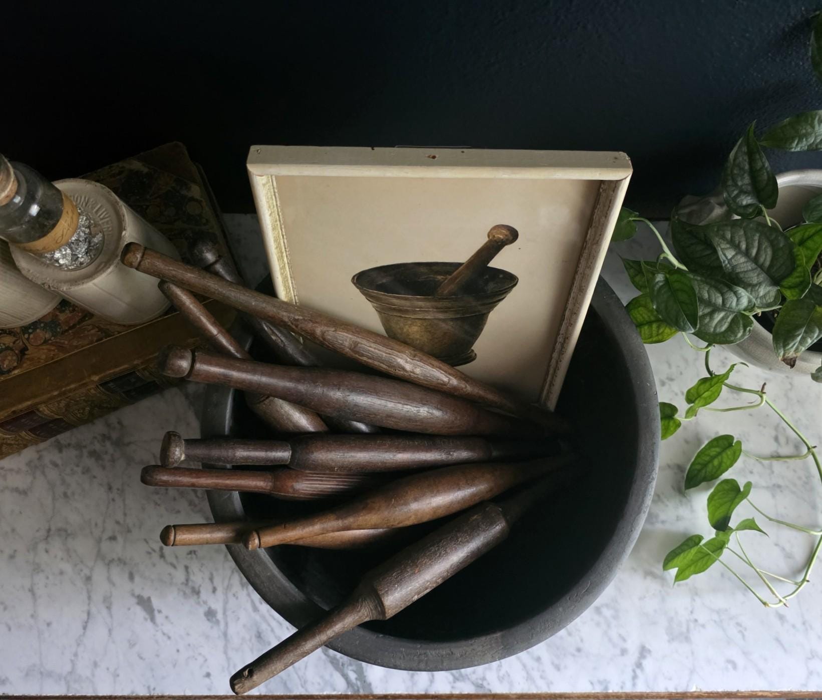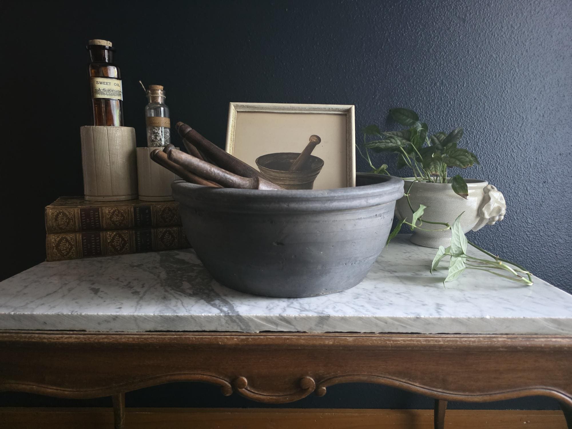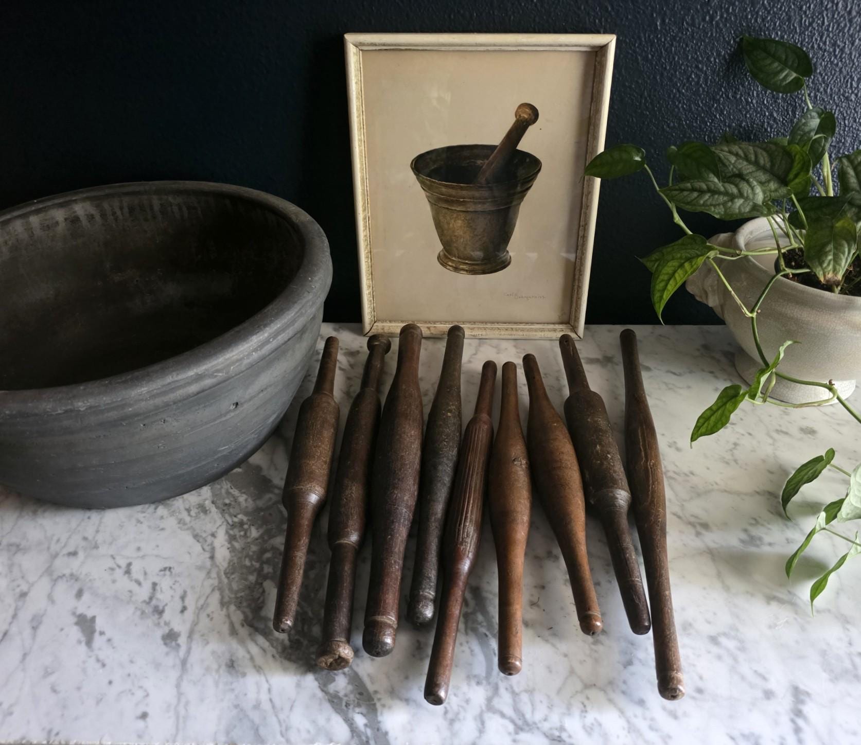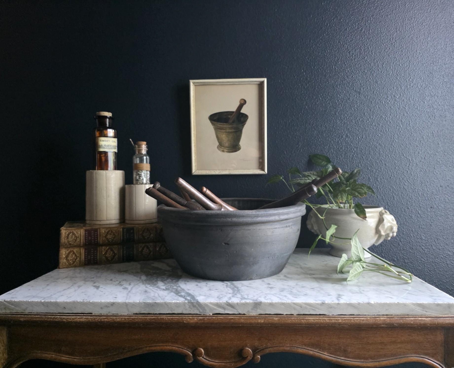 This is a stunning, curated collection of antique and vintage items, perfect for creating a dramatic and historically-inspired still life display in your kitchen, study, or living room. The 11-piece set is centered around a dark, imposing earthenware bowl and features original textures and rich patina built up over decades. You will receive the bowl, rolling pins, and framed print with the purchase of this listing. All other items photographed are not included in the listing and are for decorative purposes.