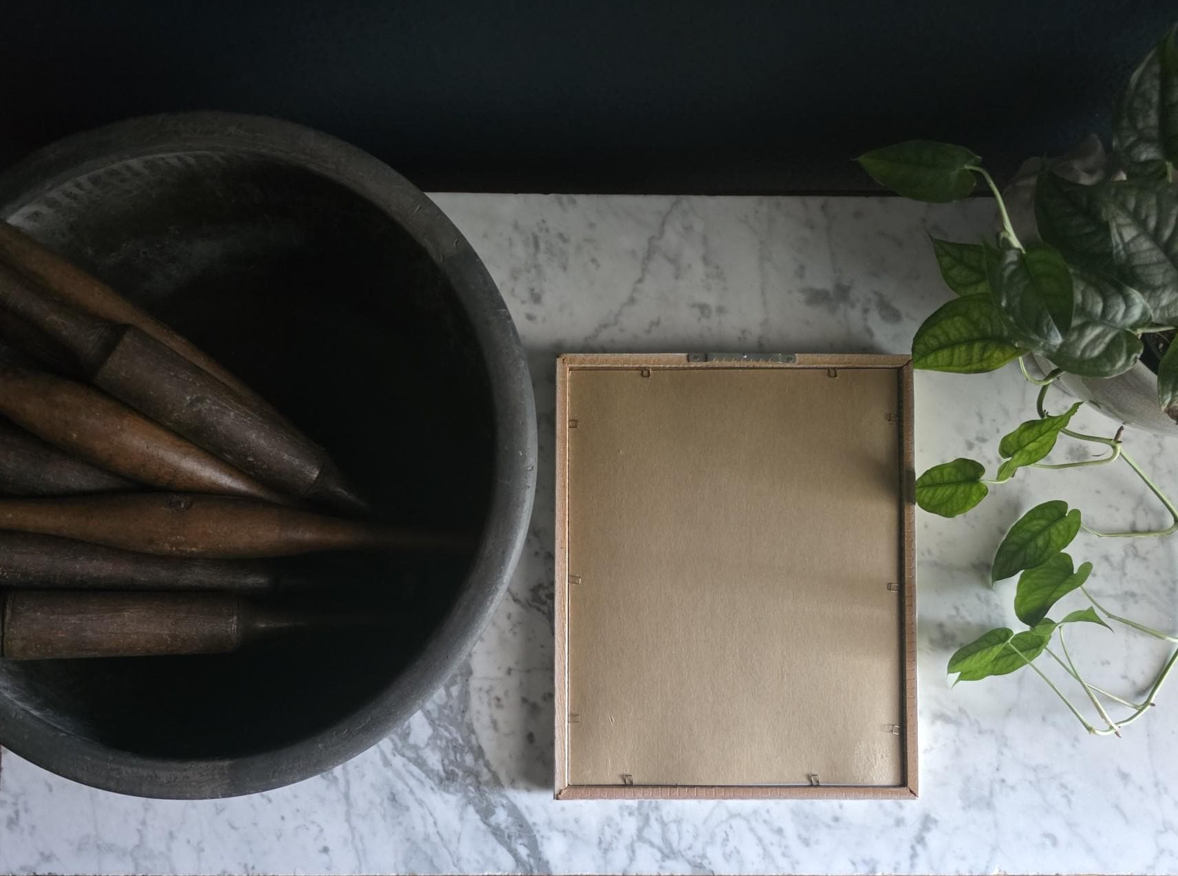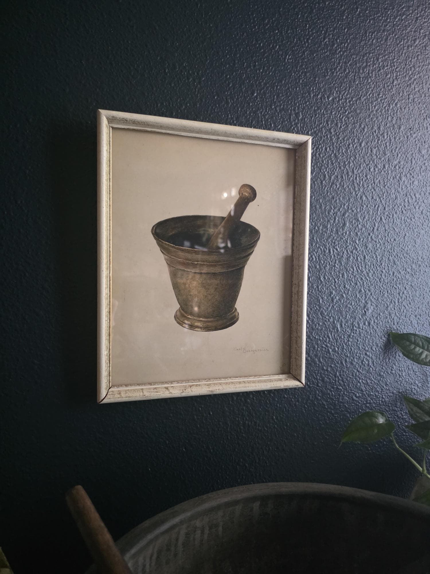 One (1) Vintage Framed Mortar and Pestle Lithograph: A small, charming vintage lithograph of a classic brass mortar and pestle, framed in a distressed cream frame. This artwork beautifully complements the theme, reinforcing the apothecary or traditional culinary aesthetic of the set. The simple yet charming wood frame is worn with age. The artists name is captured on the print Carl Buergerniss and numbered in the right-hand corner ("j113) in pencil.