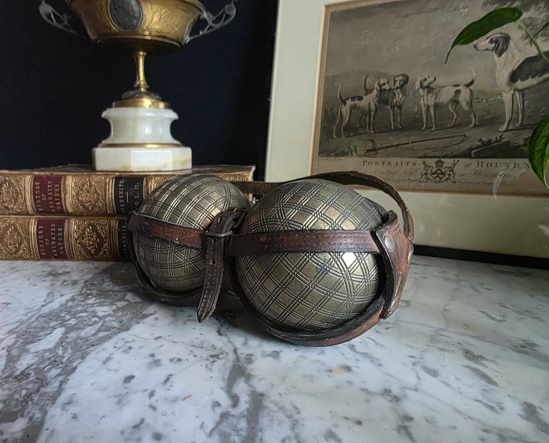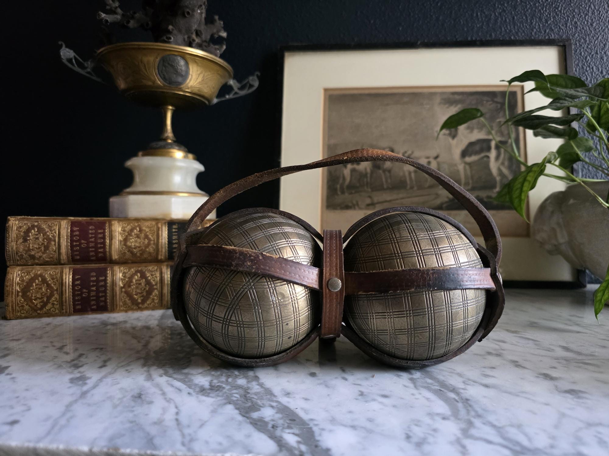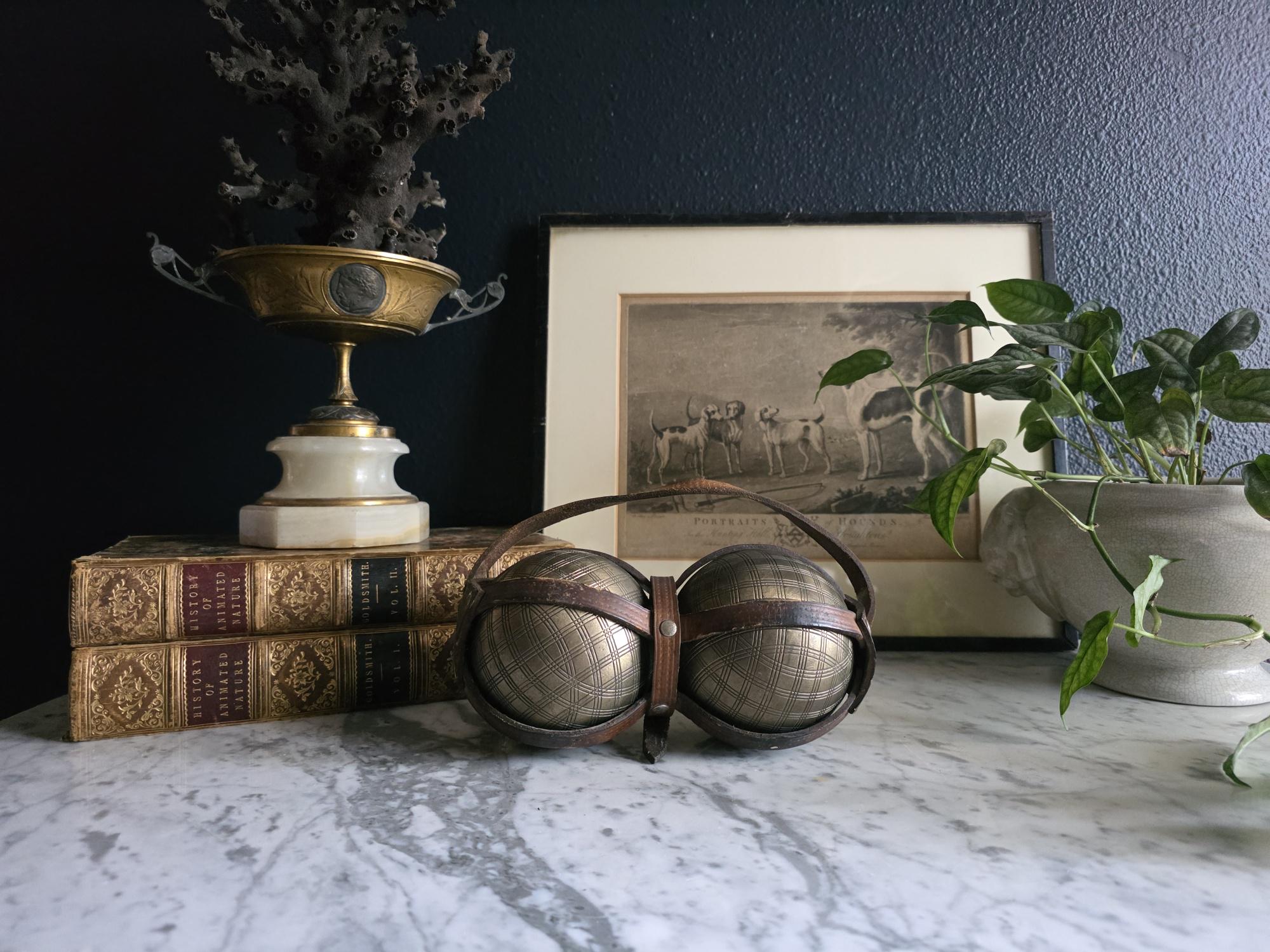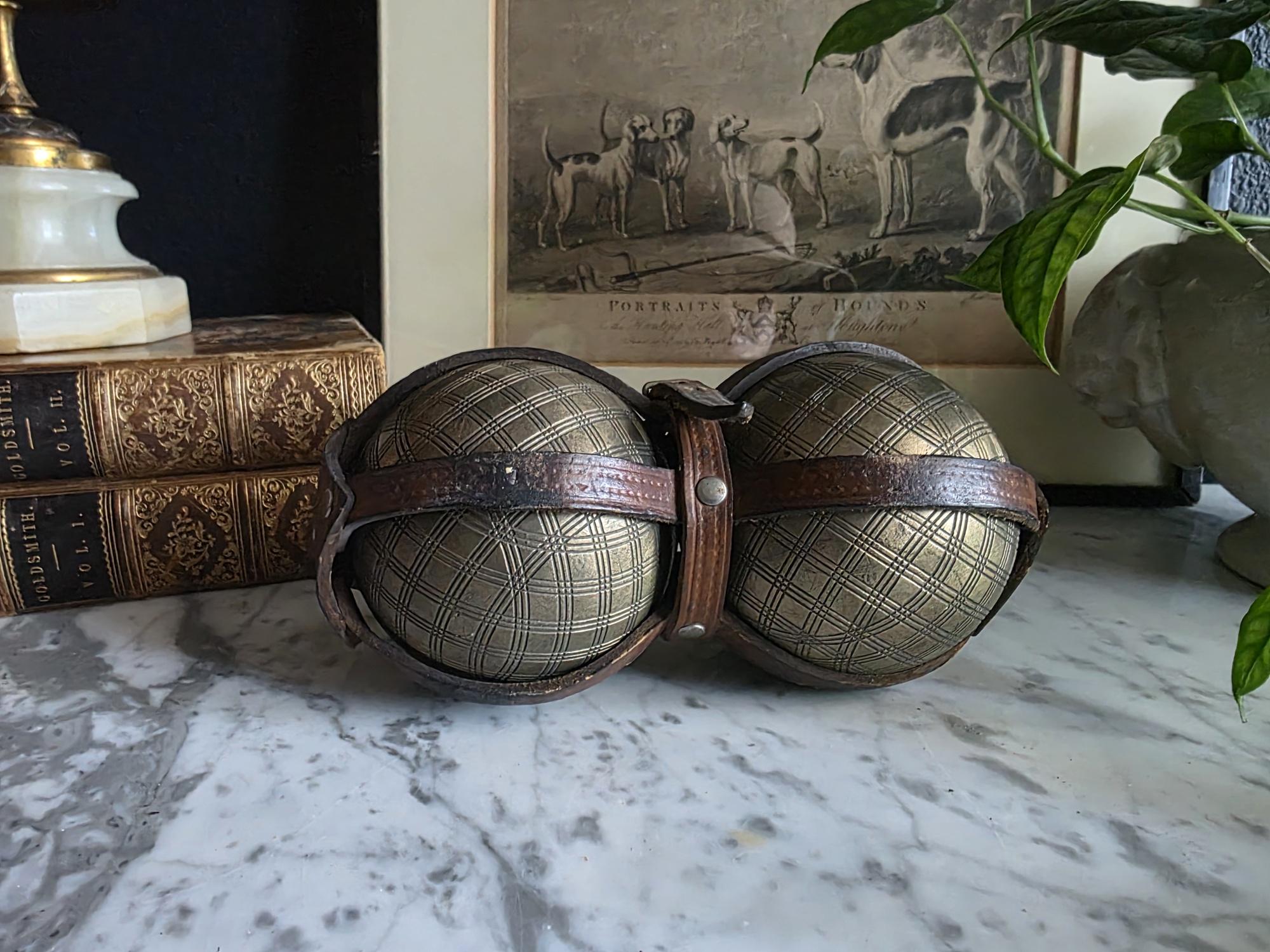 An uncommon find is such excellent condition — a set of two antique metal boules presented in a distinctive leather carrying harness. While most sets contain six or eight balls in a case, this unique pairing was likely used as a highly decorative personal set for a single player, a prestigious presentation set, or a starter/travel pair.