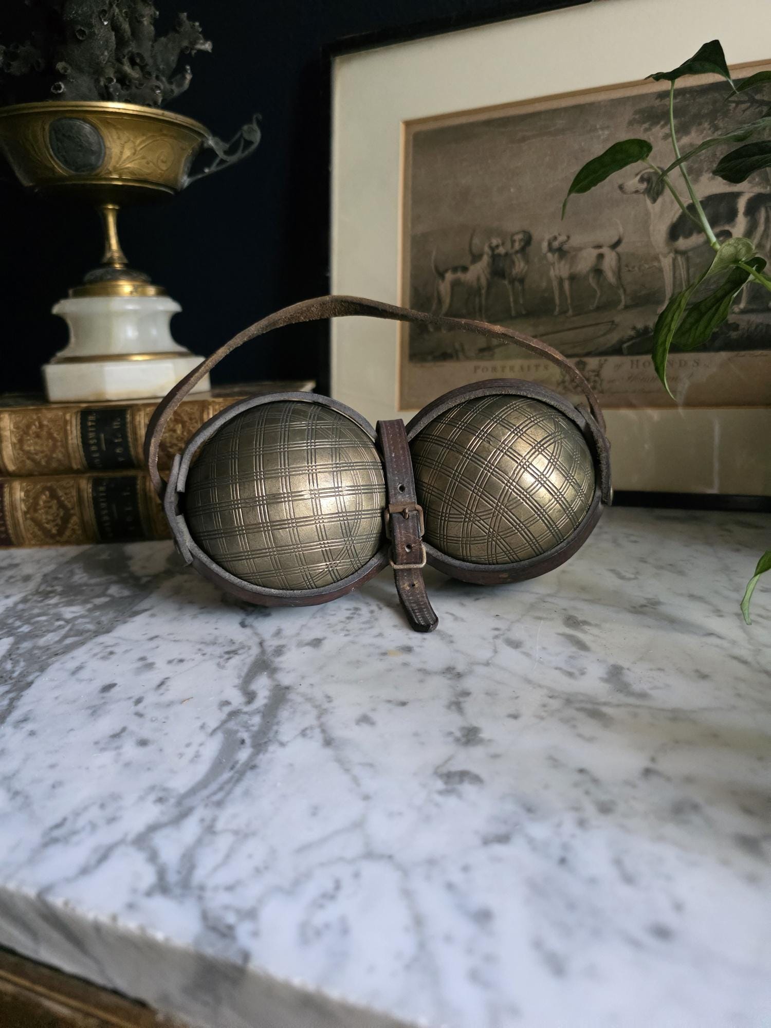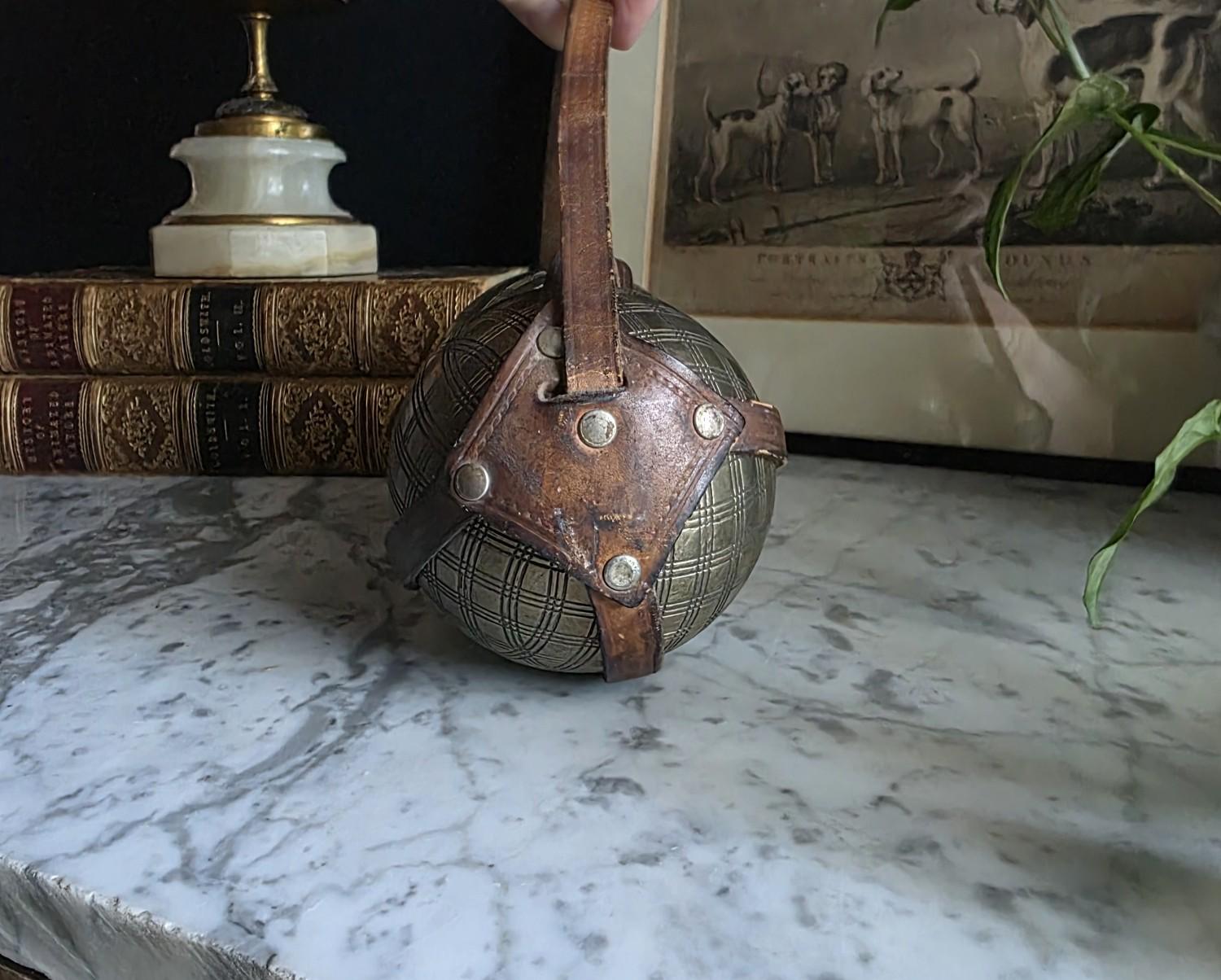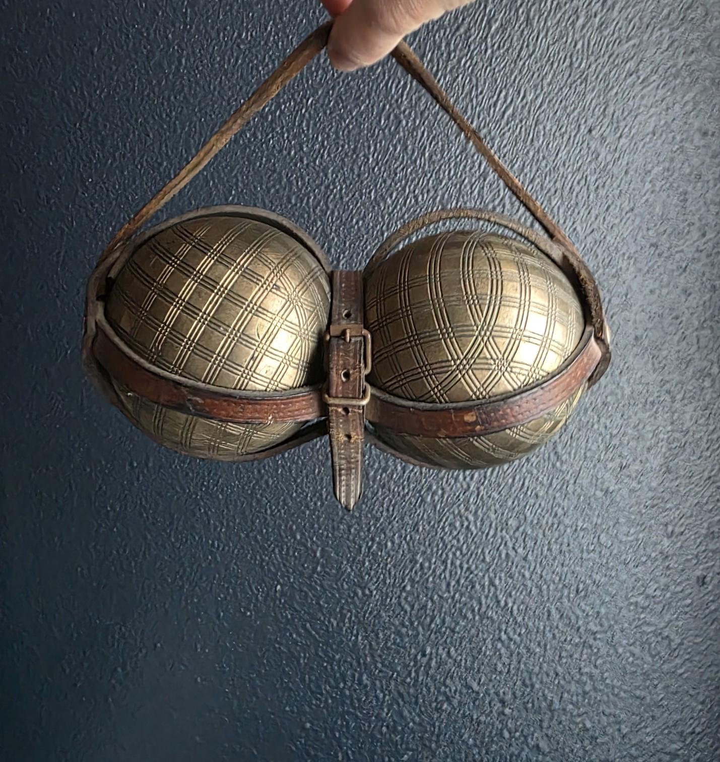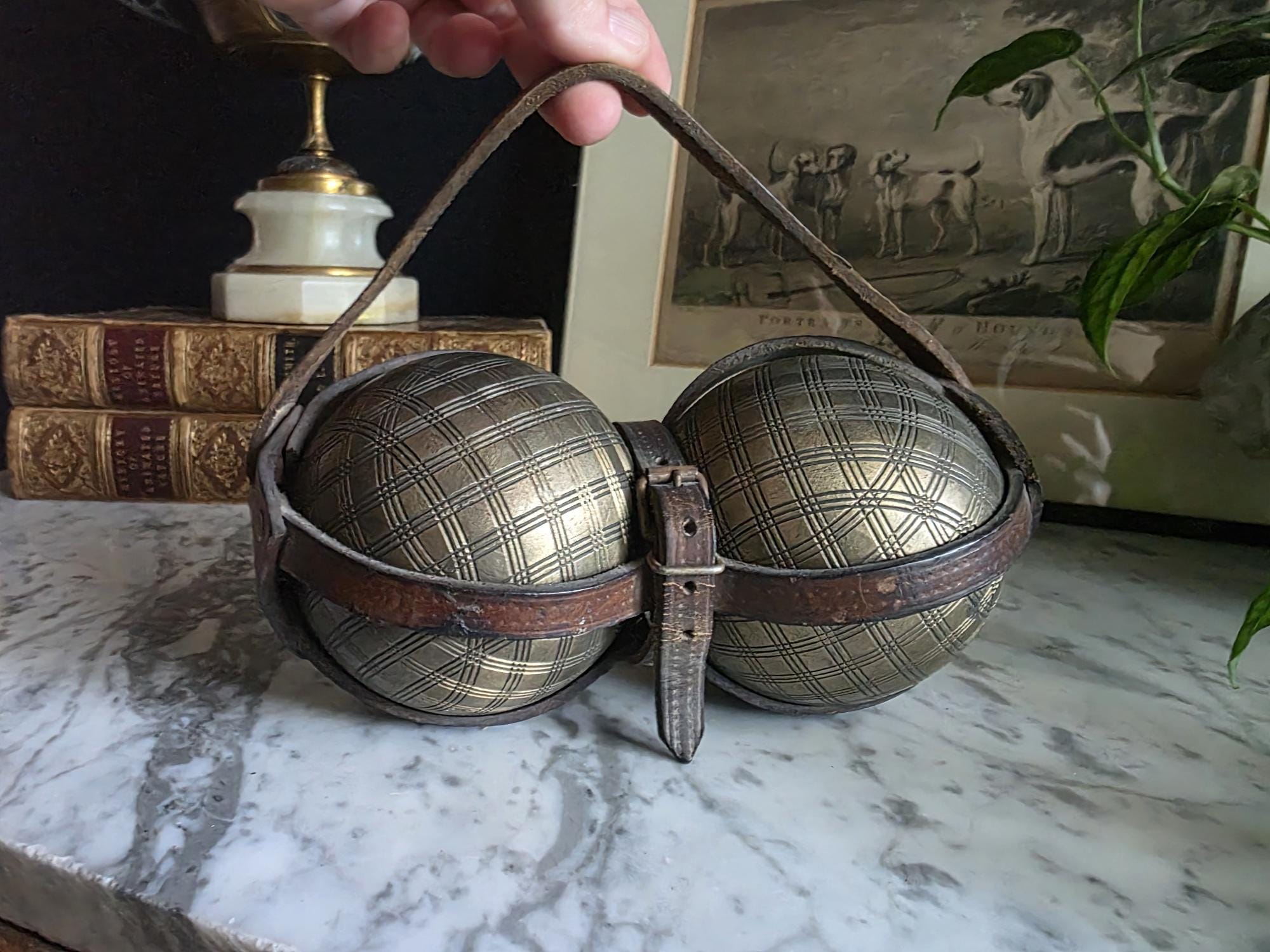 An uncommon find is such excellent condition — a set of two antique metal boules presented in a distinctive leather carrying harness. While most sets contain six or eight balls in a case, this unique pairing was likely used as a highly decorative personal set for a single player, a prestigious presentation set, or a starter/travel pair.