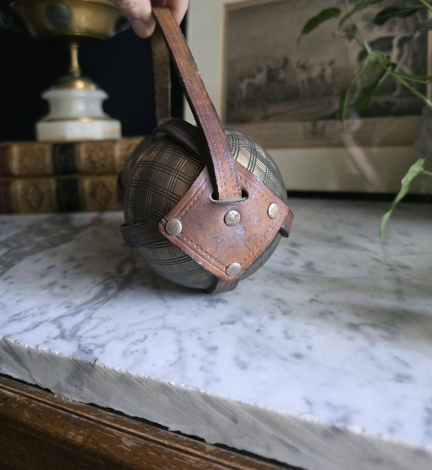 Original Leather Carrier: The thick, aged leather harness securely encases the two balls, featuring an adjustable buckle closure and a sturdy carrying loop. The leather has developed a rich, authentic patina and shows wear that speaks to a long life of use and travel.