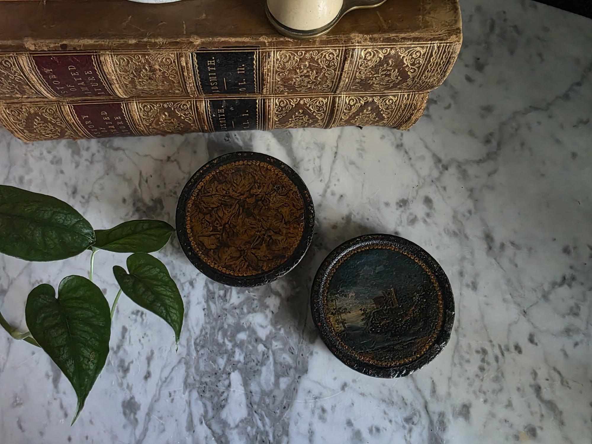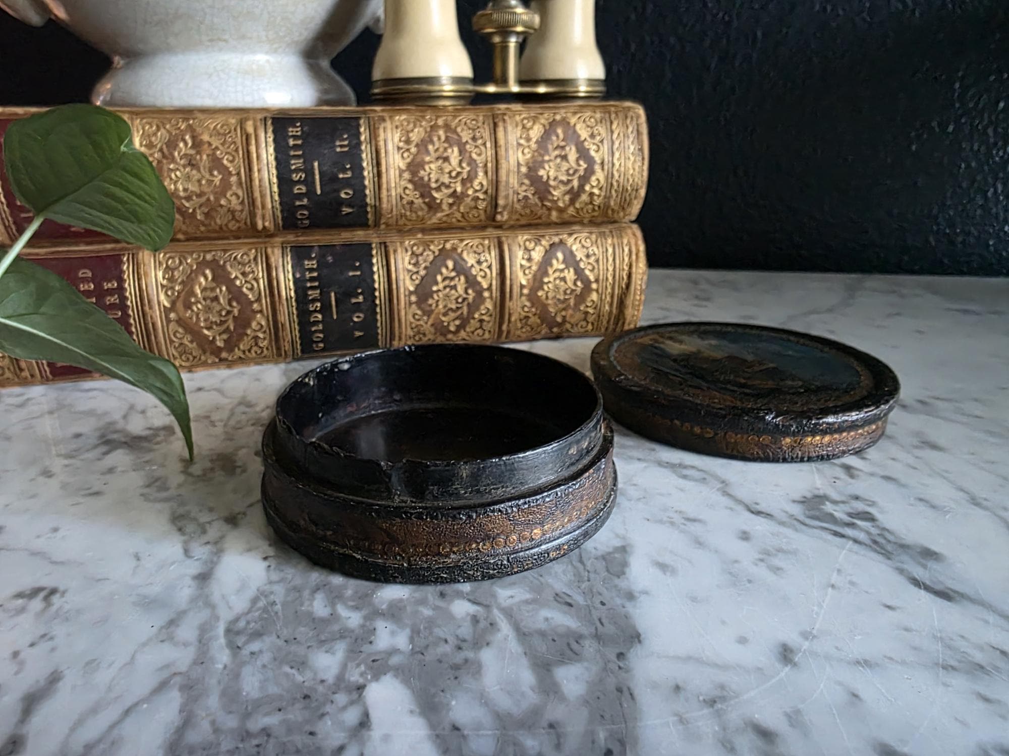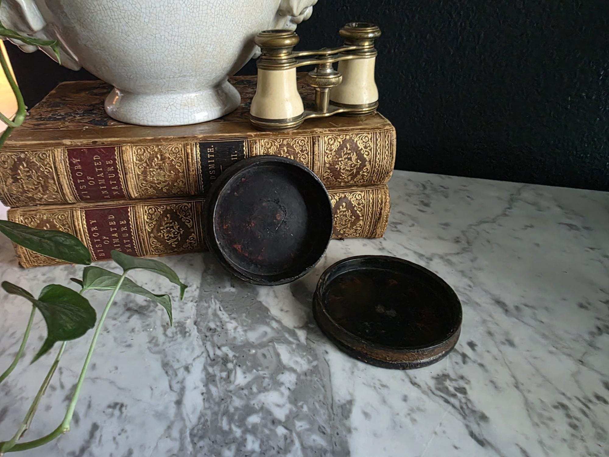 A charming and tactile piece of social history, this small, round antique box is an excellent example of a personal snuff box (or a gentleman’s pill/patch box), dating from the late Georgian or early Victorian era (c. 1780-1850). This piece was carried as a sophisticated, practical accessory.