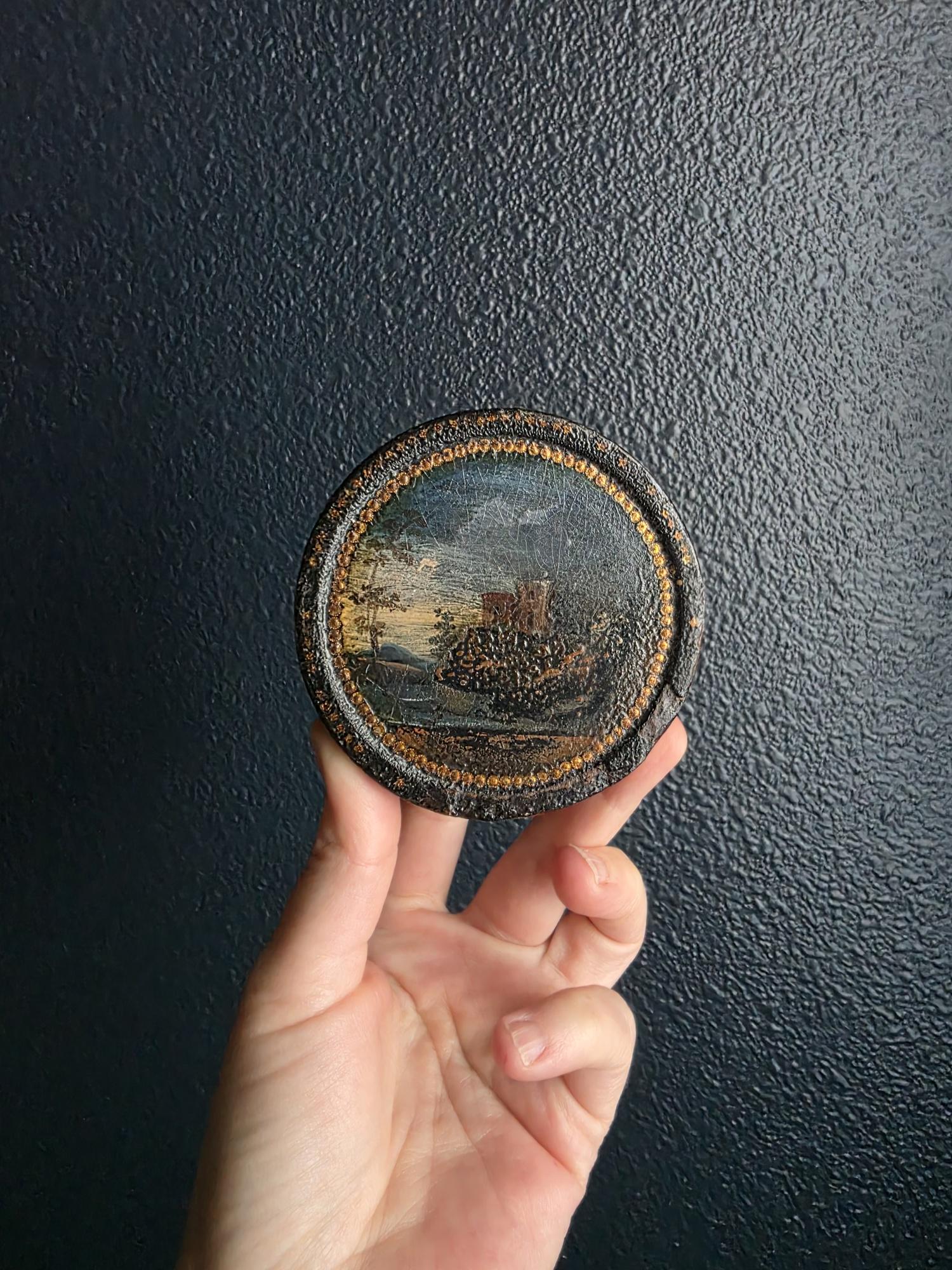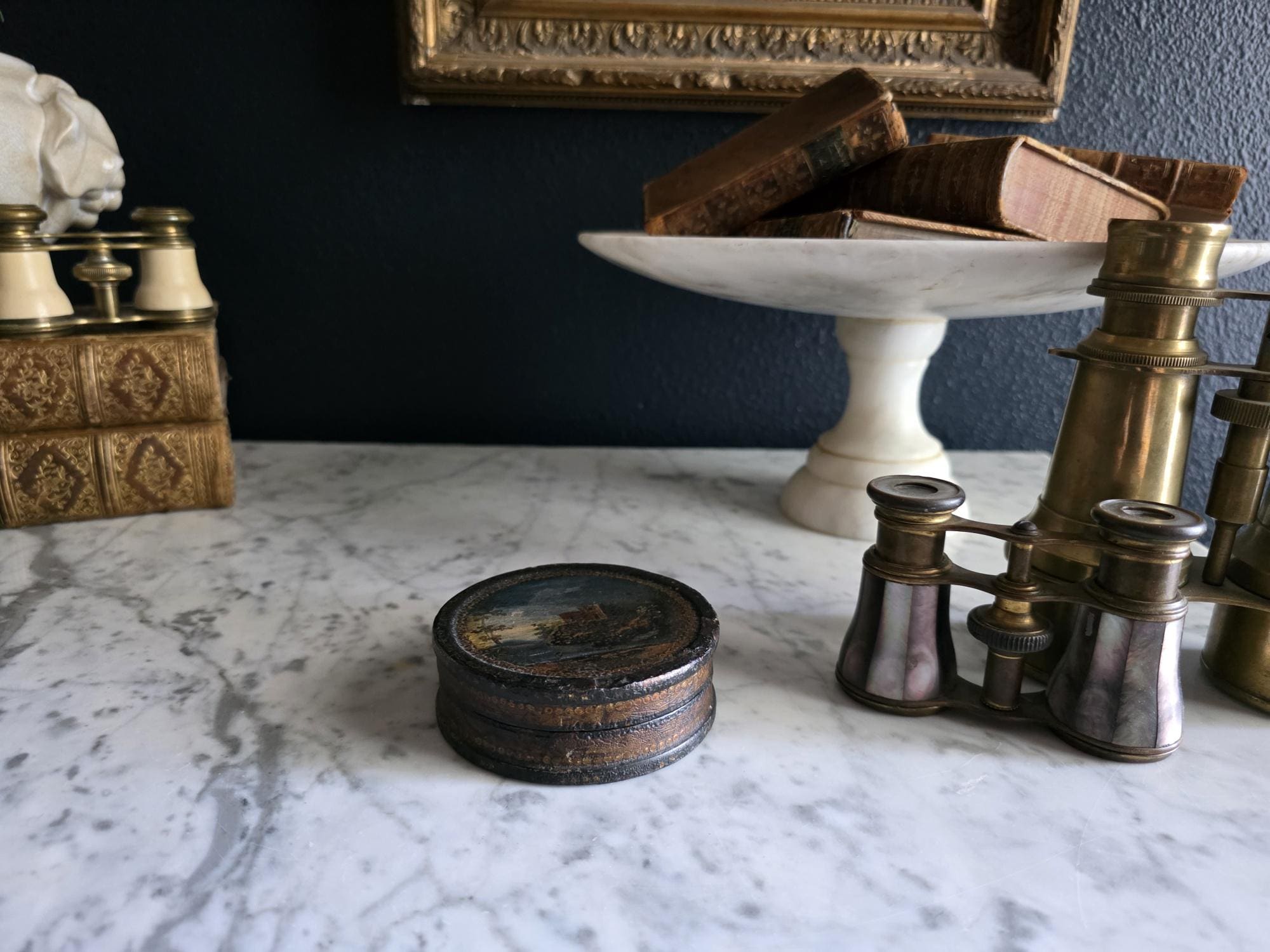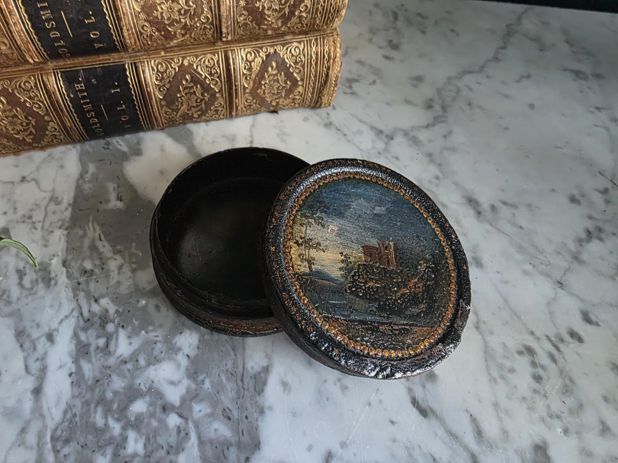 This box is in authentic antique condition, displaying the sought-after wear of a cherished, pocket-sized object. The lid fits snugly, as required for a snuff box to keep the contents fresh. The painting exhibits craquelure and bubbling (see listing photos) common with antique oil painting.