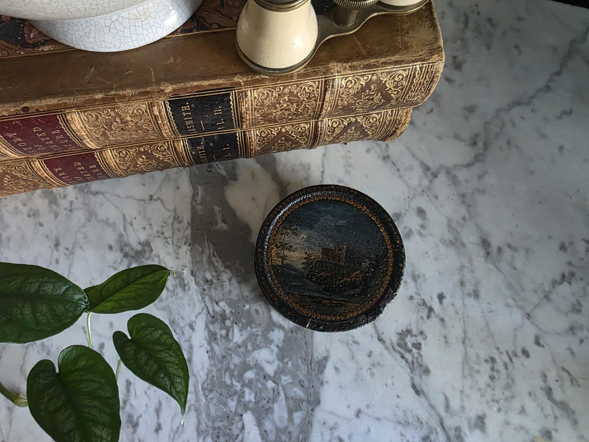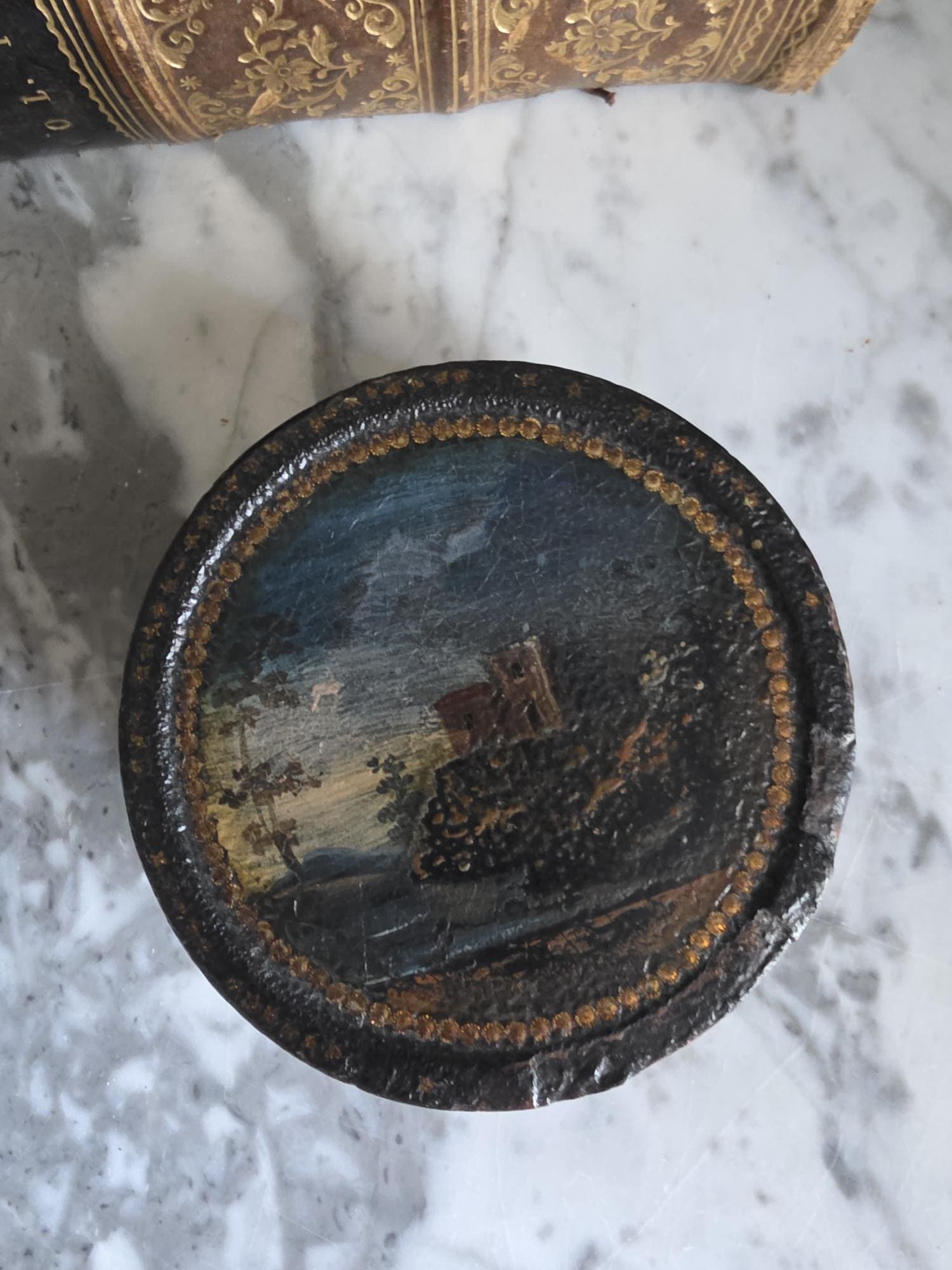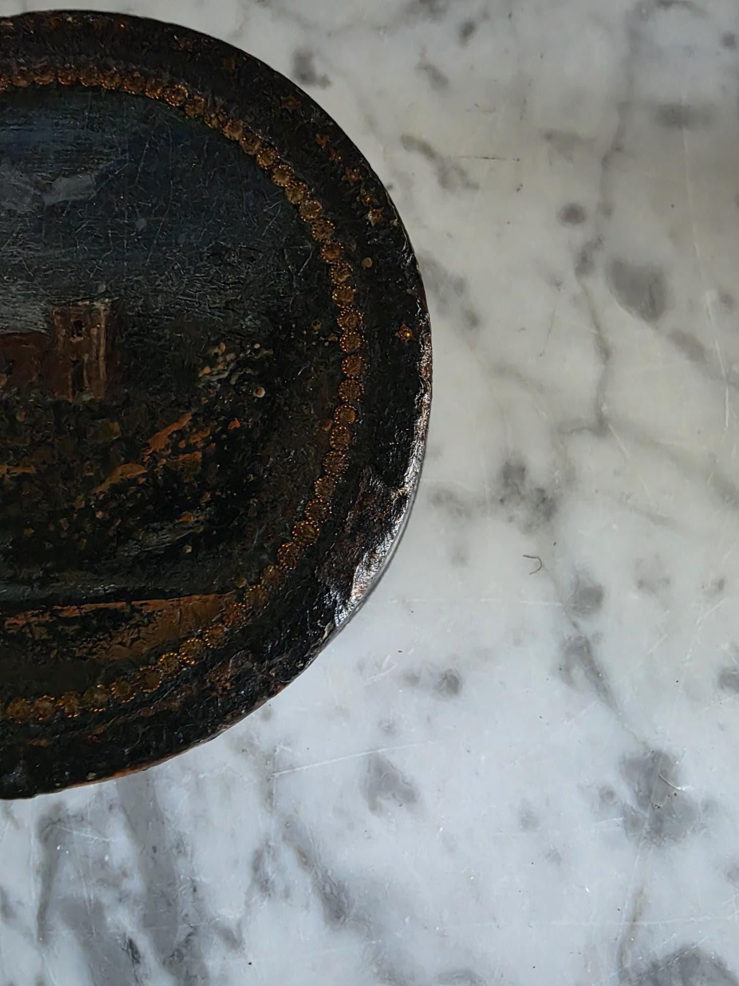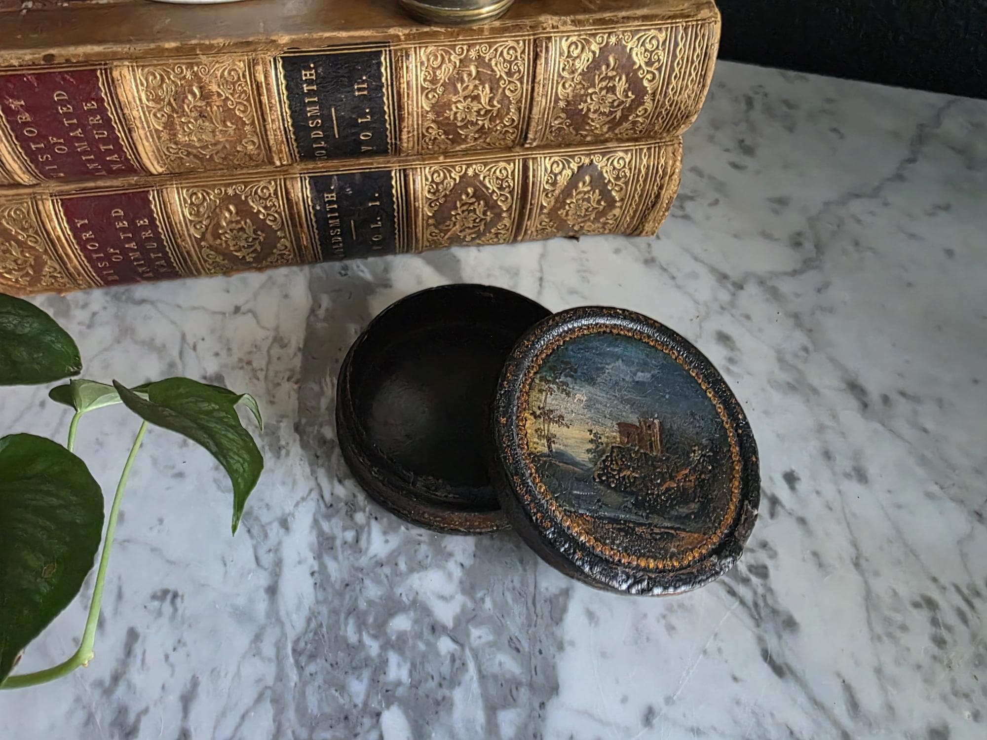 This box is in authentic antique condition, displaying the sought-after wear of a cherished, pocket-sized object. The lid fits snugly, as required for a snuff box to keep the contents fresh. The painting exhibits craquelure and bubbling (see listing photos) common with antique oil painting.