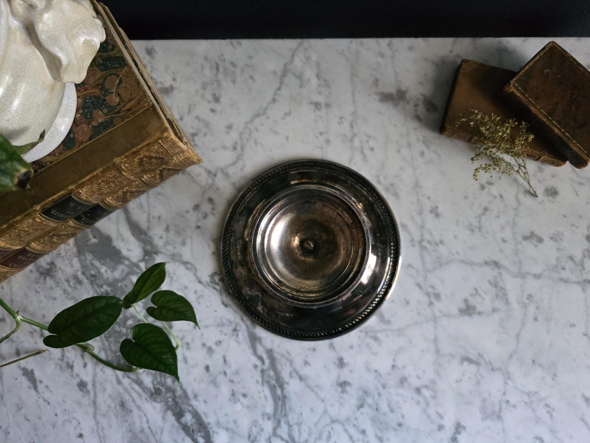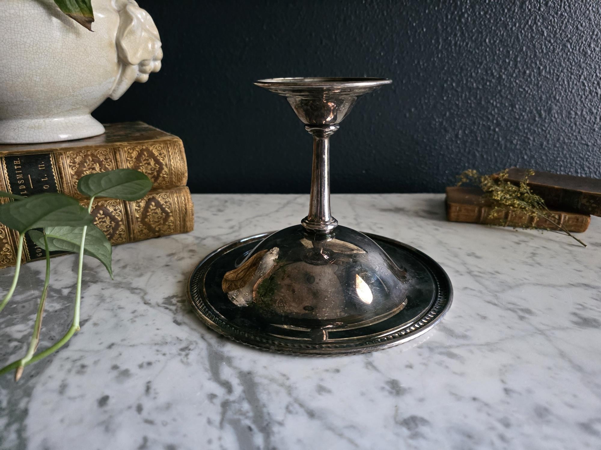 Excellent vintage condition with a beautiful, heavy, unpolished patina. This light-weight compote has no visible dents or plate loss. Item is sold unpolished to preserve its historic character. If you prefer a bright finish, we recommend using a gentle silver polish. No makers marks.
