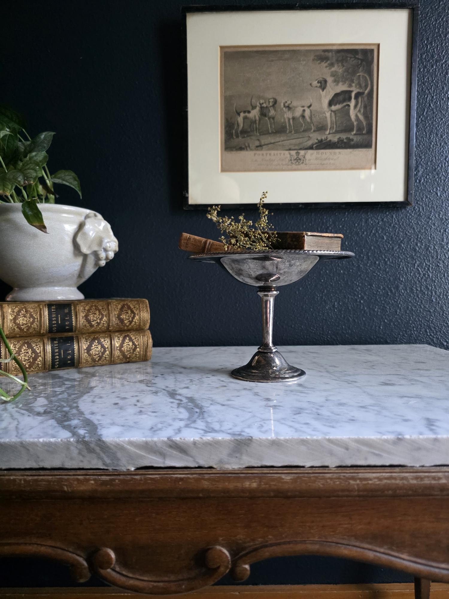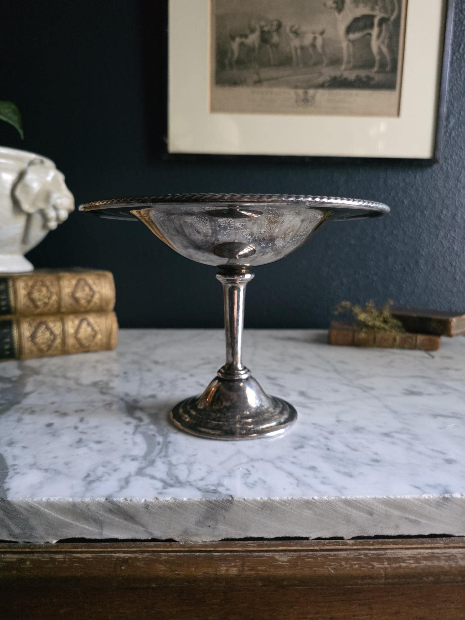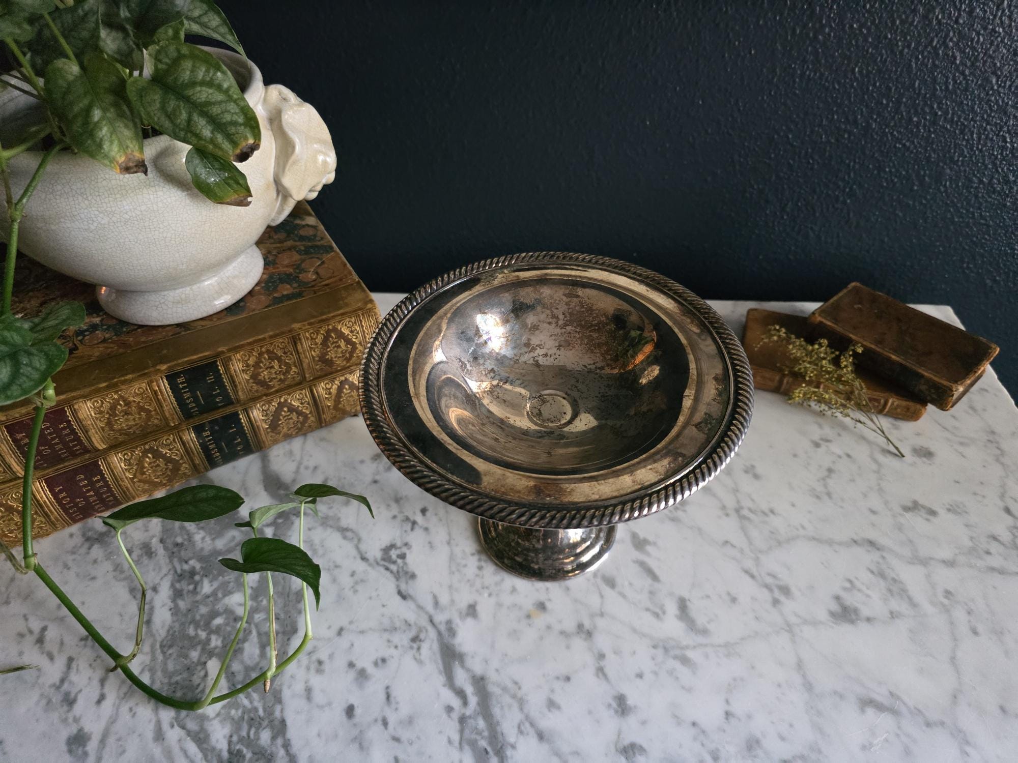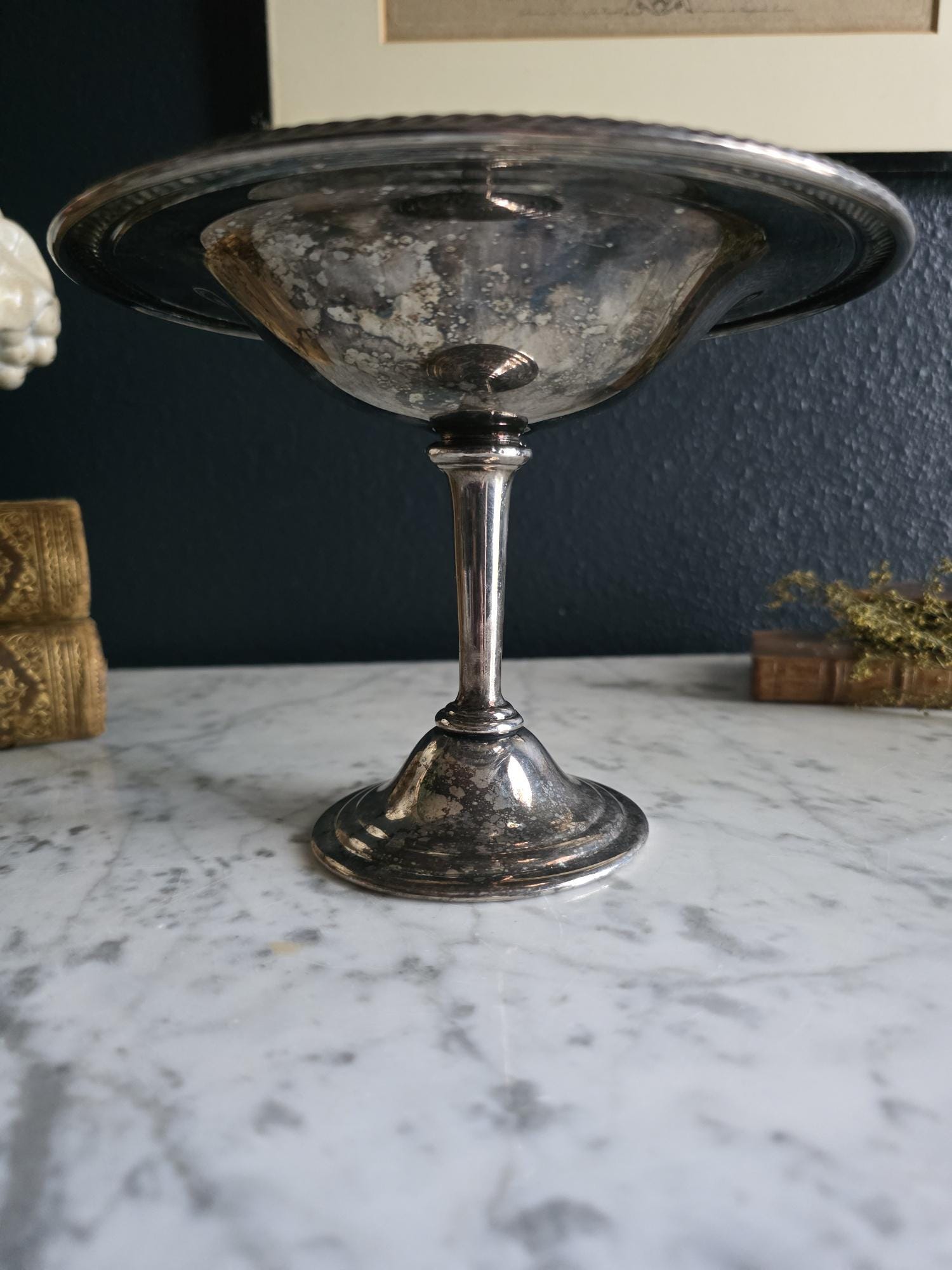 A beautiful vintage silver-plated compote or pedestal bowl featuring classic Neoclassical styling and a desirable aged patina. This elegant piece is perfect for adding a touch of old-world sophistication to any decor.
