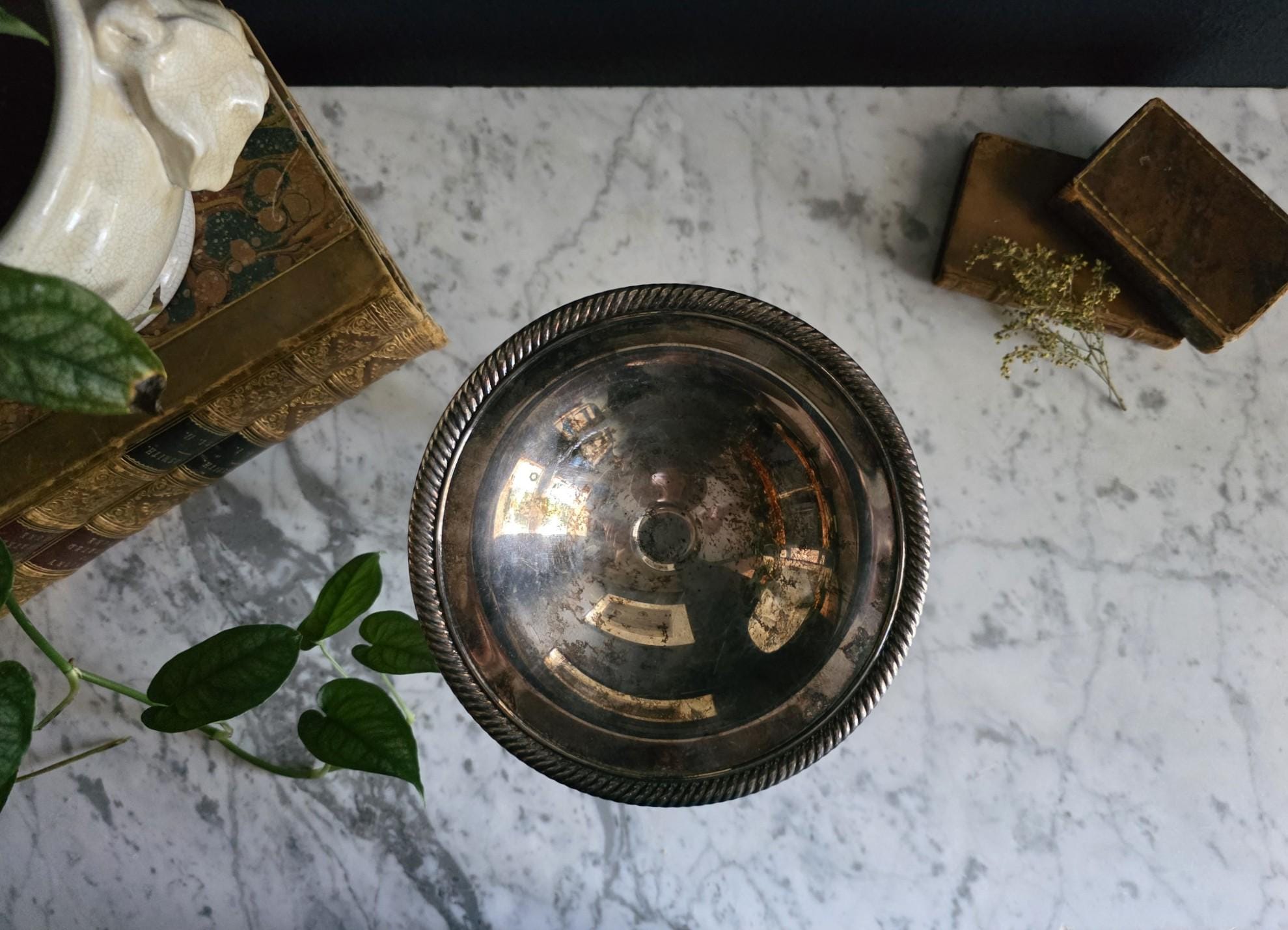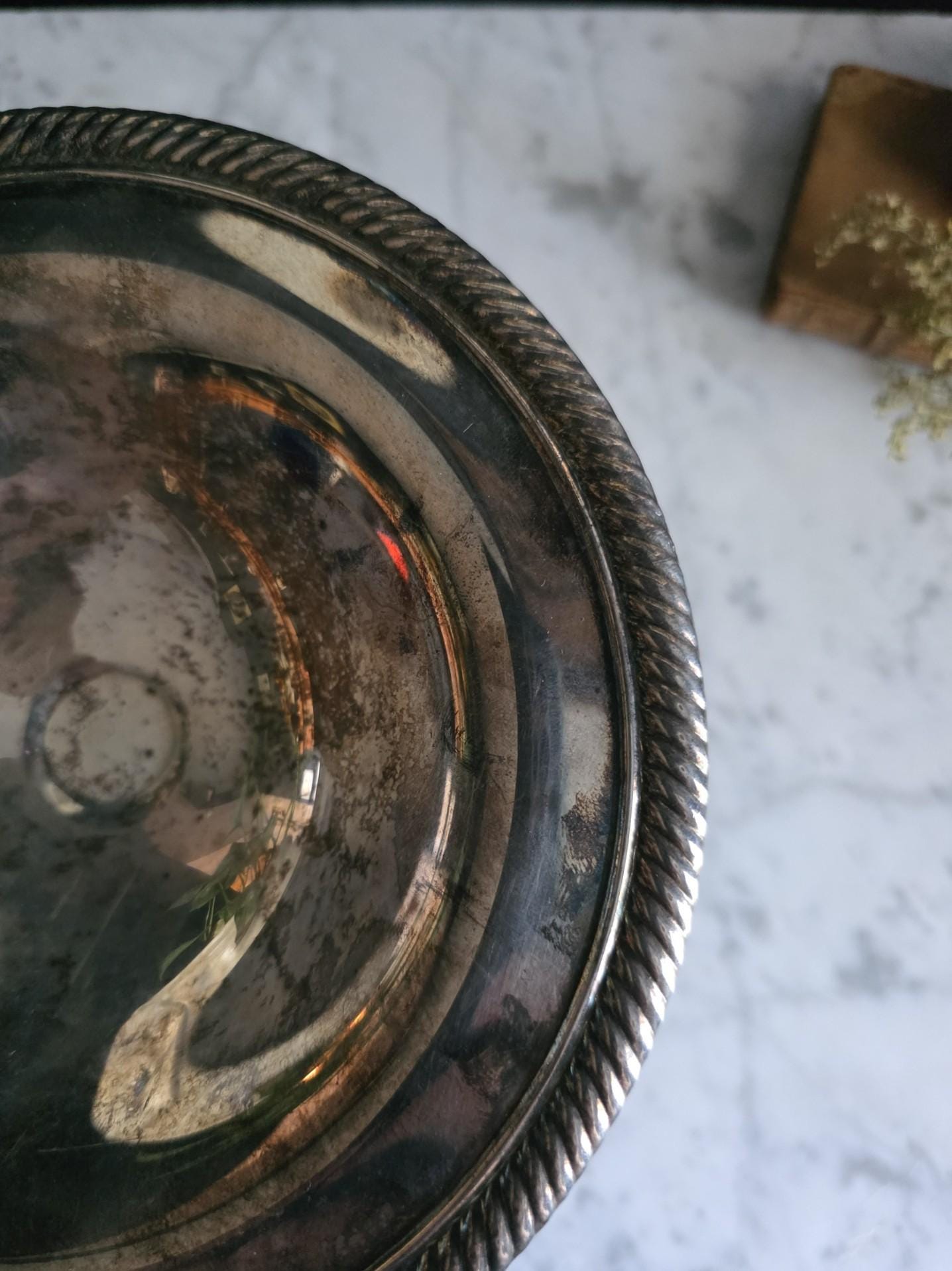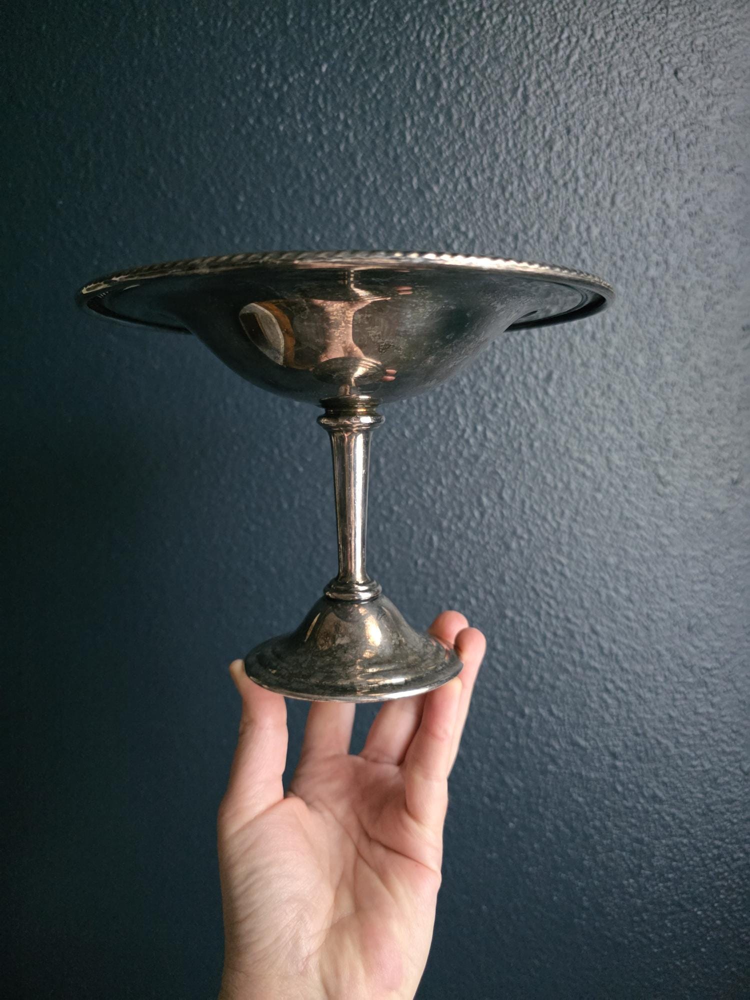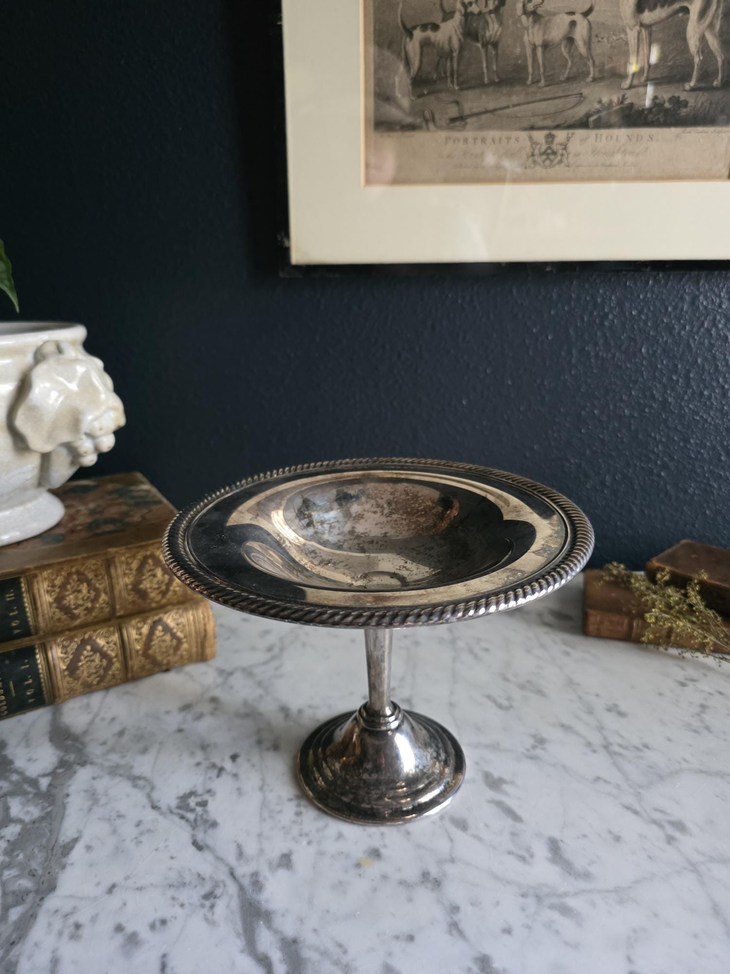 A beautiful vintage silver-plated compote or pedestal bowl featuring classic Neoclassical styling and a desirable aged patina. This elegant piece is perfect for adding a touch of old-world sophistication to any decor.