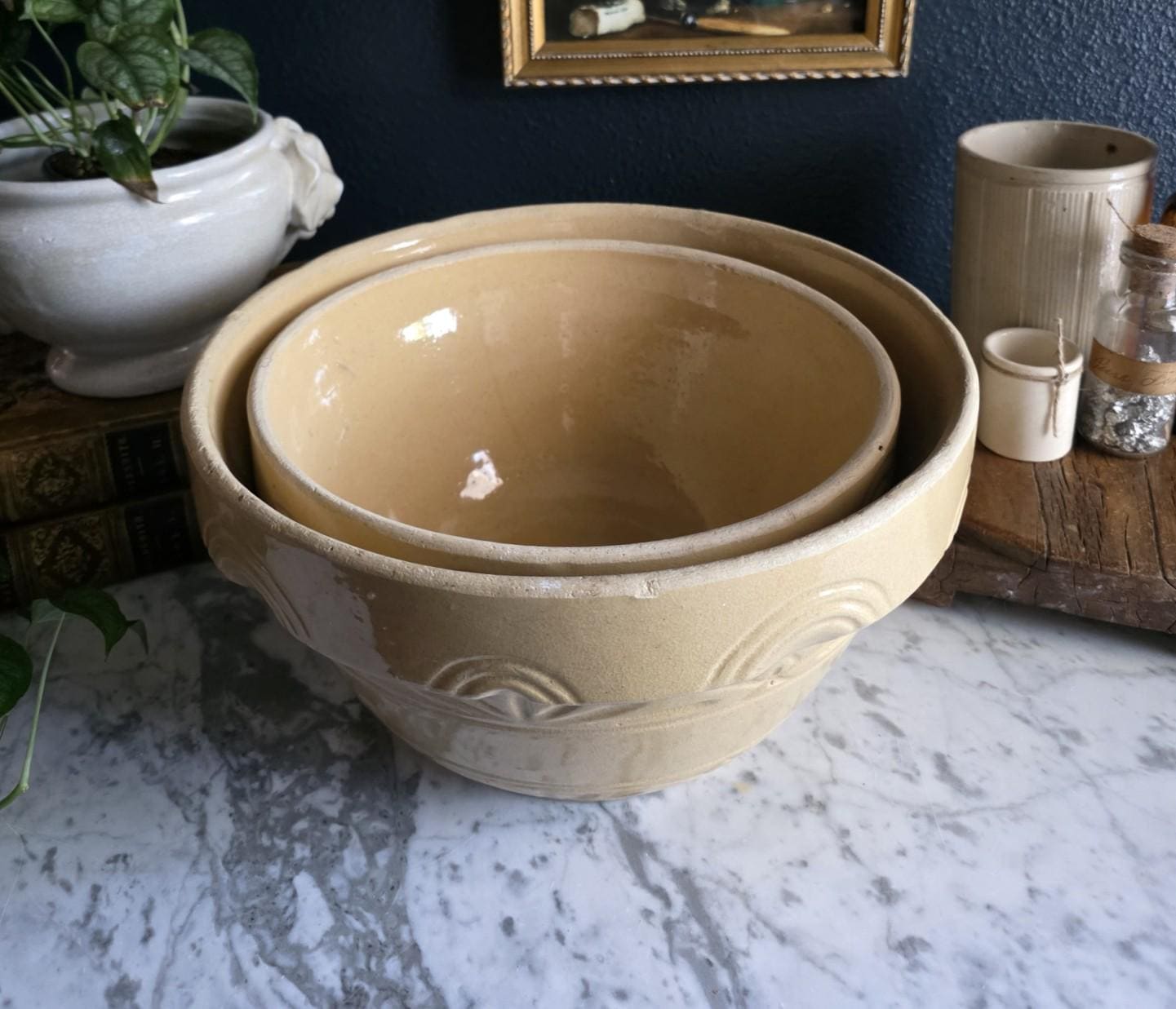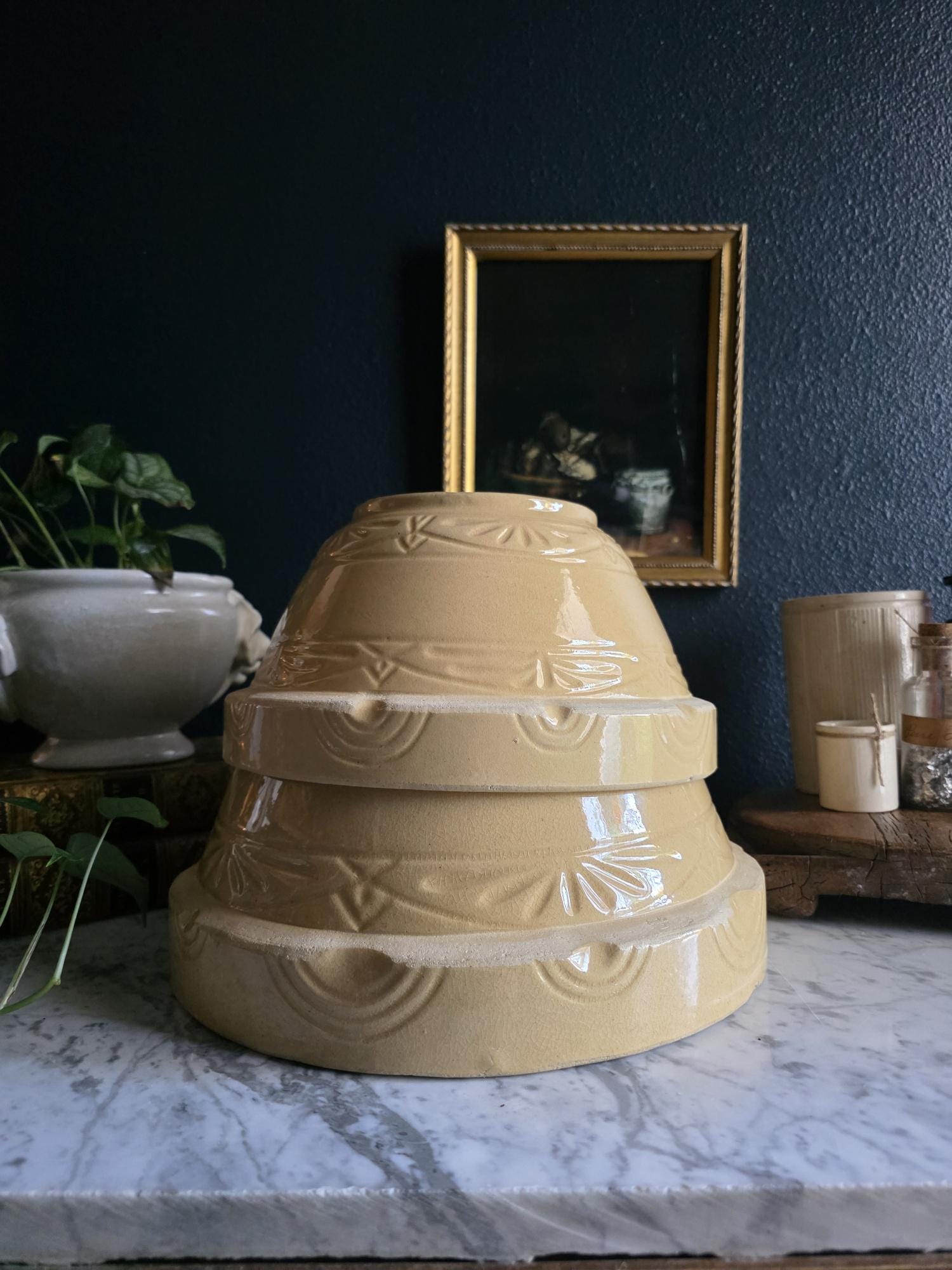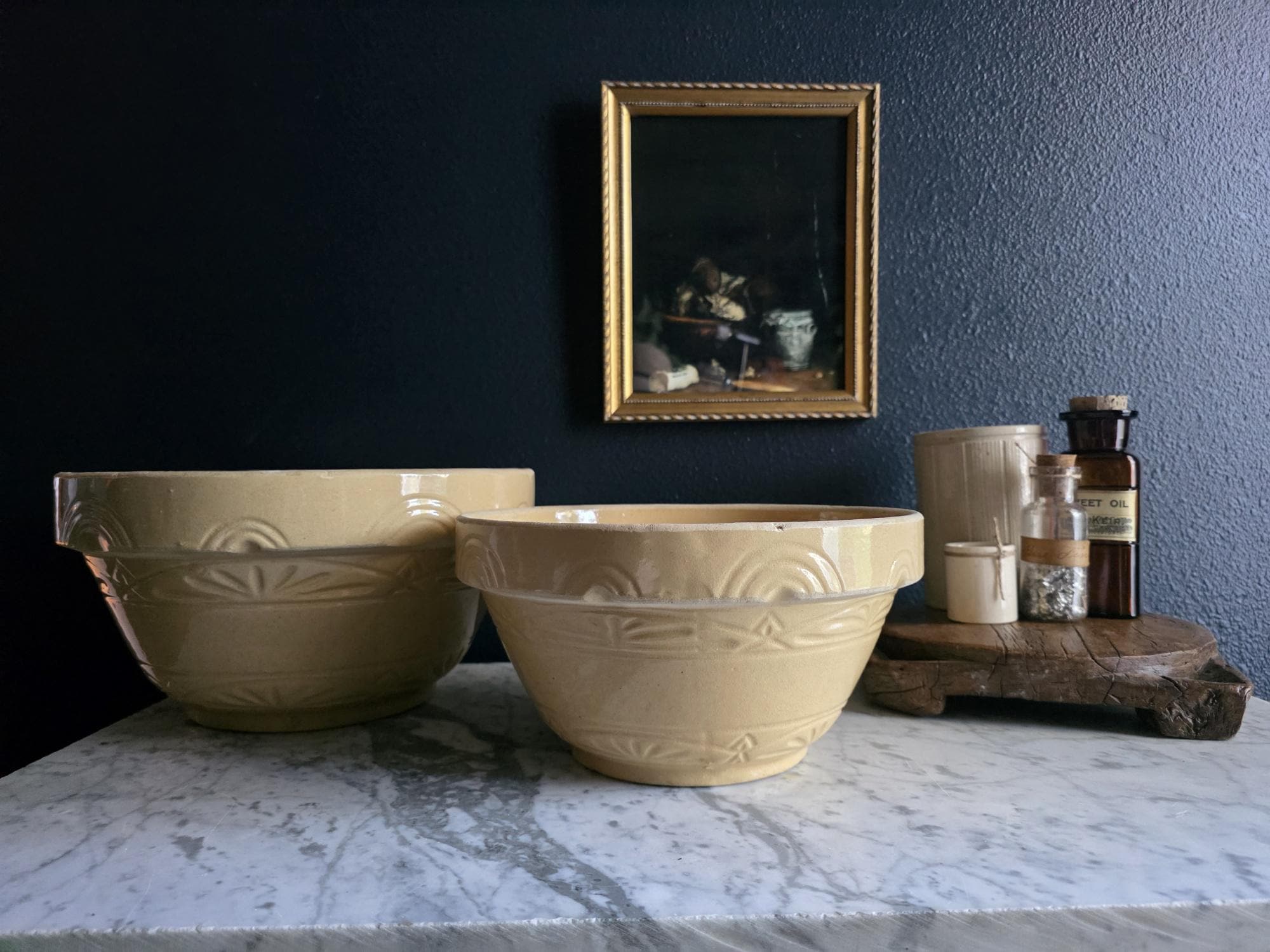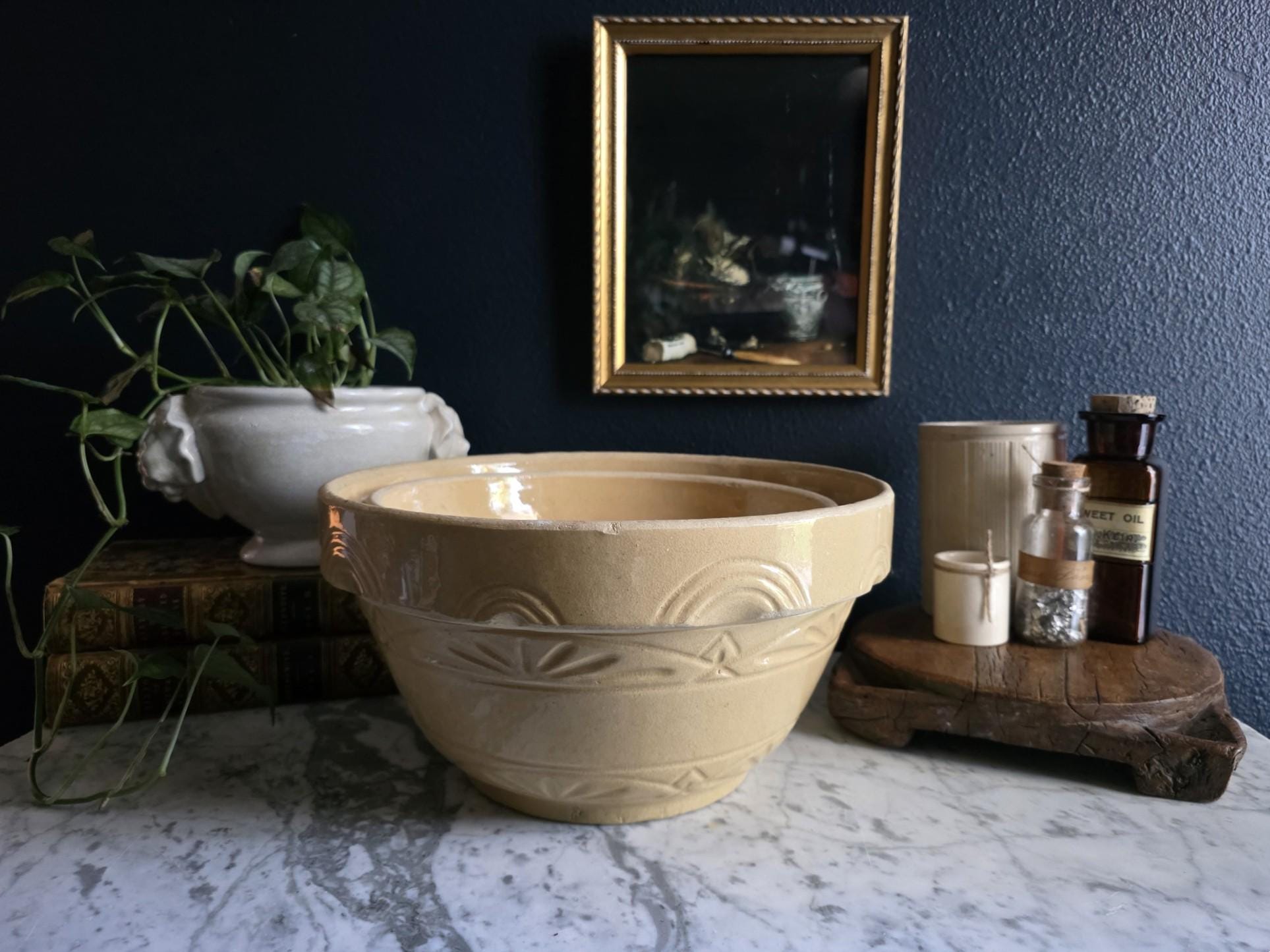 Add authentic farmhouse charm to your kitchen or display with this lovely set of two Antique American Yellowware Nesting Mixing Bowls. Dating from the late 19th to early 20th century, these stoneware bowls feature the classic, highly sought-after buff-to-pale-yellow clay body and a glossy, clear glaze. Each bowl is beautifully detailed with a distinctive, embossed band featuring a recurring stylized shell or fan pattern just beneath the rim, a popular decorative motif of the era. This graduating set is designed to nest perfectly, making them ideal for both use and display. They are a quintessential piece of Primitive, Rusticlodge, or Cottagecore decor, perfect for active baking, serving fruit, or simply adding a touch of rustic history to your kitchen shelves. The bowls are in wonderful antique condition with minor, expected signs of age and wear (such as surface crazing or use marks in the interior) that only enhance their vintage character. The smaller bowl has a very fine hairline crack (see listing photos closely) and remains perfect for mixing dry ingredients. The bottom of both bowls has a very faint RRPCo (Robinson Ransbottom Co) mark embossed into the pottery. Further evidence to us that they are an original pair.
