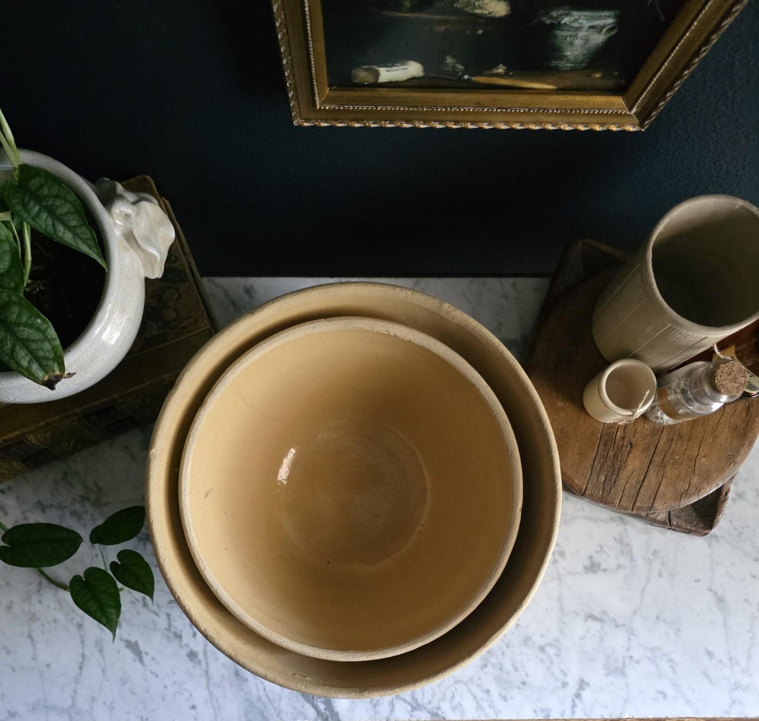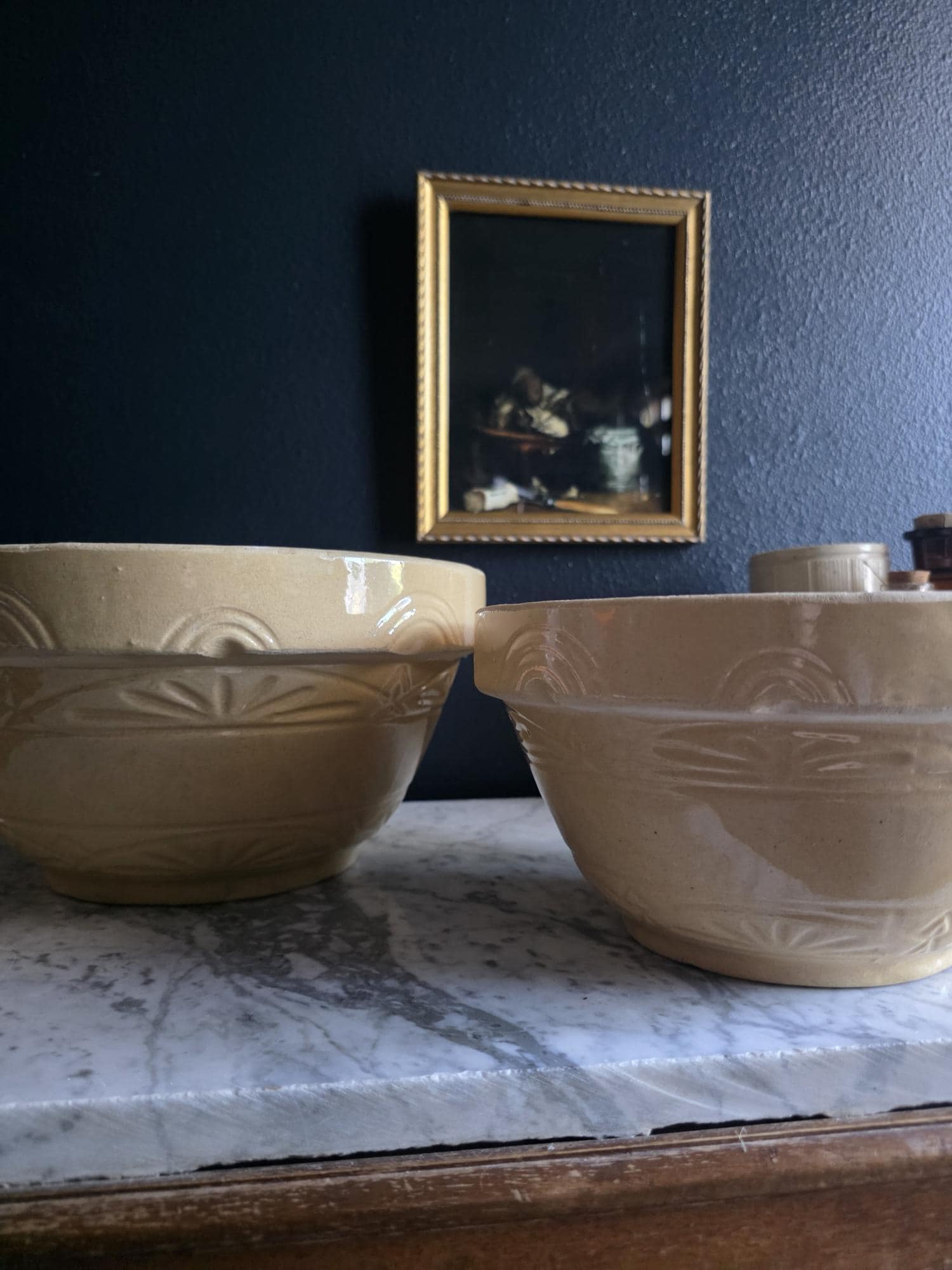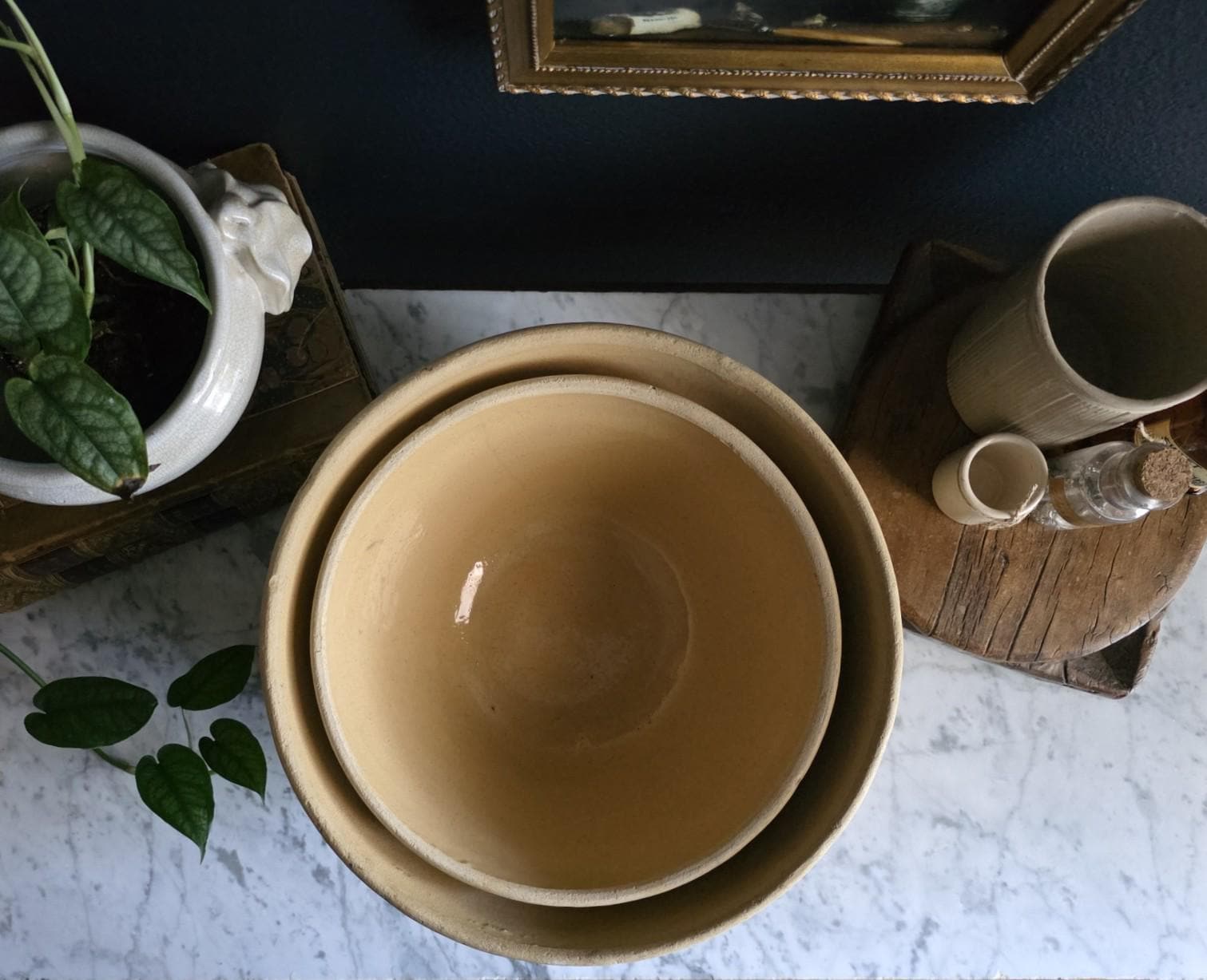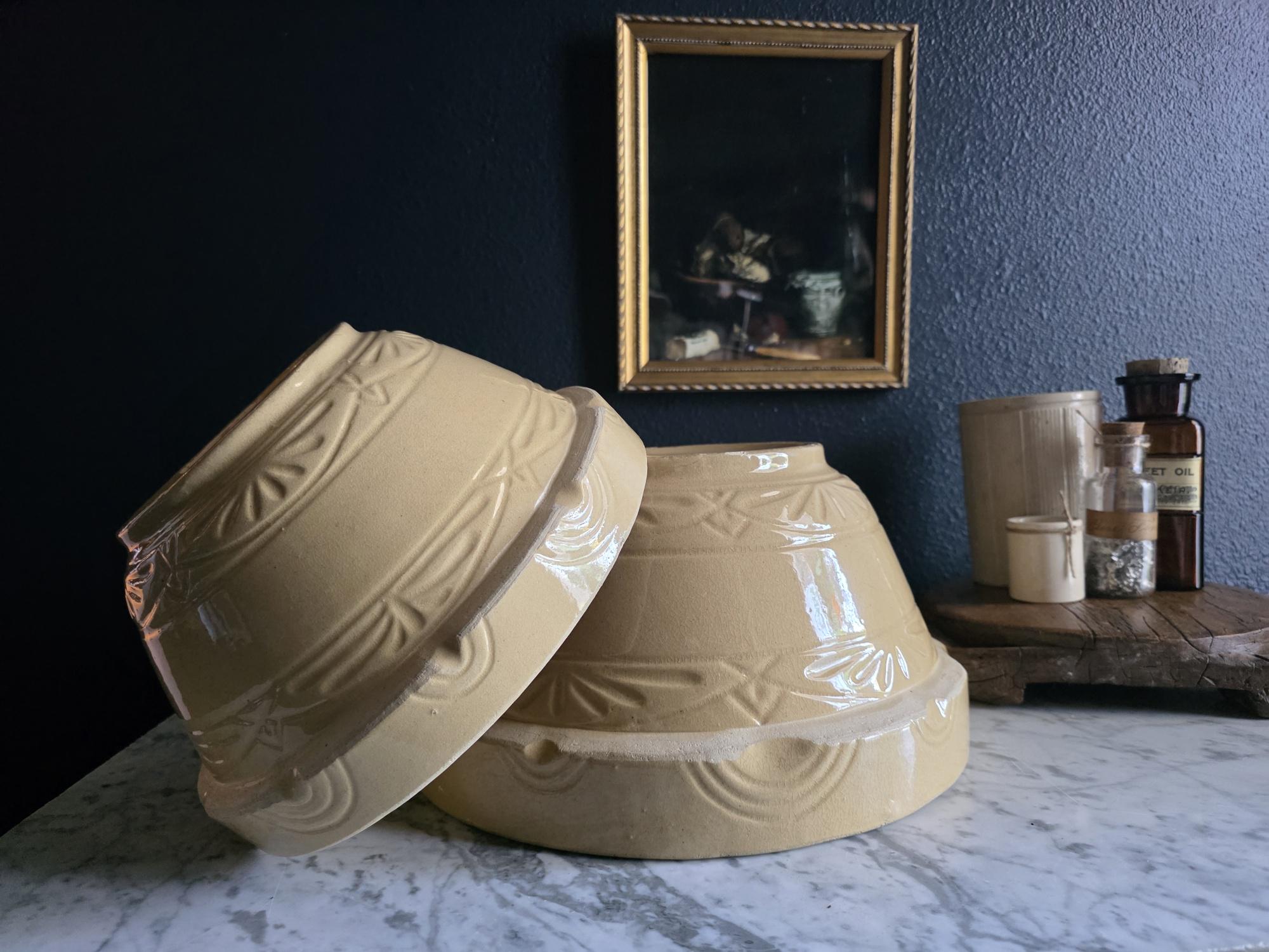 Add authentic farmhouse charm to your kitchen or display with this lovely set of two Antique American Yellowware Nesting Mixing Bowls. Dating from the late 19th to early 20th century, these stoneware bowls feature the classic, highly sought-after buff-to-pale-yellow clay body and a glossy, clear glaze. Each bowl is beautifully detailed with a distinctive, embossed band featuring a recurring stylized shell or fan pattern just beneath the rim, a popular decorative motif of the era. This graduating set is designed to nest perfectly, making them ideal for both use and display. They are a quintessential piece of Primitive, Rusticlodge, or Cottagecore decor, perfect for active baking, serving fruit, or simply adding a touch of rustic history to your kitchen shelves. The bowls are in wonderful antique condition with minor, expected signs of age and wear (such as surface crazing or use marks in the interior) that only enhance their vintage character. The smaller bowl has a very fine hairline crack (see listing photos closely) and remains perfect for mixing dry ingredients. The bottom of both bowls has a very faint RRPCo (Robinson Ransbottom Co) mark embossed into the pottery. Further evidence to us that they are an original pair.