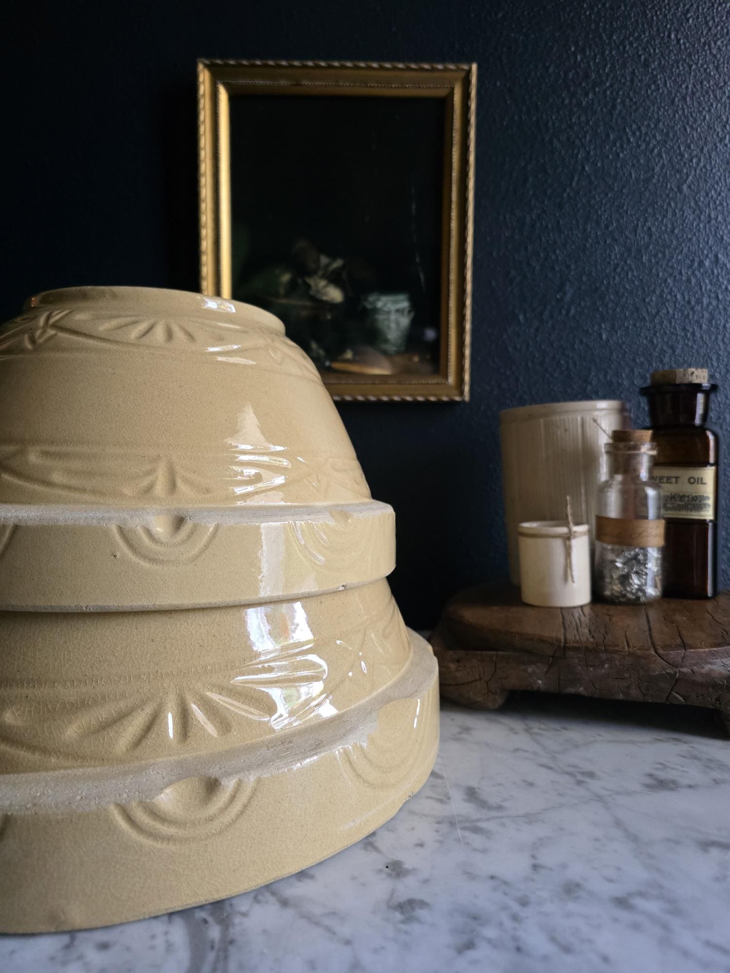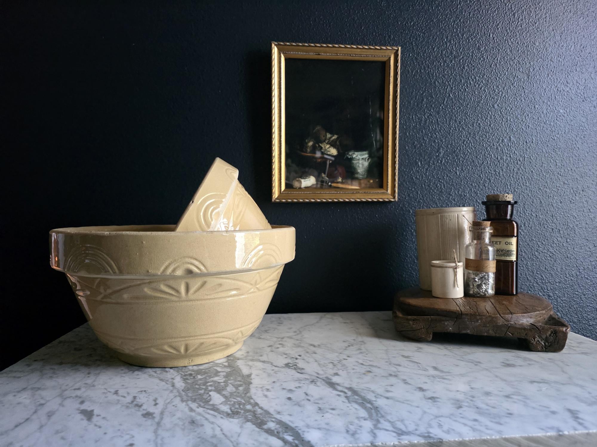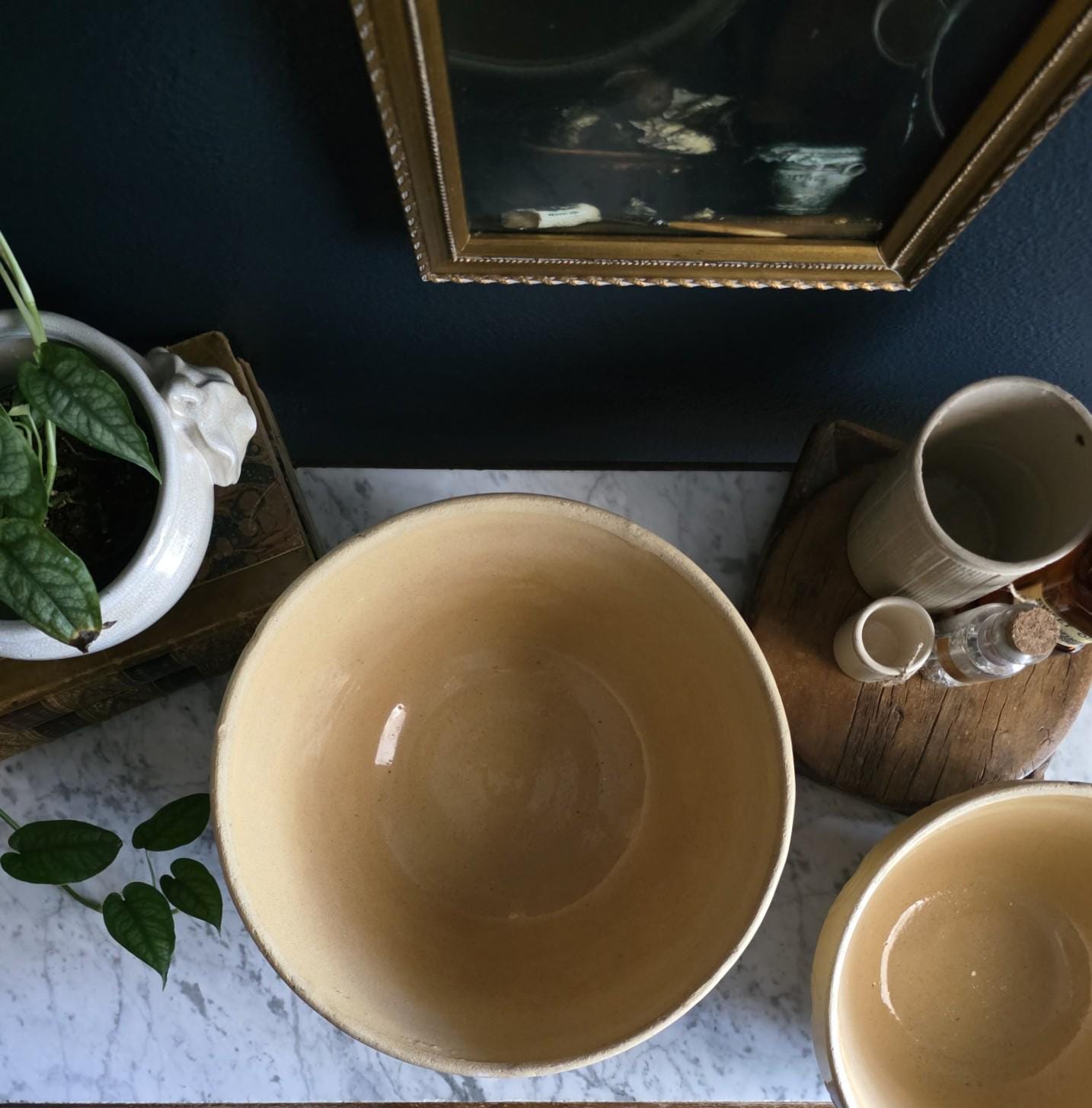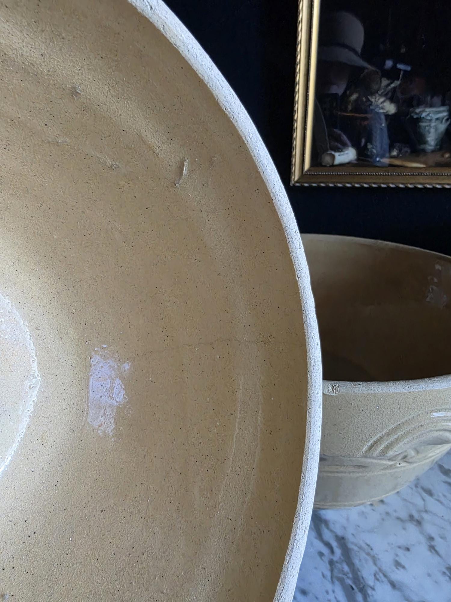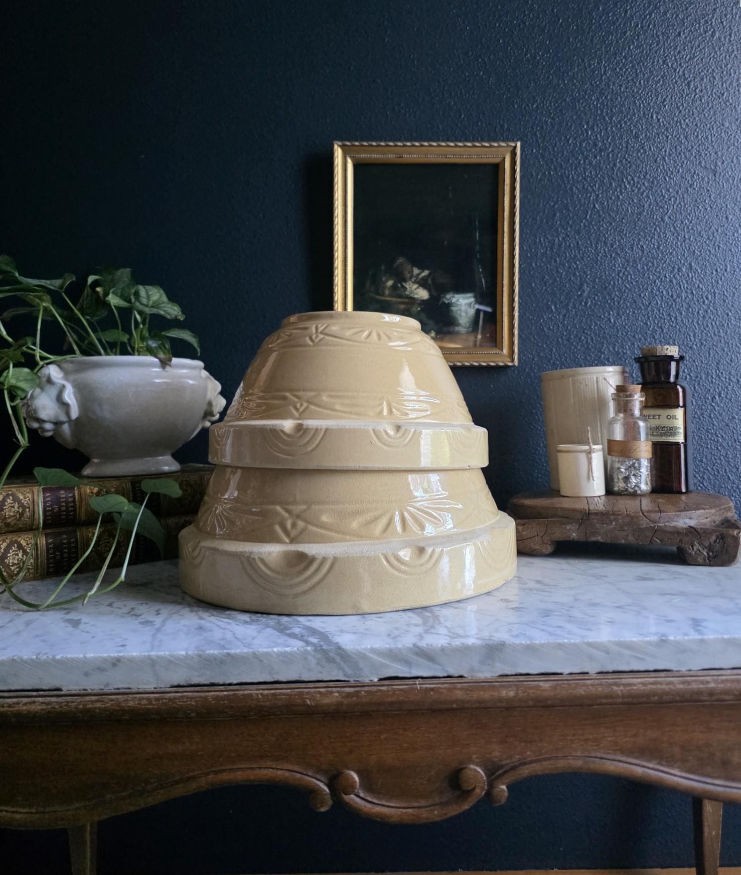 Add authentic farmhouse charm to your kitchen or display with this lovely set of two Antique American Yellowware Nesting Mixing Bowls. Dating from the late 19th to early 20th century, these stoneware bowls feature the classic, highly sought-after buff-to-pale-yellow clay body and a glossy, clear glaze. Each bowl is beautifully detailed with a distinctive, embossed band featuring a recurring stylized shell or fan pattern just beneath the rim, a popular decorative motif of the era. This graduating set is designed to nest perfectly, making them ideal for both use and display. They are a quintessential piece of Primitive, Rusticlodge, or Cottagecore decor, perfect for active baking, serving fruit, or simply adding a touch of rustic history to your kitchen shelves. The bowls are in wonderful antique condition with minor, expected signs of age and wear (such as surface crazing or use marks in the interior) that only enhance their vintage character. The smaller bowl has a very fine hairline crack (see listing photos closely) and remains perfect for mixing dry ingredients. The bottom of both bowls has a very faint RRPCo (Robinson Ransbottom Co) mark embossed into the pottery. Further evidence to us that they are an original pair.