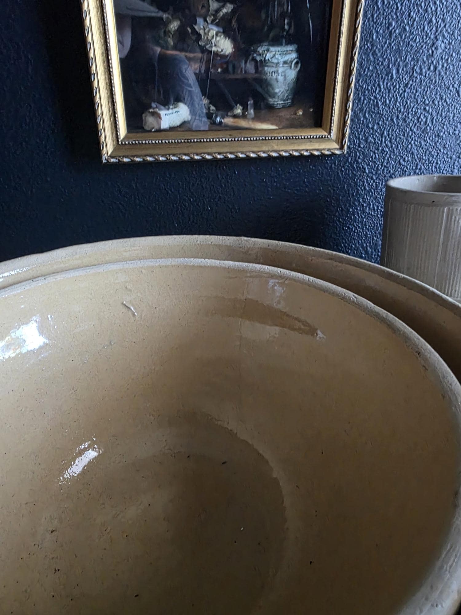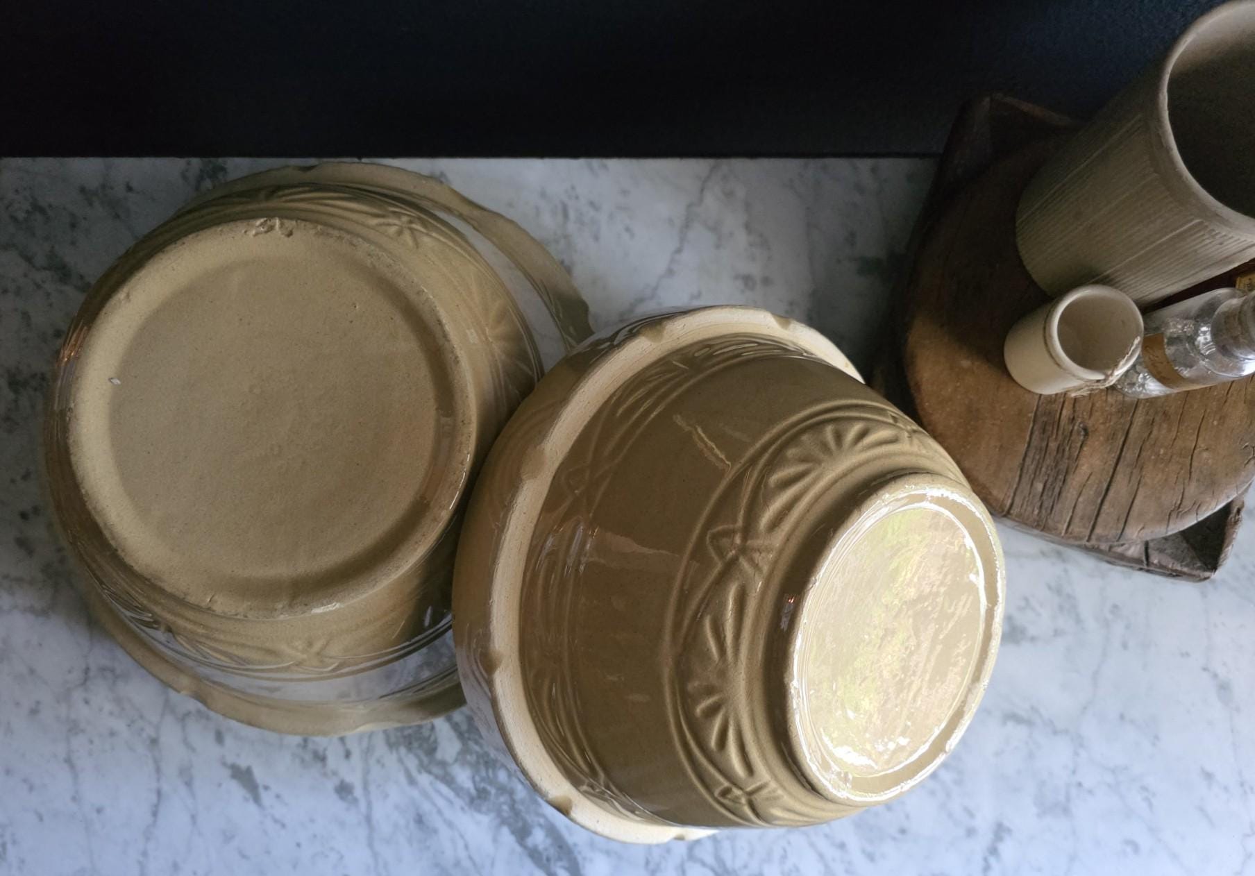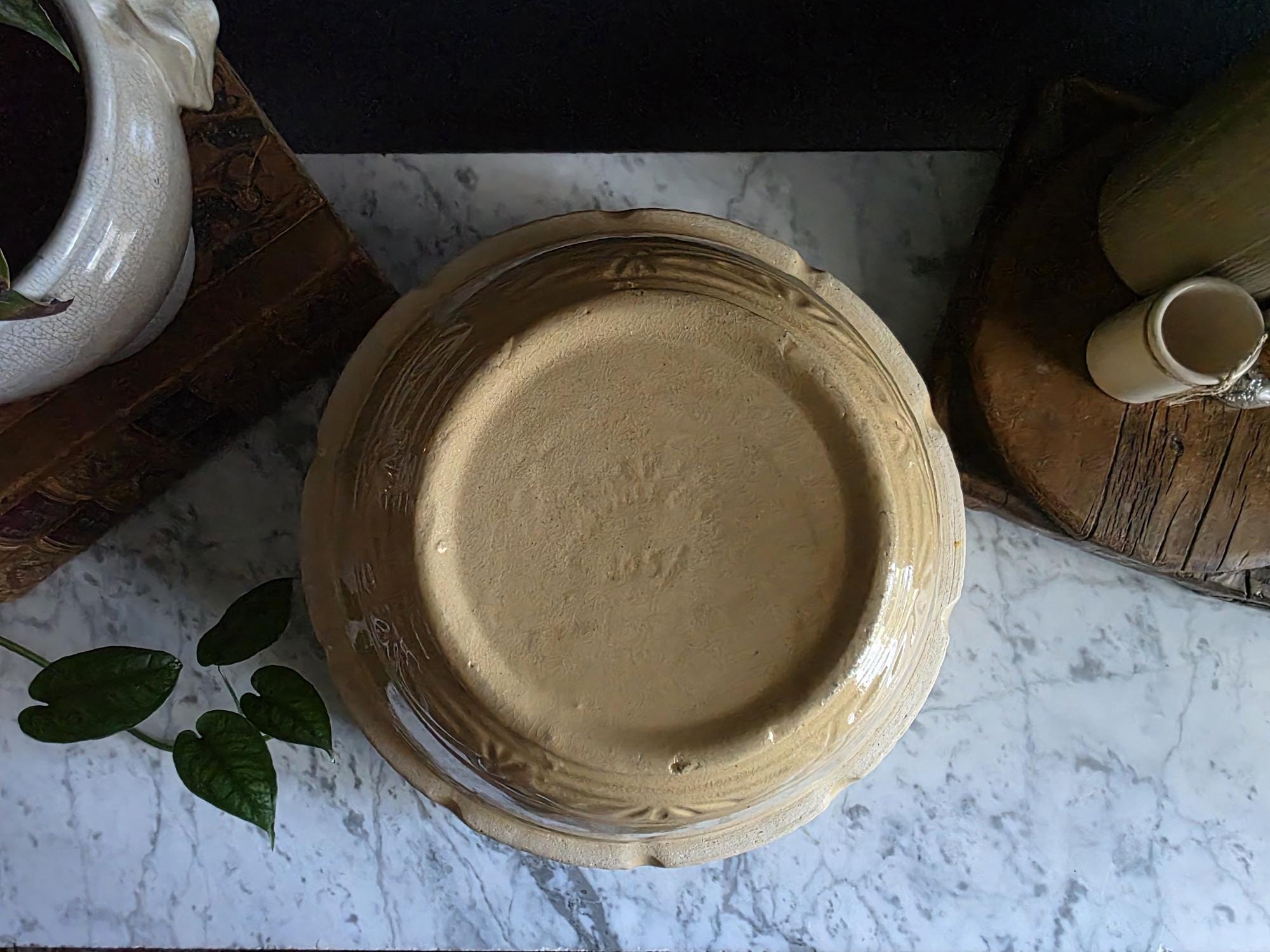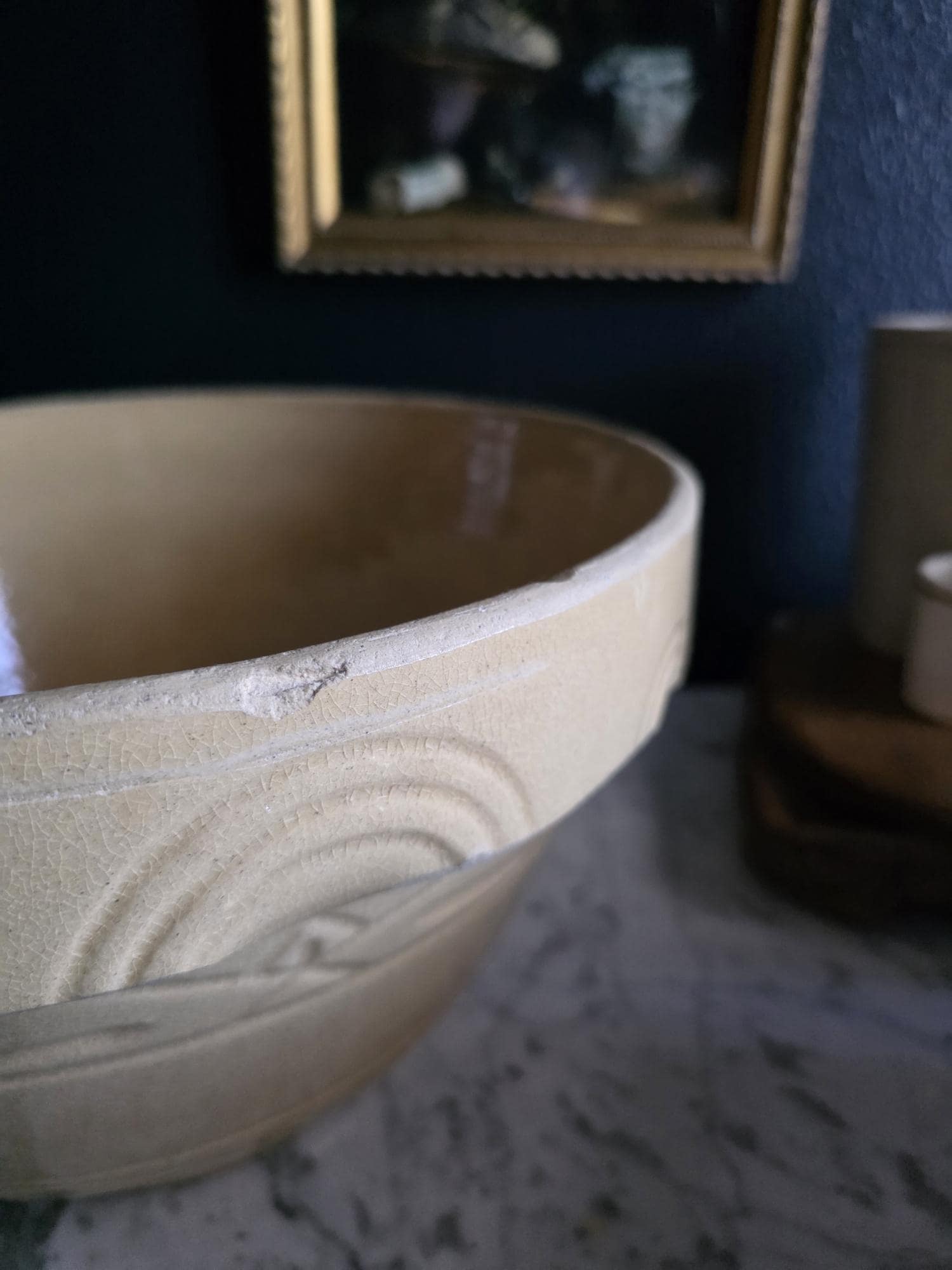 Add authentic farmhouse charm to your kitchen or display with this lovely set of two Antique American Yellowware Nesting Mixing Bowls. Dating from the late 19th to early 20th century, these stoneware bowls feature the classic, highly sought-after buff-to-pale-yellow clay body and a glossy, clear glaze. Each bowl is beautifully detailed with a distinctive, embossed band featuring a recurring stylized shell or fan pattern just beneath the rim, a popular decorative motif of the era. This graduating set is designed to nest perfectly, making them ideal for both use and display. They are a quintessential piece of Primitive, Rusticlodge, or Cottagecore decor, perfect for active baking, serving fruit, or simply adding a touch of rustic history to your kitchen shelves. The bowls are in wonderful antique condition with minor, expected signs of age and wear (such as surface crazing or use marks in the interior) that only enhance their vintage character. The smaller bowl has a very fine hairline crack (see listing photos closely) and remains perfect for mixing dry ingredients. The bottom of both bowls has a very faint RRPCo (Robinson Ransbottom Co) mark embossed into the pottery. Further evidence to us that they are an original pair.