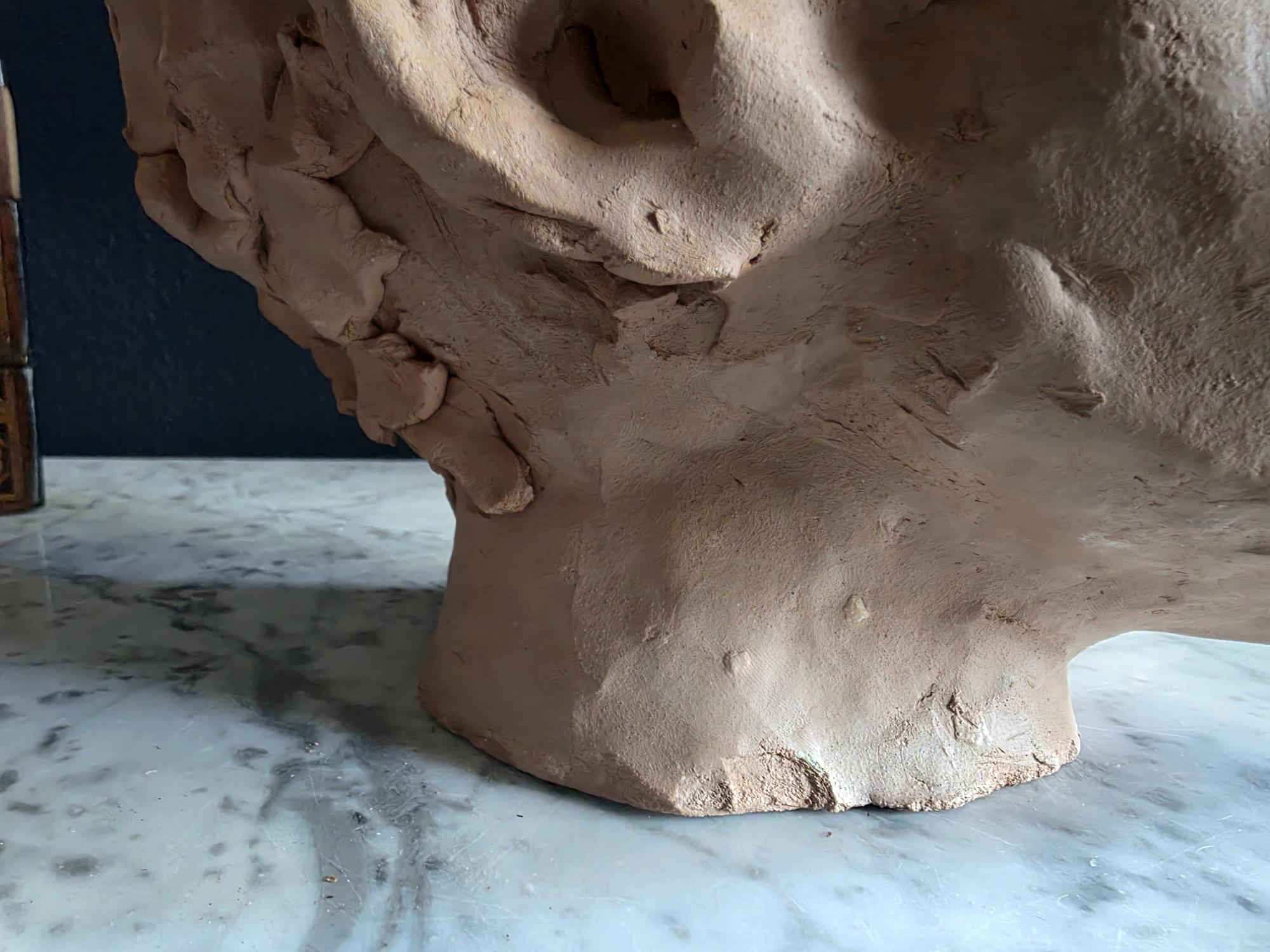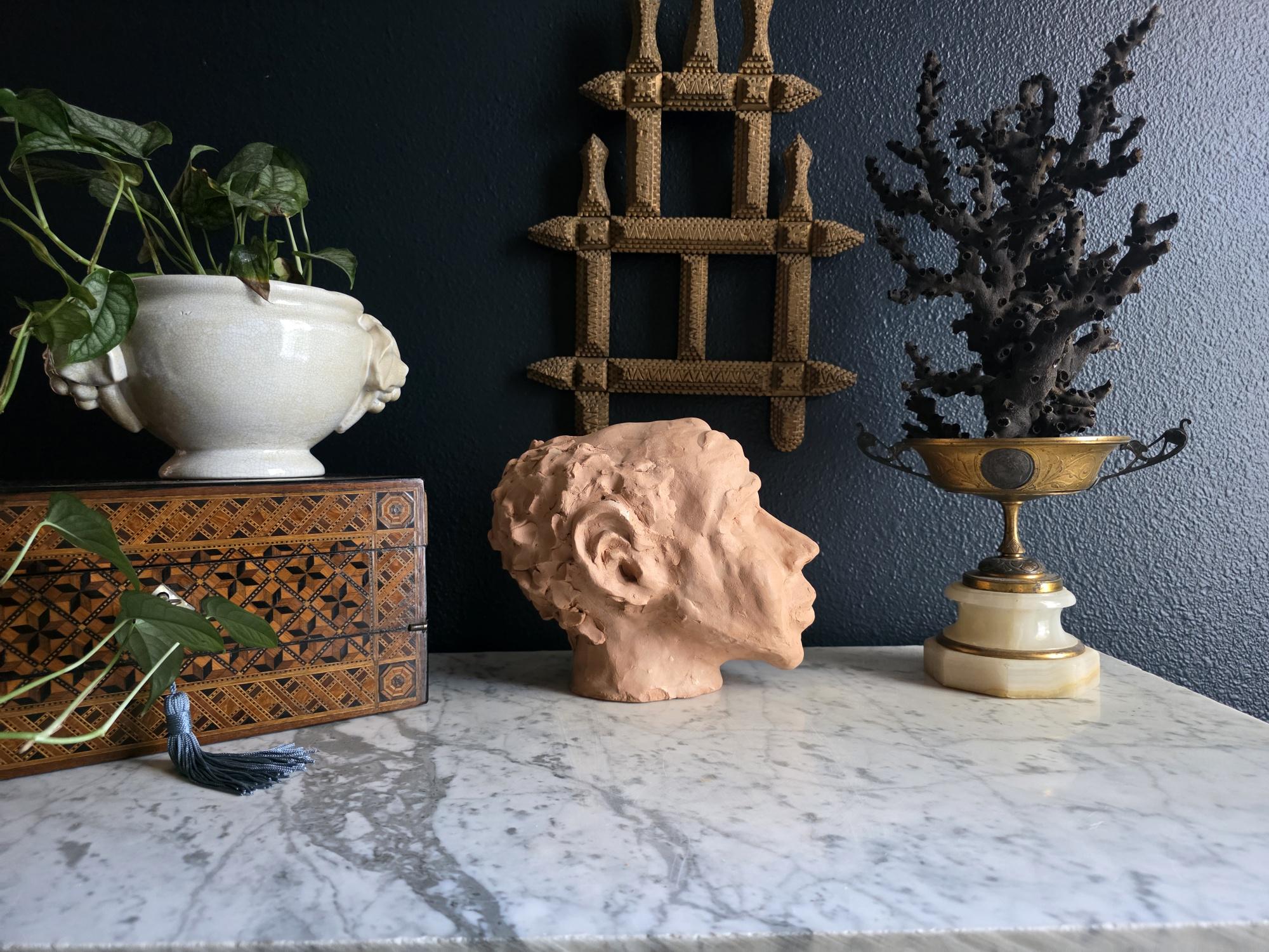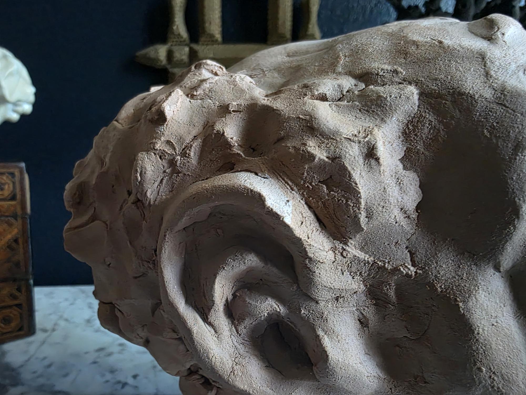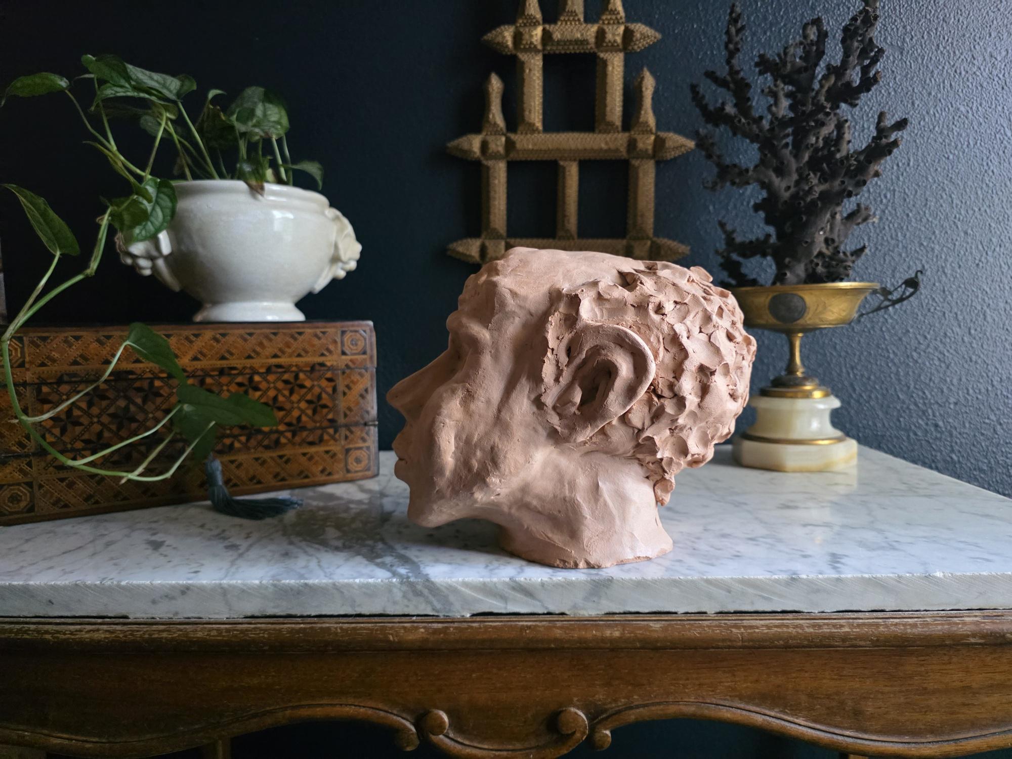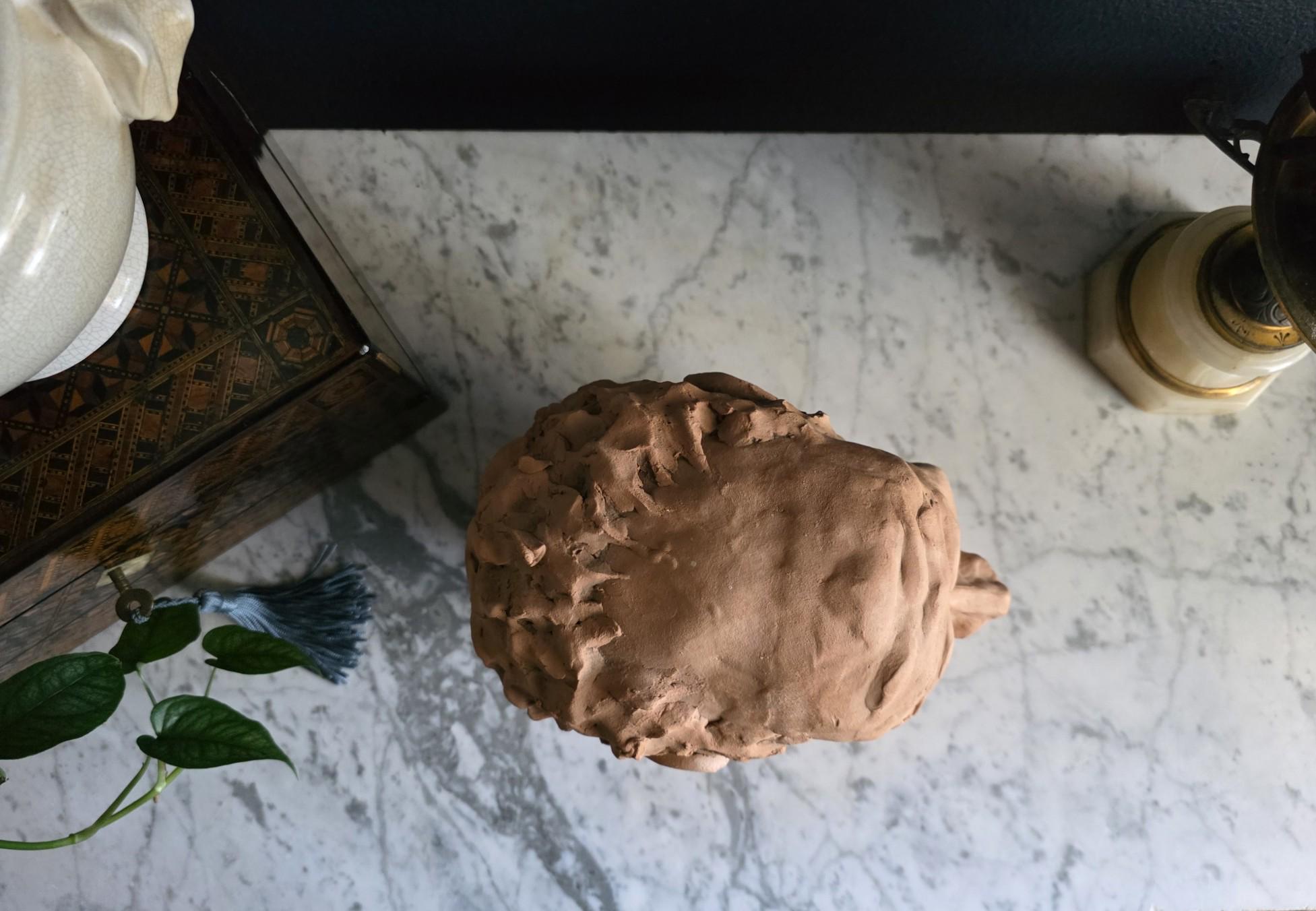 Embrace the raw, sculptural beauty of this unique, large, unsigned terracotta head study, likely an original artist's maquette from the mid-20th century. Rendered in warm, unglazed clay, the piece features a captivating contrast: the subject's face is subtly stylized with a contemplative, serene expression, while the back and sides of the head are aggressively textured with thick, swirling clay that emphasizes the sculptor's hand. This one-of-a-kind piece of primitive art, with its prominent "horseshoe" hair effect, brings a sophisticated, raw texture to modernist, academic, or eclectic décor. It is in worn vintage condition, celebrating the natural imperfections and bold artistry of the fired clay medium. Once large chip exists at the base of the neck on the back of the bust. Once small chip on the top of the right ear, and other smaller chips across the base of the neck.