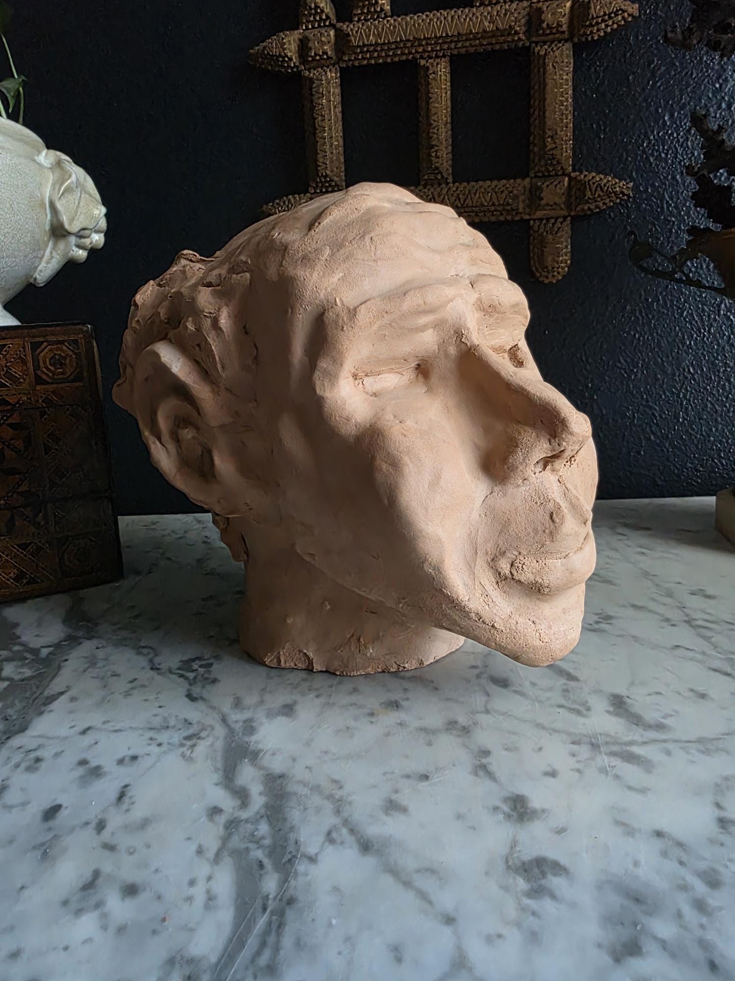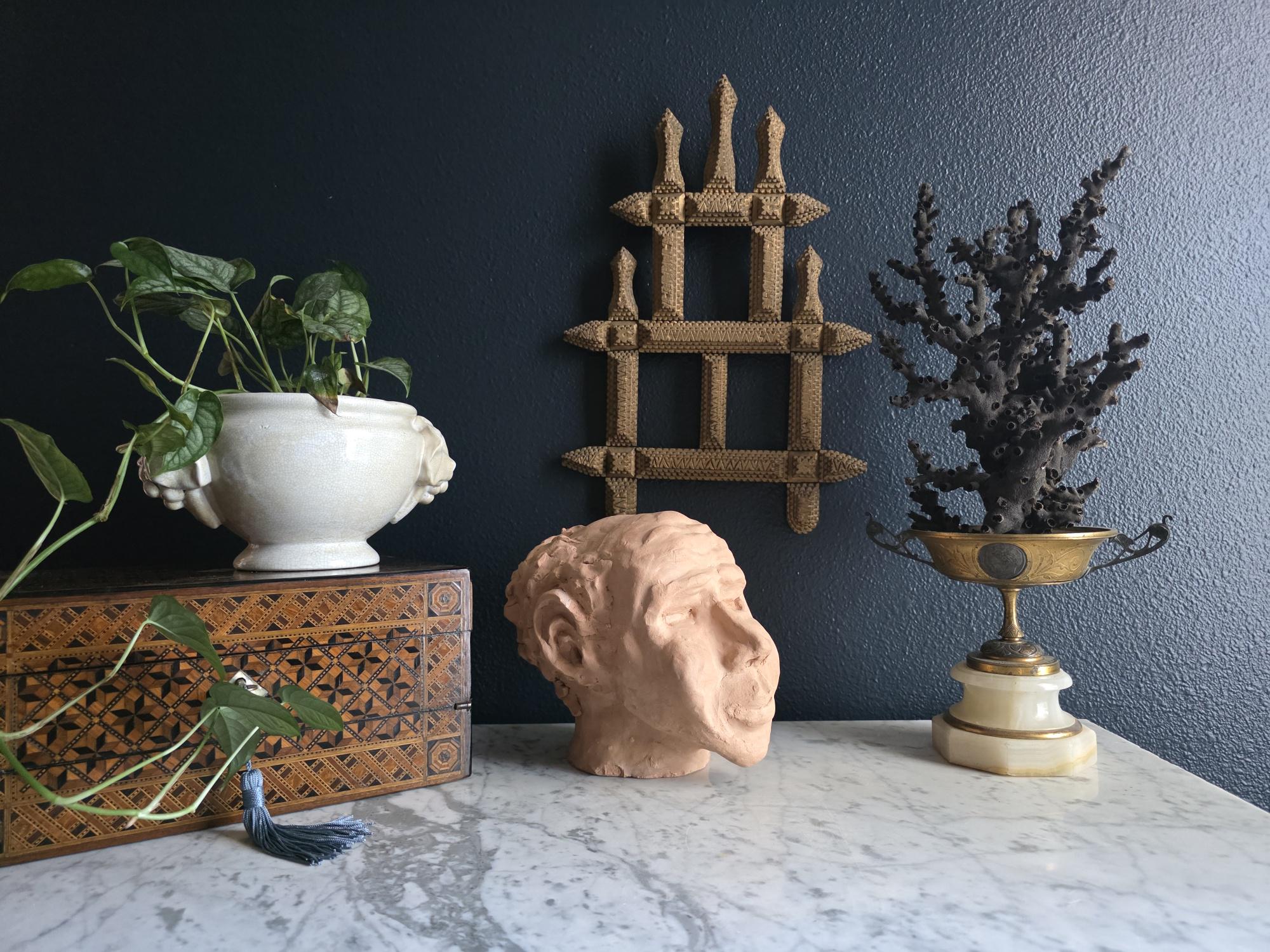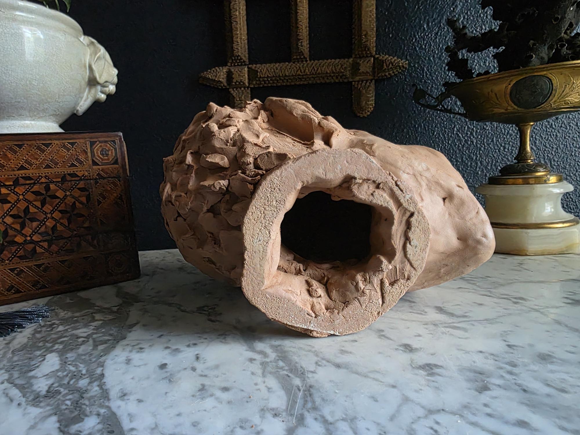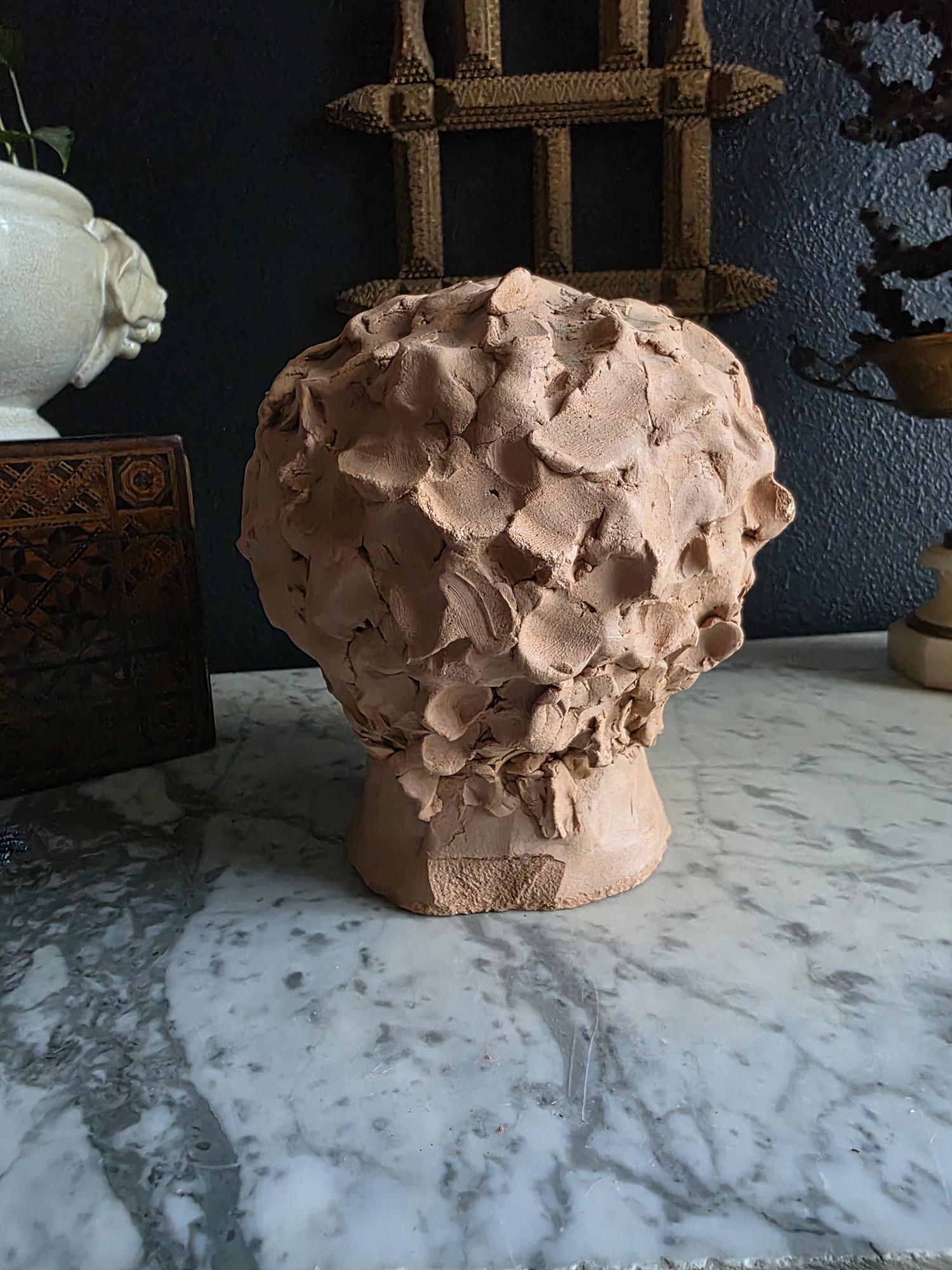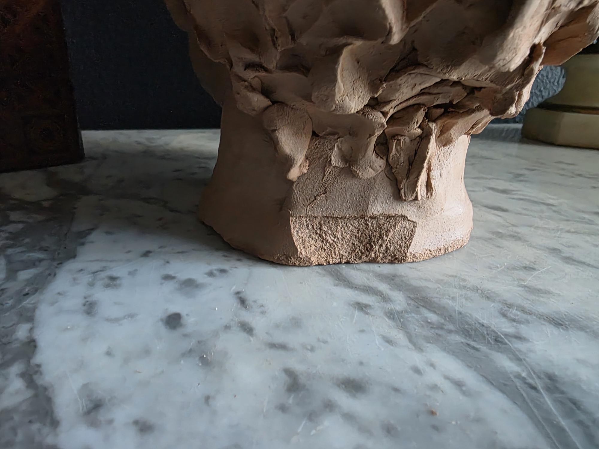 Embrace the raw, sculptural beauty of this unique, large, unsigned terracotta head study, likely an original artist's maquette from the mid-20th century. Rendered in warm, unglazed clay, the piece features a captivating contrast: the subject's face is subtly stylized with a contemplative, serene expression, while the back and sides of the head are aggressively textured with thick, swirling clay that emphasizes the sculptor's hand. This one-of-a-kind piece of primitive art, with its prominent "horseshoe" hair effect, brings a sophisticated, raw texture to modernist, academic, or eclectic décor. It is in worn vintage condition, celebrating the natural imperfections and bold artistry of the fired clay medium. Once large chip exists at the base of the neck on the back of the bust. Once small chip on the top of the right ear, and other smaller chips across the base of the neck.