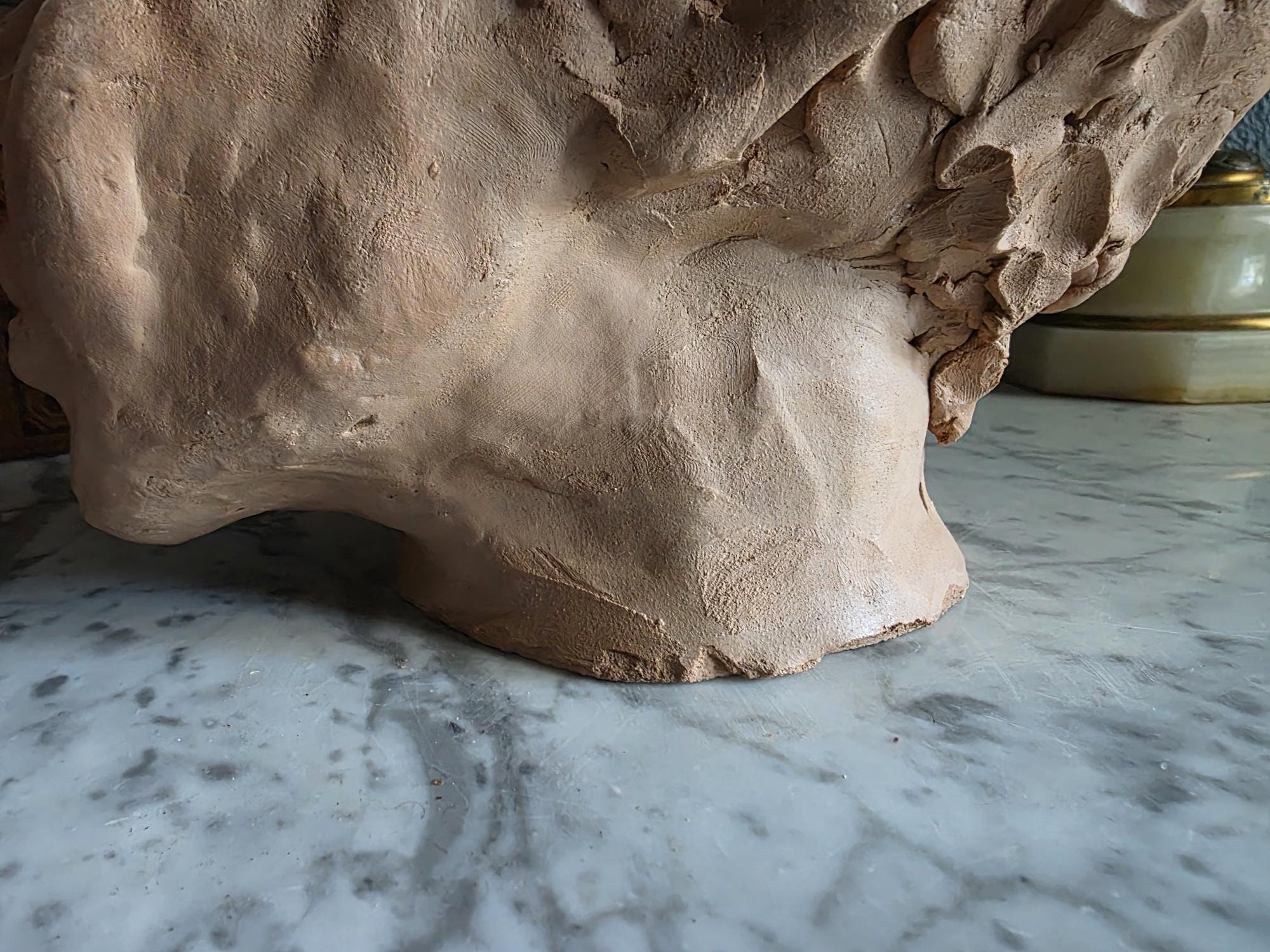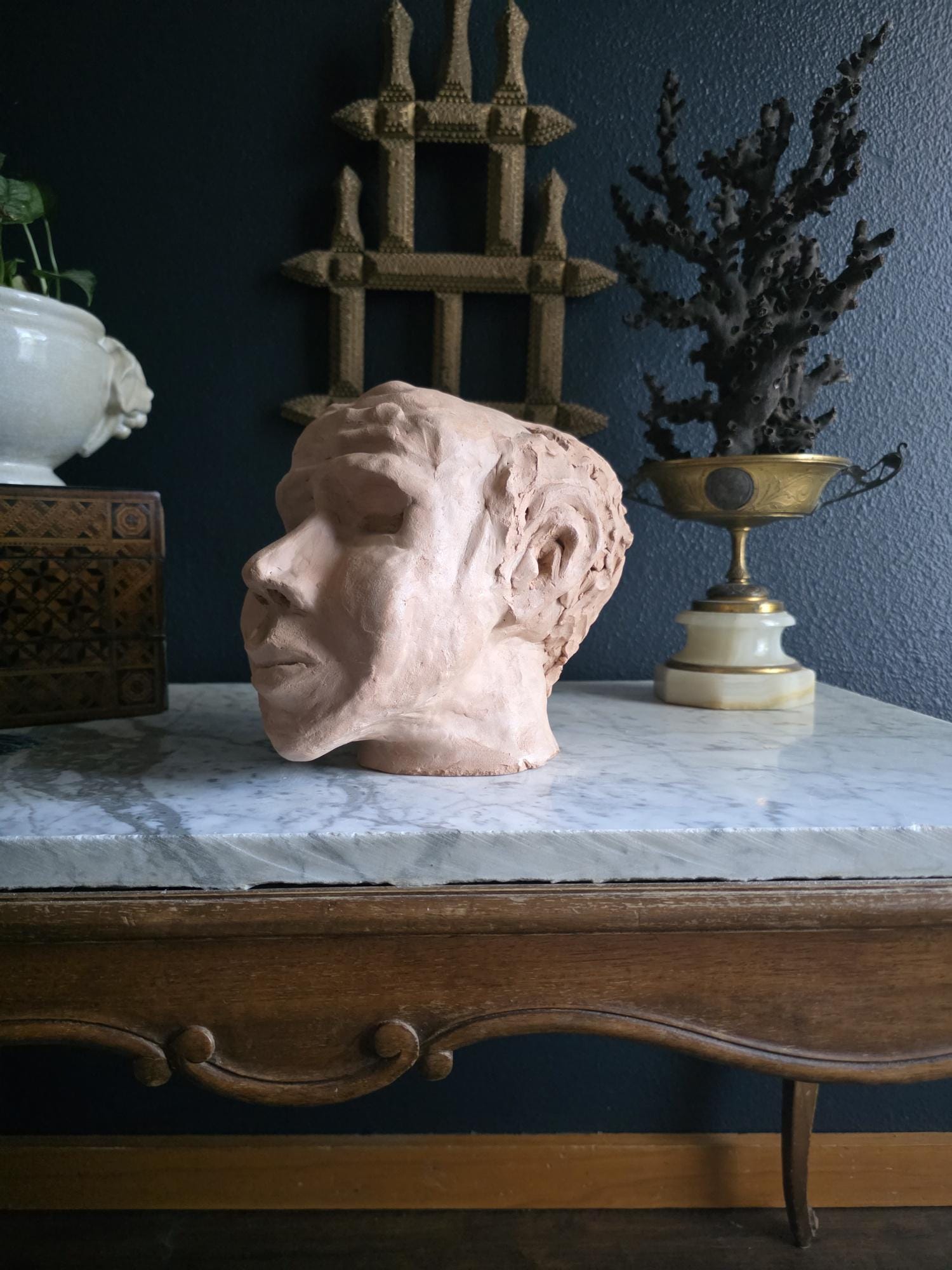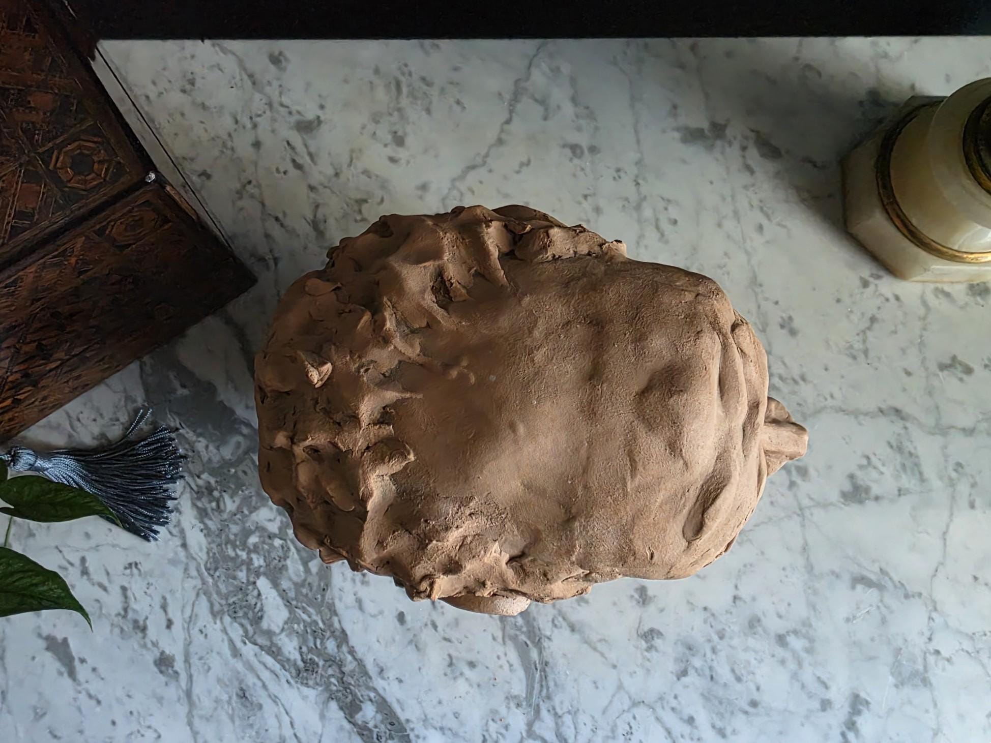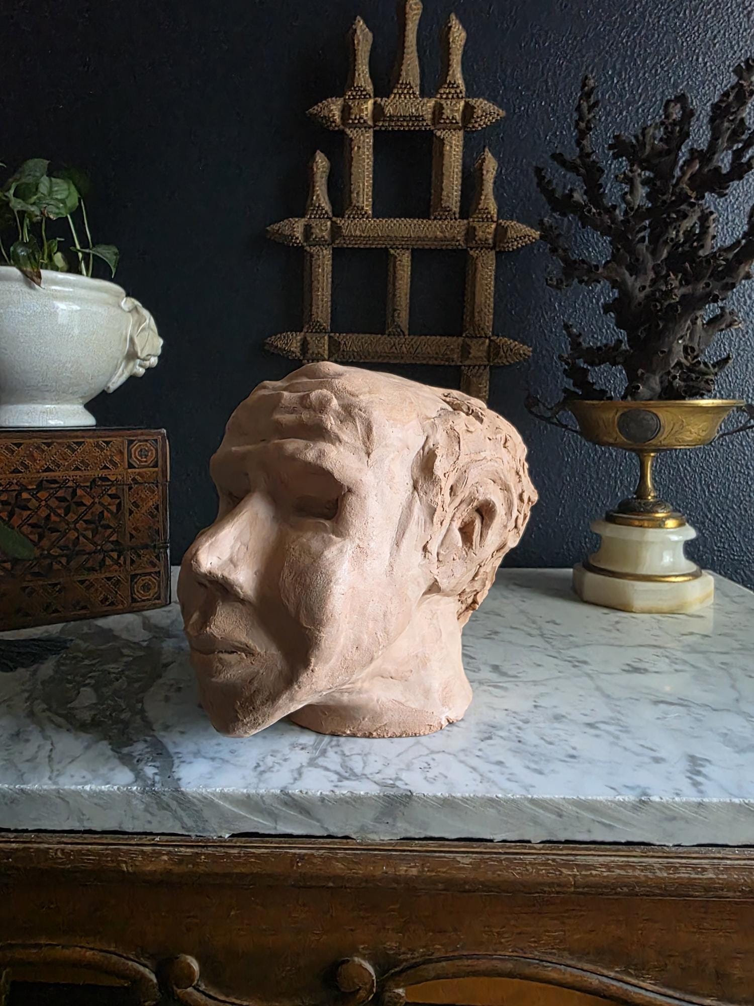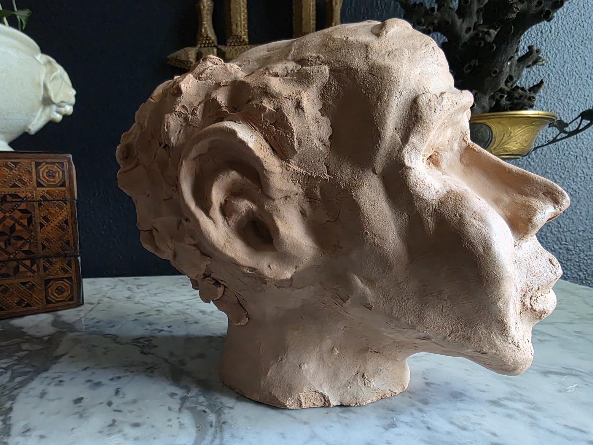 Embrace the raw, sculptural beauty of this unique, large, unsigned terracotta head study, likely an original artist's maquette from the mid-20th century. Rendered in warm, unglazed clay, the piece features a captivating contrast: the subject's face is subtly stylized with a contemplative, serene expression, while the back and sides of the head are aggressively textured with thick, swirling clay that emphasizes the sculptor's hand. This one-of-a-kind piece of primitive art, with its prominent "horseshoe" hair effect, brings a sophisticated, raw texture to modernist, academic, or eclectic décor. It is in worn vintage condition, celebrating the natural imperfections and bold artistry of the fired clay medium. Once large chip exists at the base of the neck on the back of the bust. Once small chip on the top of the right ear, and other smaller chips across the base of the neck.