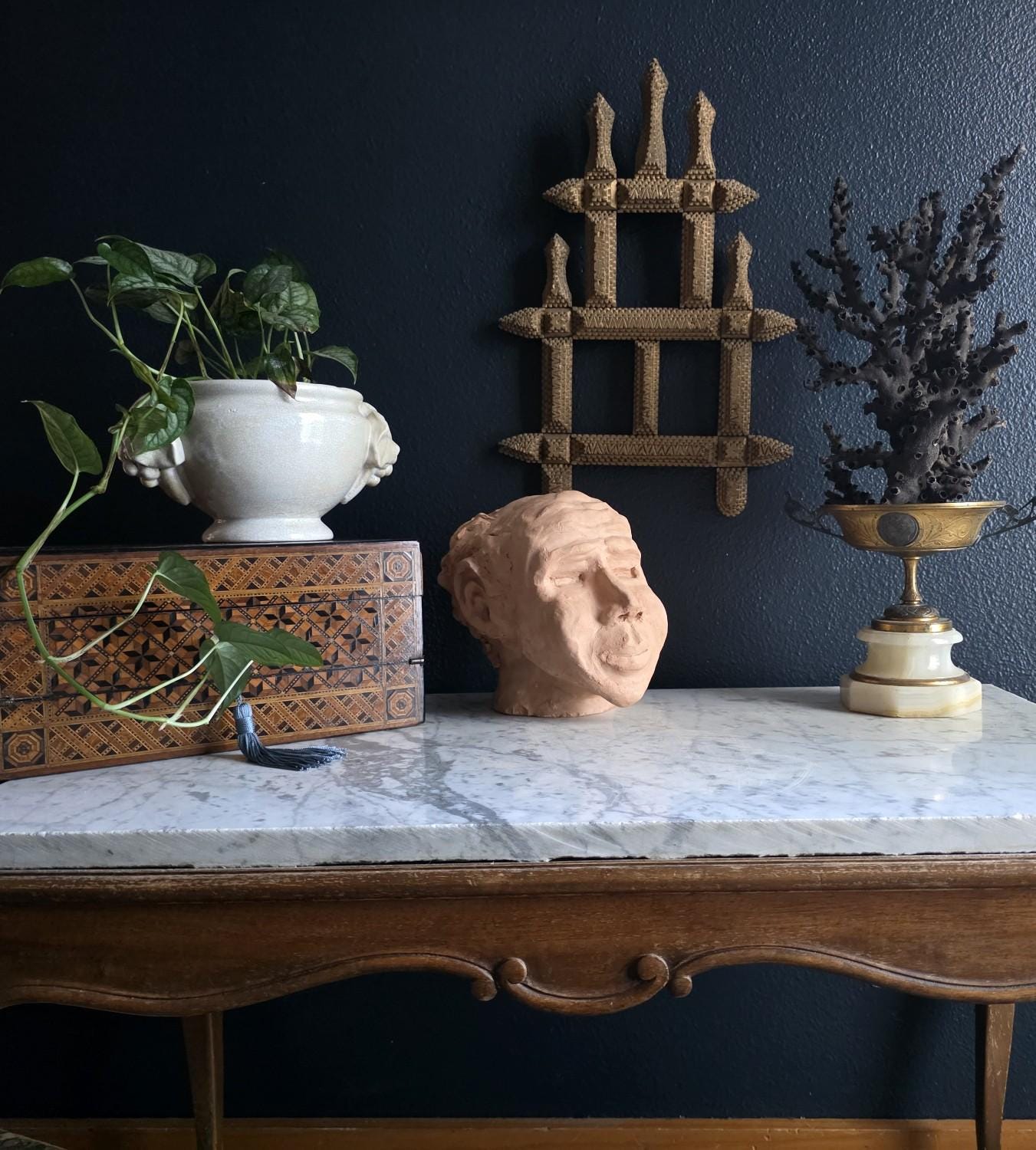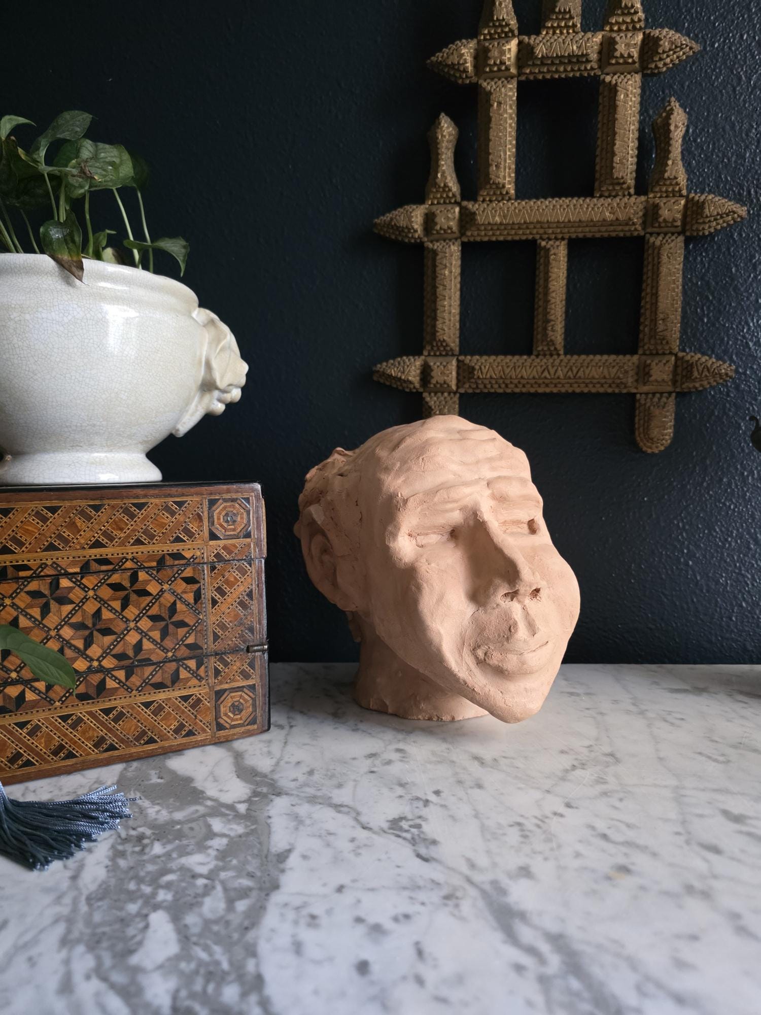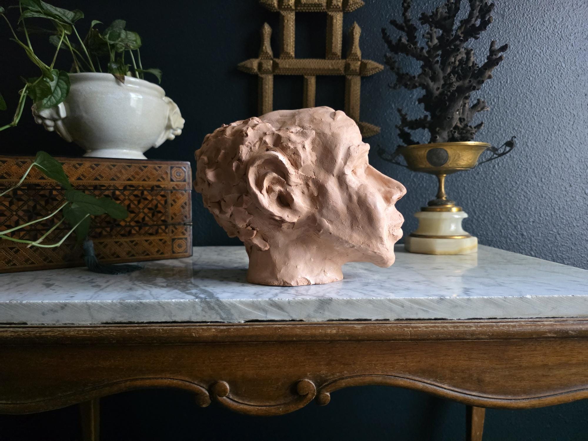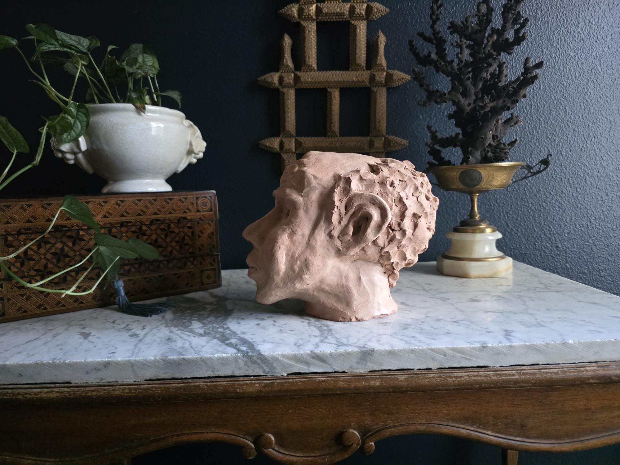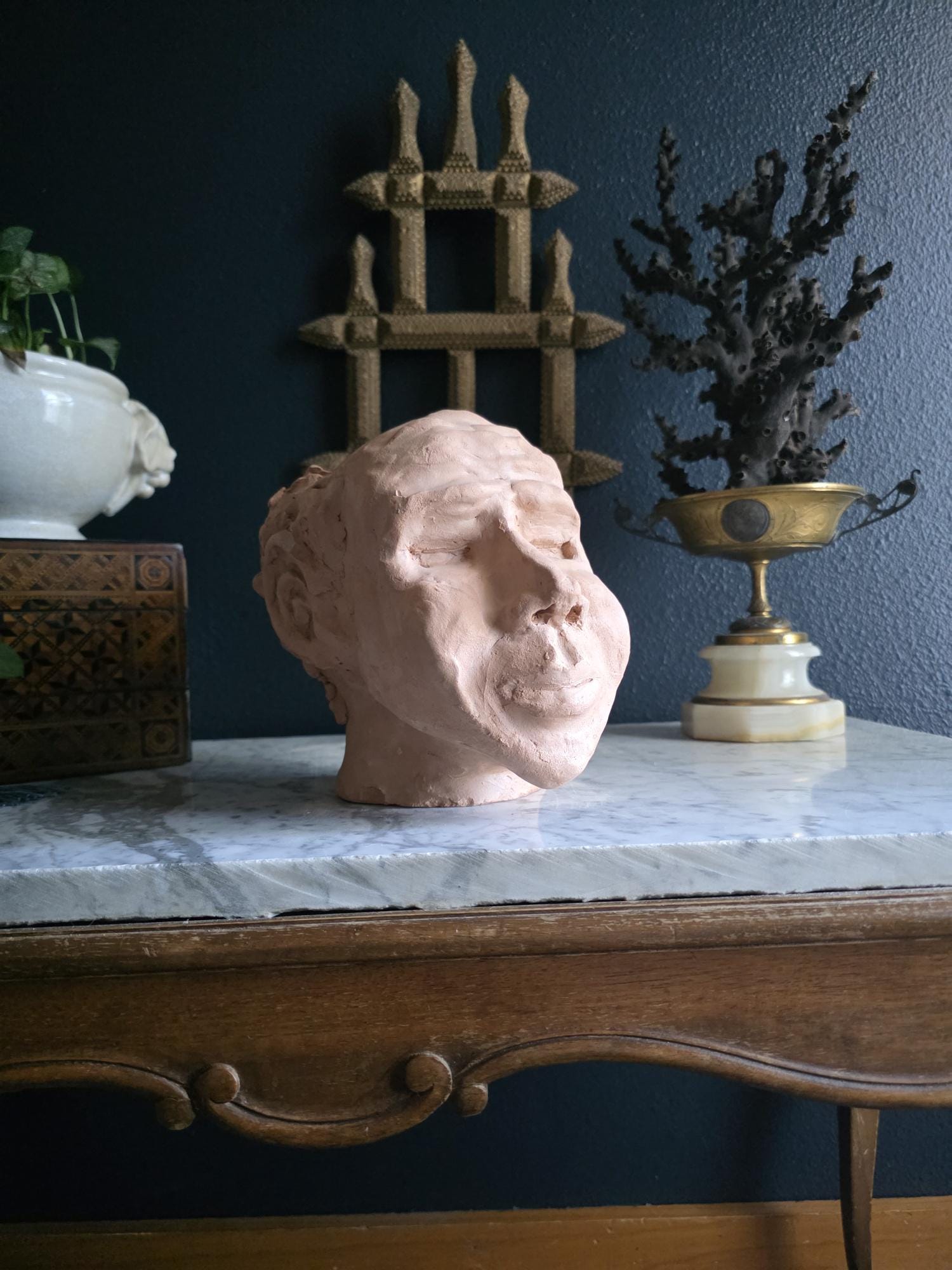 Embrace the raw, sculptural beauty of this unique, large, unsigned terracotta head study, likely an original artist's maquette from the mid-20th century. Rendered in warm, unglazed clay, the piece features a captivating contrast: the subject's face is subtly stylized with a contemplative, serene expression, while the back and sides of the head are aggressively textured with thick, swirling clay that emphasizes the sculptor's hand. This one-of-a-kind piece of primitive art, with its prominent "horseshoe" hair effect, brings a sophisticated, raw texture to modernist, academic, or eclectic décor. It is in worn vintage condition, celebrating the natural imperfections and bold artistry of the fired clay medium. Once large chip exists at the base of the neck on the back of the bust. Once small chip on the top of the right ear, and other smaller chips across the base of the neck.