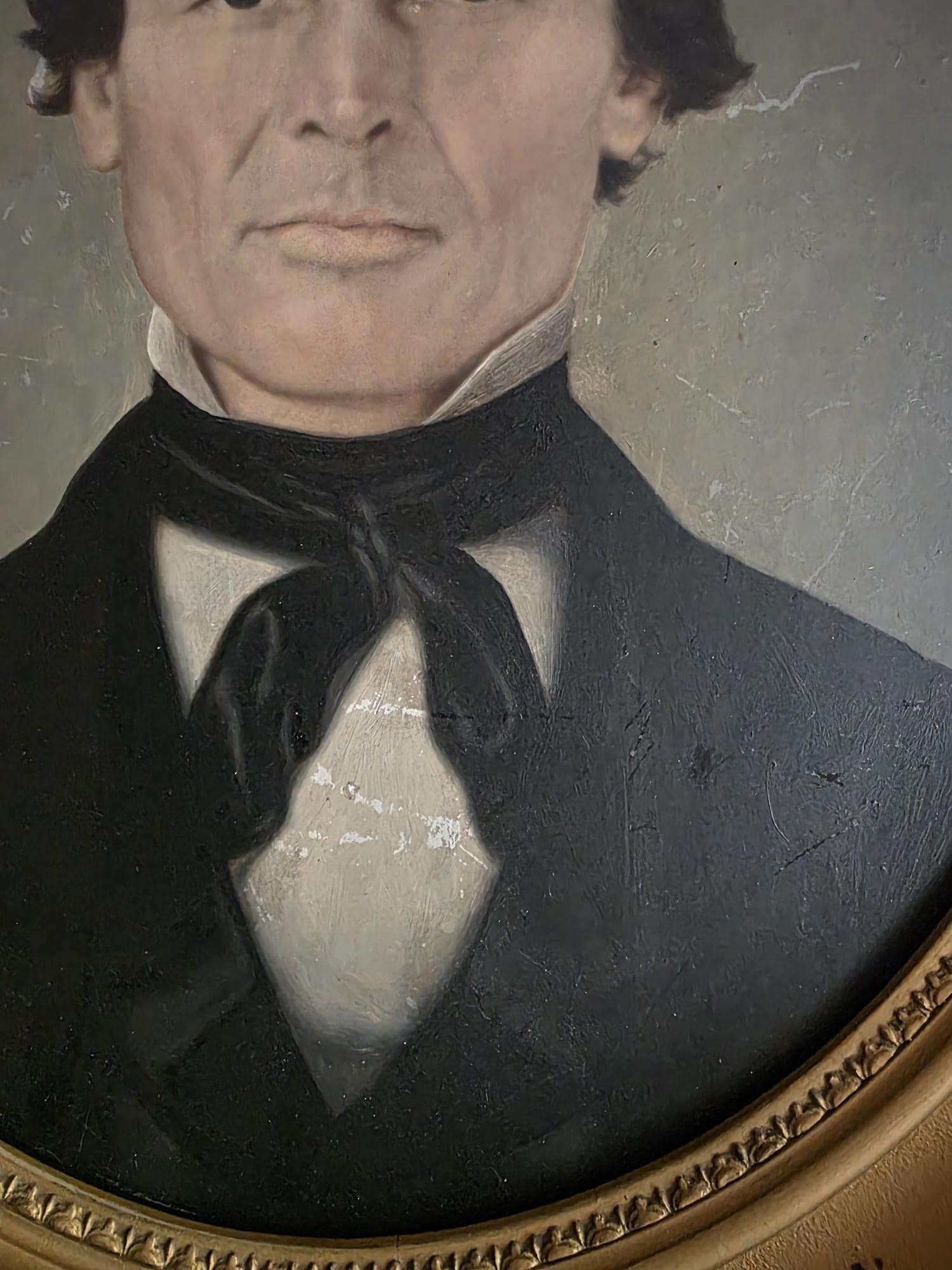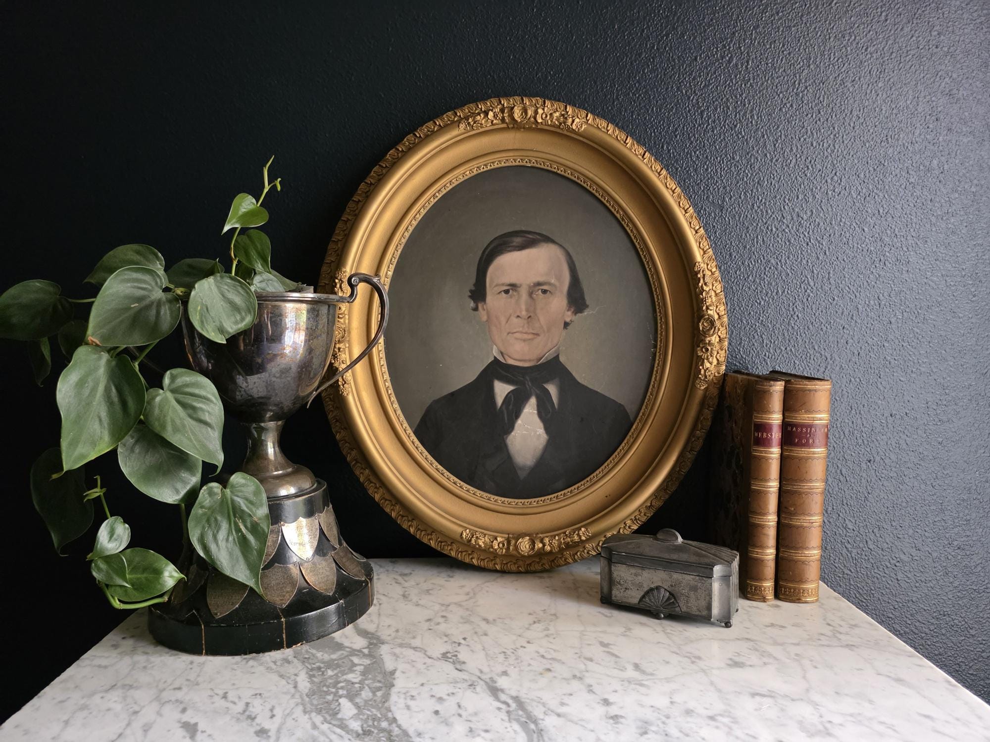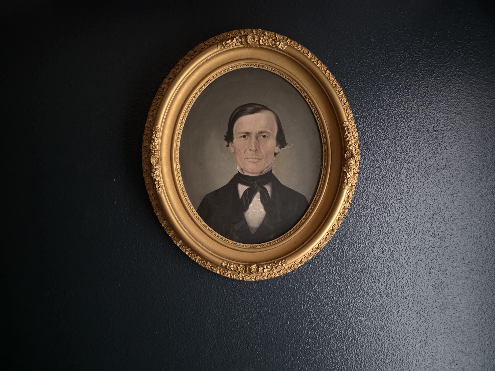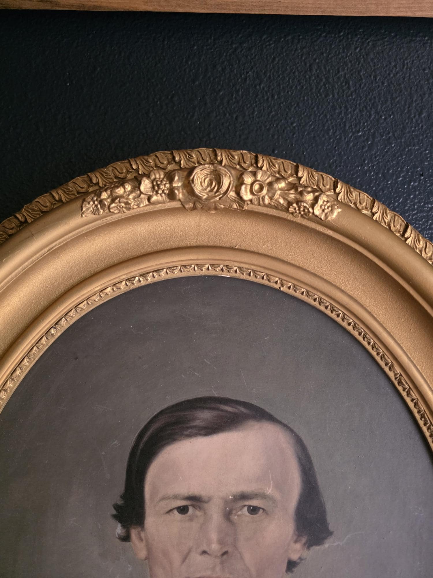 This is a truly exceptional antique piece of Americana: an oil-tinted photograph portrait of Bergin Happy (1811–1865), estimated to have been taken around 1860. The portrait captures a distinguished gentleman with a resolute expression, formally dressed in a dark suit, waistcoat, and a prominent black satin cravat or bow tie, reflecting the style of the late antebellum and Civil War era. The image itself is a remarkable example of mid-19th century photographic hand-coloring, where a photograph was carefully painted over with oil pigments to achieve the appearance of a traditional oil painting. The portrait is housed in its original, ornate gilded oval frame featuring classic floral and scrollwork designs appropriate for the period.