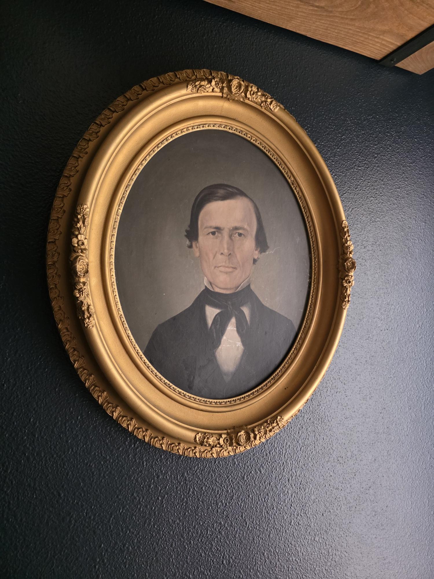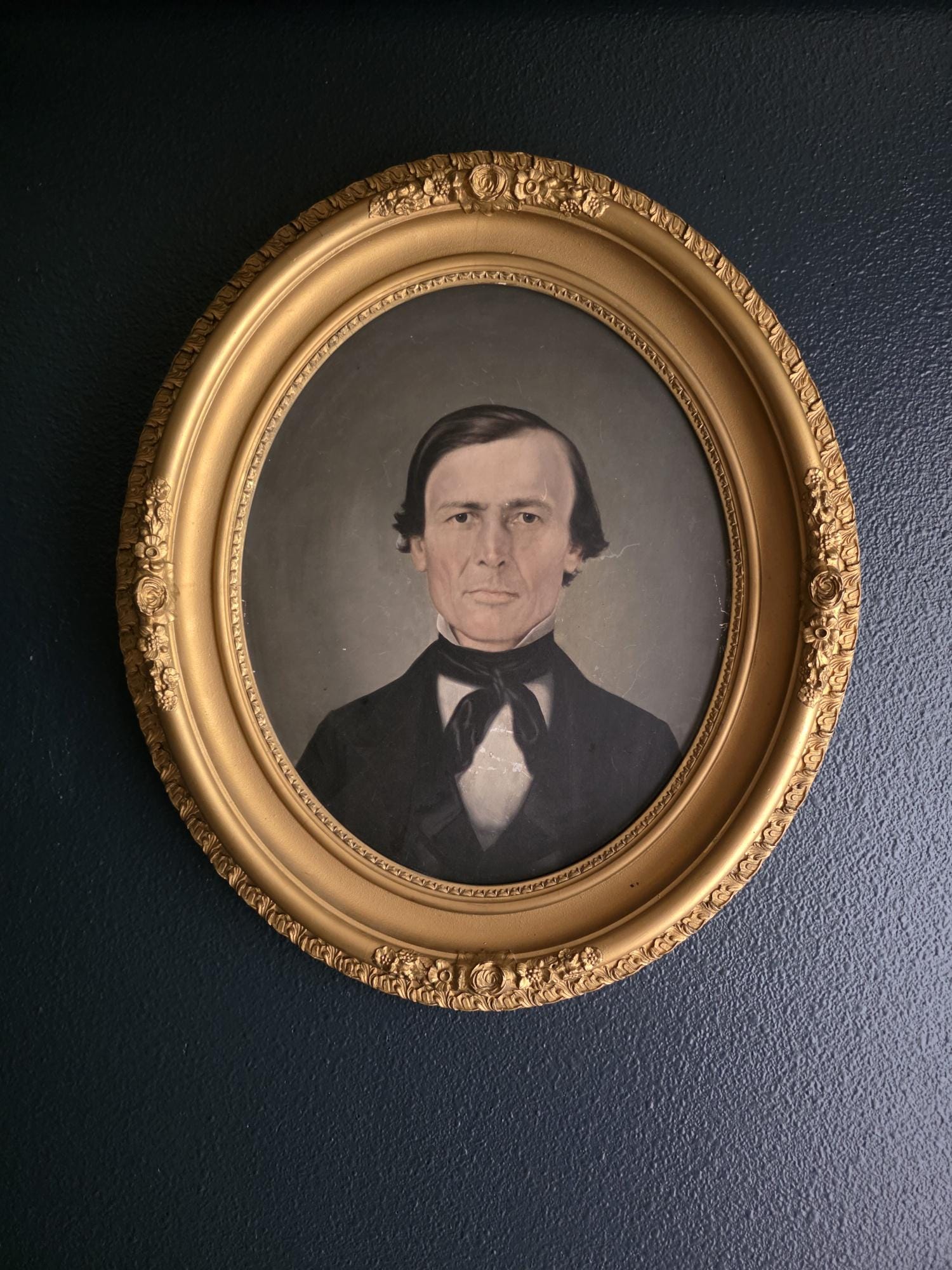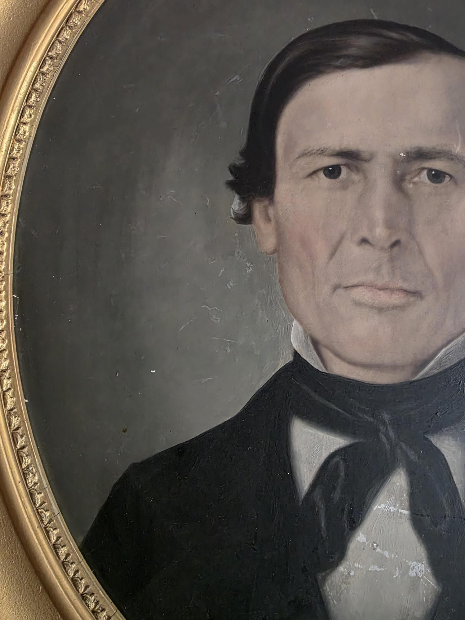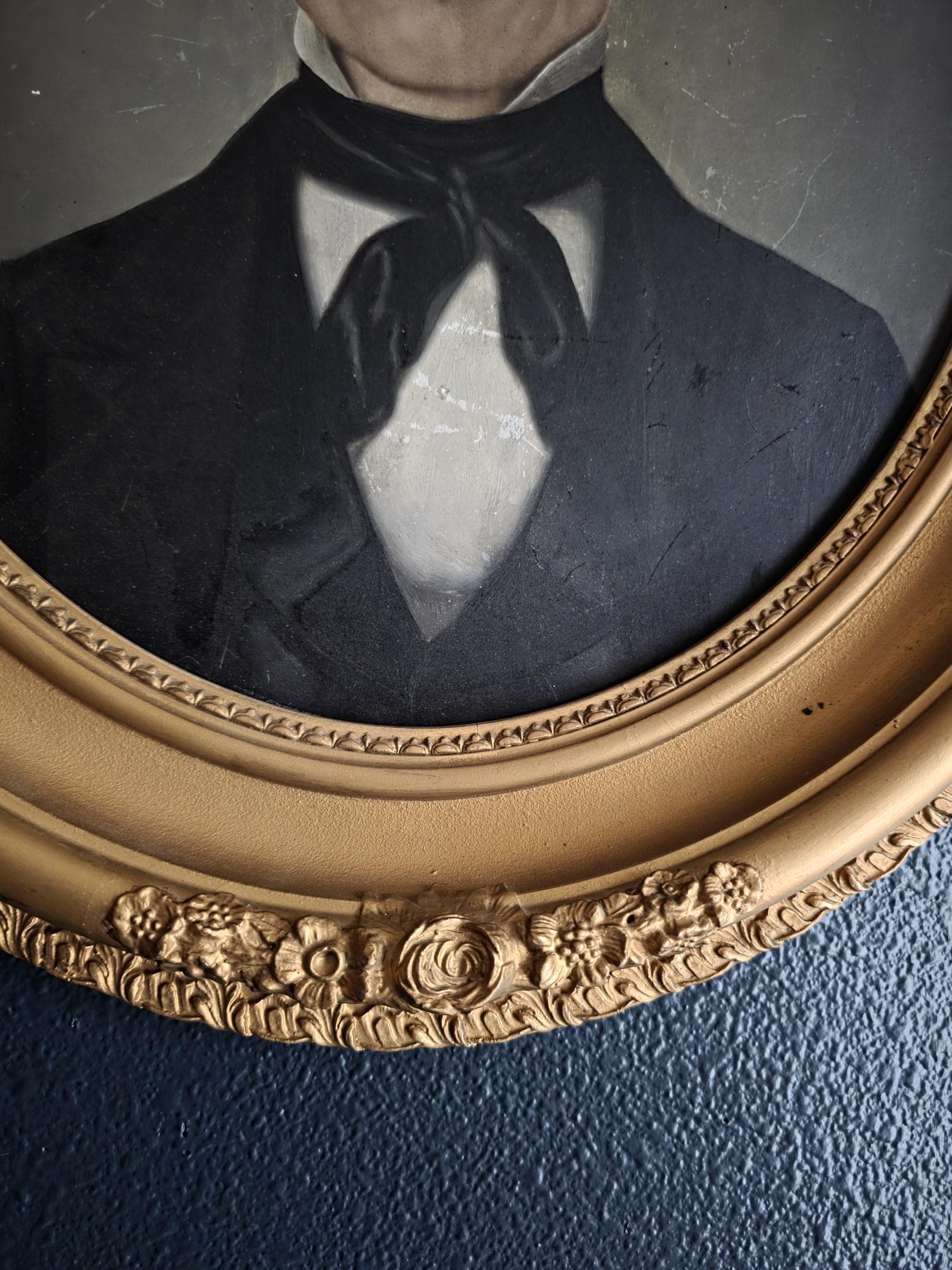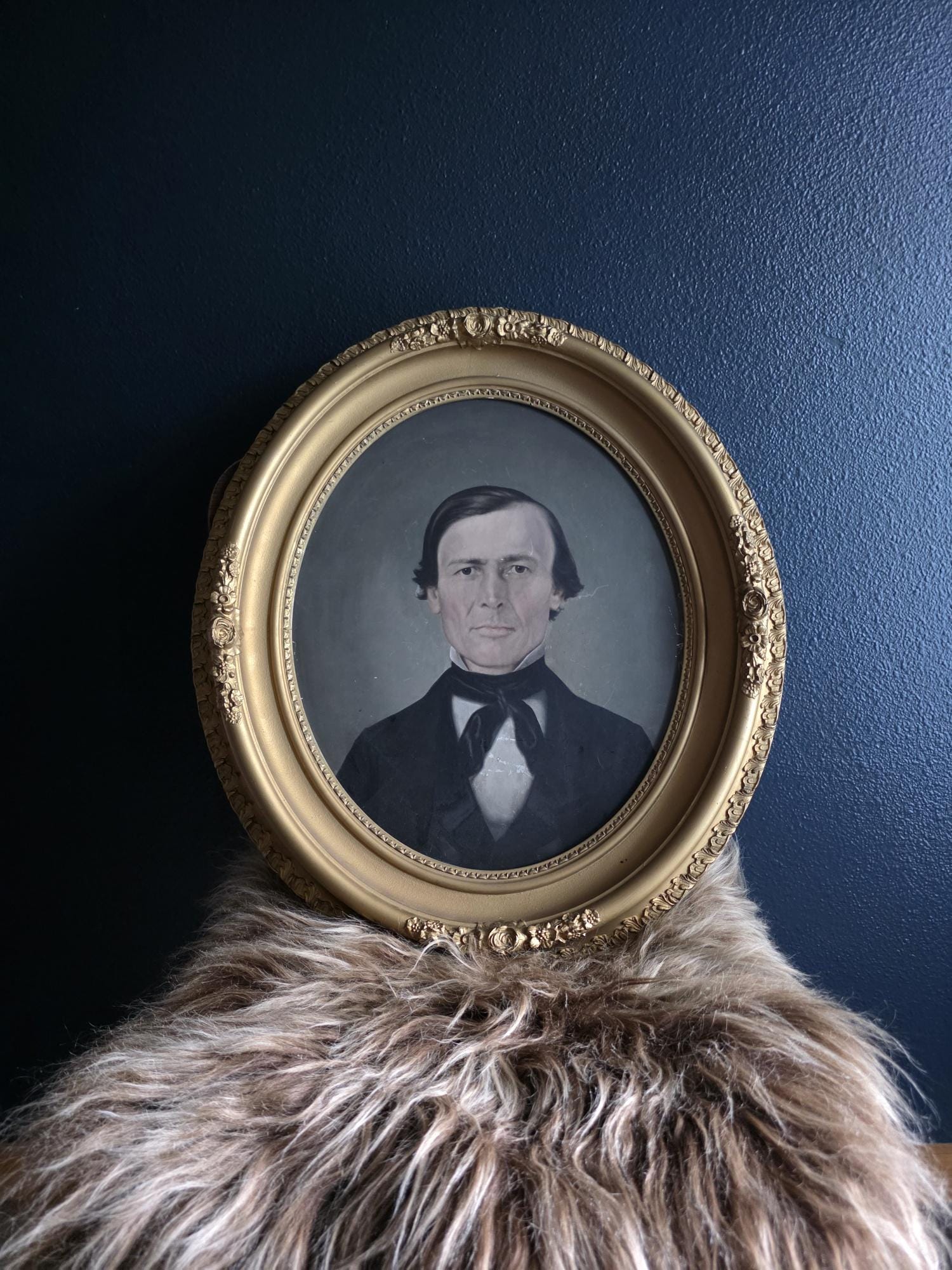 This is a truly exceptional antique piece of Americana: an oil-tinted photograph portrait of Bergin Happy (1811–1865), estimated to have been taken around 1860. The portrait captures a distinguished gentleman with a resolute expression, formally dressed in a dark suit, waistcoat, and a prominent black satin cravat or bow tie, reflecting the style of the late antebellum and Civil War era. The image itself is a remarkable example of mid-19th century photographic hand-coloring, where a photograph was carefully painted over with oil pigments to achieve the appearance of a traditional oil painting. The portrait is housed in its original, ornate gilded oval frame featuring classic floral and scrollwork designs appropriate for the period.