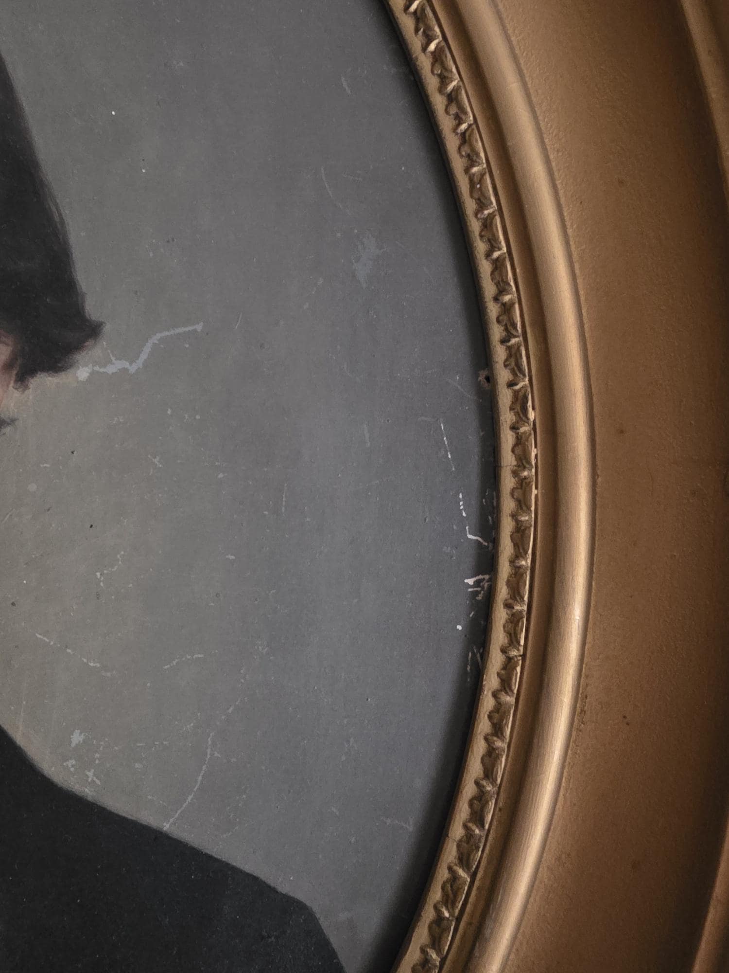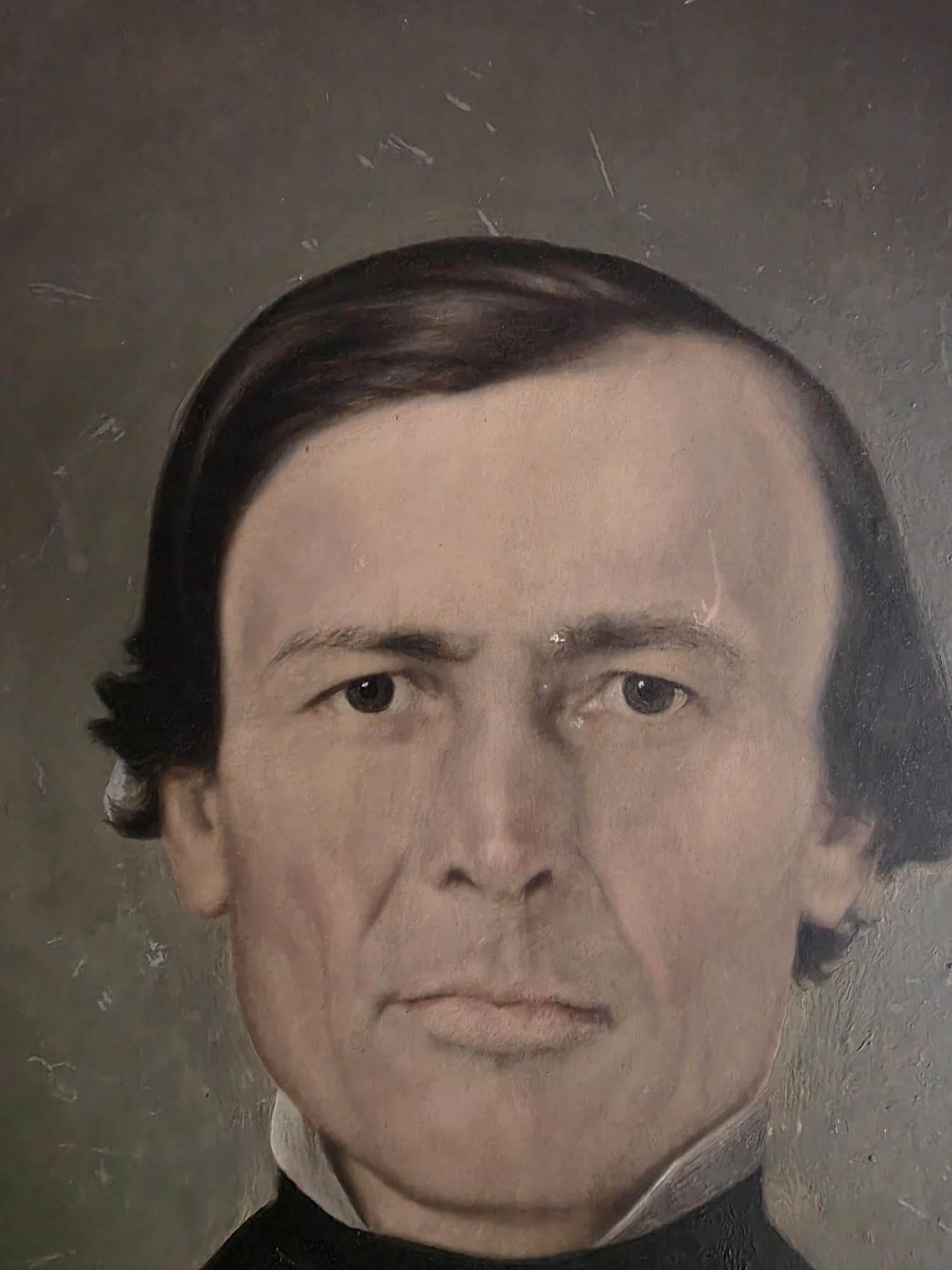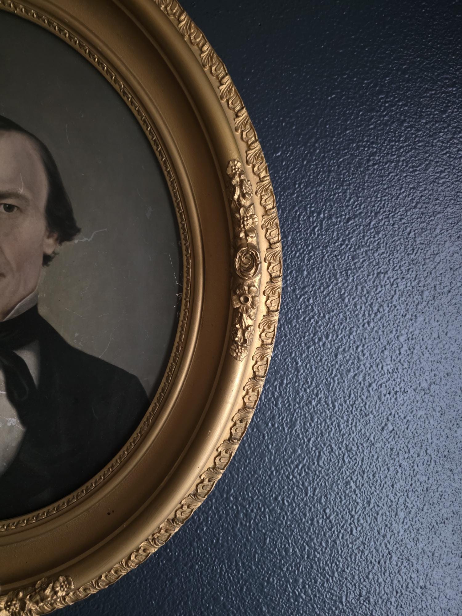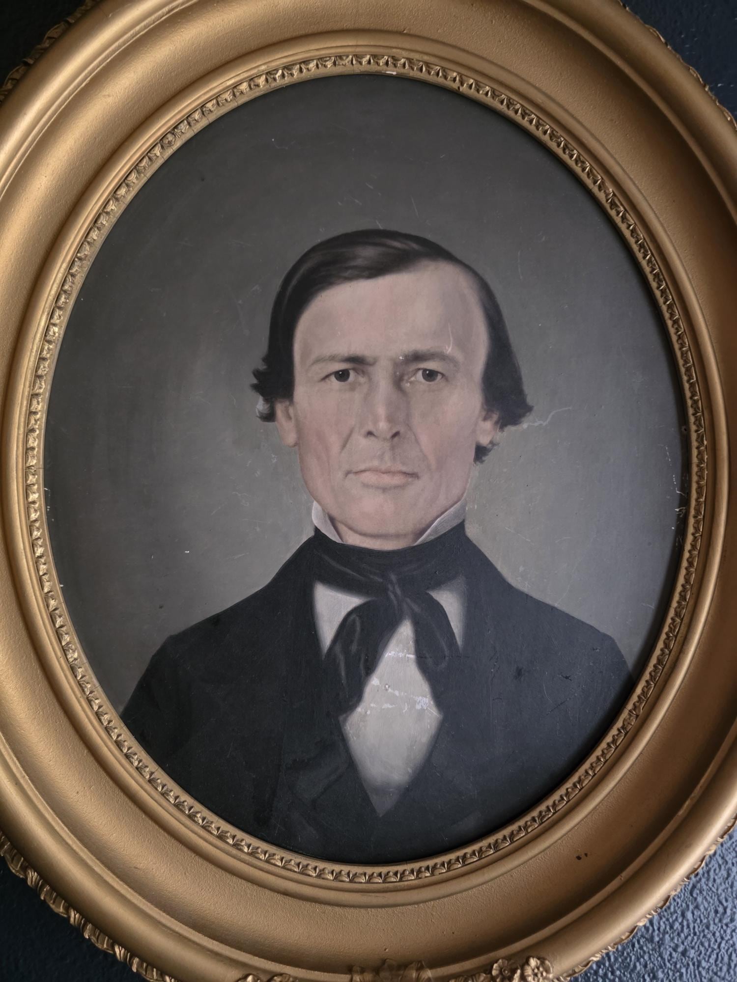 This is a truly exceptional antique piece of Americana: an oil-tinted photograph portrait of Bergin Happy (1811–1865), estimated to have been taken around 1860. The portrait captures a distinguished gentleman with a resolute expression, formally dressed in a dark suit, waistcoat, and a prominent black satin cravat or bow tie, reflecting the style of the late antebellum and Civil War era. The image itself is a remarkable example of mid-19th century photographic hand-coloring, where a photograph was carefully painted over with oil pigments to achieve the appearance of a traditional oil painting. The portrait is housed in its original, ornate gilded oval frame featuring classic floral and scrollwork designs appropriate for the period.