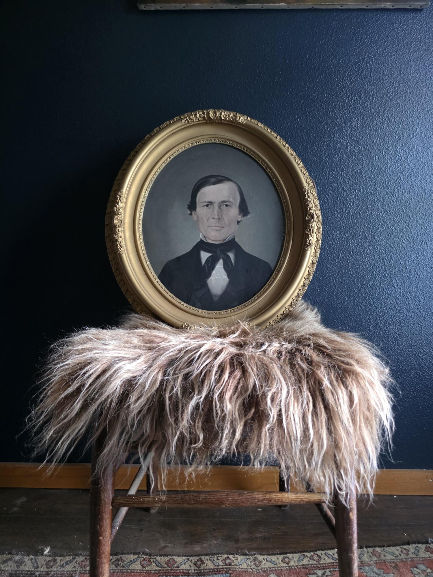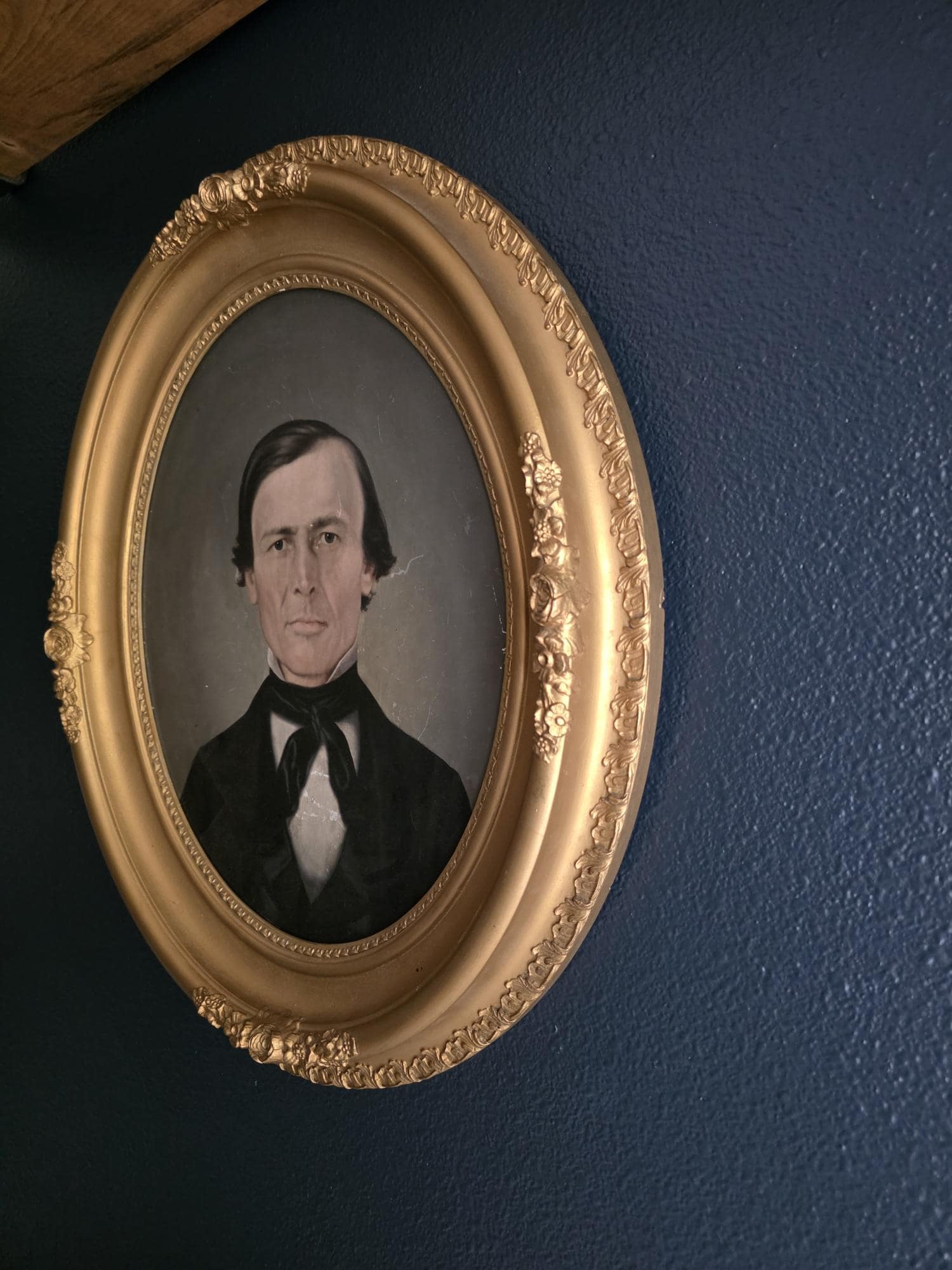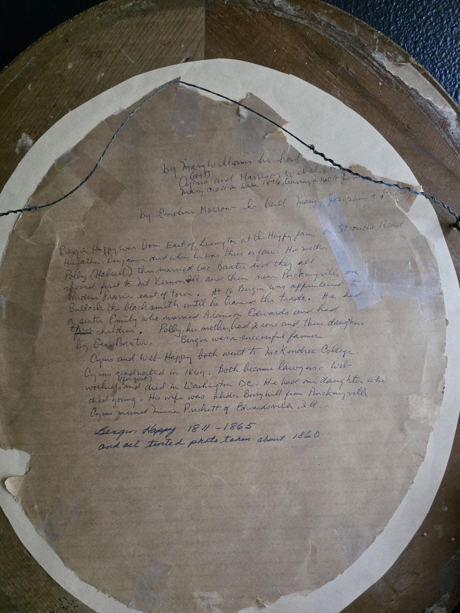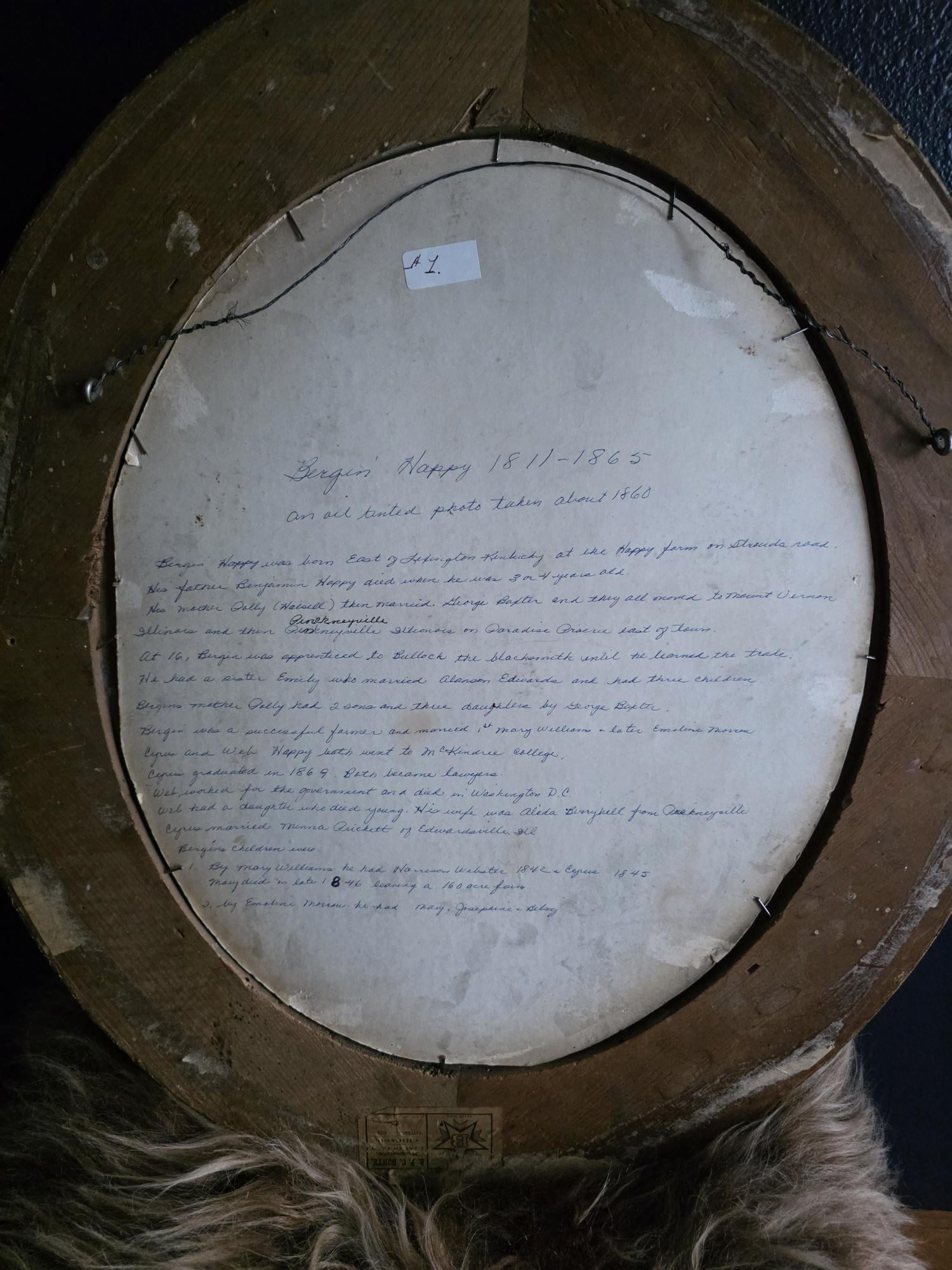 Invaluable Handwritten Provenance What elevates this portrait to a significant historical artifact is the remarkably detailed handwritten family history and provenance affixed to the reverse side. This document confirms the subject as Bergin Happy, detailing his life as a trained blacksmith, and successful farmer and his two marriages to Mary Williams and Emeline Morrow. The note provides extensive genealogical information, including the names of his parents, siblings, and children. This portrait is a rare and unique find for antique collectors, historians, and genealogy enthusiasts, offering not only a striking visual artifact but also a literal, primary-source document detailing a family's history across the 19th-century American frontier.