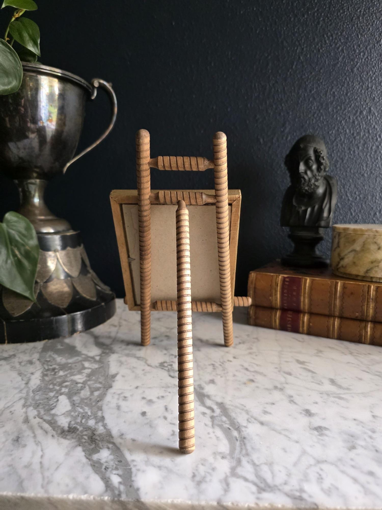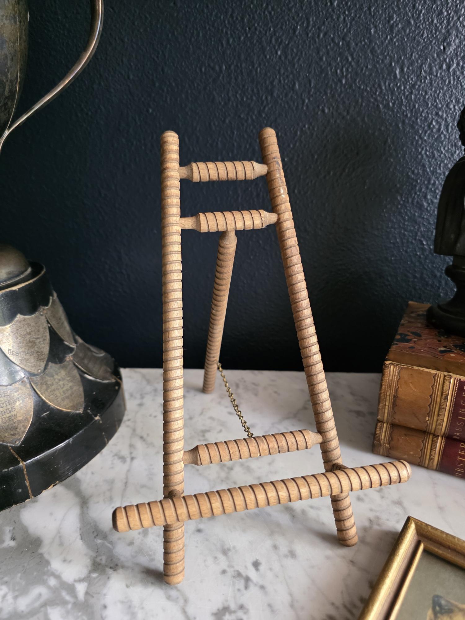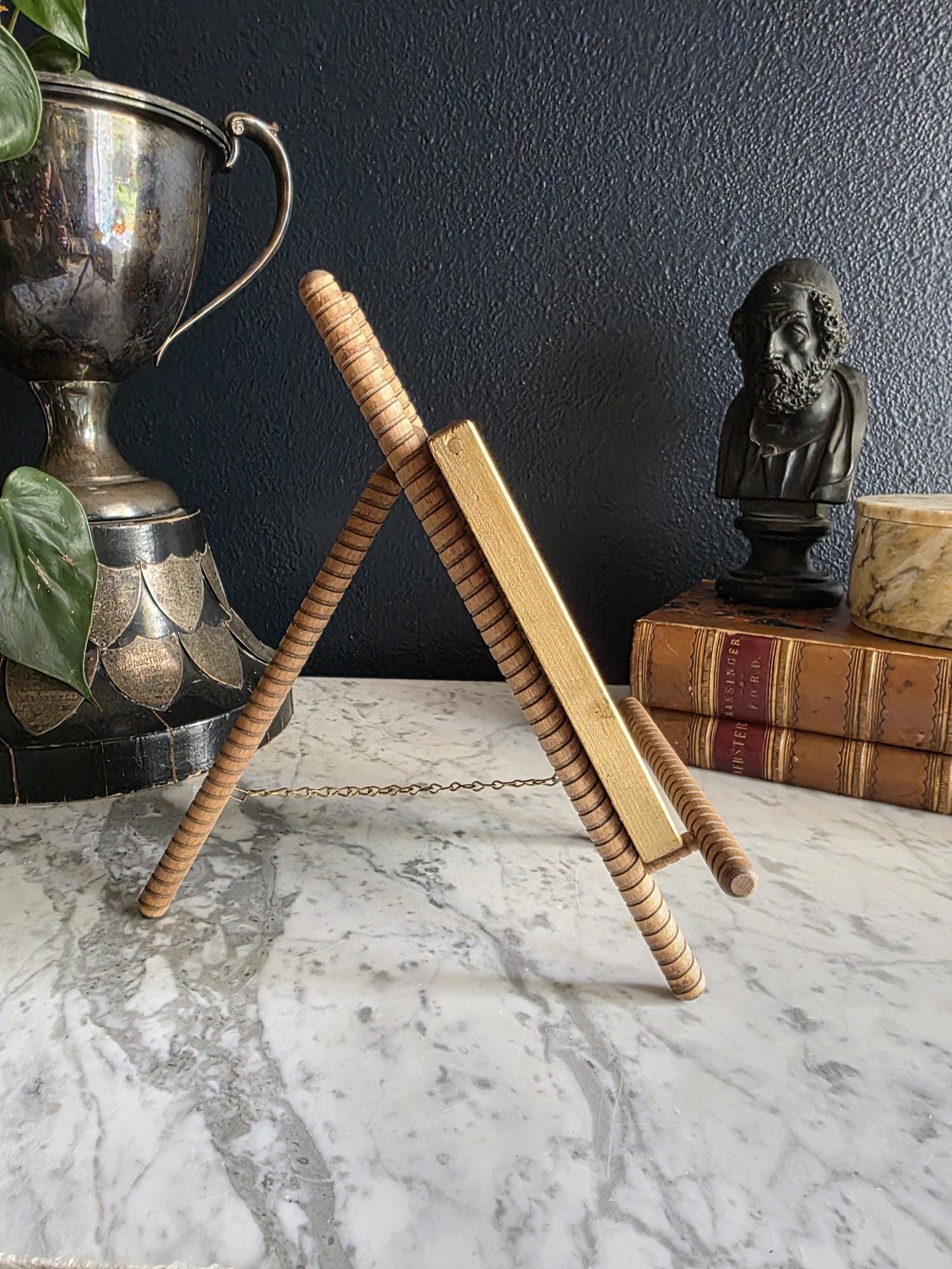 The easel itself features beautifully detailed spindle construction with fine grooves. Its tripod design is held secure by a small brass-toned chain, and it conveniently folds flat for storage or transport. The warm wood tone offers a lovely contrast to other dark or gilded antiques.