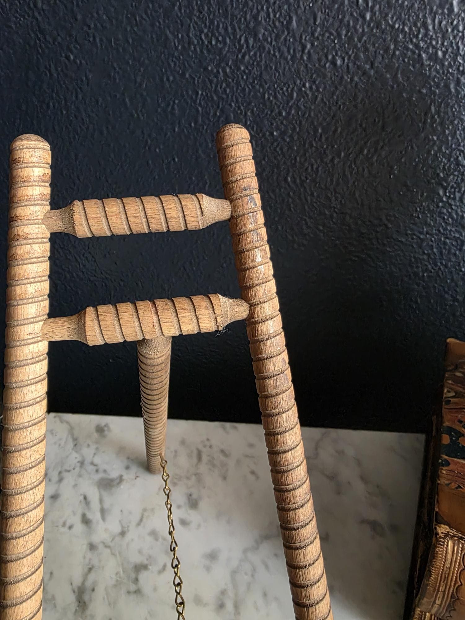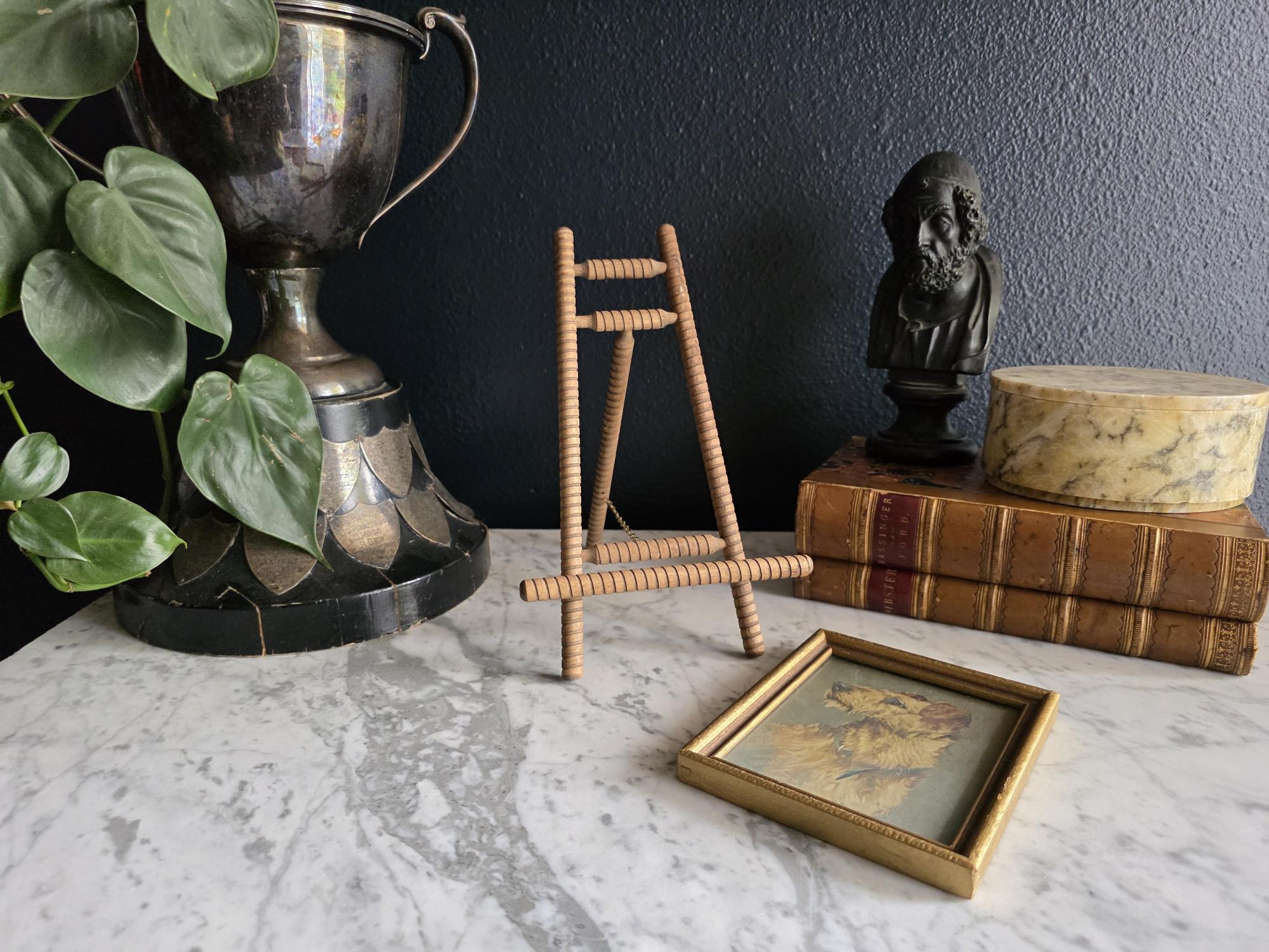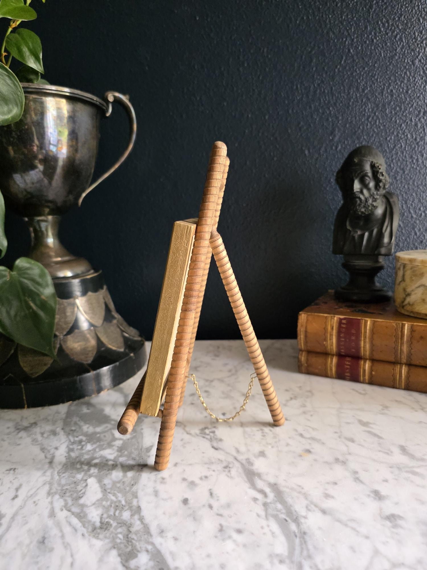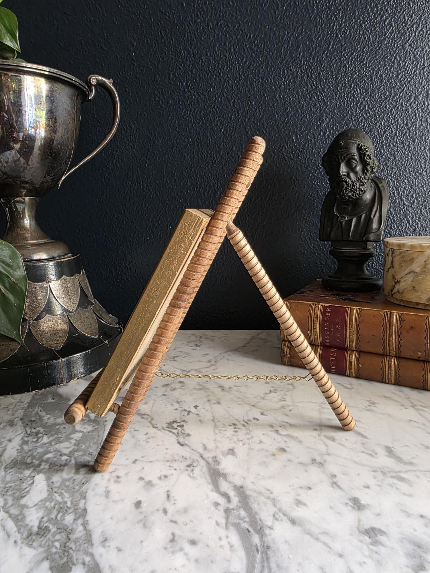 The easel itself features beautifully detailed spindle construction with fine grooves. Its tripod design is held secure by a small brass-toned chain, and it conveniently folds flat for storage or transport. The warm wood tone offers a lovely contrast to other dark or gilded antiques.