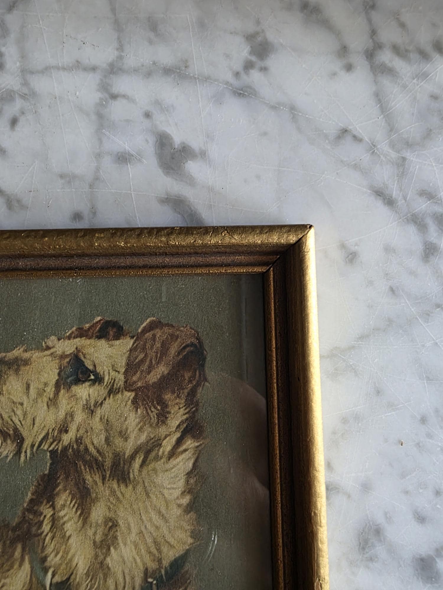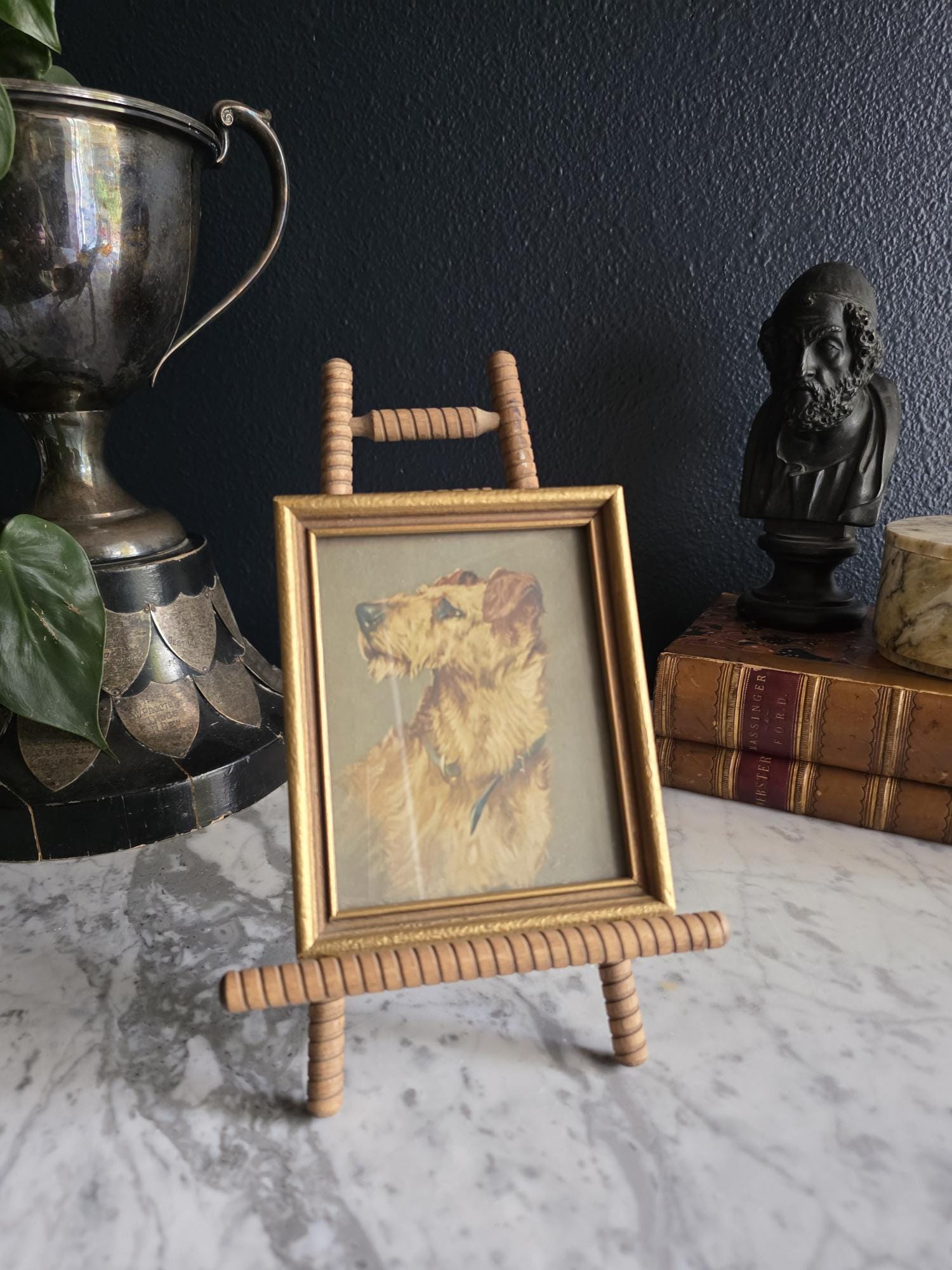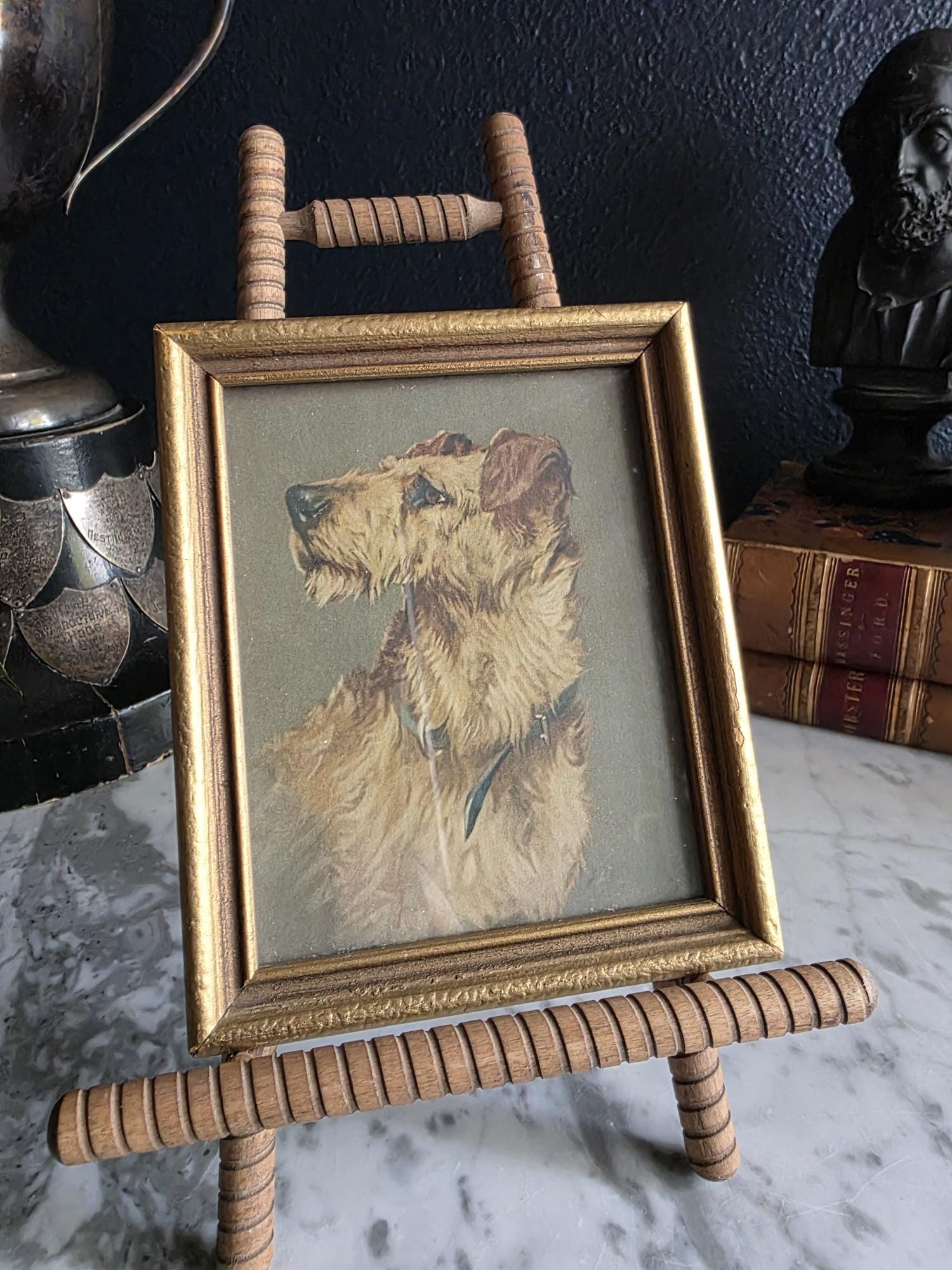 Displayed on the easel is a miniature framed print of a Wire Fox Terrier. The portrait captures the dog in a classic, handsome profile. It is a color reproduction of a period painting, set in a simple gilt wood frame that complements the vintage feel of the easel perfectly. The small size makes it exceptionally versatile.
