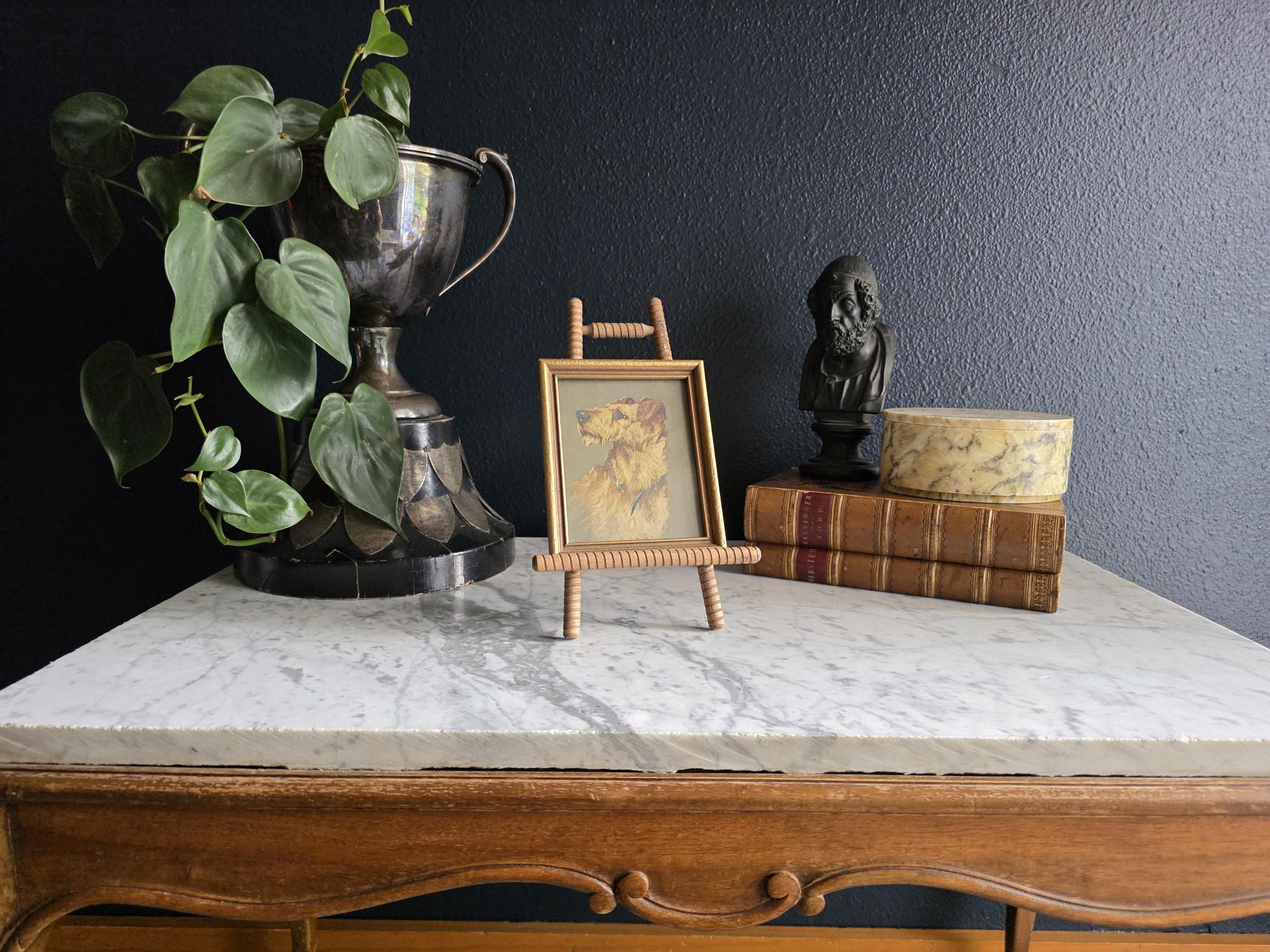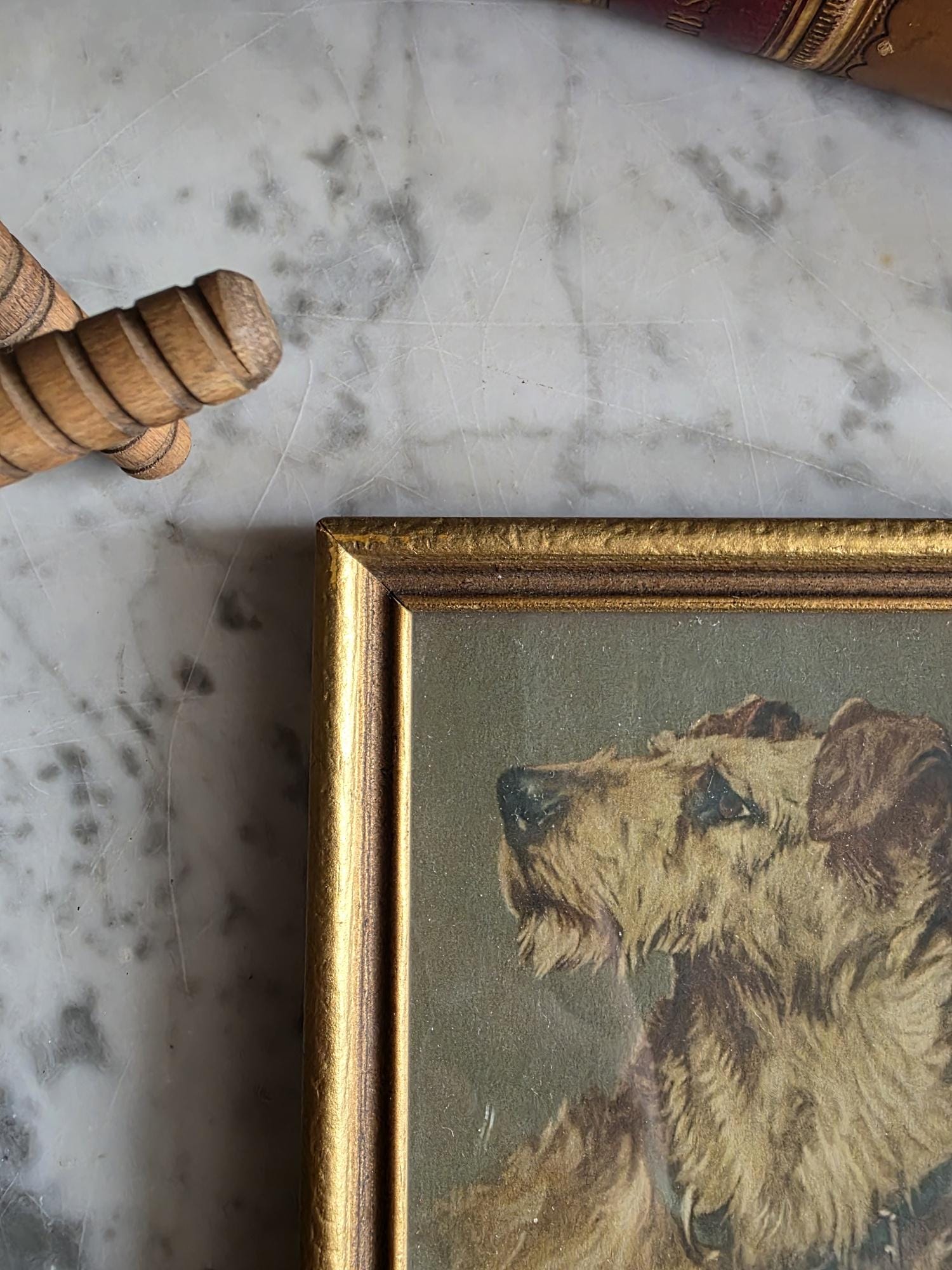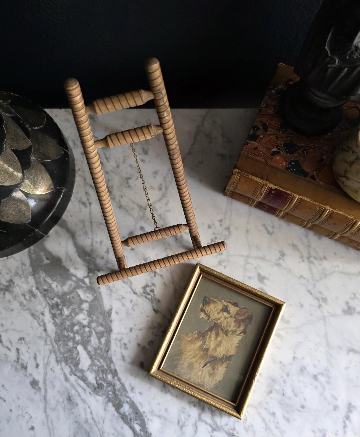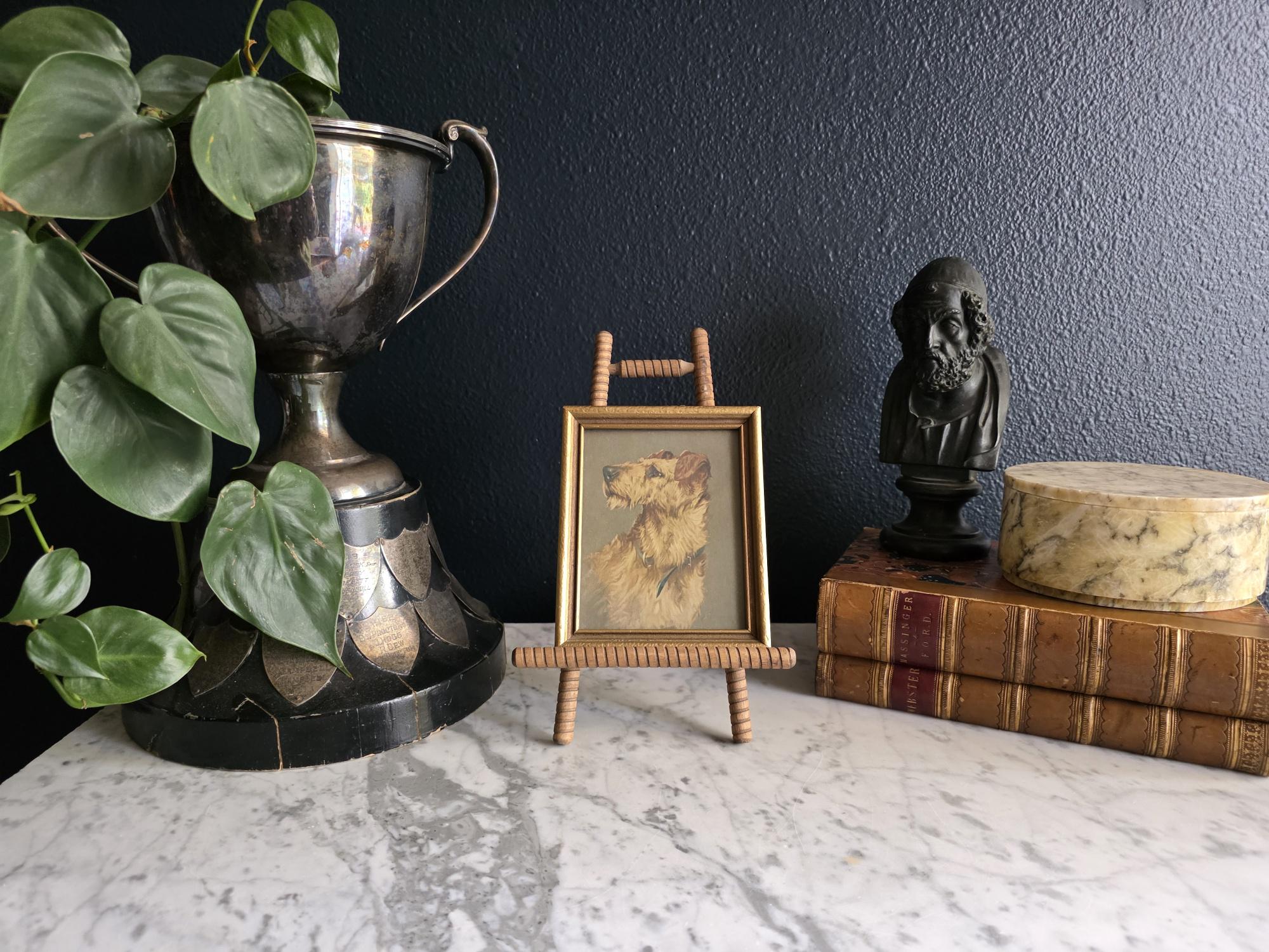 This is a wonderful antique pairing, combining a distinctive turned wood tabletop easel with a charming small, framed dog portrait. It’s an instant piece of curated vintage decor, perfect for adding character to any shelf, mantel, or desk. You will receive both vintage, easel and framed terrier art with the purchase of this listing.