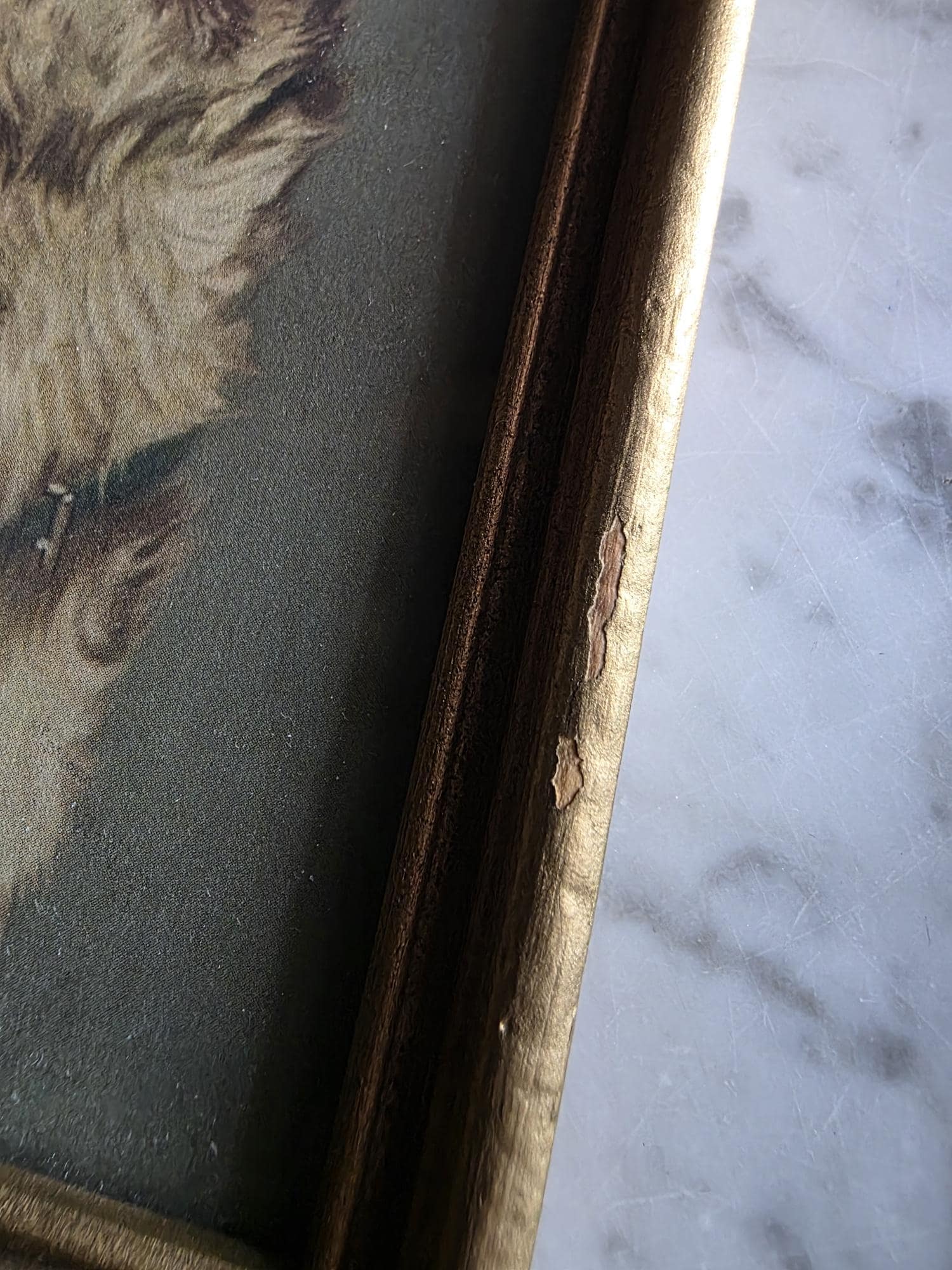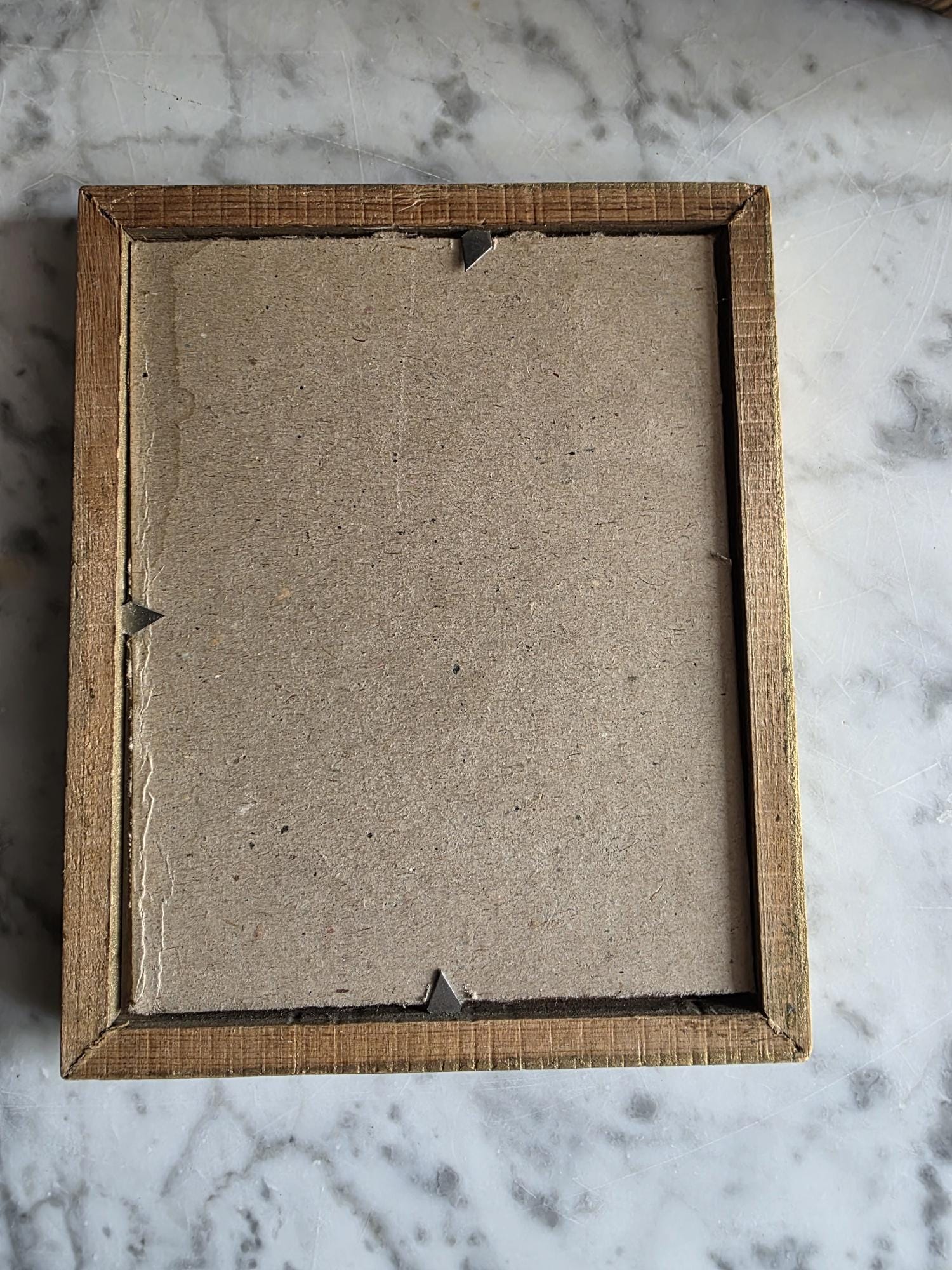 Disclosures: No hanging mechanism installed on frame. Both art and easel are in excellent vintage condition. Imperfections and wear to frame consistent with vintage age.