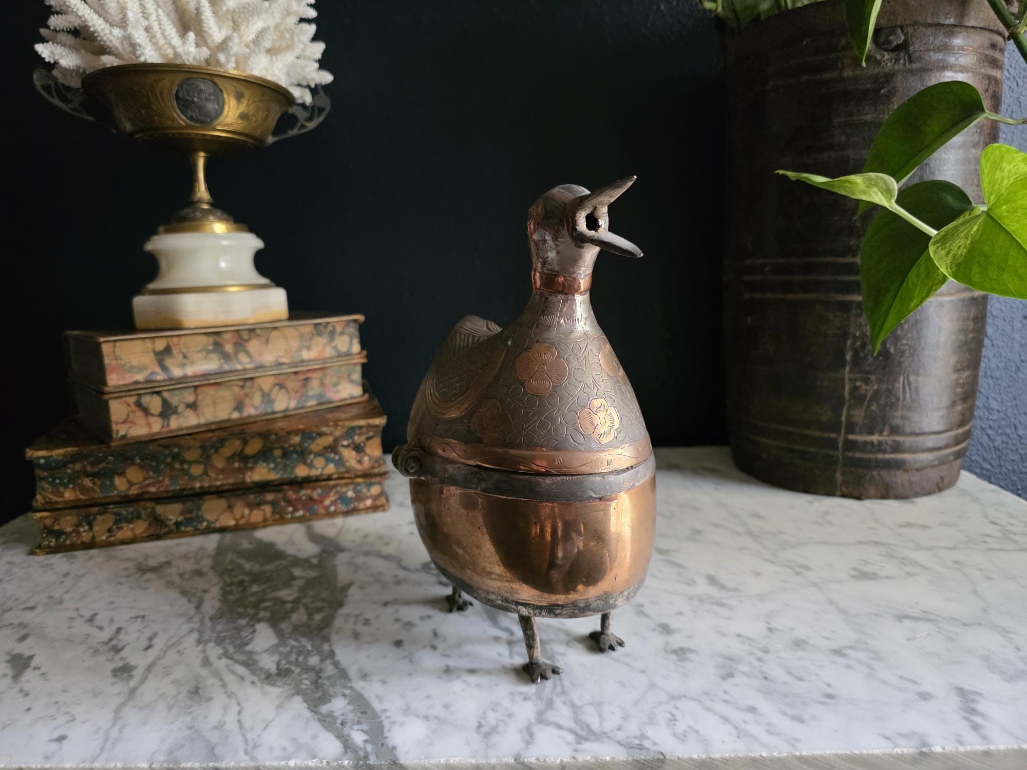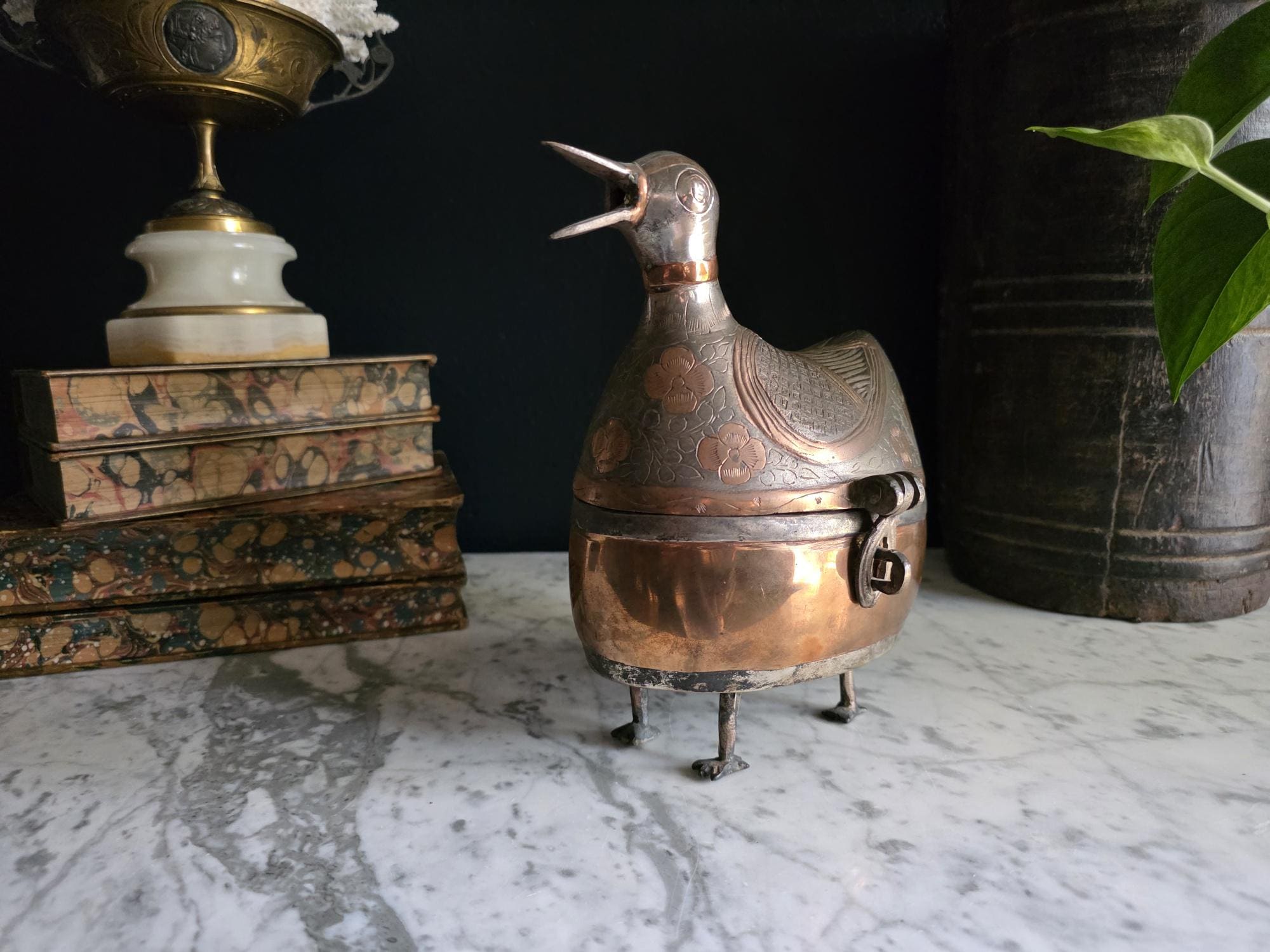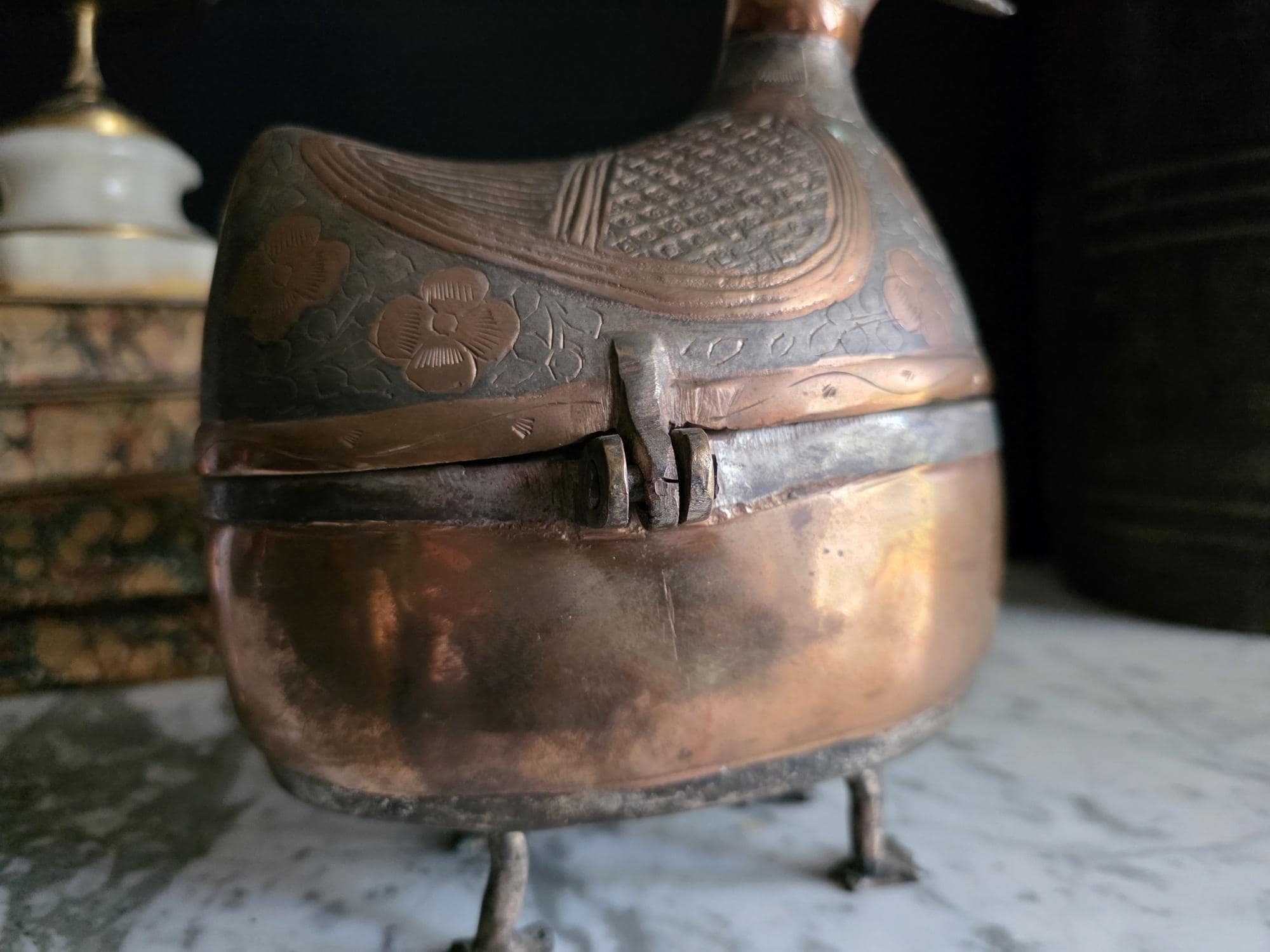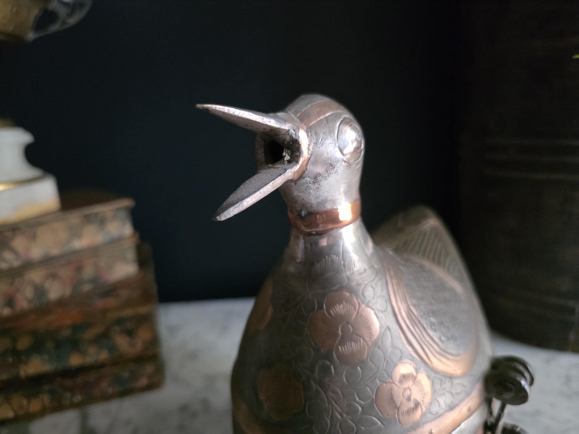 The body features a striking contrast between the bright, polished copper on the lower half and the intricate, dark, silver-toned metal (likely brass alloy) on the hinged lid. The lid is beautifully engraved with floral and geometric patterns, creating a tactile and visual texture that defines the Mid-Century aesthetic. The top surface of the bird's back and head showcases finely engraved detail mimicking feathers.