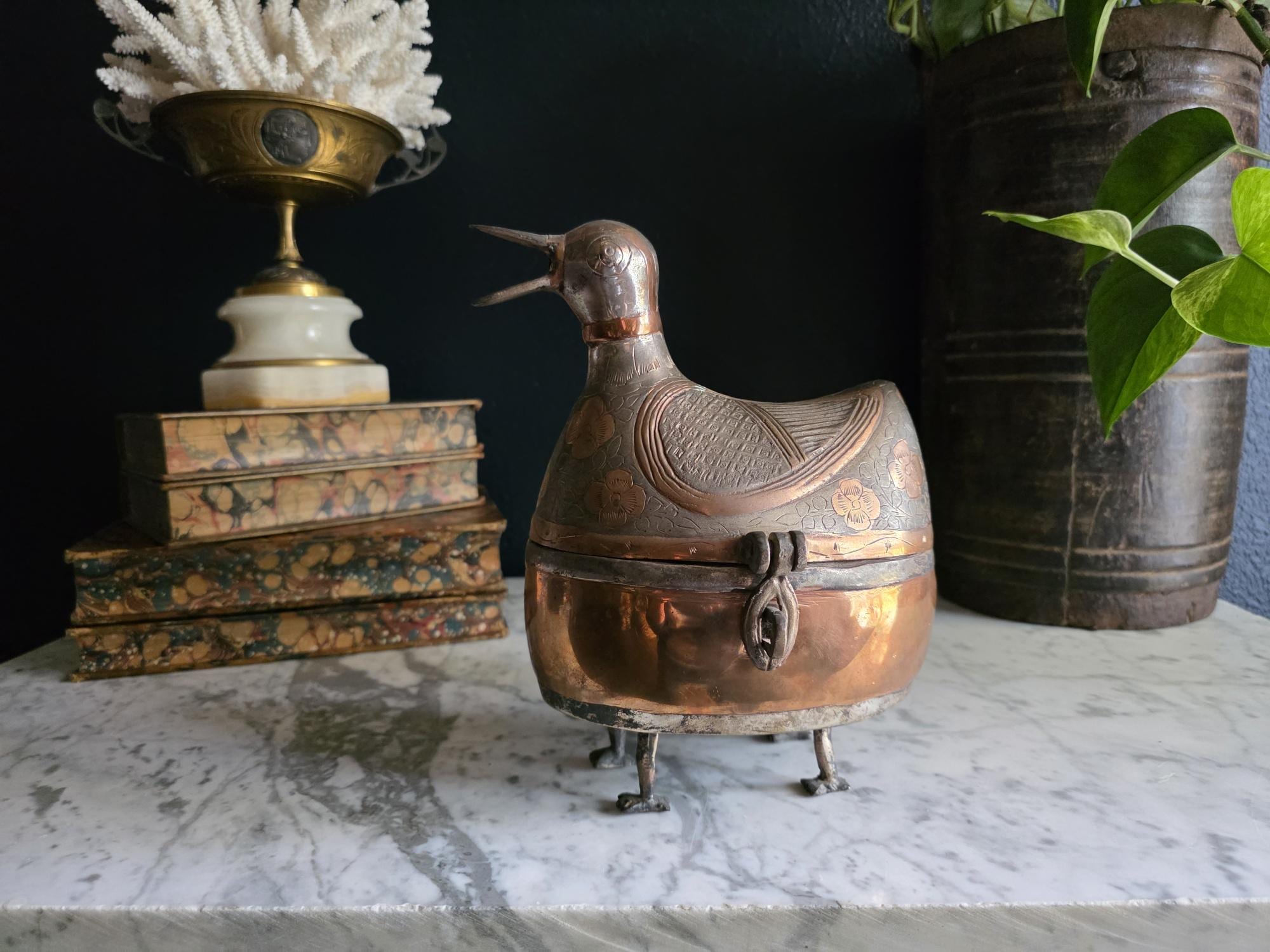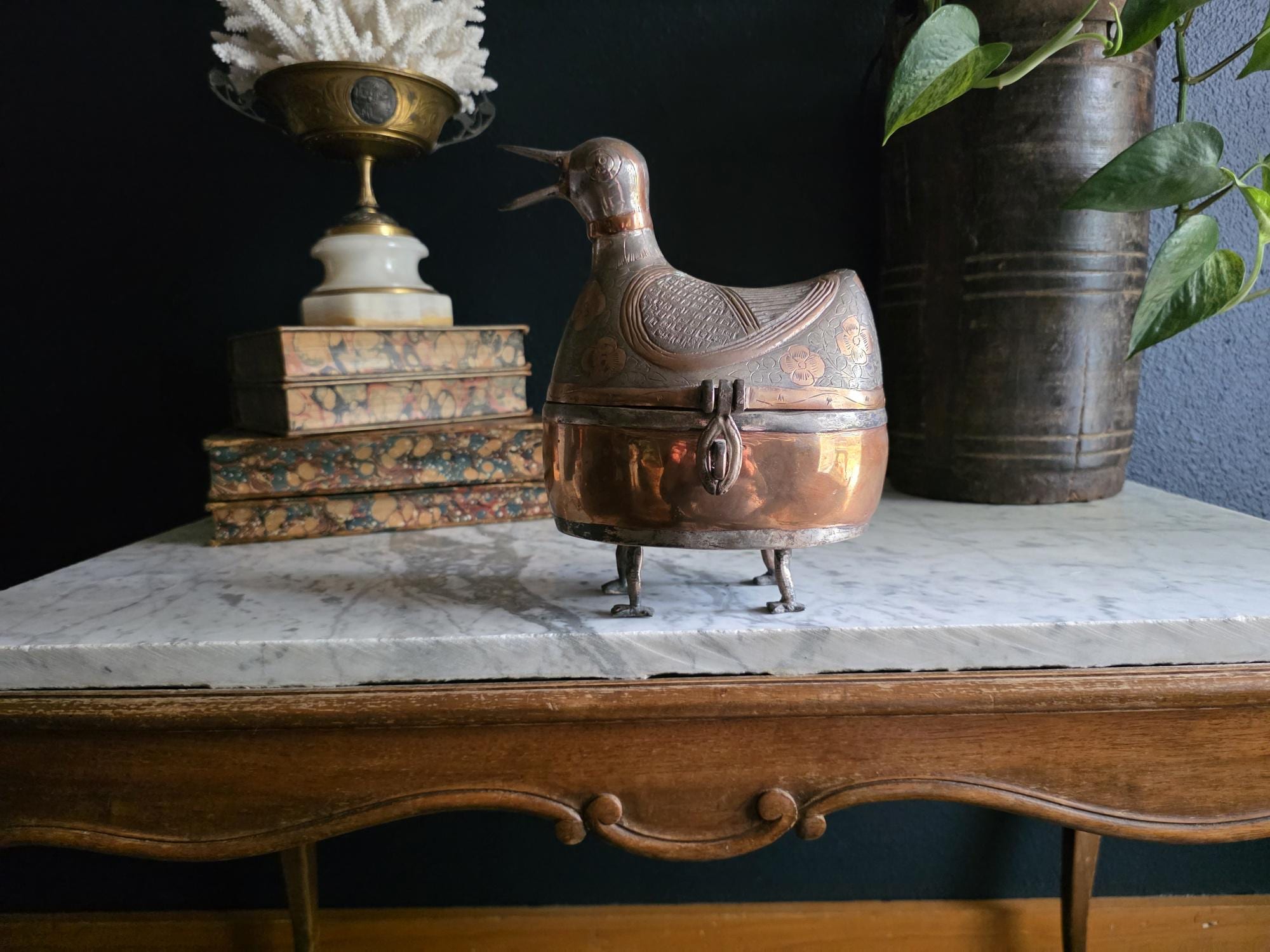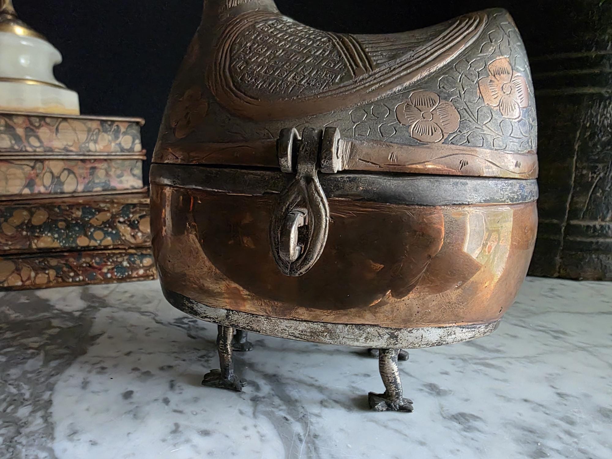 Condition: This piece is in excellent vintage condition, displaying a deep, rich patina consistent with its age. The copper areas have a beautiful natural sheen, and the dark silver-toned areas retain all their intricate engraving. It is fully functional as a lidded box. Its significant size makes it a true statement piece.