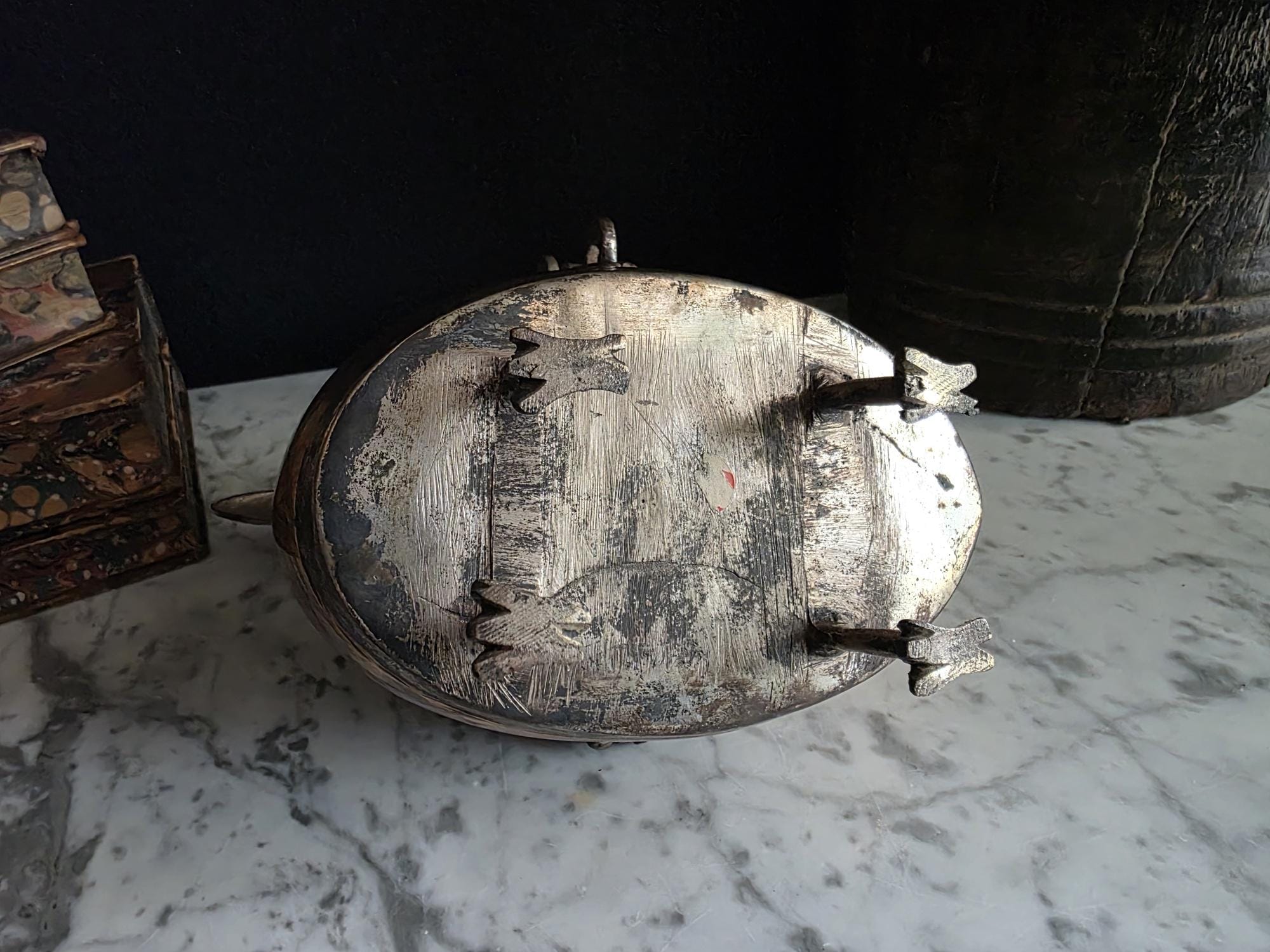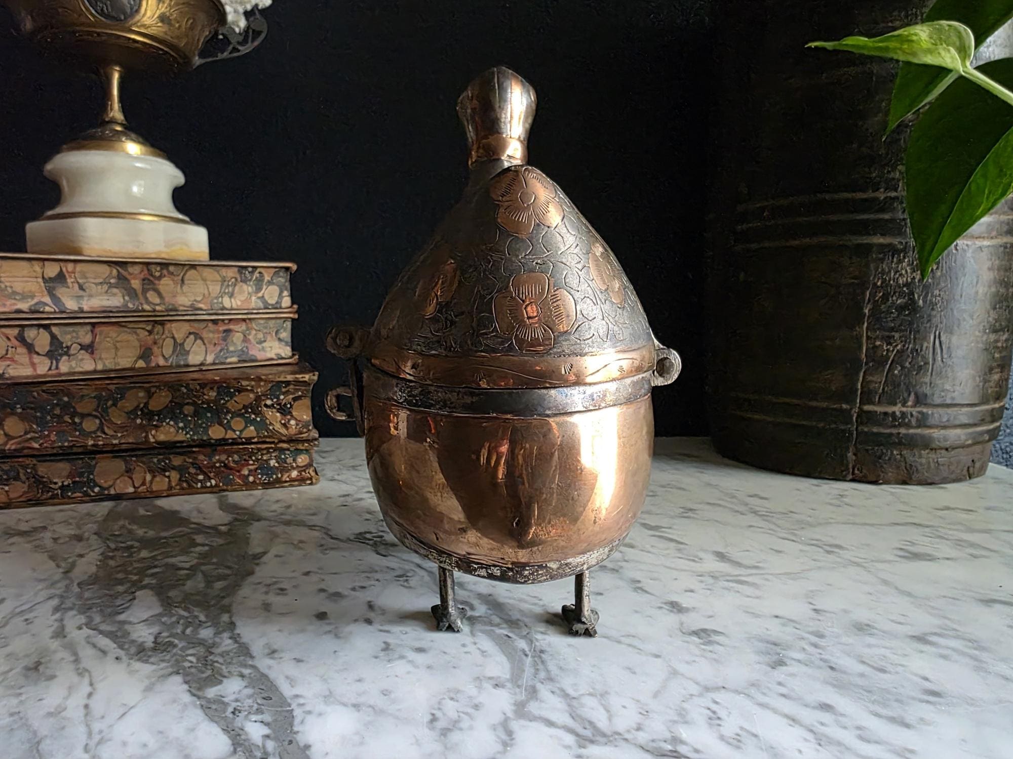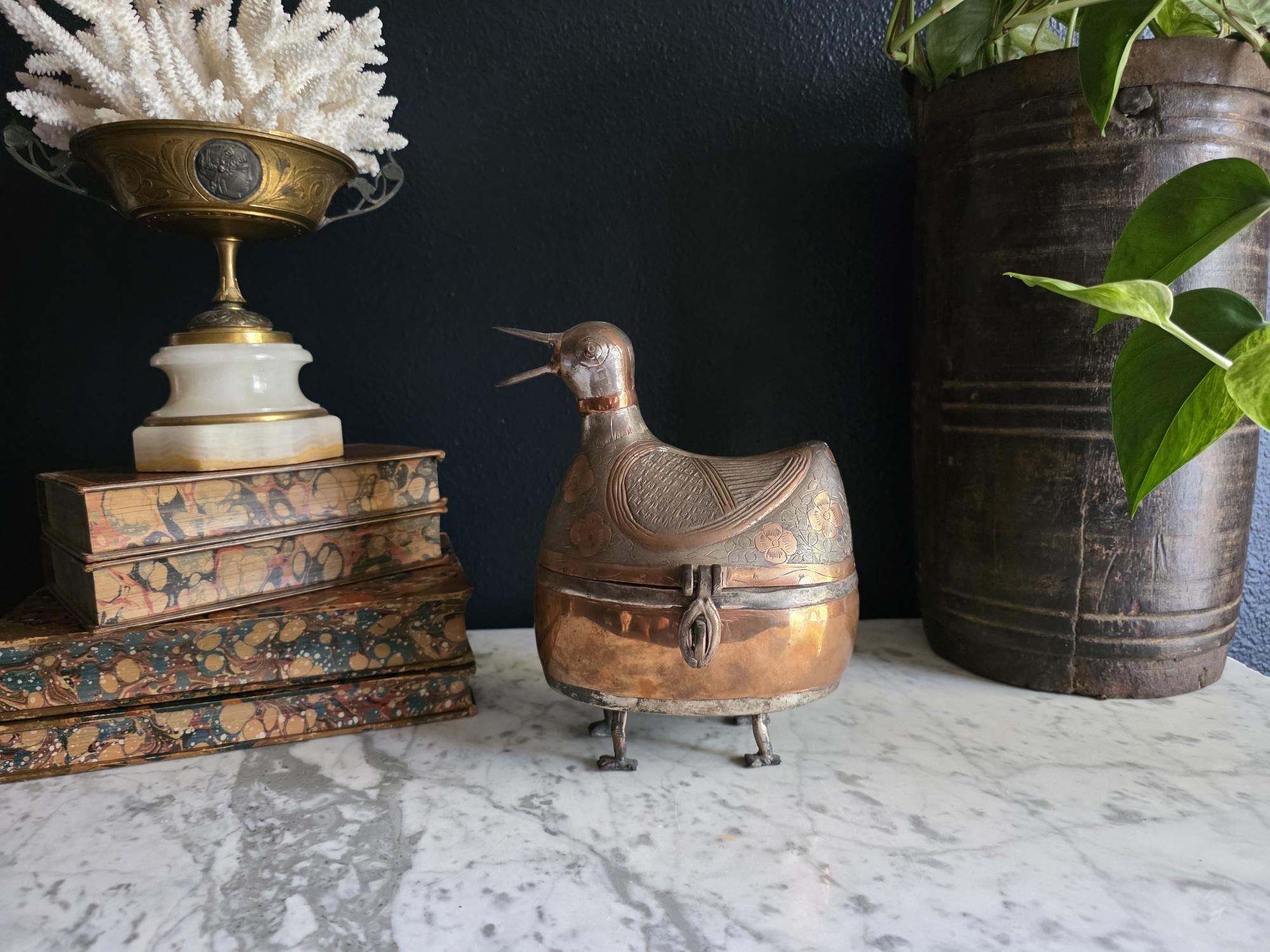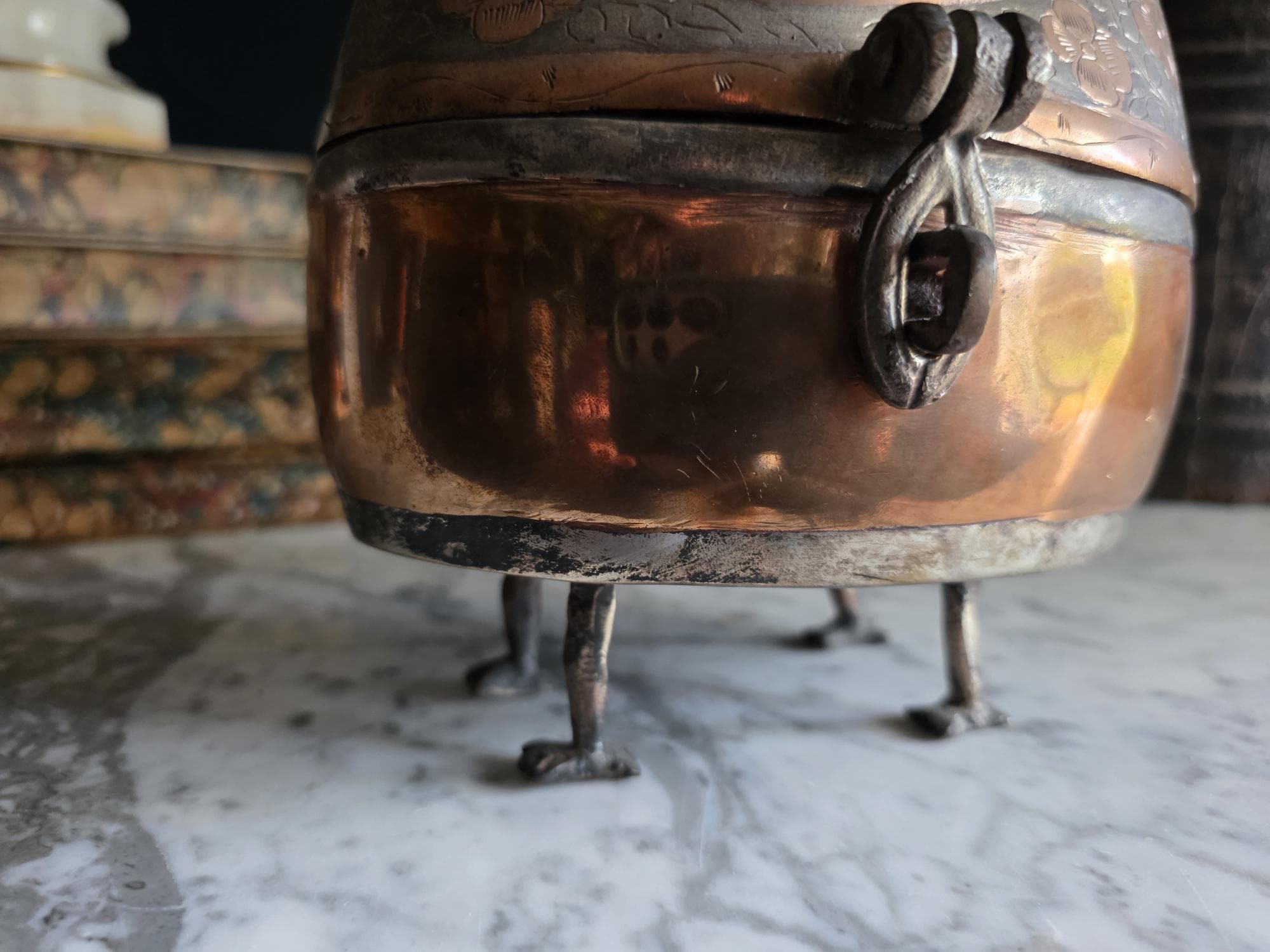 Condition: This piece is in excellent vintage condition, displaying a deep, rich patina consistent with its age. The copper areas have a beautiful natural sheen, and the dark silver-toned areas retain all their intricate engraving. It is fully functional as a lidded box. Its significant size makes it a true statement piece.