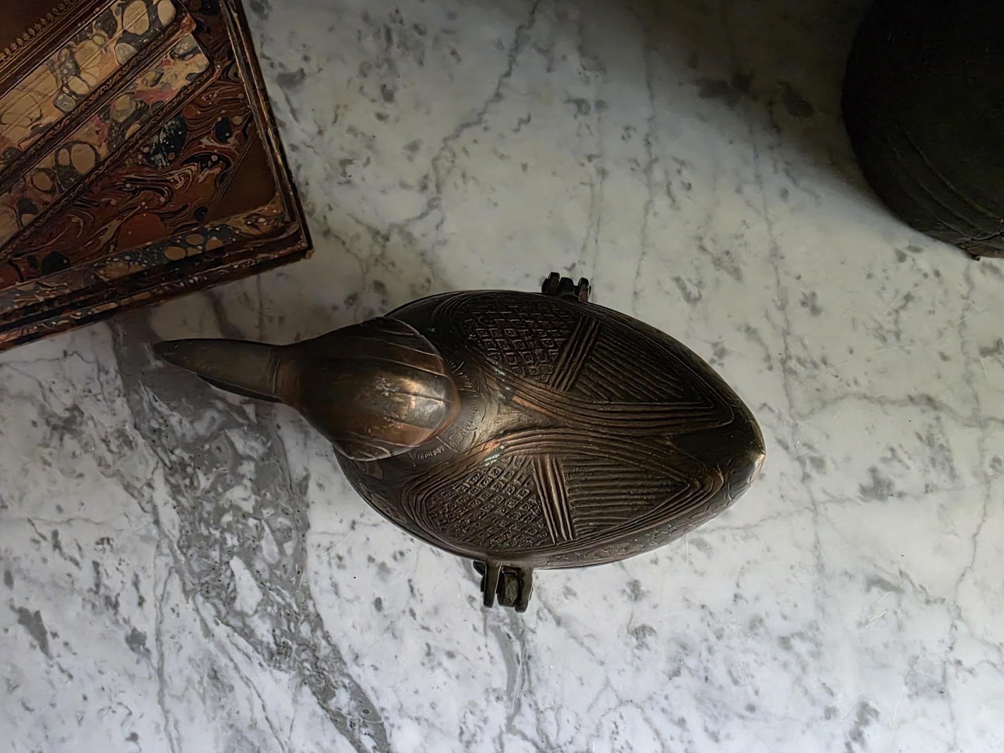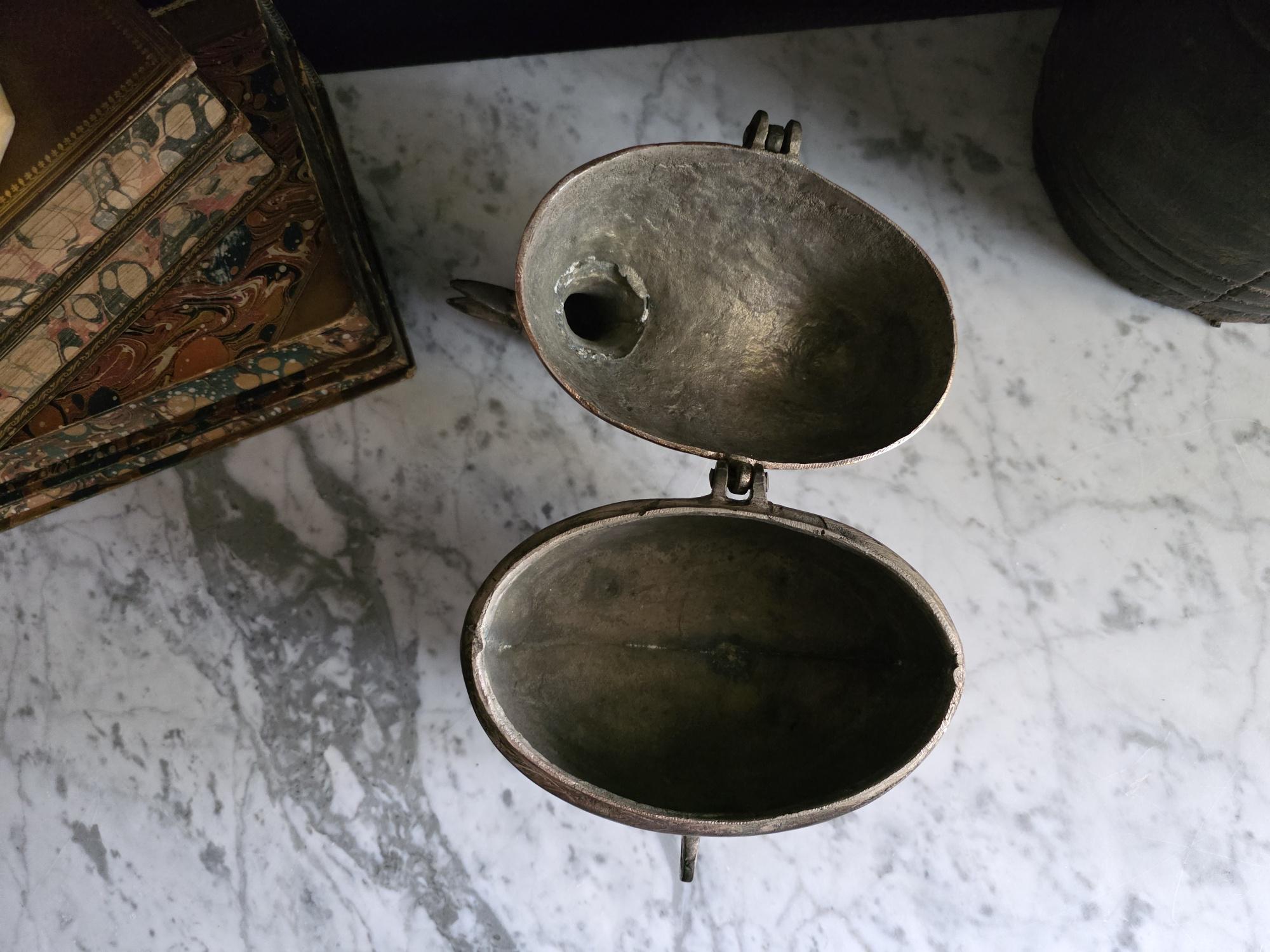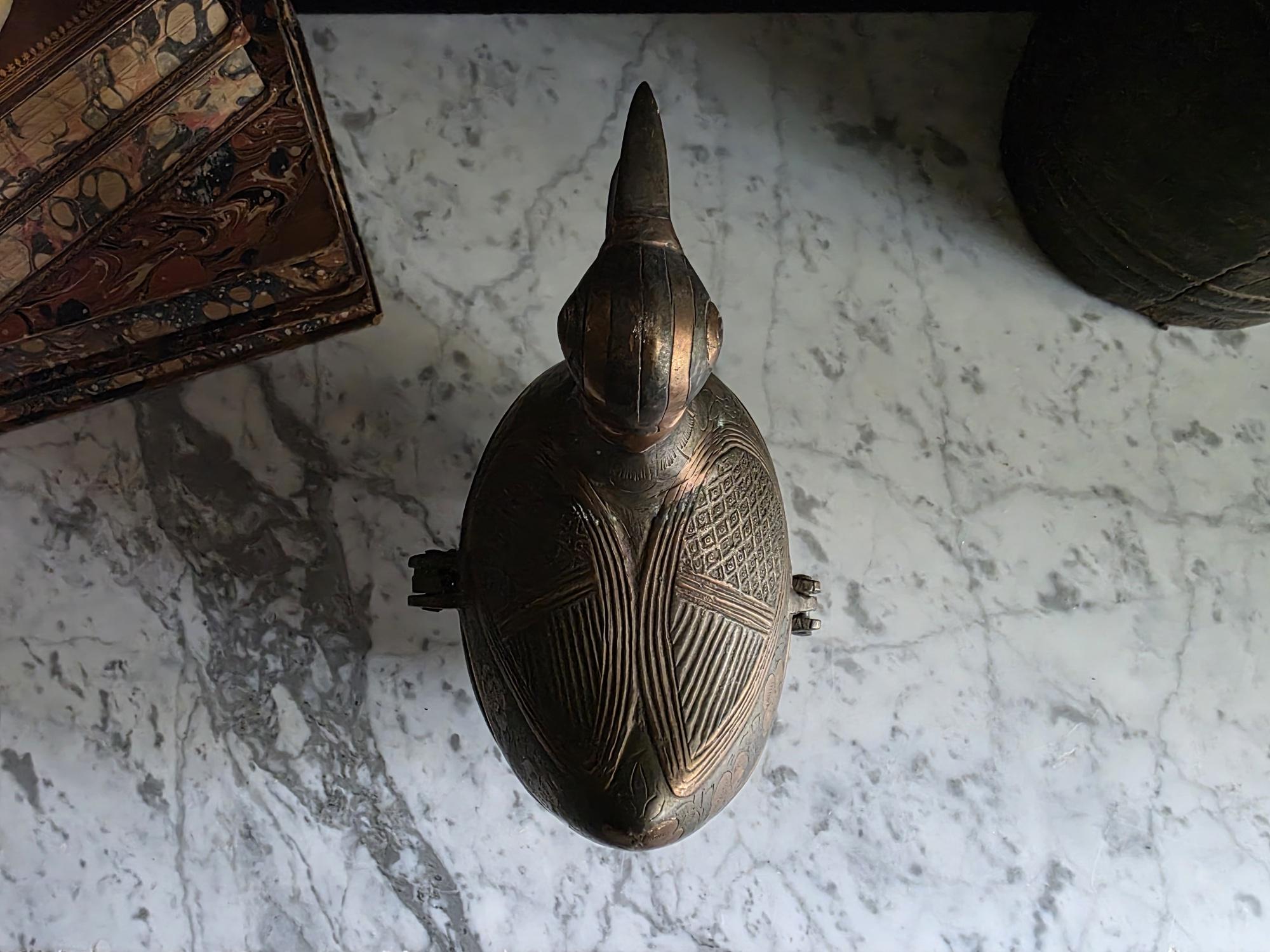 This storage box features a functional design and is hinged at the back and secured at the front by a looping metal clasp. The entire box stands securely on four cast metal feet shaped like realistic bird claws, adding a whimsical yet grounded element. The open beak and internal cavity suggest it was meant to be a decorative box, perhaps for tobacco, keys, or small keepsakes.