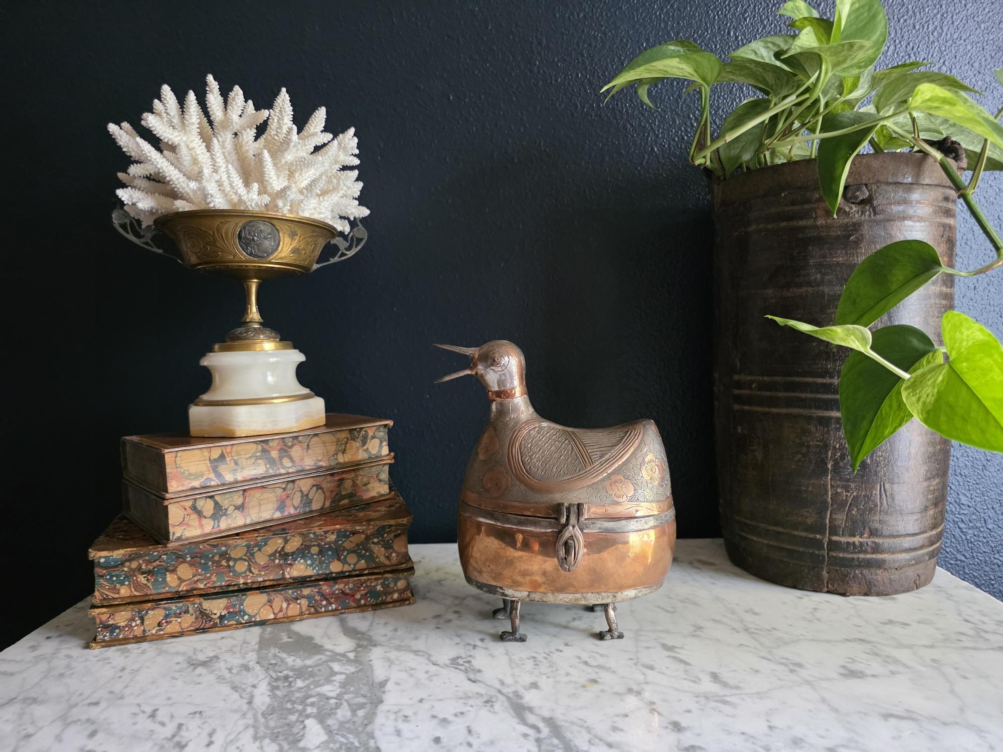 A rare and eye-catching piece of brutalist Mid-Century Modern decor, this copper and silver-toned bird sculpture doubles as a lidded treasure box, attributed to the Don Freedman design aesthetic.