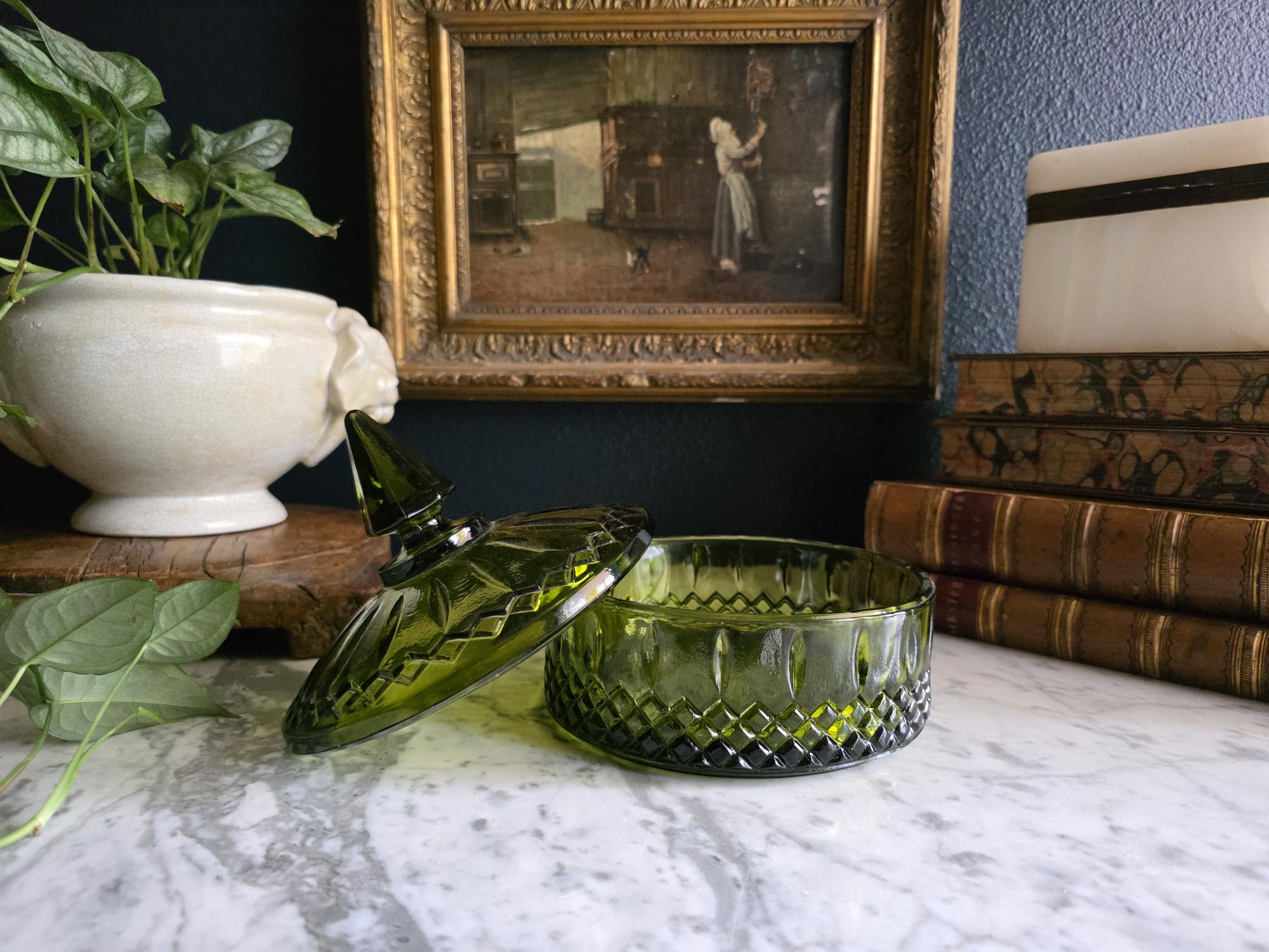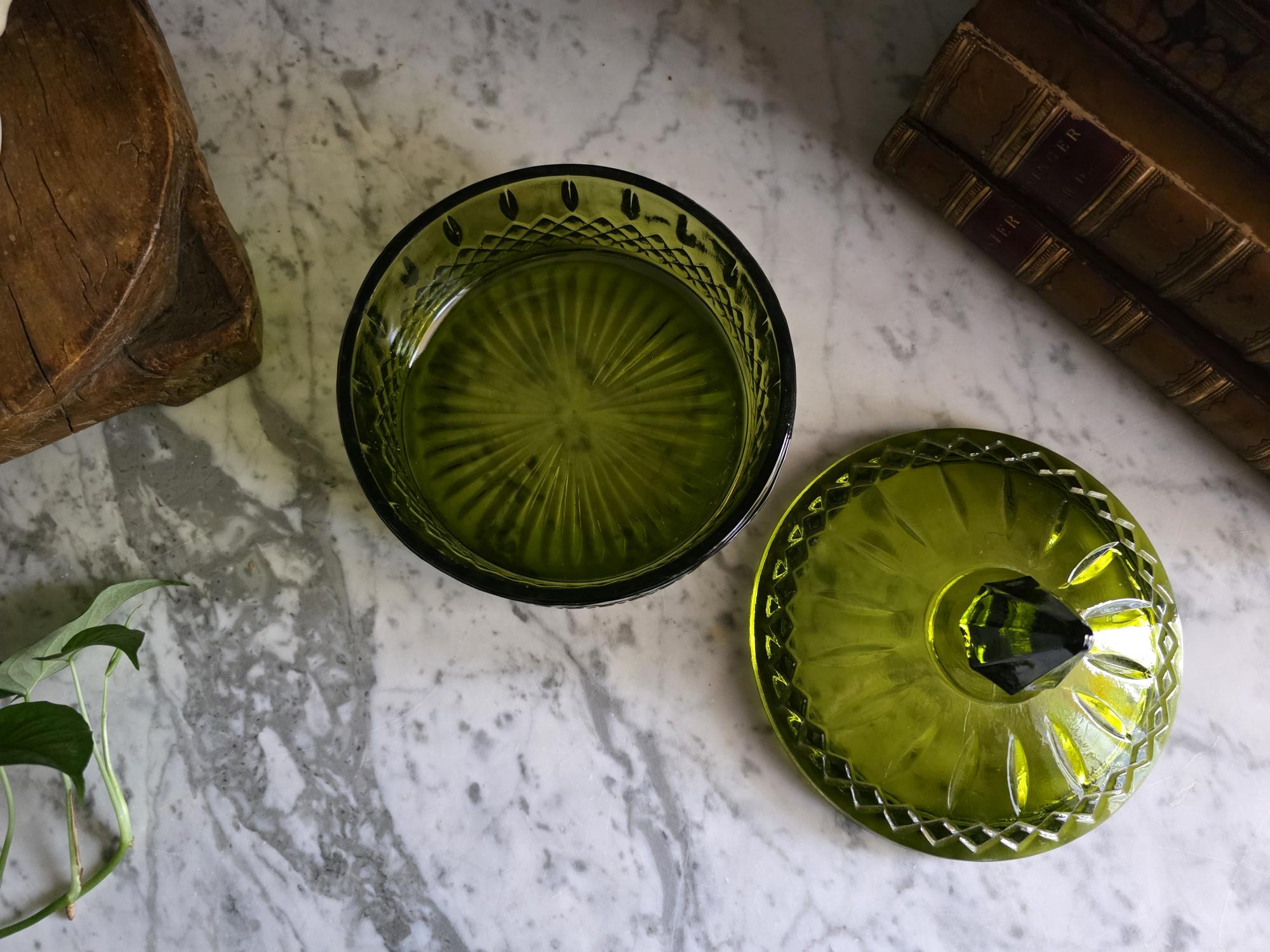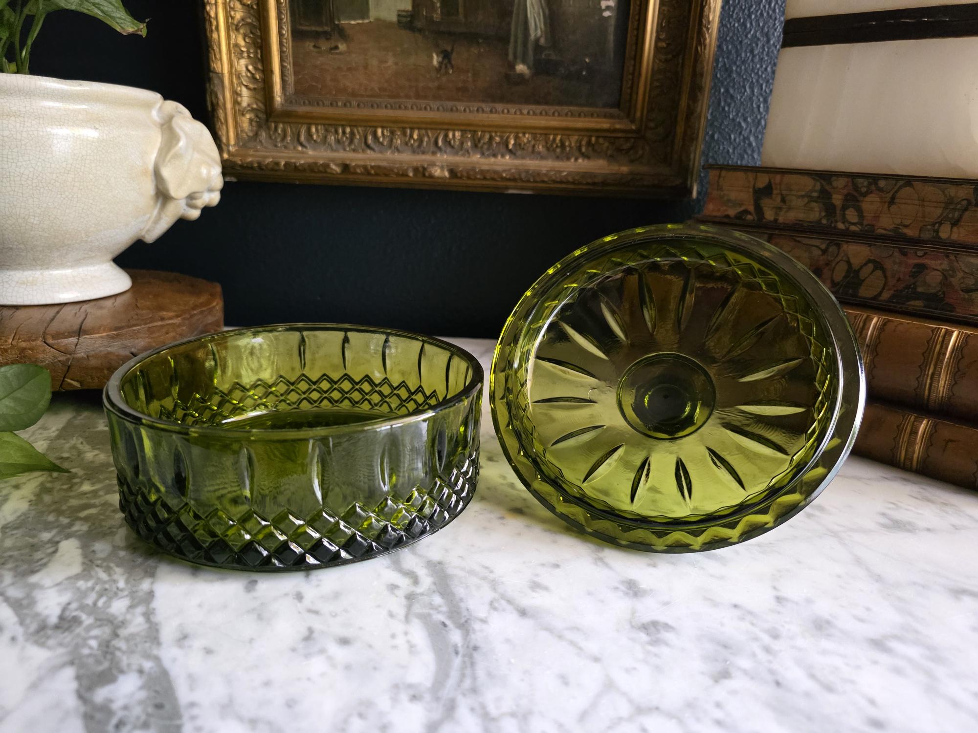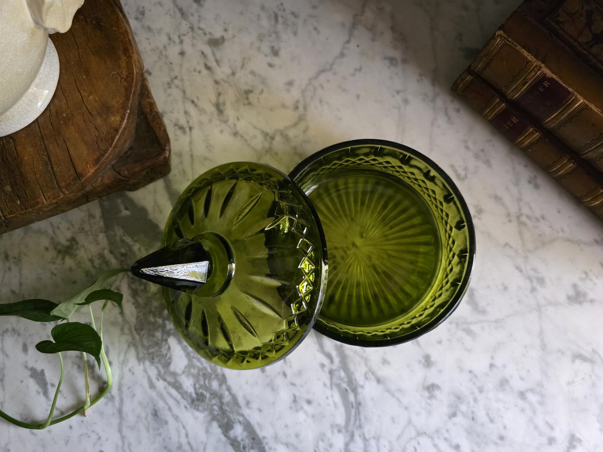 The piece is complete with its original matching lid and is in very good vintage condition, showcasing the heavy, quality craftsmanship typical of pressed glass. This is a must-have item for collectors of mid-century colored glassware and green glass enthusiasts.