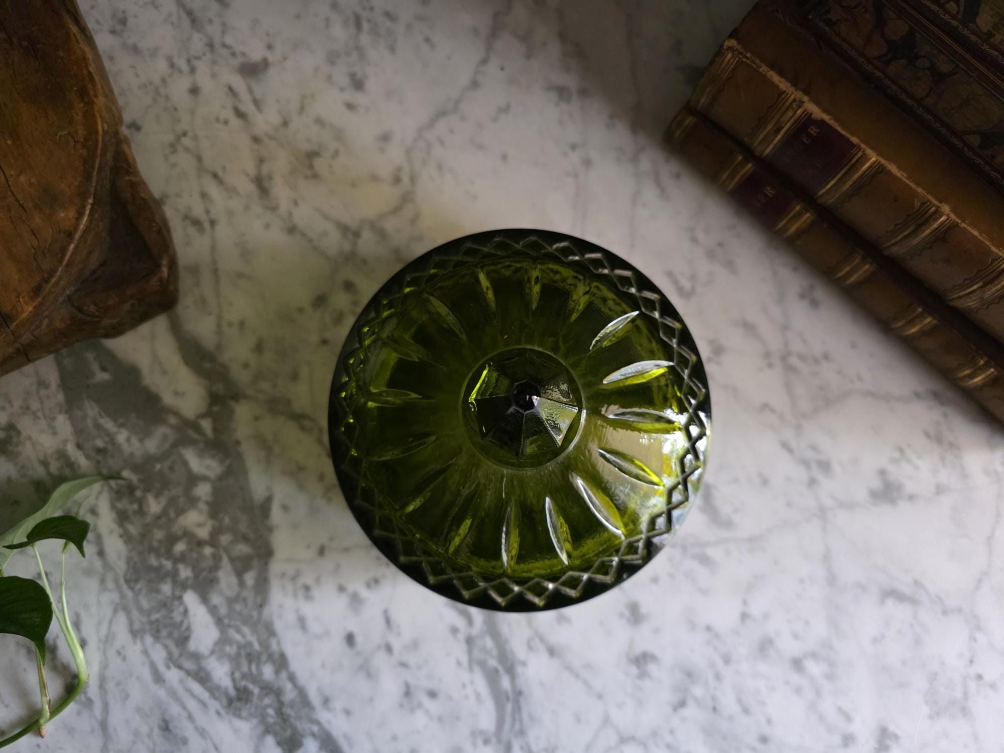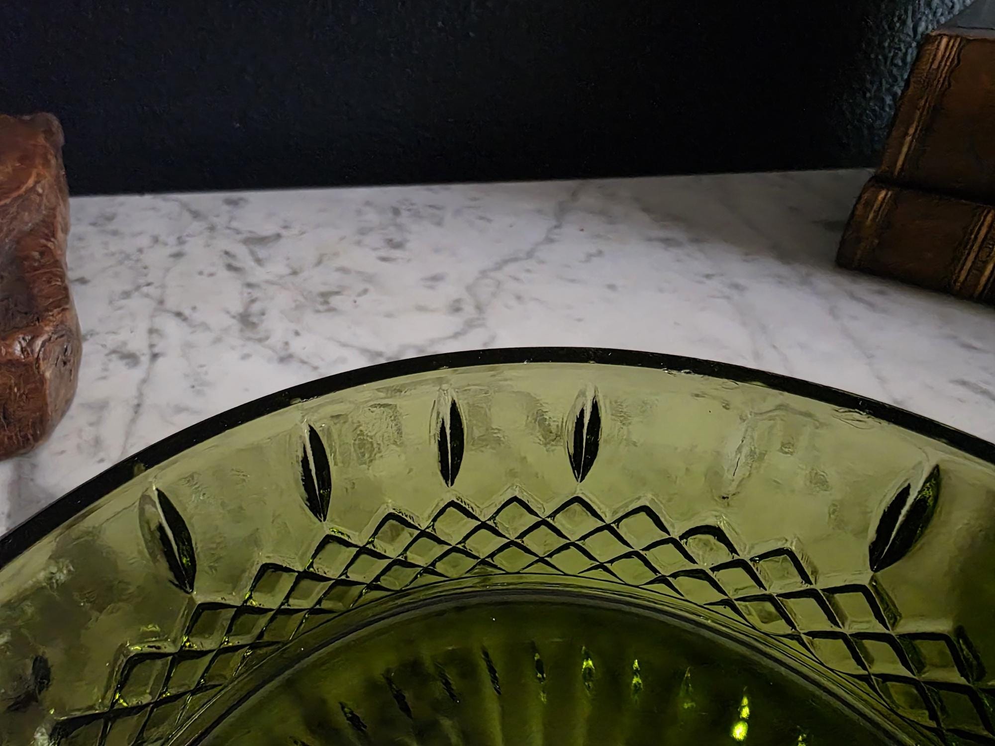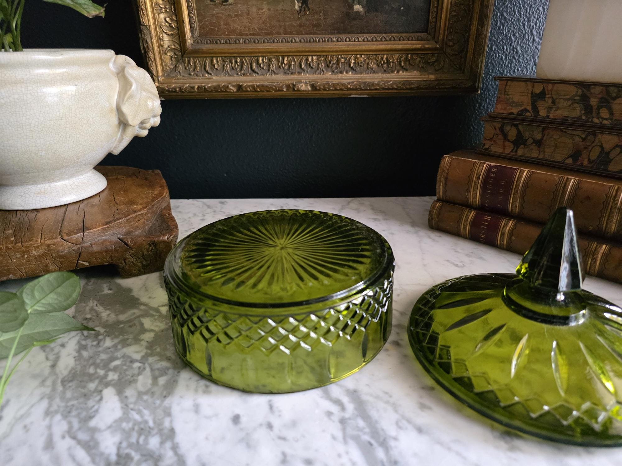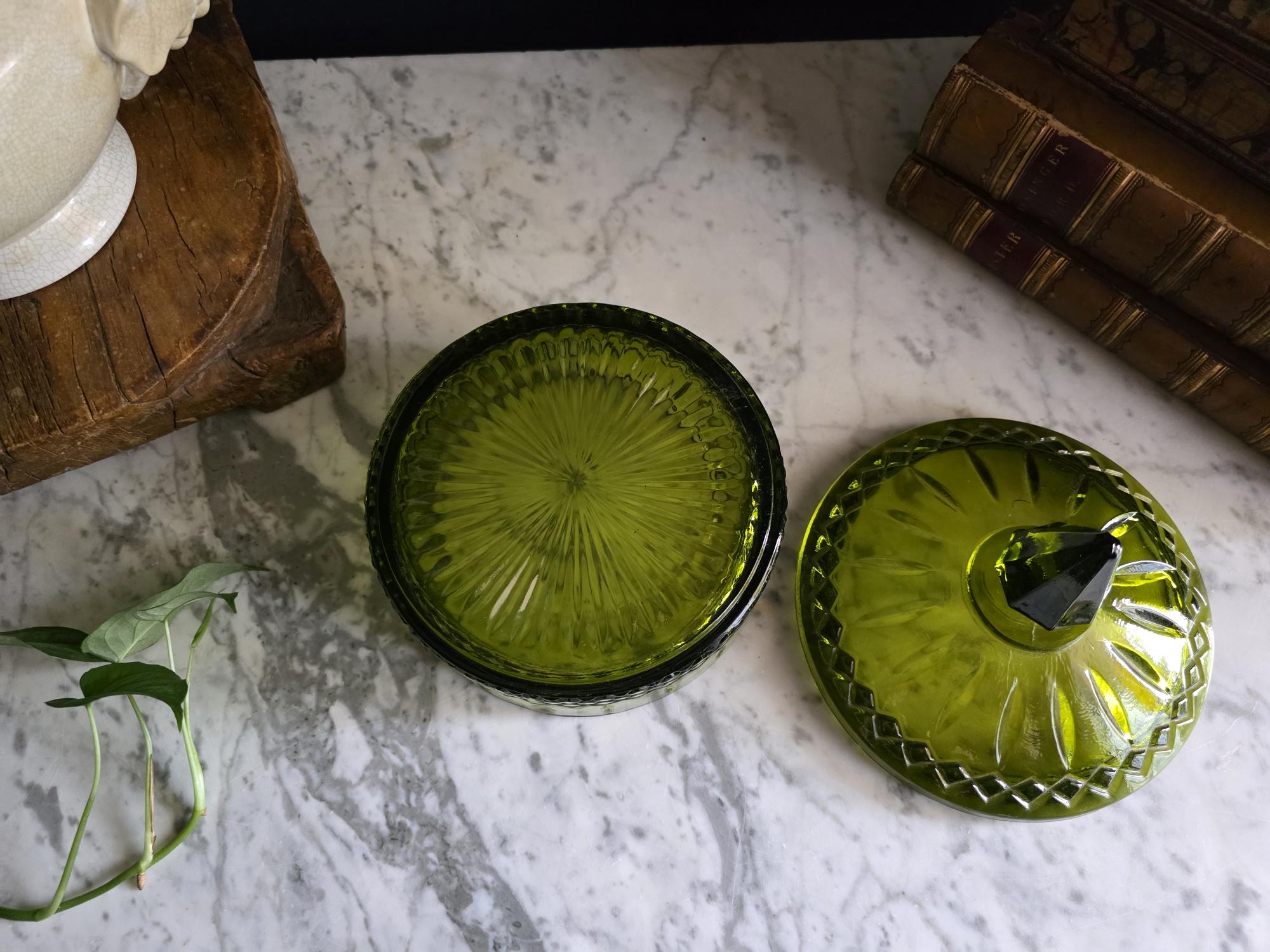 The piece is complete with its original matching lid and is in very good vintage condition, showcasing the heavy, quality craftsmanship typical of pressed glass. This is a must-have item for collectors of mid-century colored glassware and green glass enthusiasts.